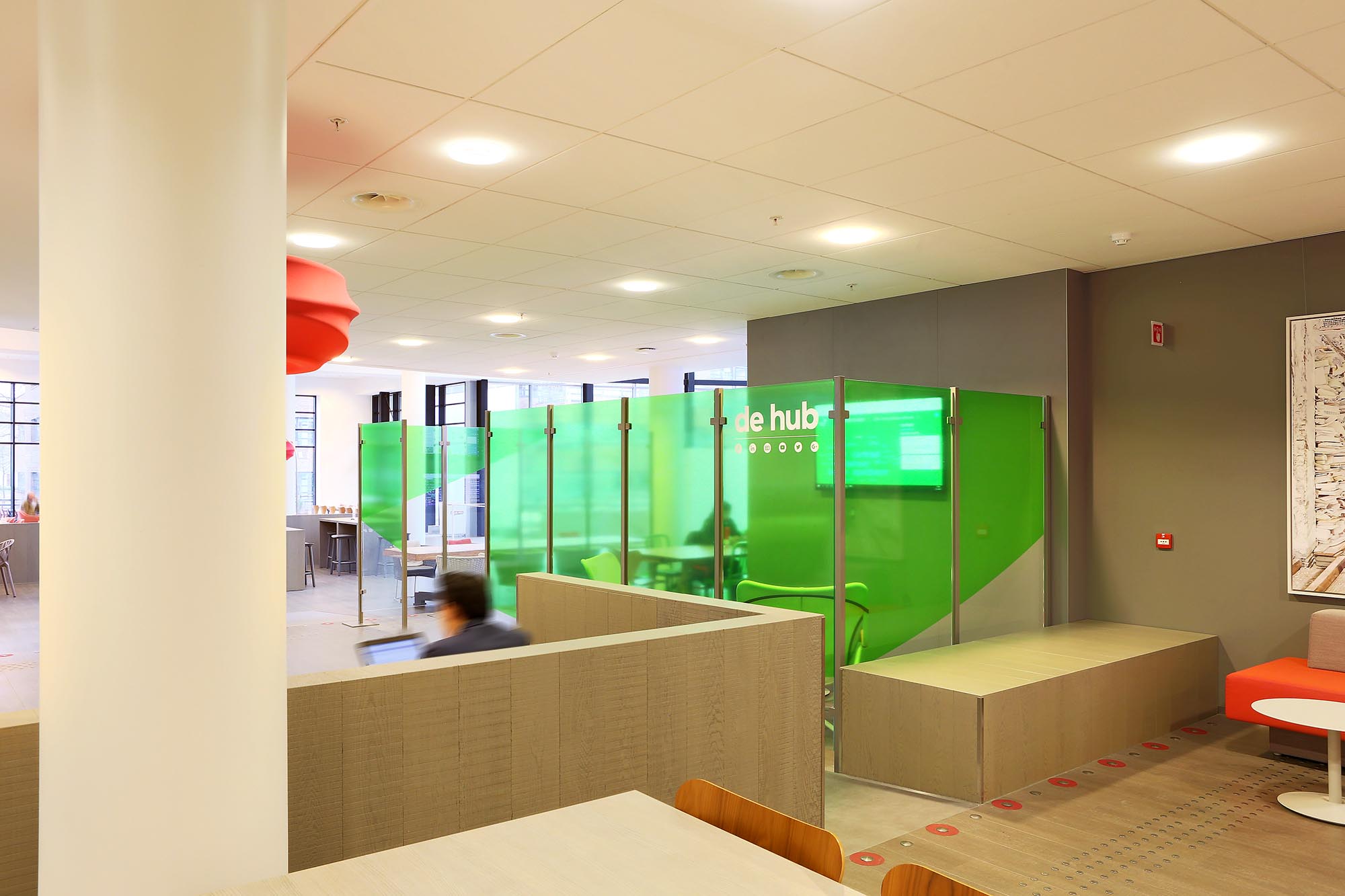 Met het combineren van bestaande systeemwanden met plafondelementen ontstaat een integraal akoestisch plan dat aansluit op het gebruik van de ruimte.