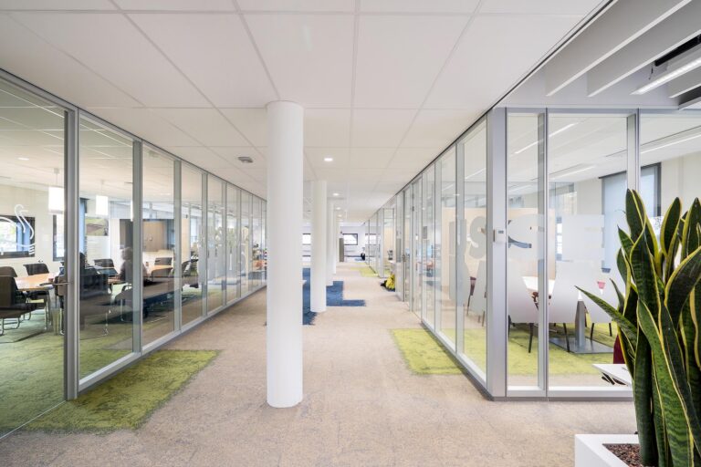 De IM 1012 HGS TWIN is een dubbele glaswand die veel licht en ruimtelijkheid biedt, met hoge geluidsisolatie en volledig herbruikbaar.