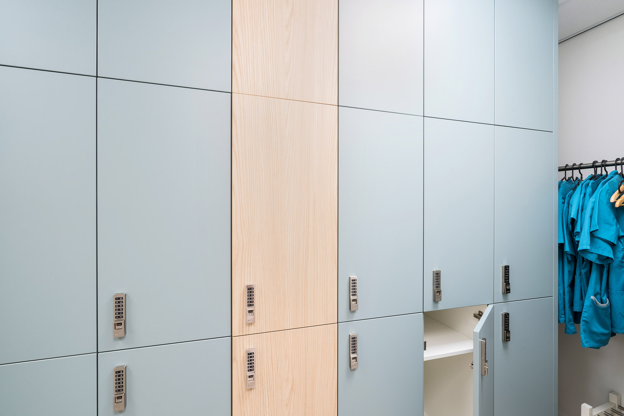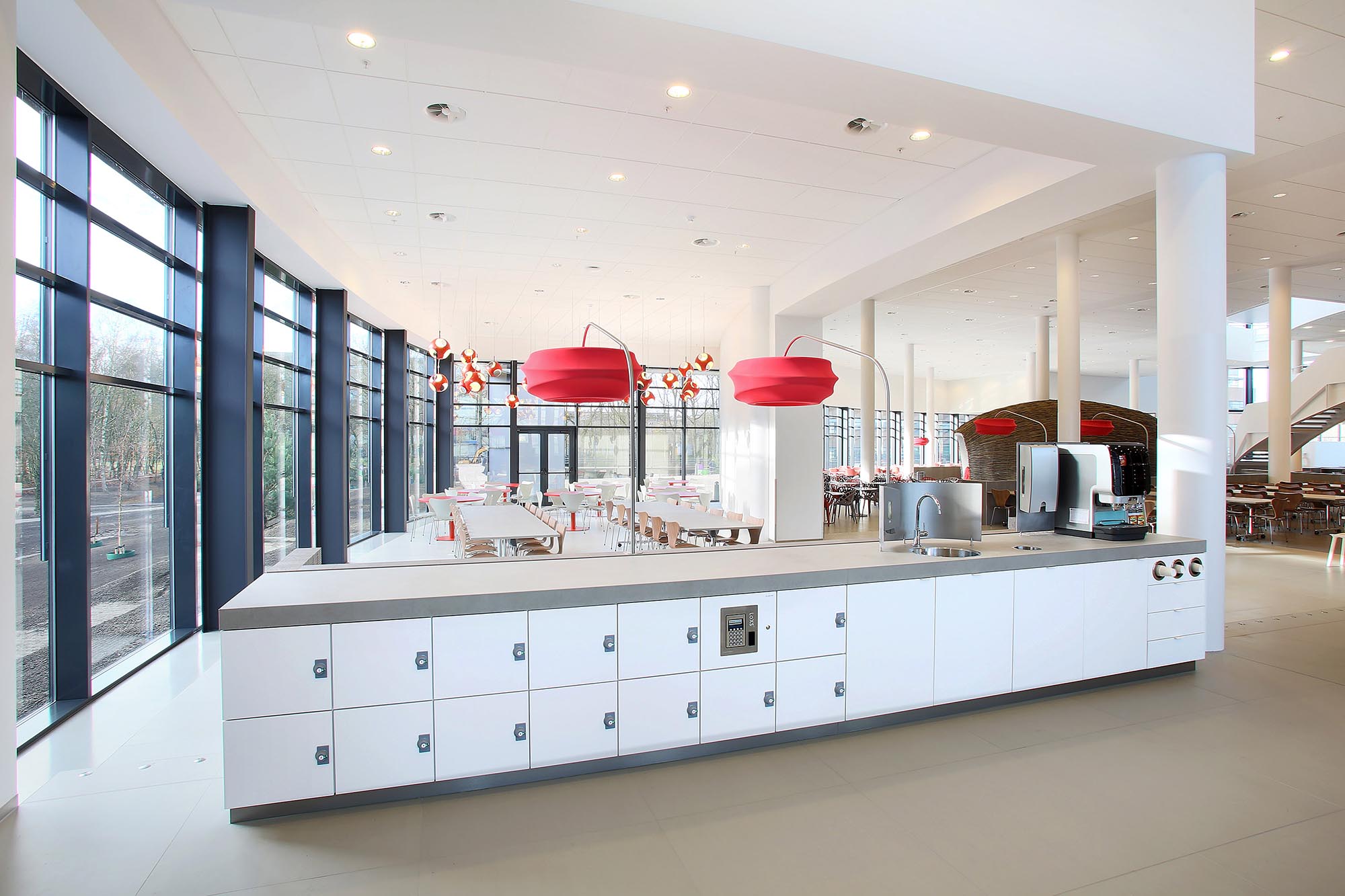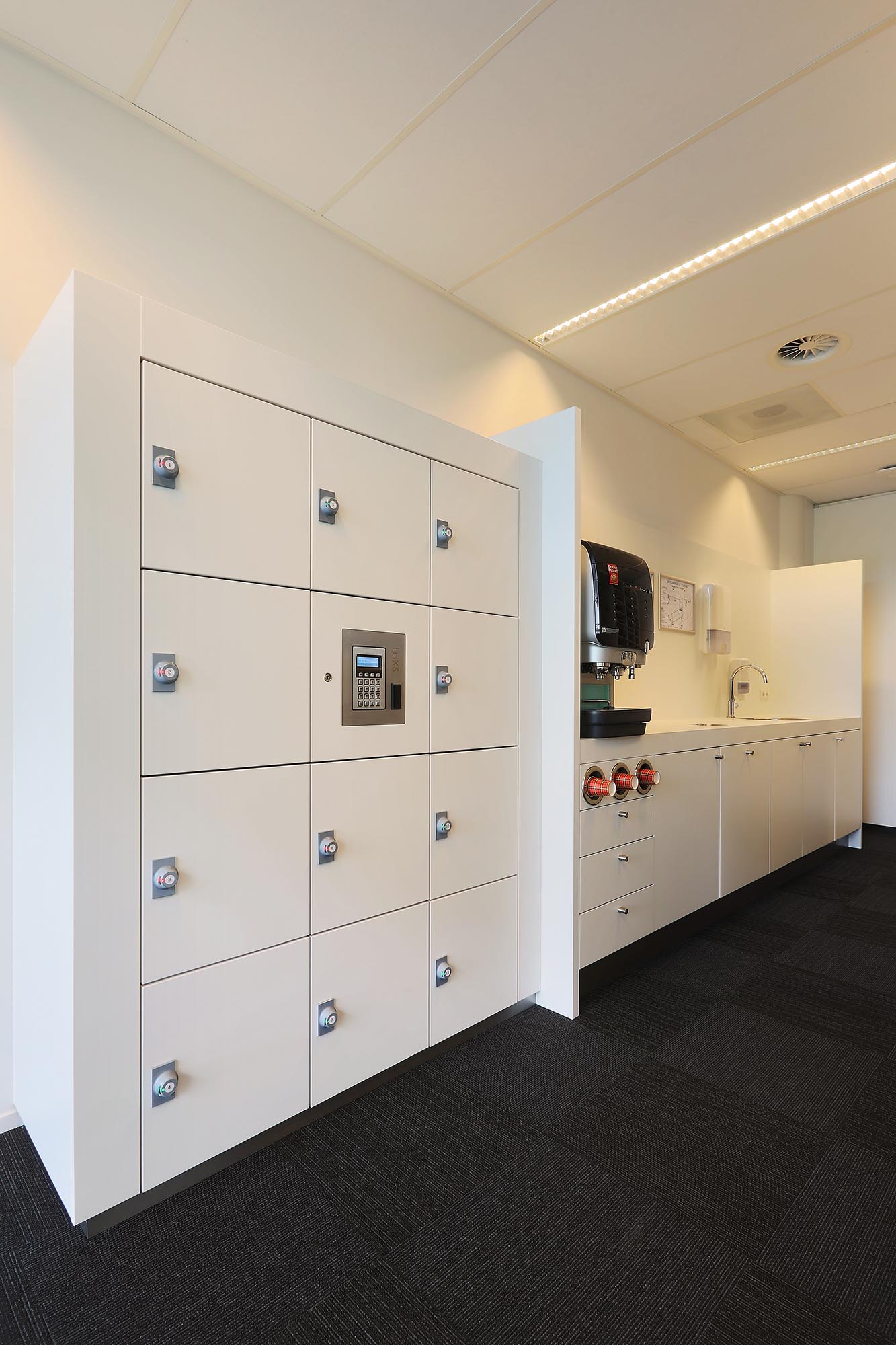 Iedere lockerkast is maatwerk. Zo kunnen lockers in een pantryblok verweven worden om zo een multifunctionele unit te creëren. De grootte van de kluisjes, materialisatie en electrische systemen zijn allemaal aan te passen aan uw wensen. Zo maken wij als interieurbedrijf uw ideale interieur.