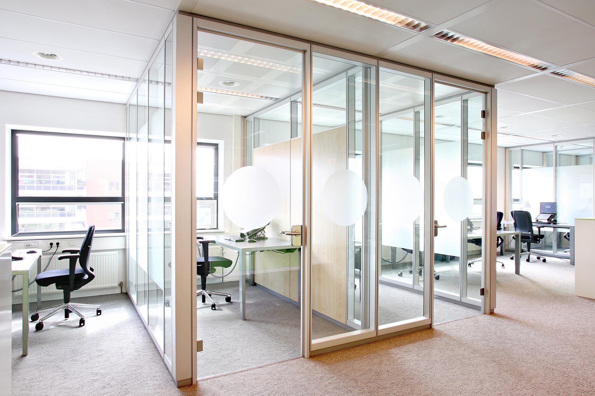 Intermontages glazen systeemwand biedt voor kantoor uitstekende geluidsisolatiewaarden. Deze gaan van Rw = 32 dB tot en met Rw = 40 dB. Dat zegt u misschien niet zo veel, maar zo ingewikkeld is het niet. Rw is de gewogen geluidreductie-index. Dit is een internationale, gestandaardiseerde waarde die aangeeft hoeveel geluid een scheidingsconstructie tegenhoudt. De Rw druk je uit in dB, ofwel decibel. Een glazen systeemwand met een Rw van 40 dB houdt dus veertig decibel van het geproduceerde geluid tegen. Deze geluidwerende eigenschap van een glazen systeemwand op kantoor is gewenst, omdat werknemers dan rustig kunnen werken of vertrouwelijke gesprekken kunnen voeren.