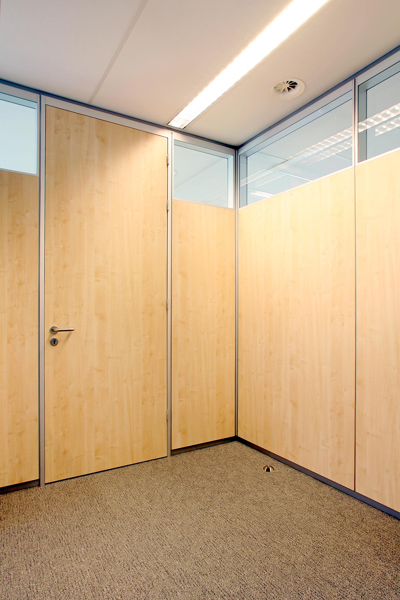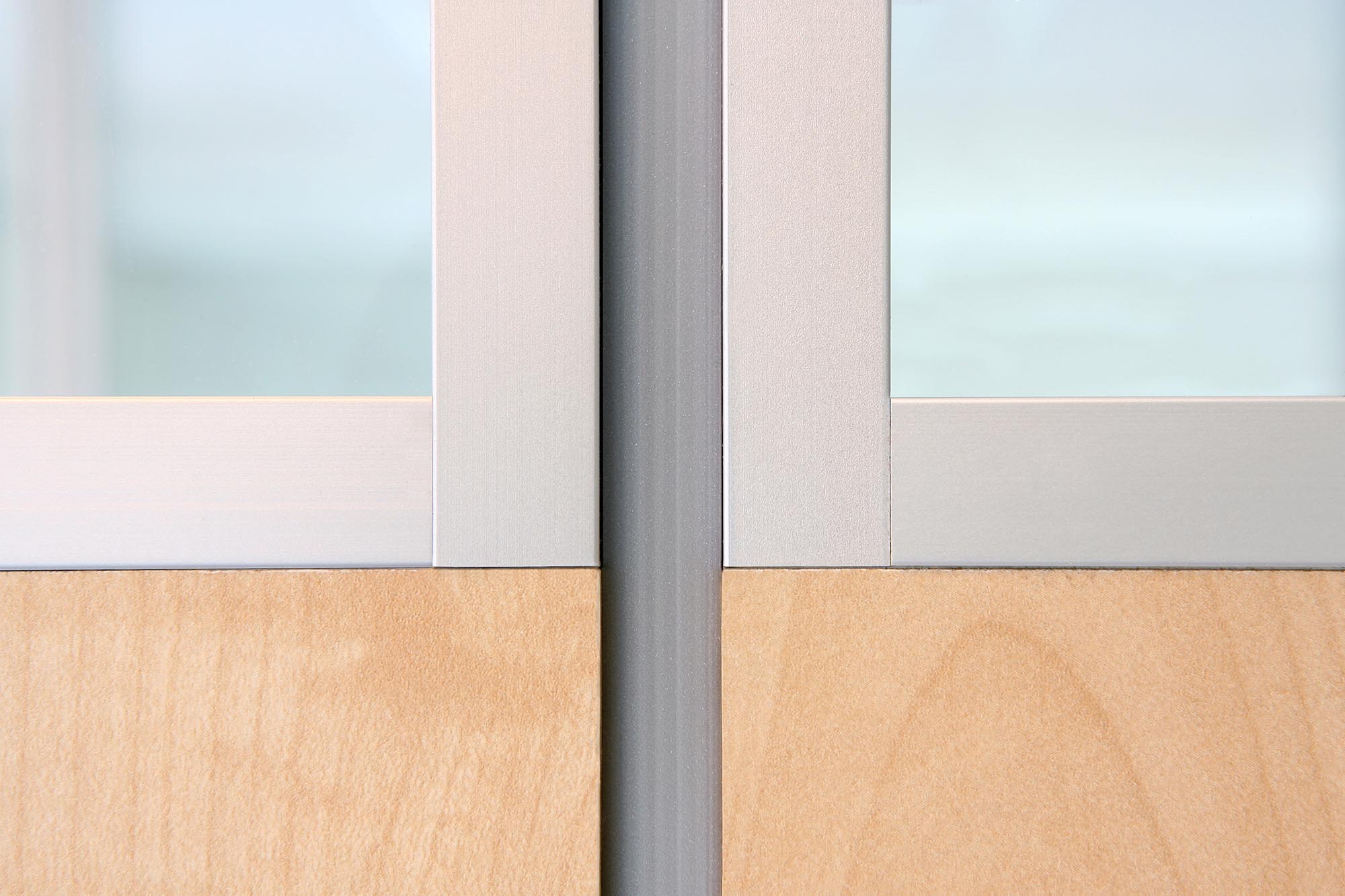 De belangrijkste details van de IM 1000 VT systeemwand zijn de terug liggende plint en de 10 mm terug liggende voeg. In combinatie met terug liggende, niet wand omvattende muur- en plafondaansluitingen, geven deze detailleringen de systeemwand een zwevend karakter. De geluidsisolatiewaarden zijn vanaf Rw=36dB t/m Rw=39dB. Naast een glazen uitvoering, kan deze wand ook in een gesloten variant geplaatst worden.