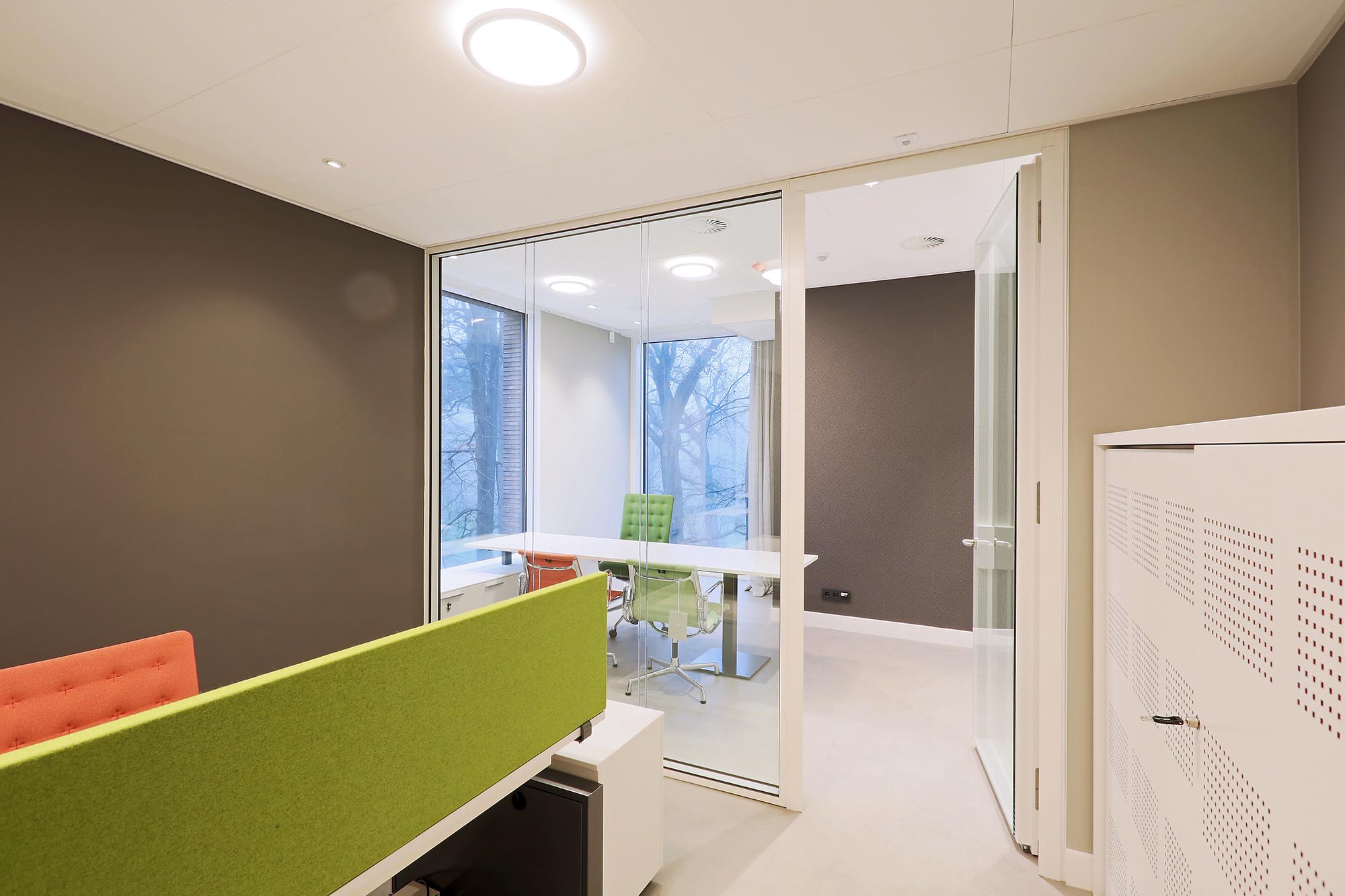 Een TWIN dubbelglas systeemwand biedt meer geluidsisolatie en zorgt voor een ruimtelijke uitstraling door het glas. Hierdoor is het een goede scheidingswand voor kantoren.