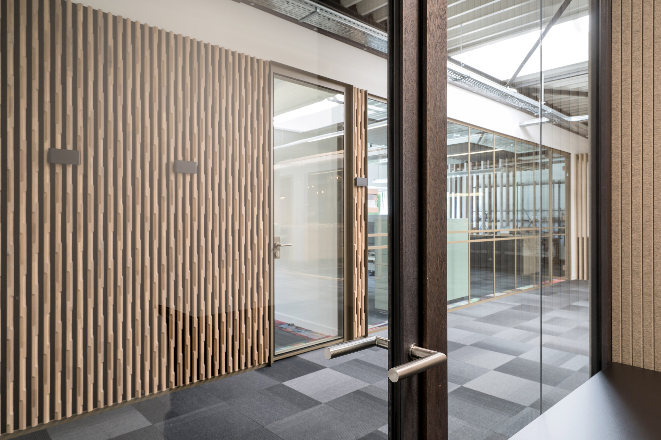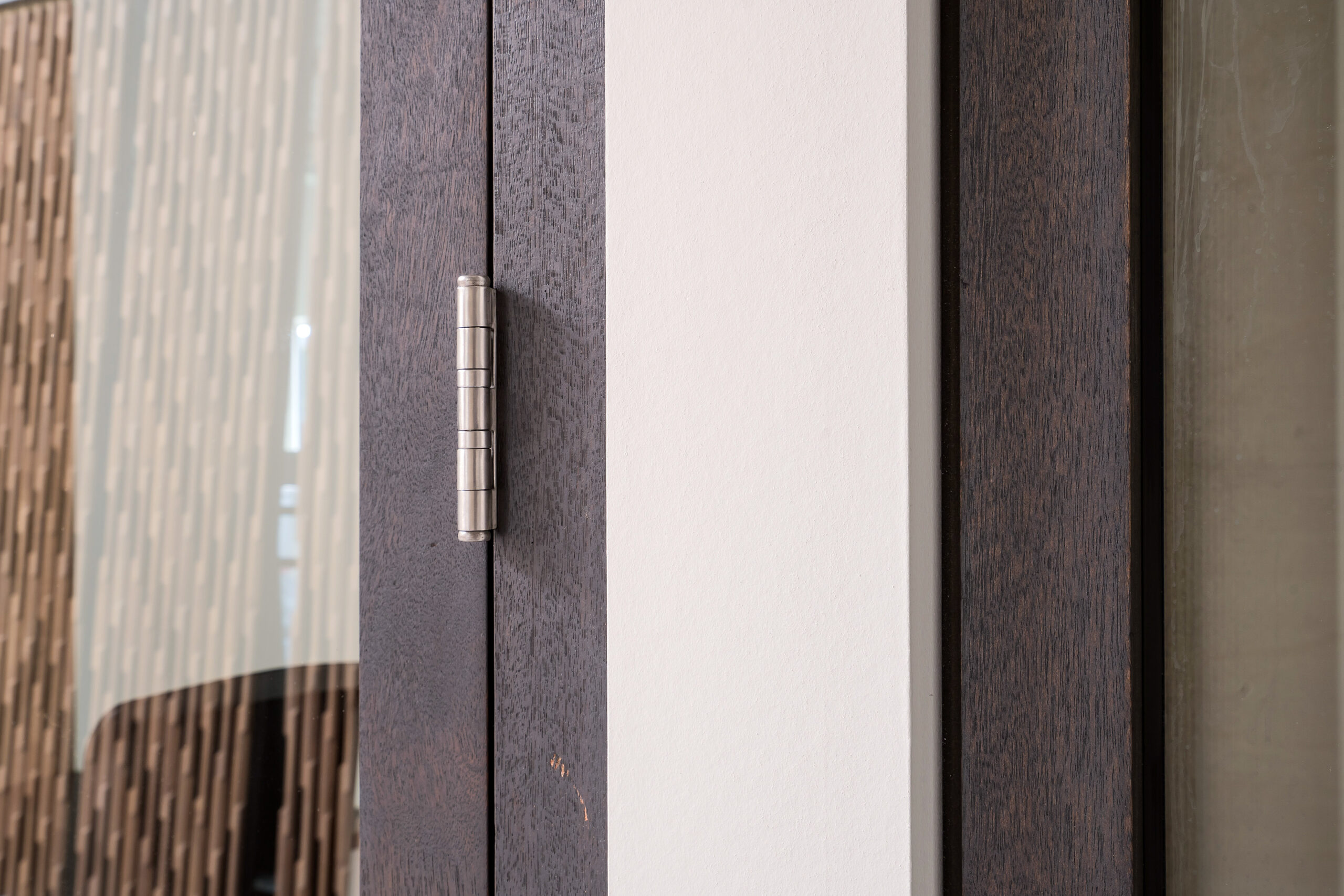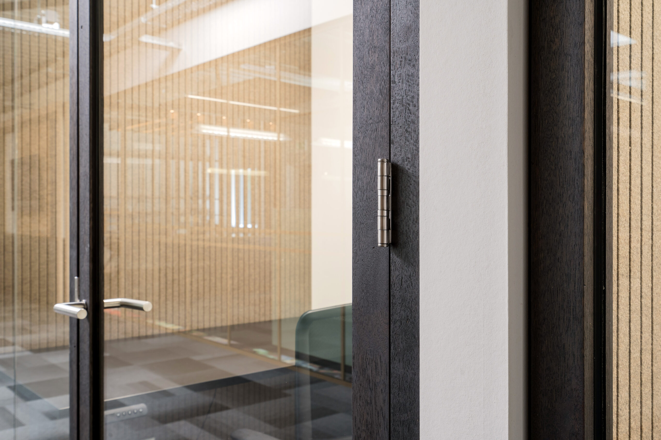 De WoodFrame Slim Meranti bestaat uit gevingerlast gelamineerde meranti profielen, die worden gebruikt in een glazen systeemwand met een slanke houten profilering. Deze wand wordt volledig geïntegreerd met een bijpassend deurkozijn en een houten kaderdeur, voor een uniforme interieuroplossing.
