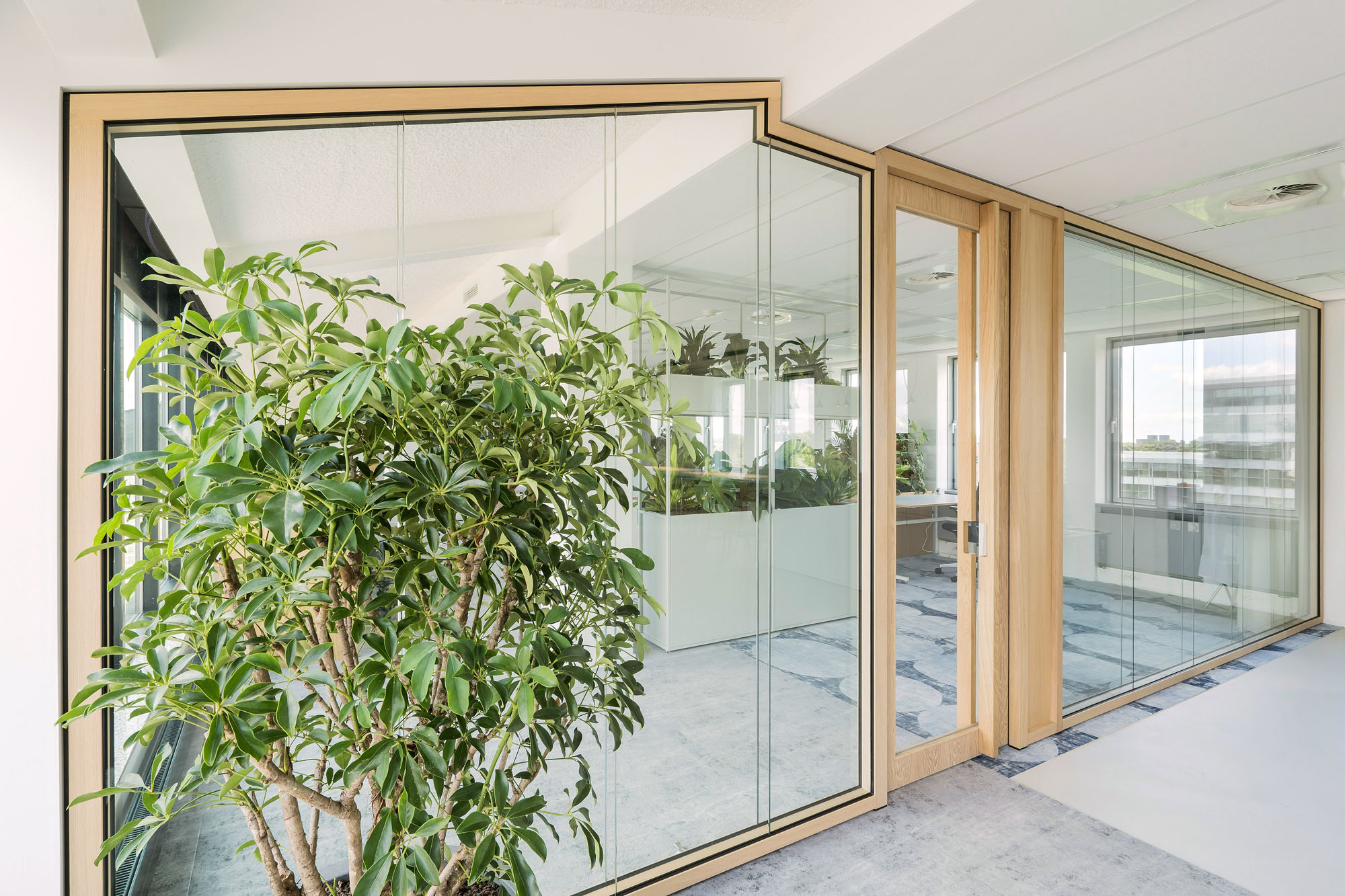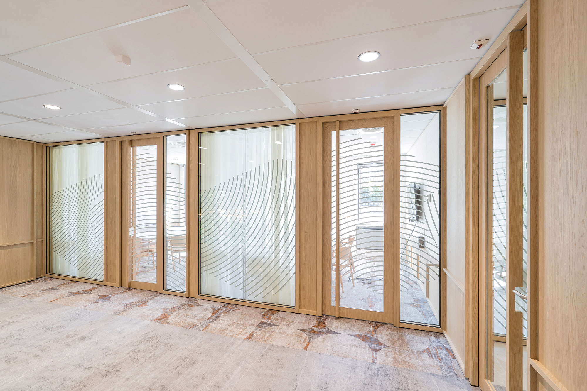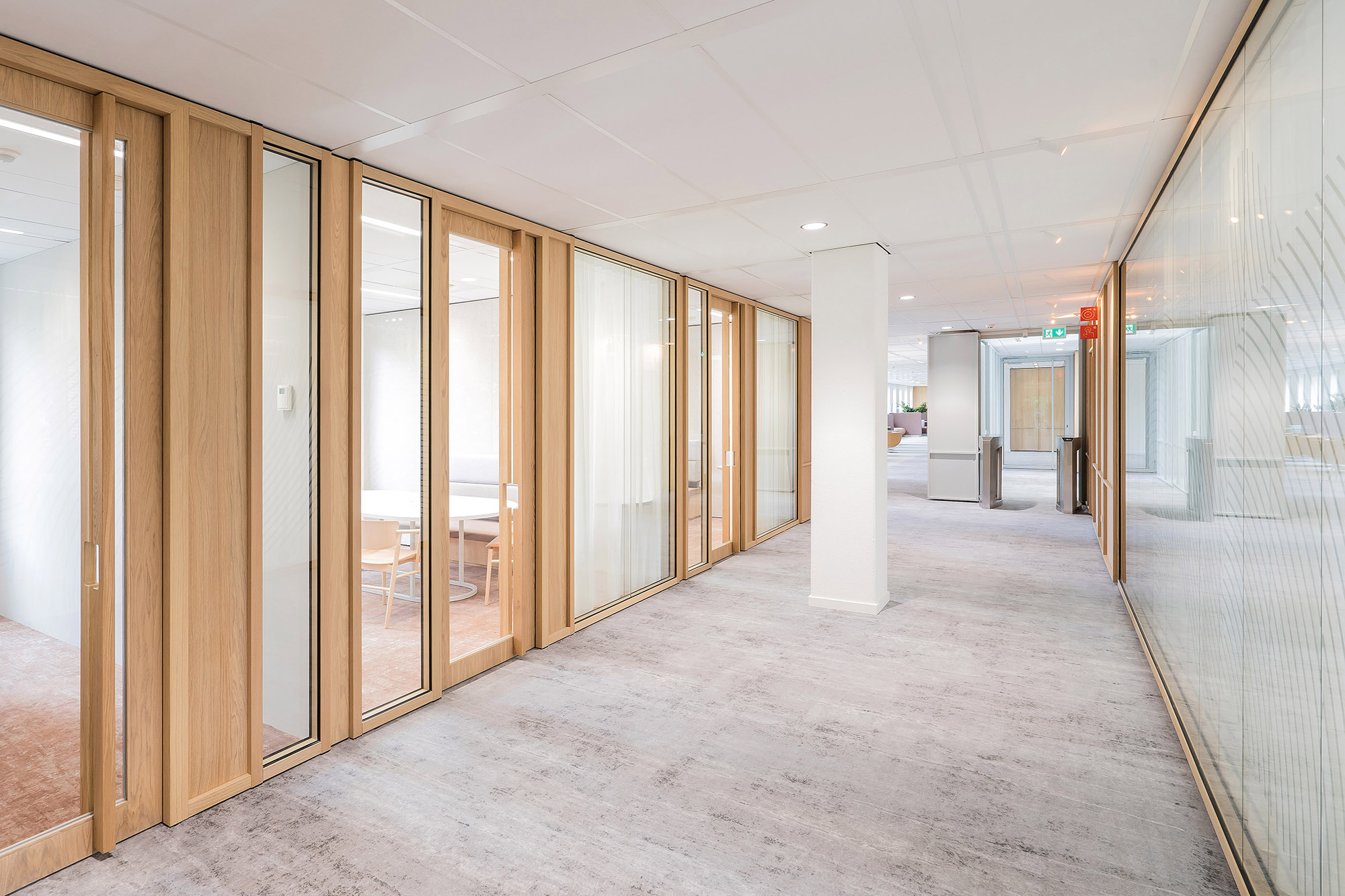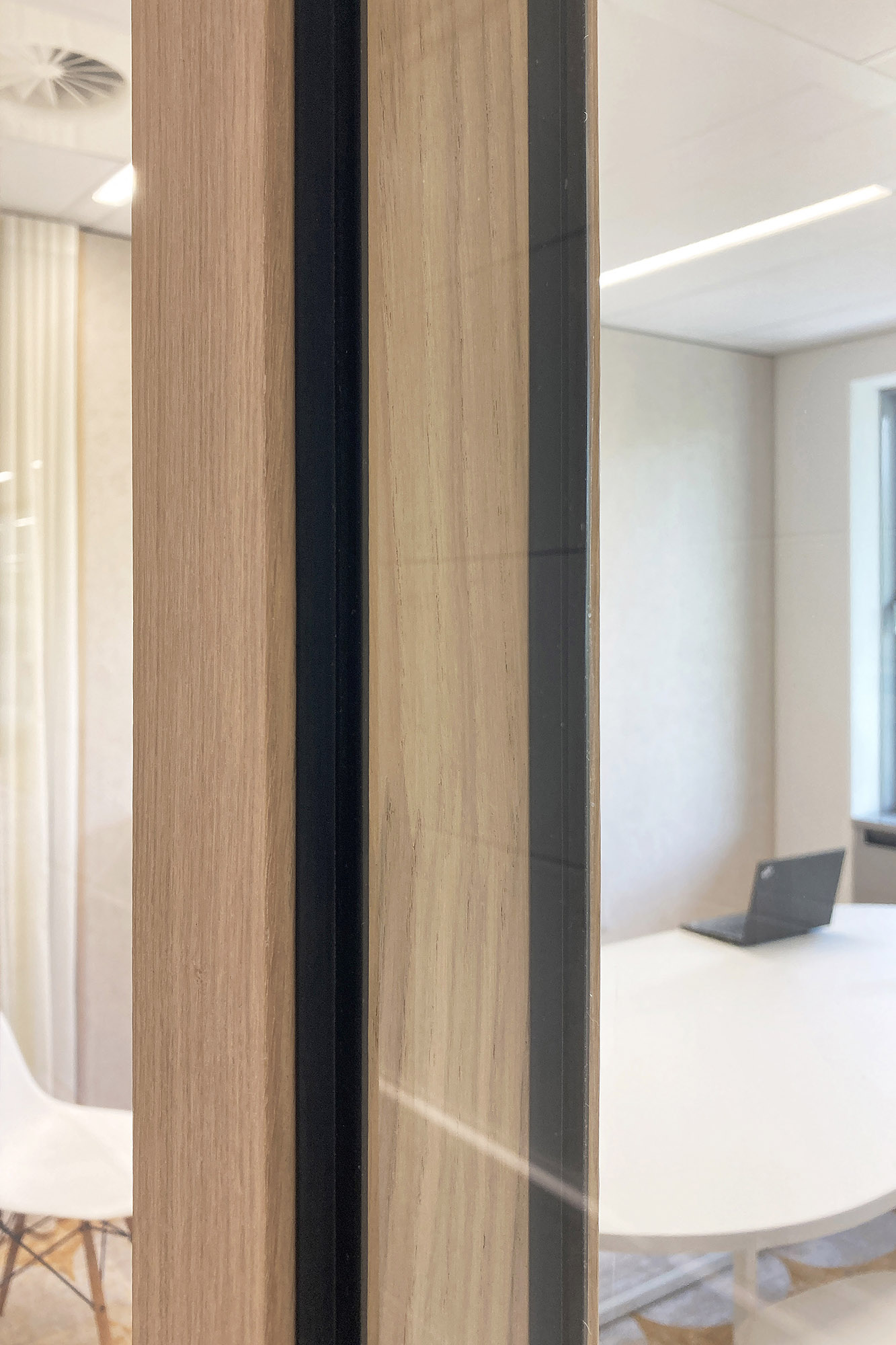 Deze dubbele glaswand biedt een hoge geluidsisolatiewaarde gecombineerd met een warme uitstraling. Privacy blijft gewaarborgd, terwijl transparantie behouden blijft. Het eikenhout wordt zorgvuldig geselecteerd en verwerkt tot 100mm profielen, die deze glazen systeemwand haar duurzame en warme uitstraling geven