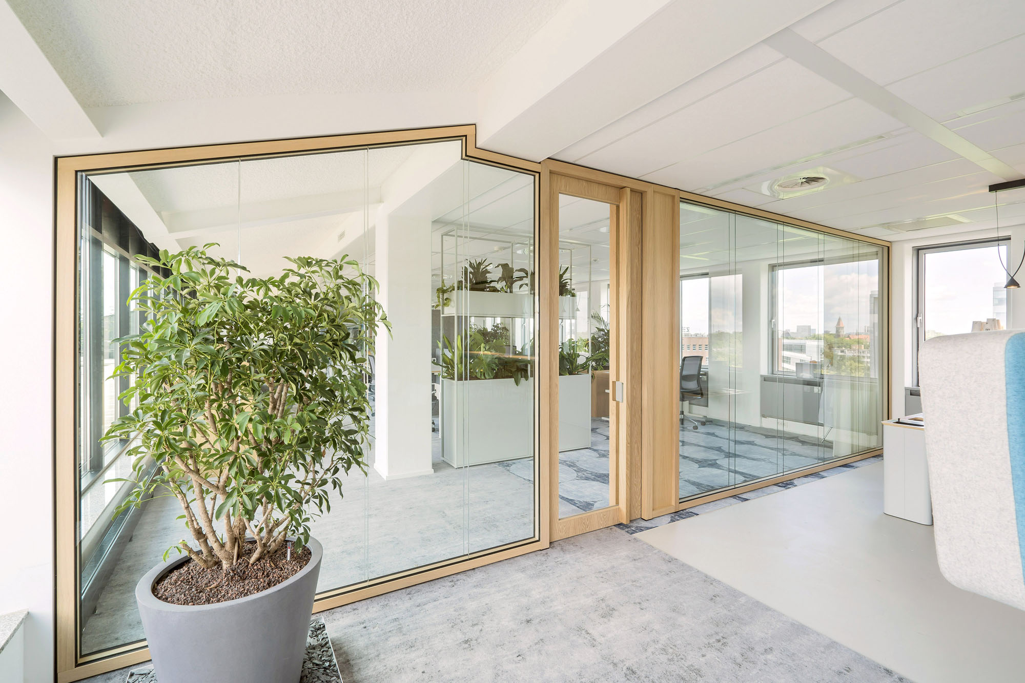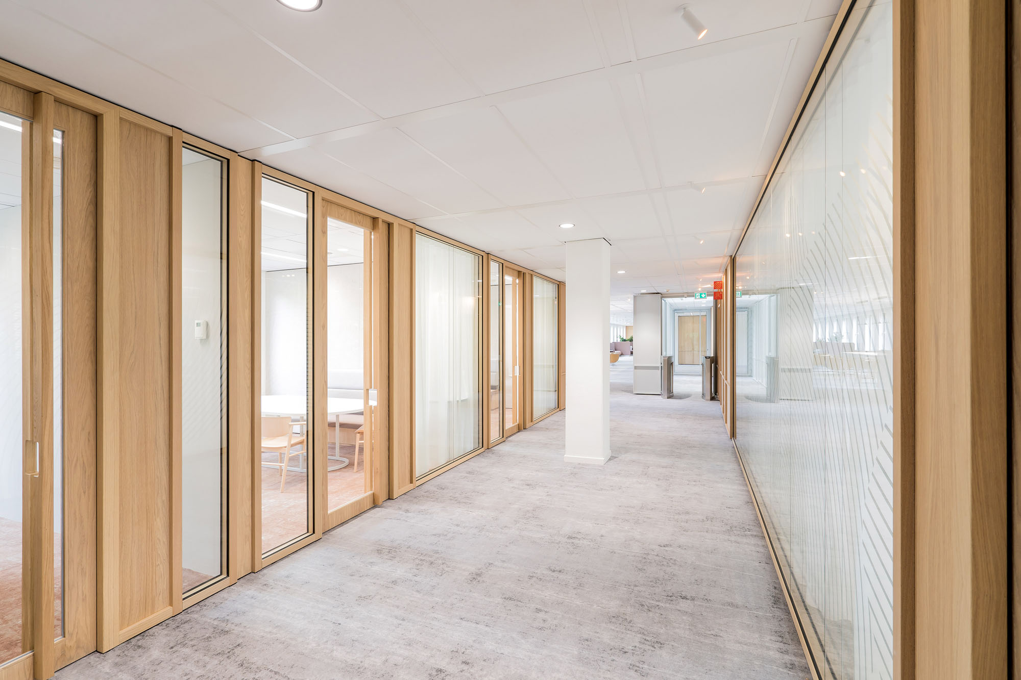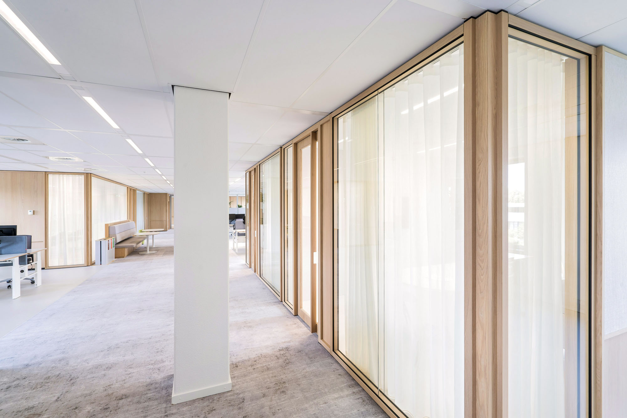 Deze dubbele glaswand biedt een hoge geluidsisolatiewaarde gecombineerd met een warme uitstraling. Privacy blijft gewaarborgd, terwijl transparantie behouden blijft. Het eikenhout wordt zorgvuldig geselecteerd en verwerkt tot 100mm profielen, die deze glazen systeemwand haar duurzame en warme uitstraling geven