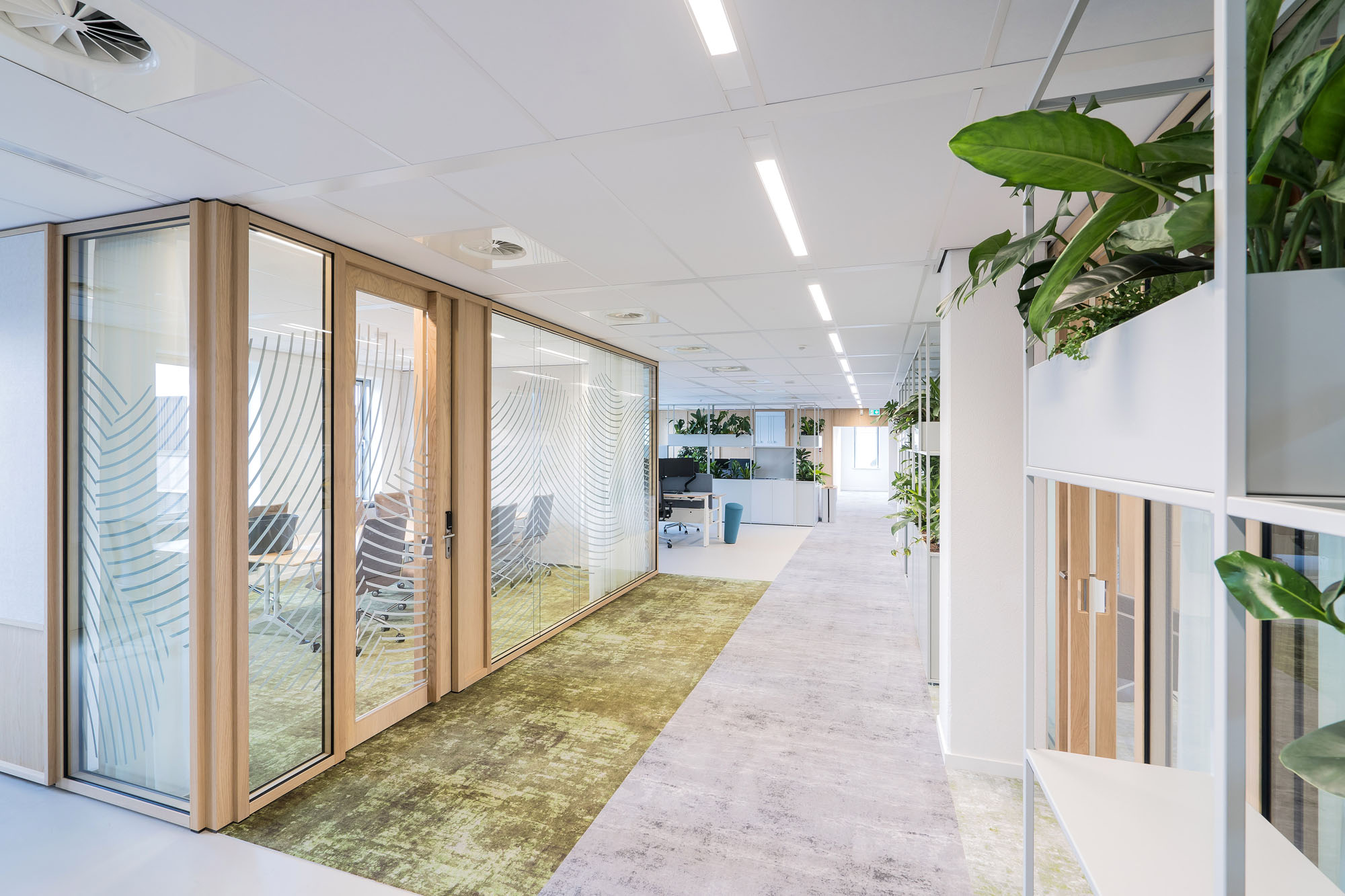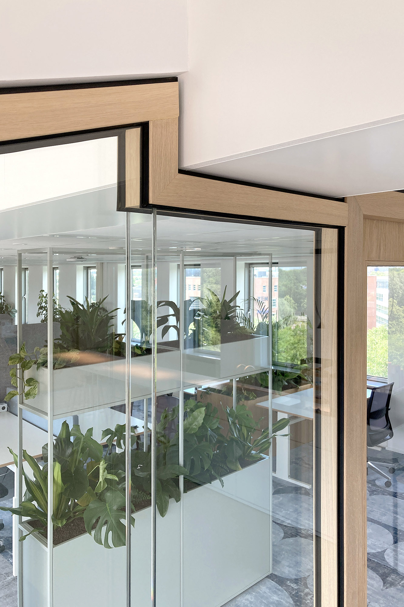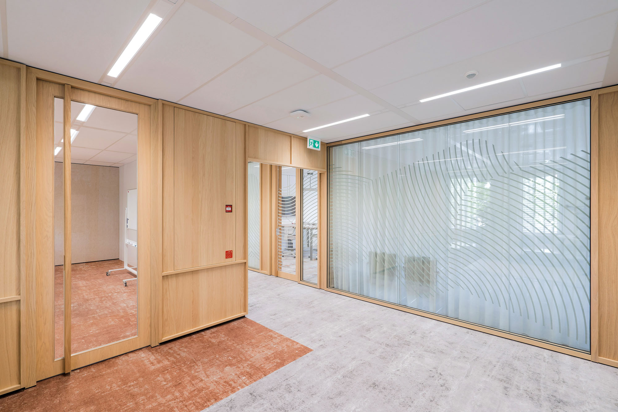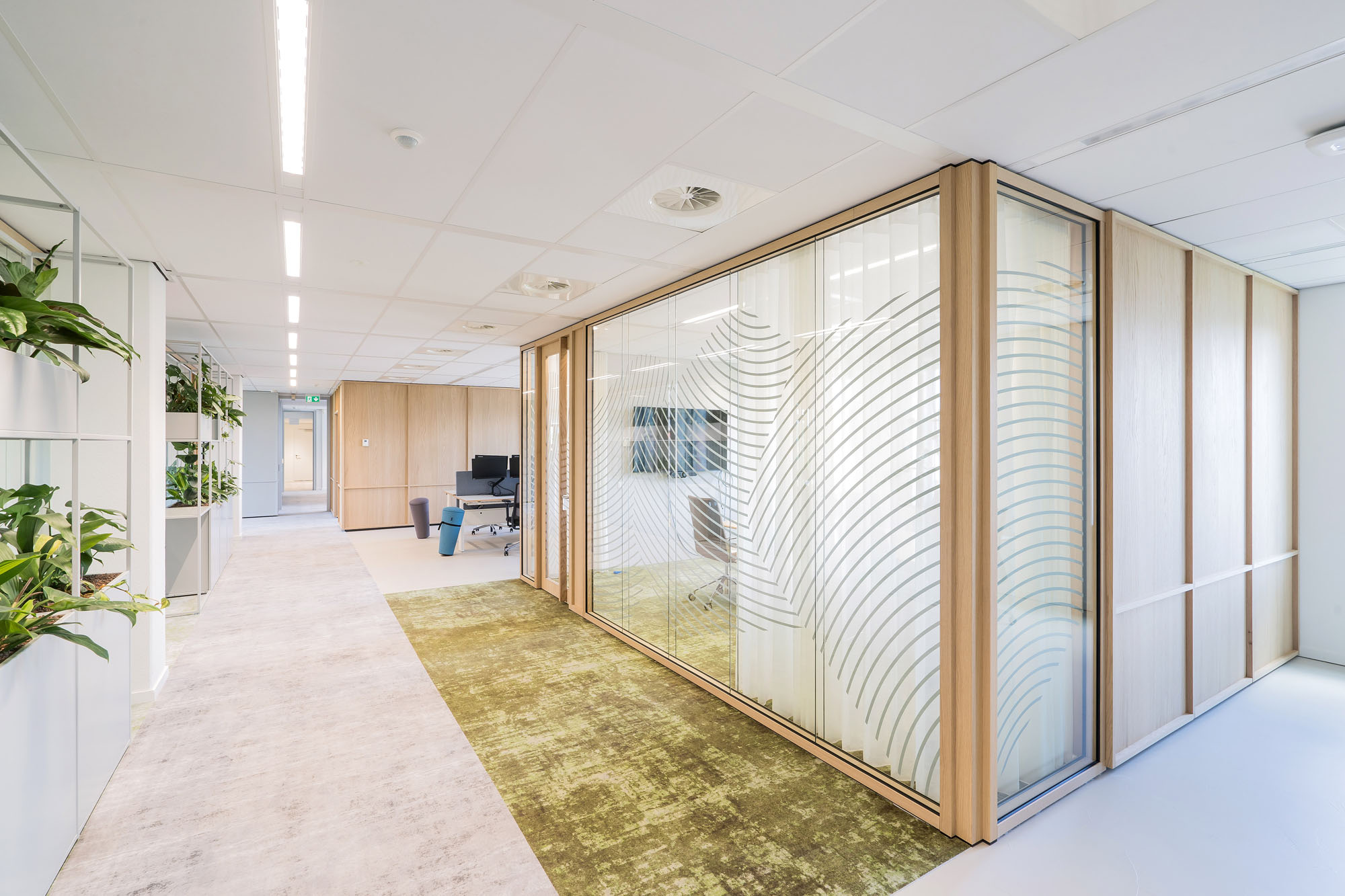 Deze dubbele glaswand biedt een hoge geluidsisolatiewaarde gecombineerd met een warme uitstraling. Privacy blijft gewaarborgd, terwijl transparantie behouden blijft. Het eikenhout wordt zorgvuldig geselecteerd en verwerkt tot 100mm profielen, die deze glazen systeemwand haar duurzame en warme uitstraling geven