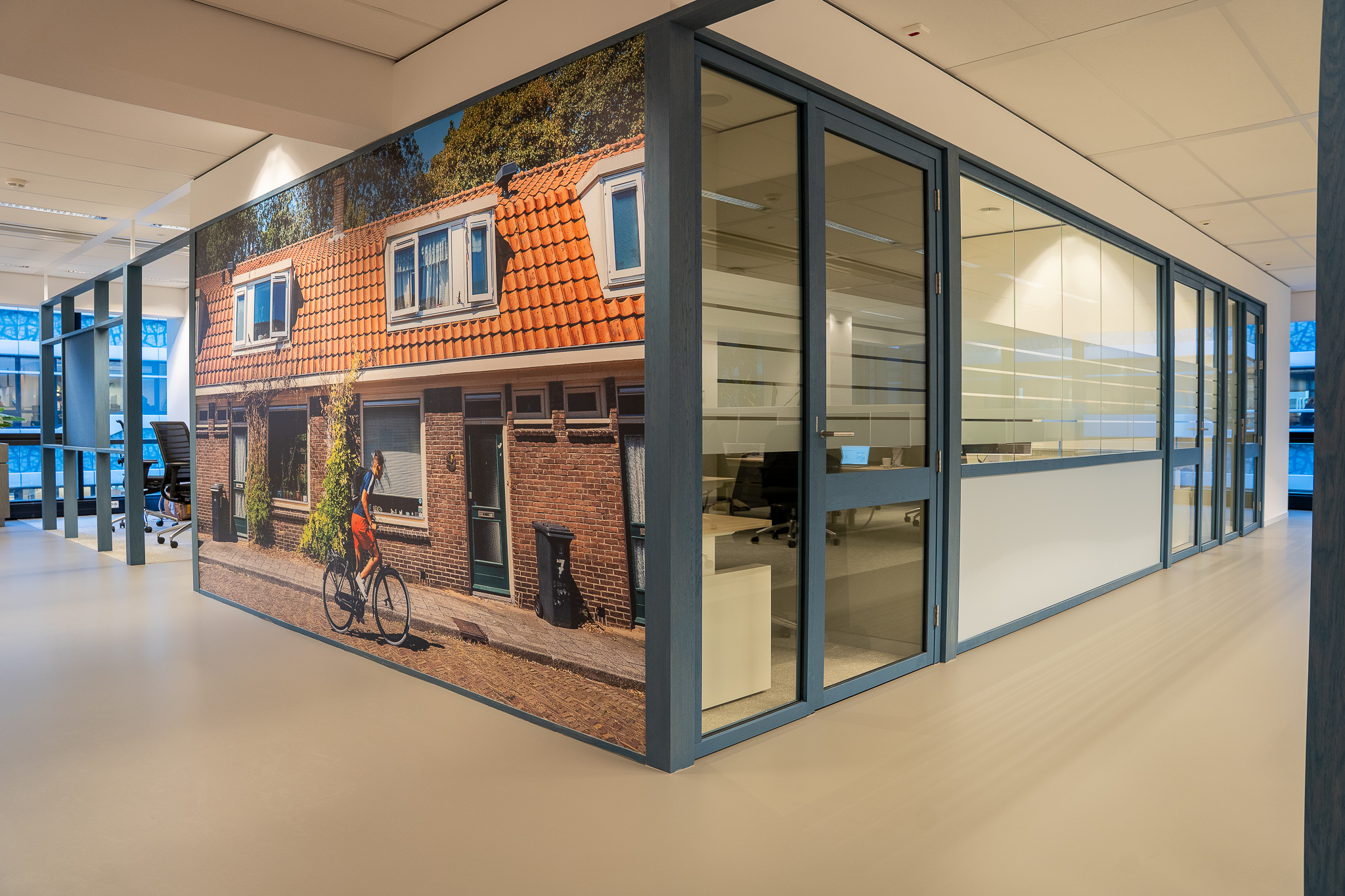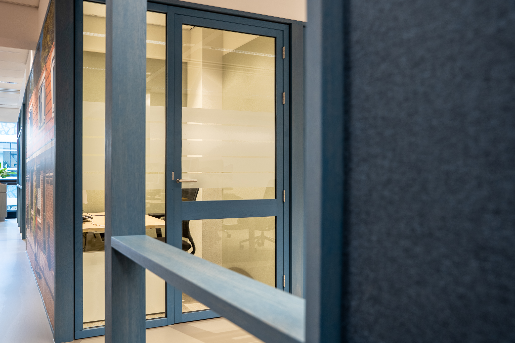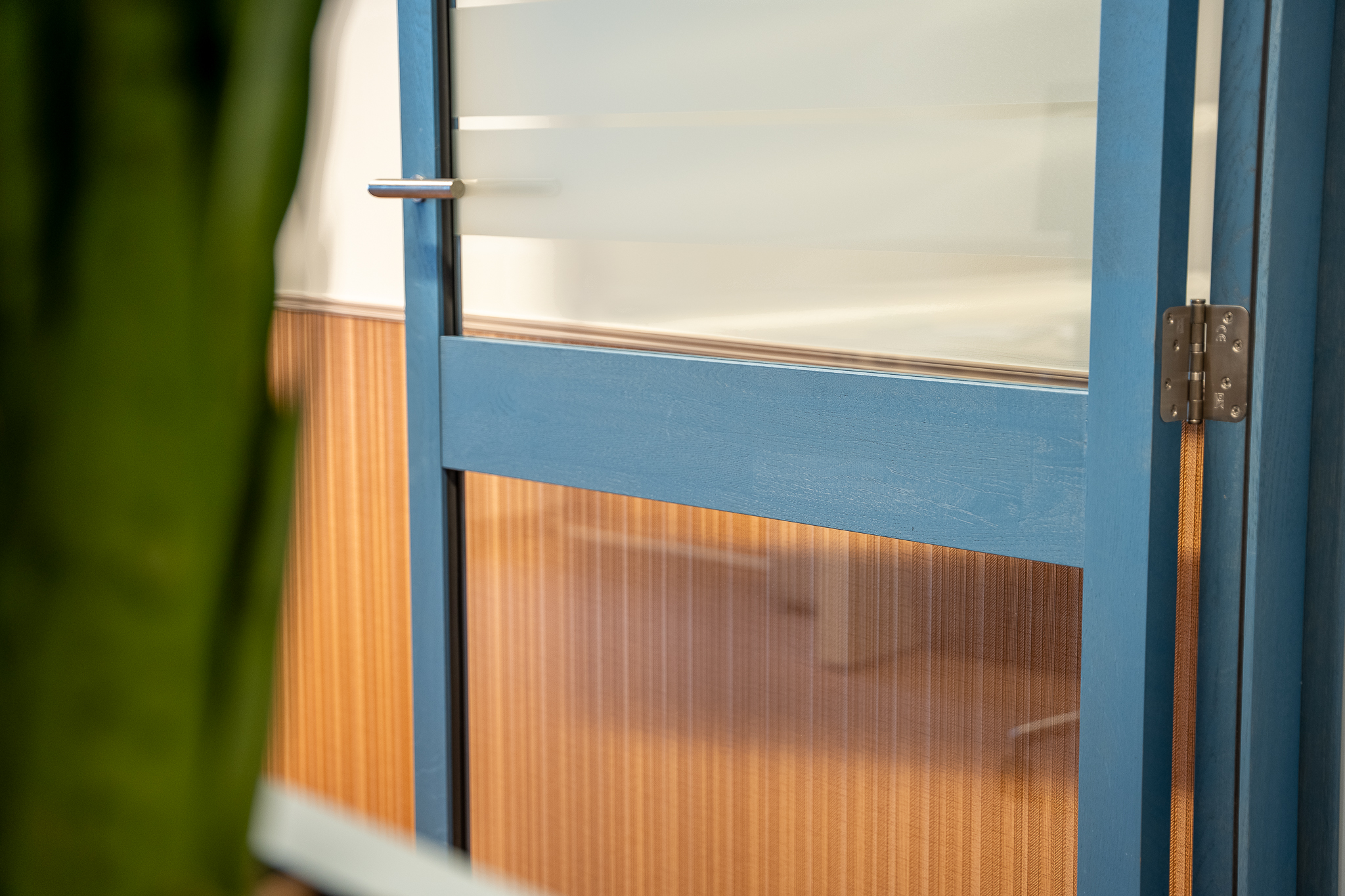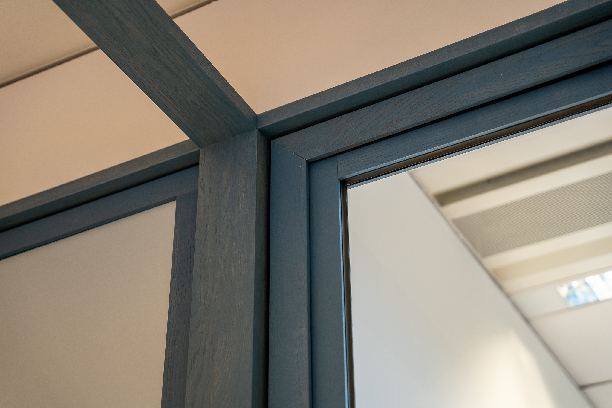 Voor de glaswanden is gekozen voor de IM WoodFrame Slim Oak wanden. De systeemwandprofielen zijn gemaakt van reststromen eikenhouten lamellen. Deze zijn afkomstig uit Europese FSC-gecertificeerde meubelbedrijven. De gekozen kleurafwerking is Aurora Blue.