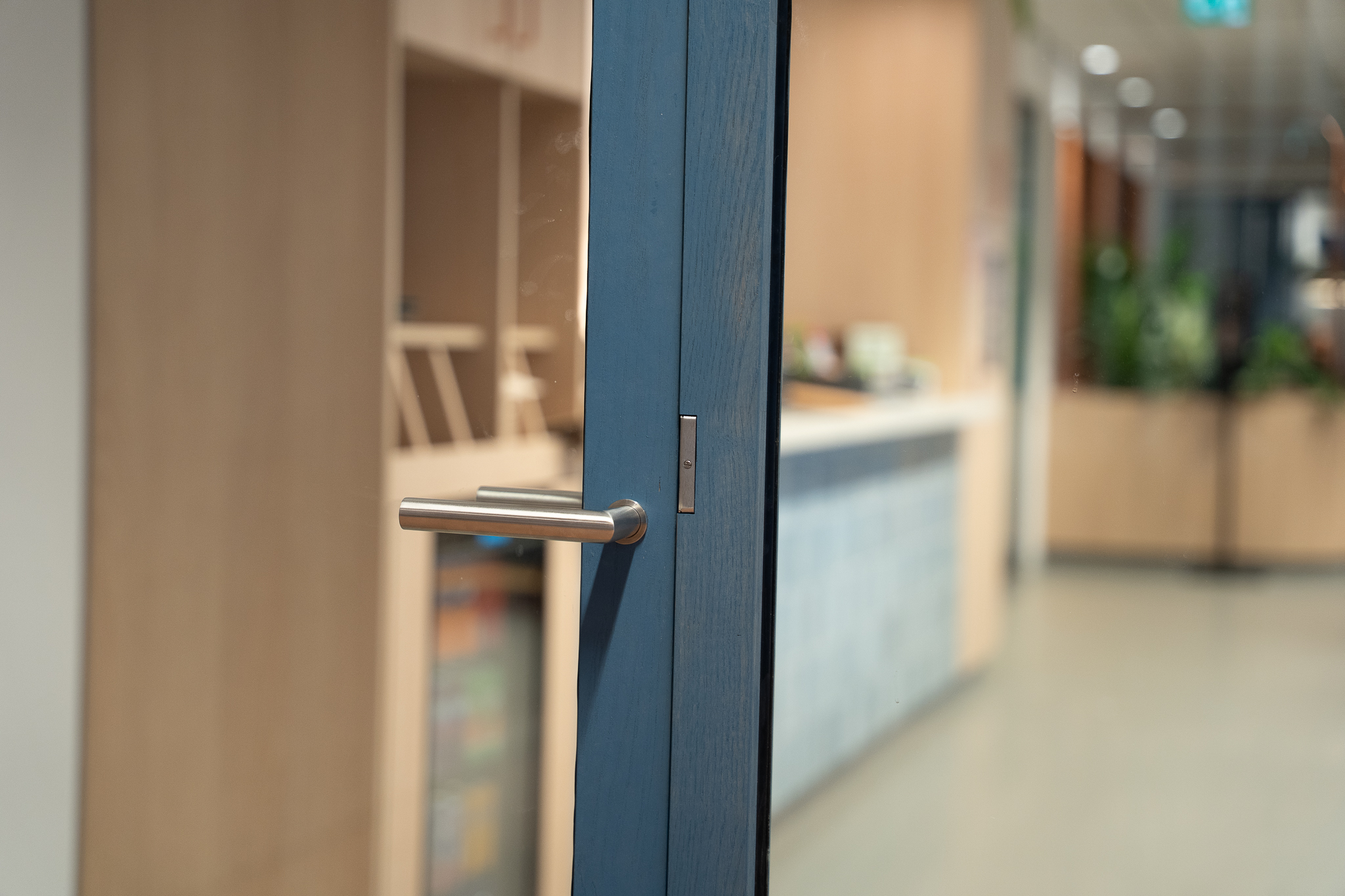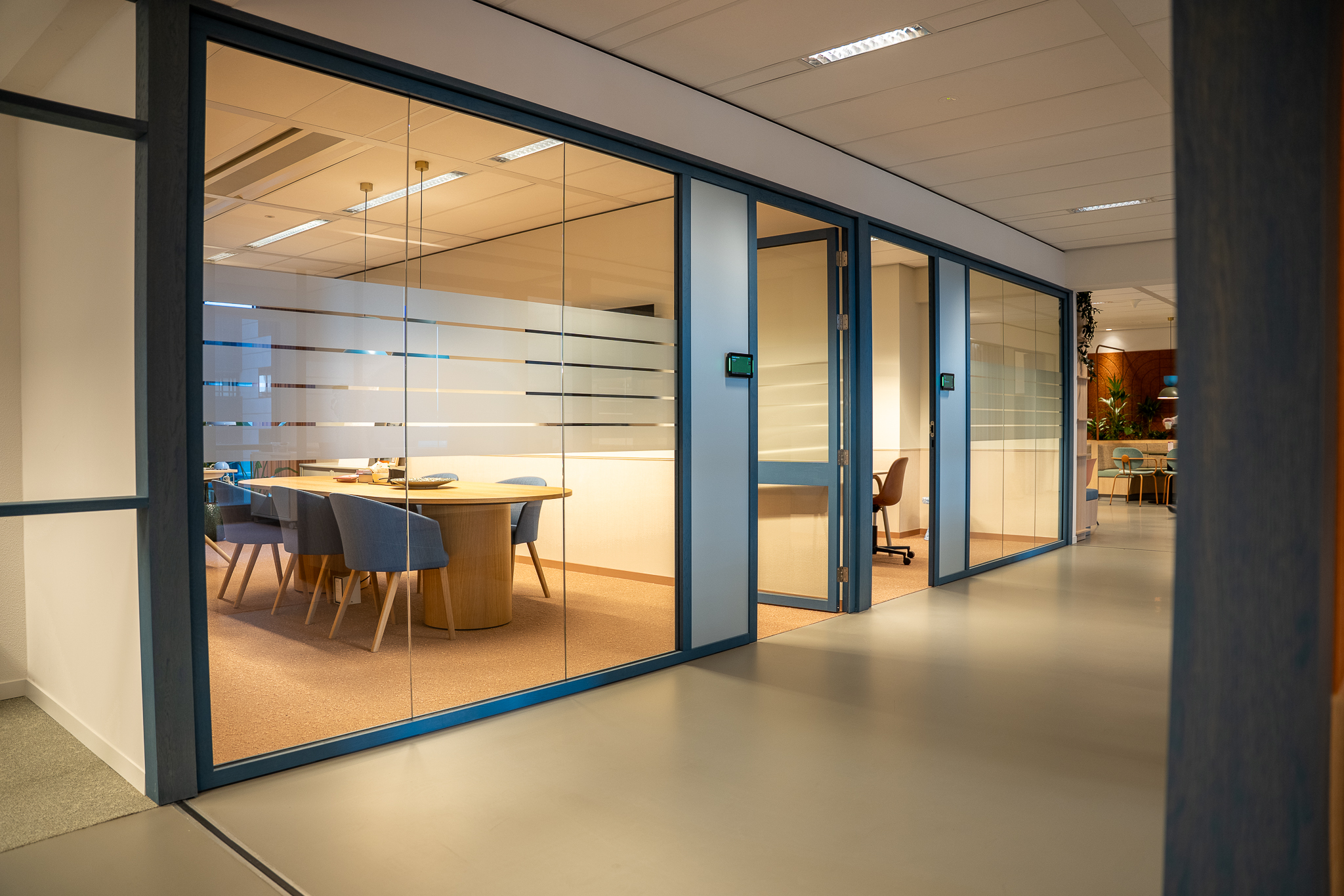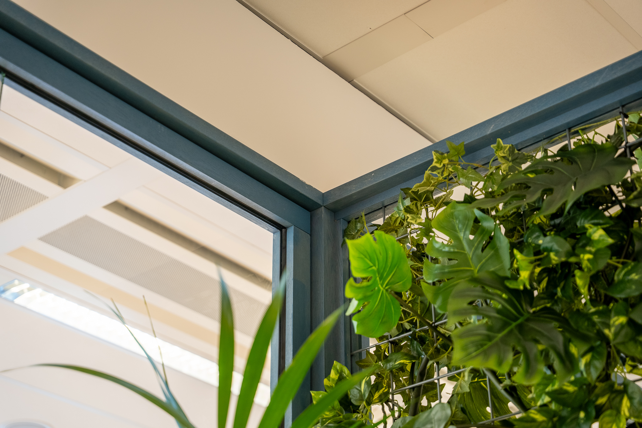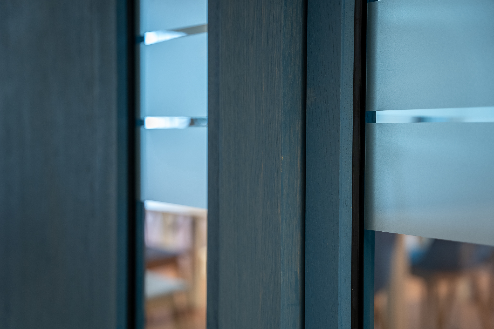 Voor de glaswanden is gekozen voor de IM WoodFrame Slim Oak wanden. De systeemwandprofielen zijn gemaakt van reststromen eikenhouten lamellen. Deze zijn afkomstig uit Europese FSC-gecertificeerde meubelbedrijven. De gekozen kleurafwerking is Aurora Blue.