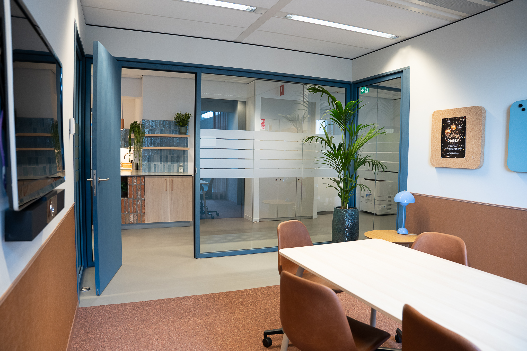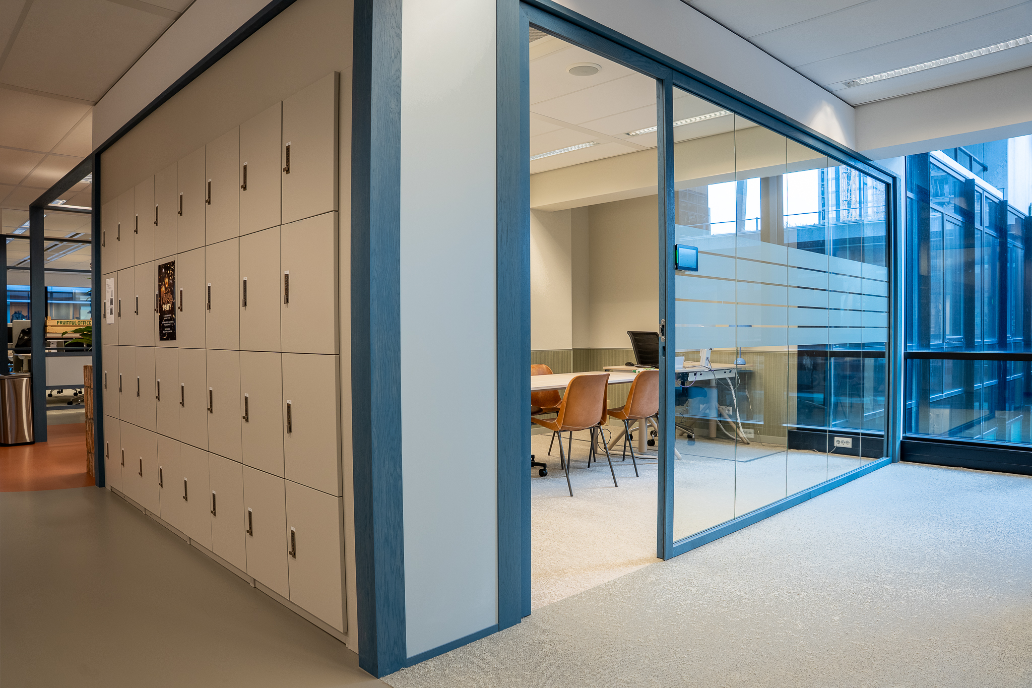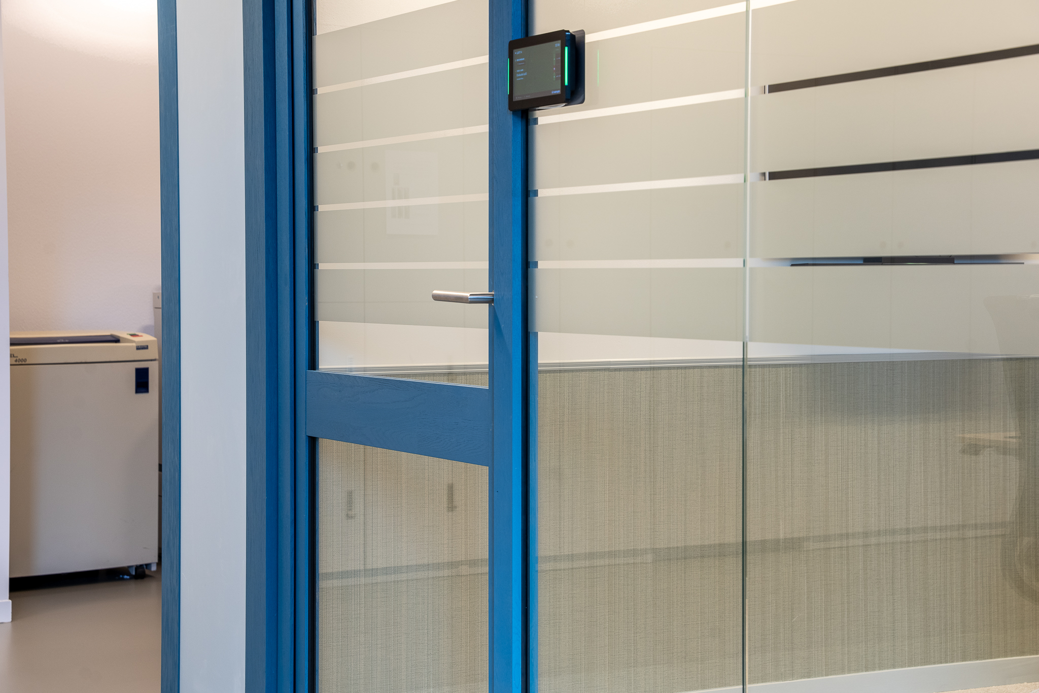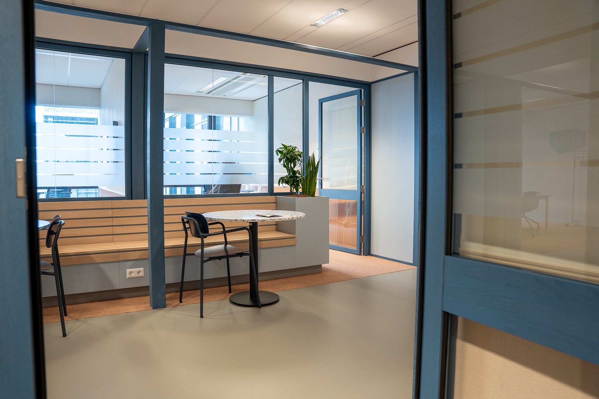 Voor de glaswanden is gekozen voor de IM WoodFrame Slim Oak wanden. De systeemwandprofielen zijn gemaakt van reststromen eikenhouten lamellen. Deze zijn afkomstig uit Europese FSC-gecertificeerde meubelbedrijven. De gekozen kleurafwerking is Aurora Blue.