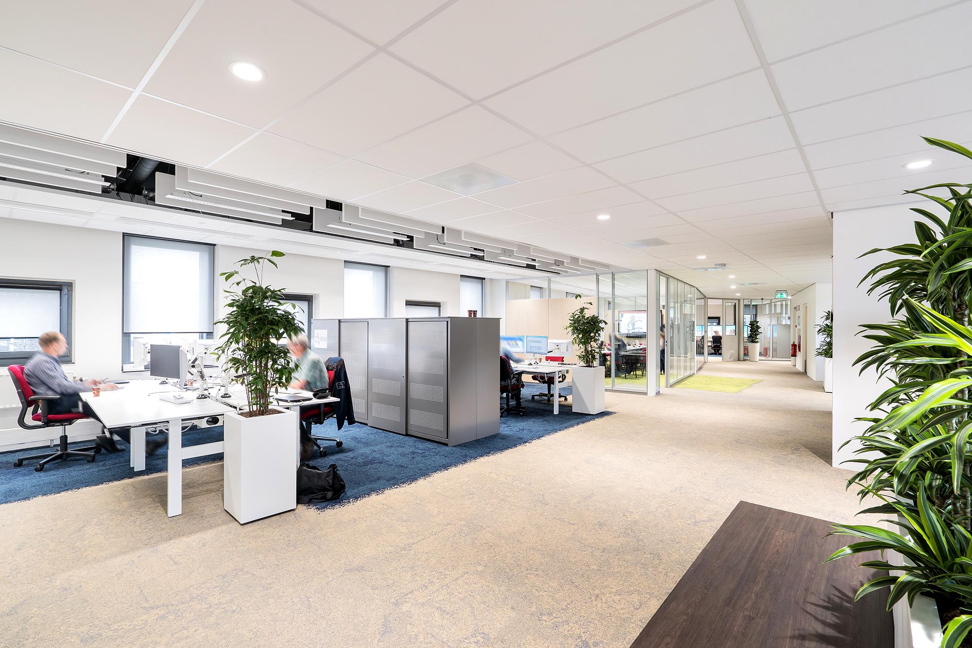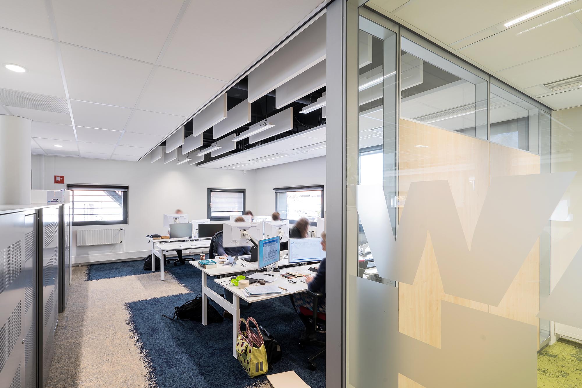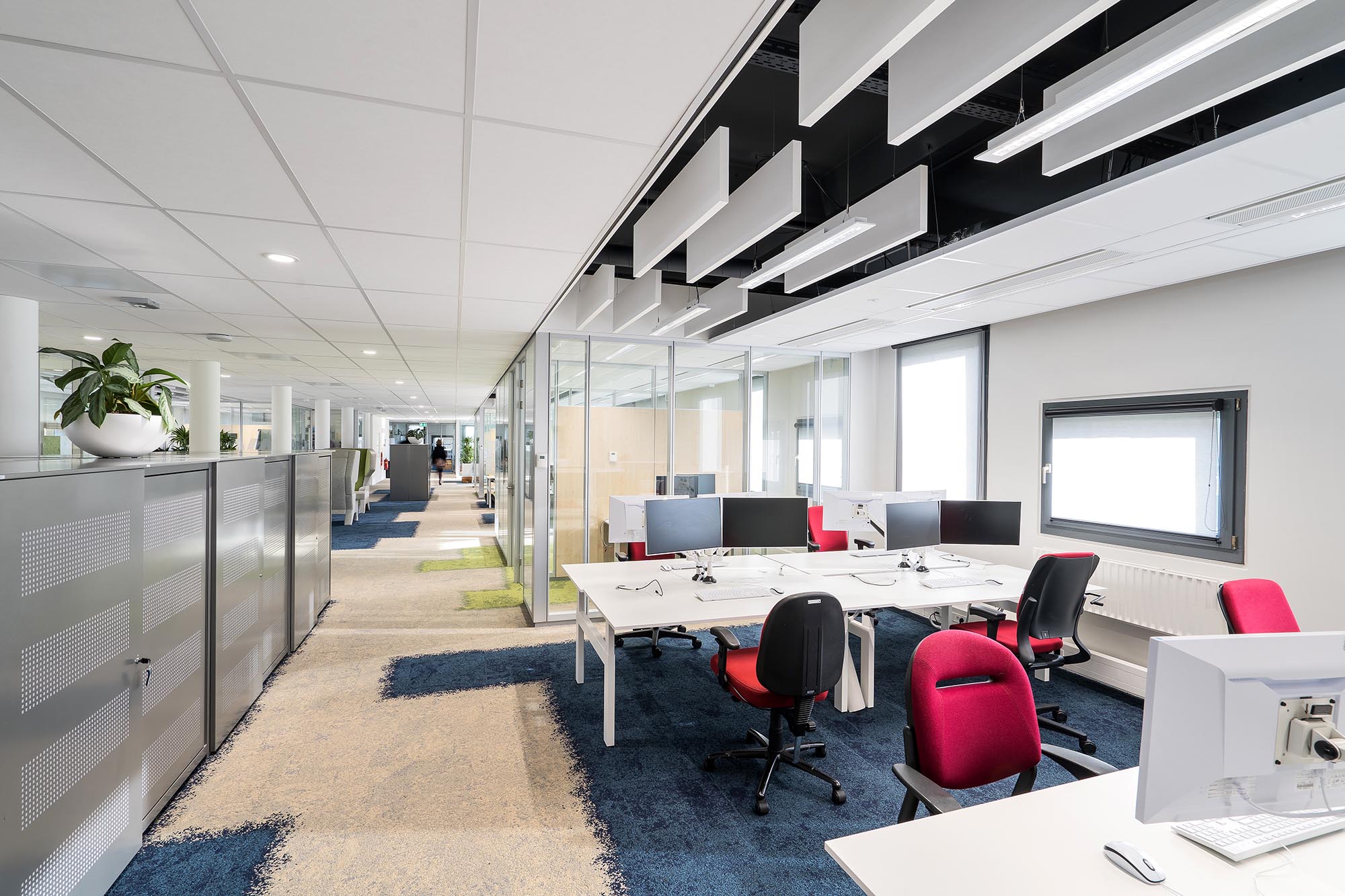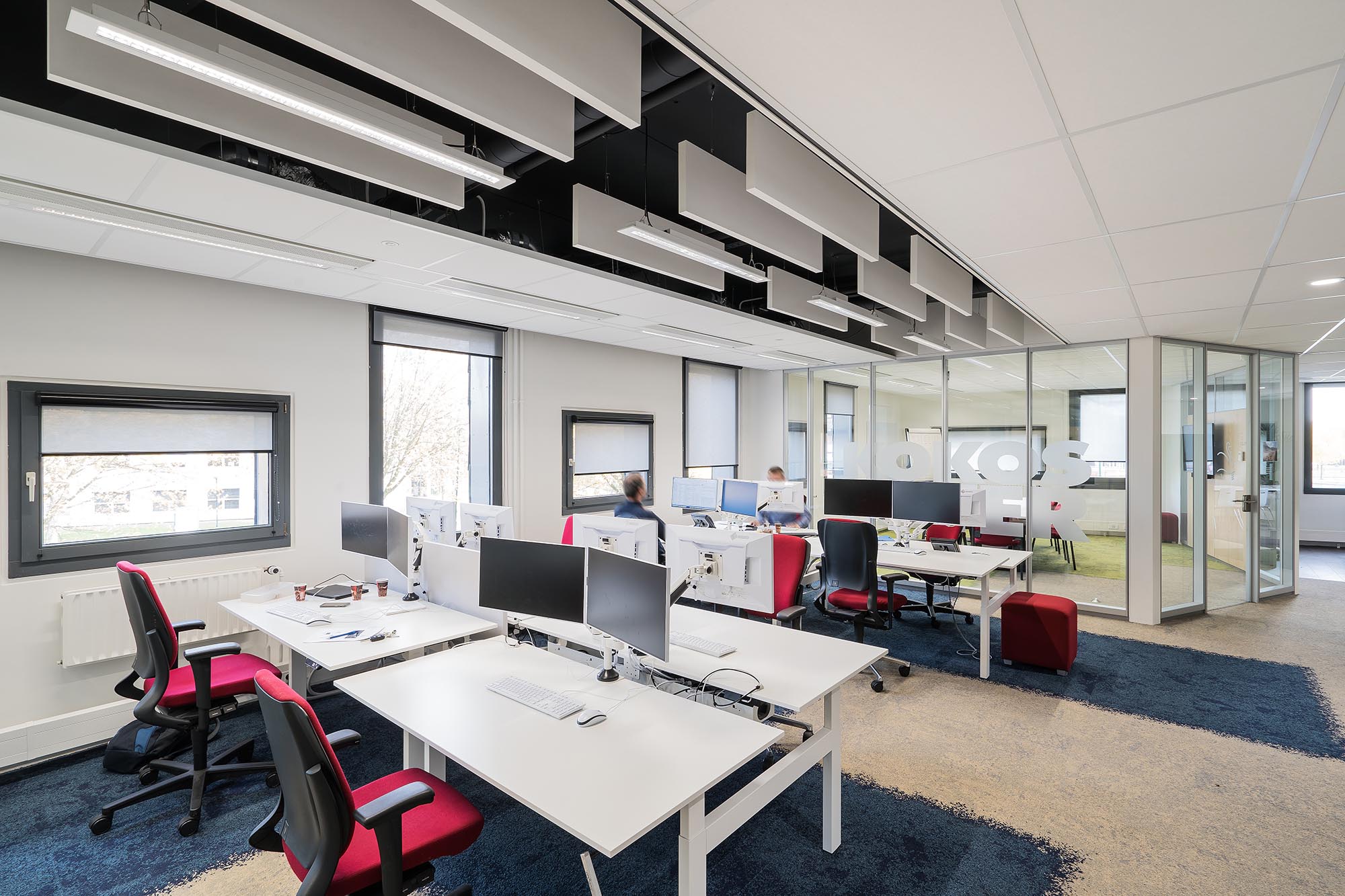Bij de open werkplekken zijn baffles geplaatst om samen met het akoestische systeemplafond een optimale akoestiek te realiseren voor de medewerkers.