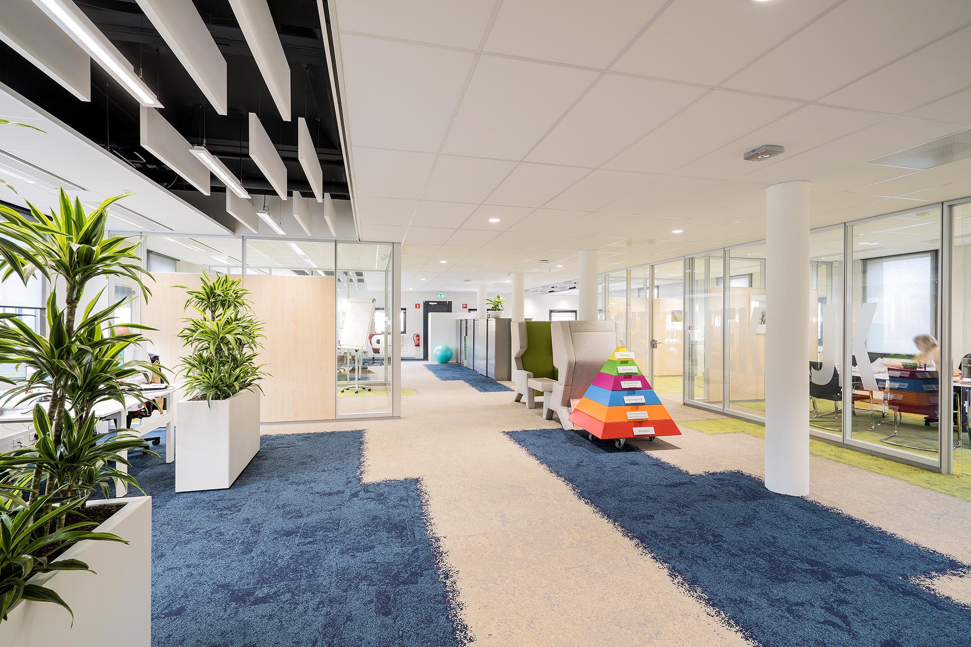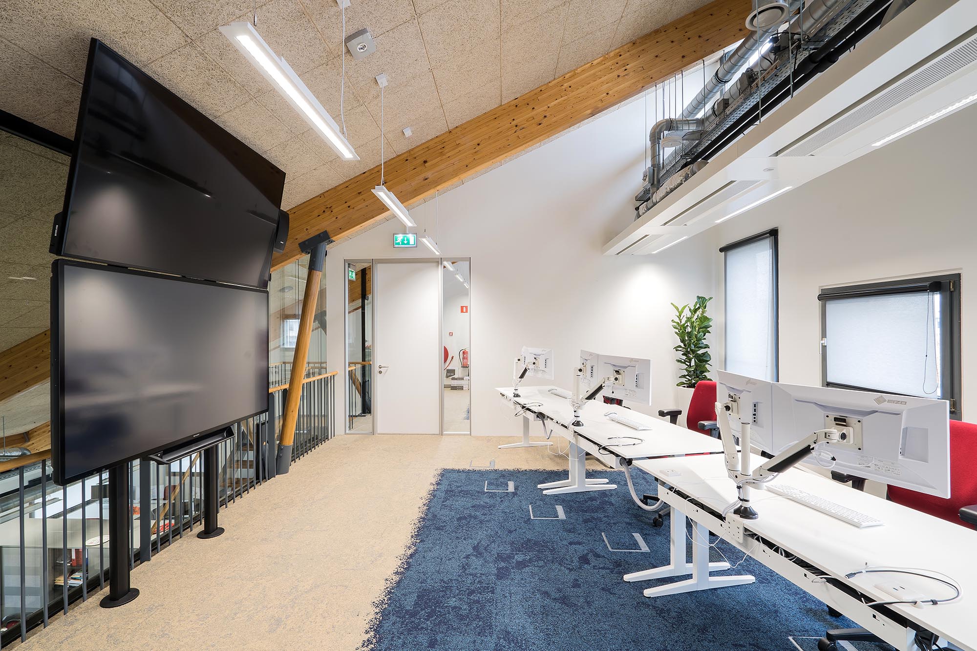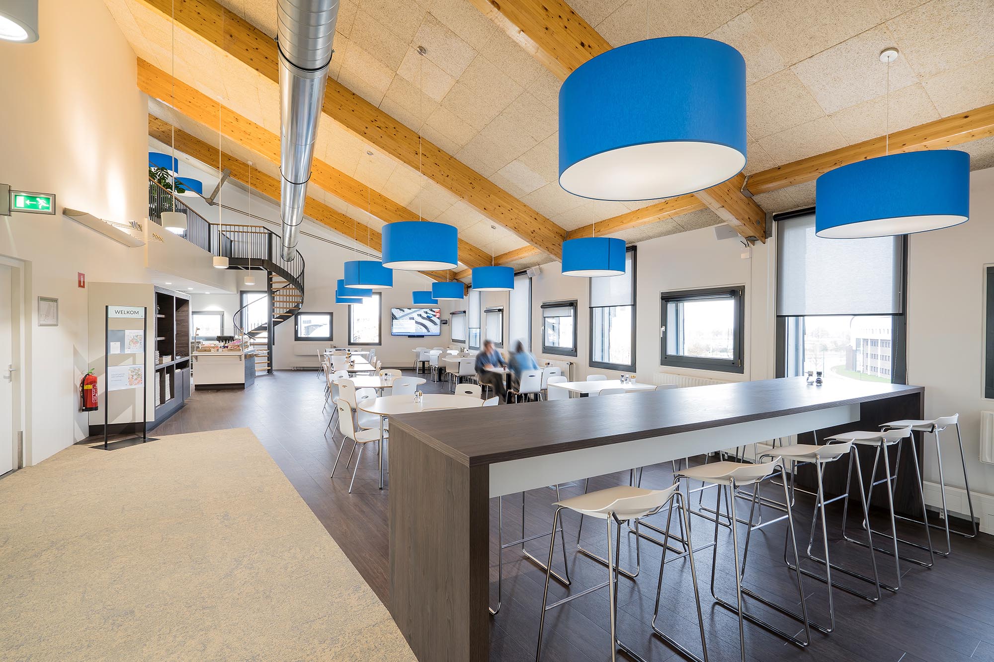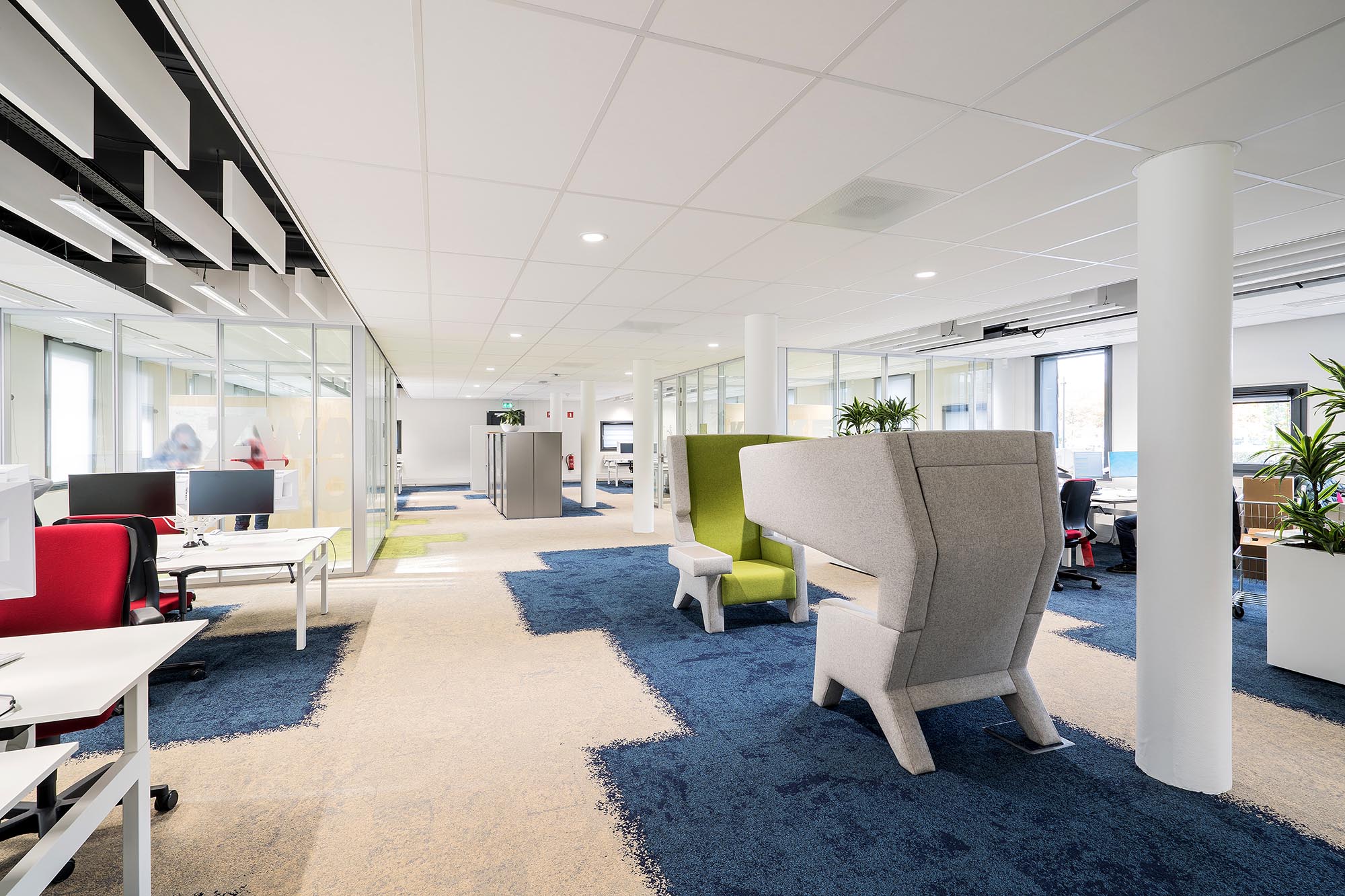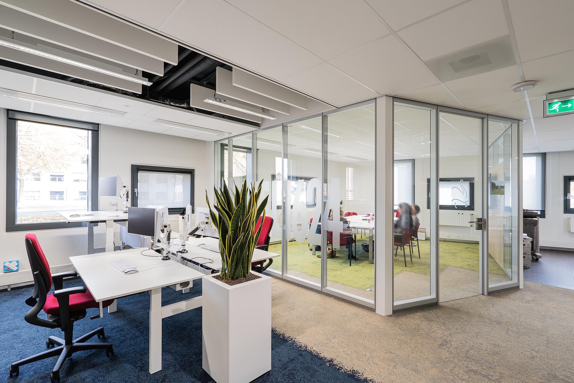 Bij de open werkplekken zijn baffles geplaatst om samen met het akoestische systeemplafond een optimale akoestiek te realiseren voor de medewerkers.