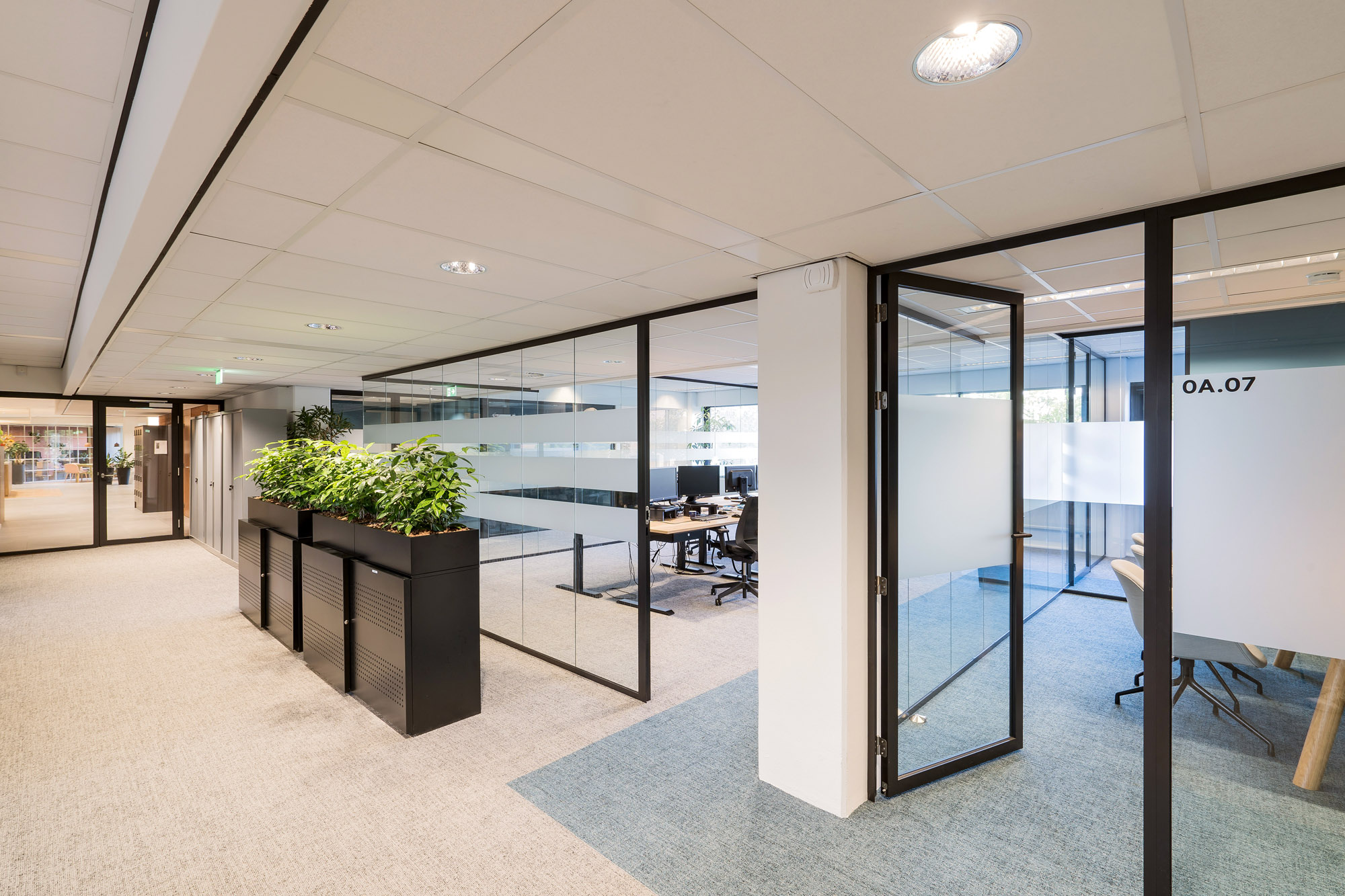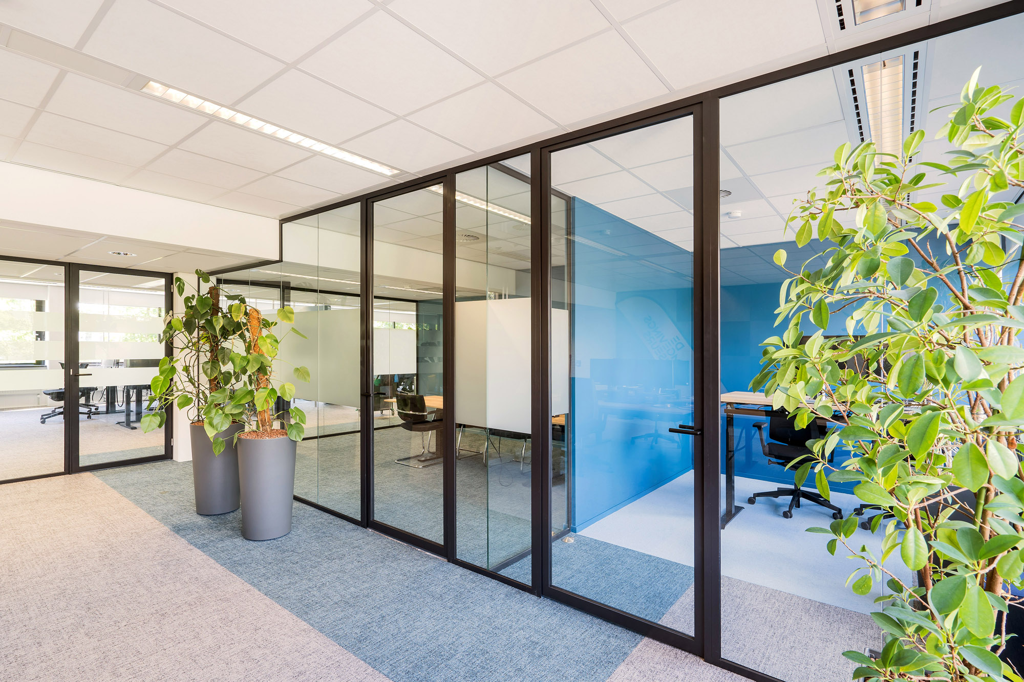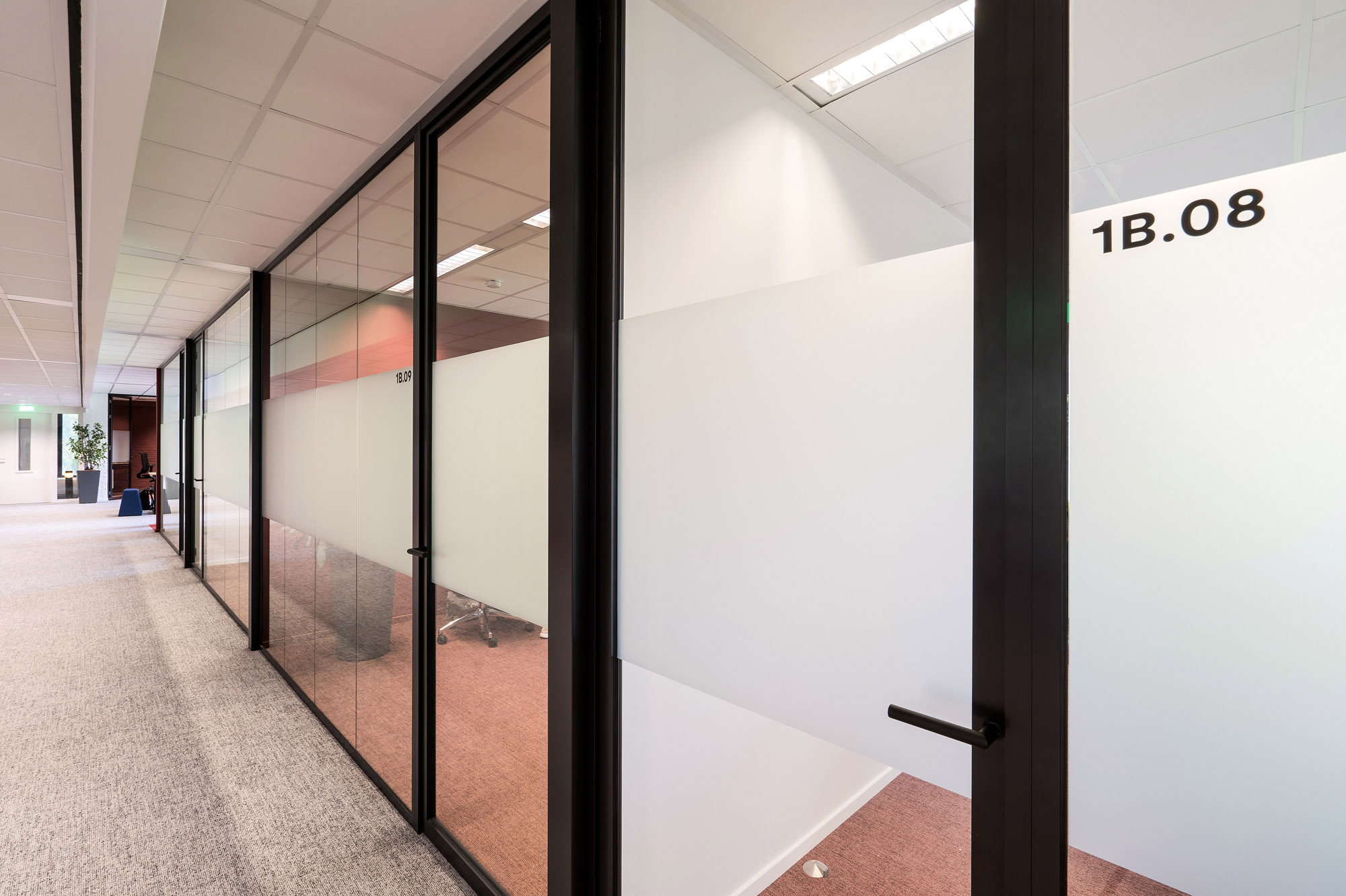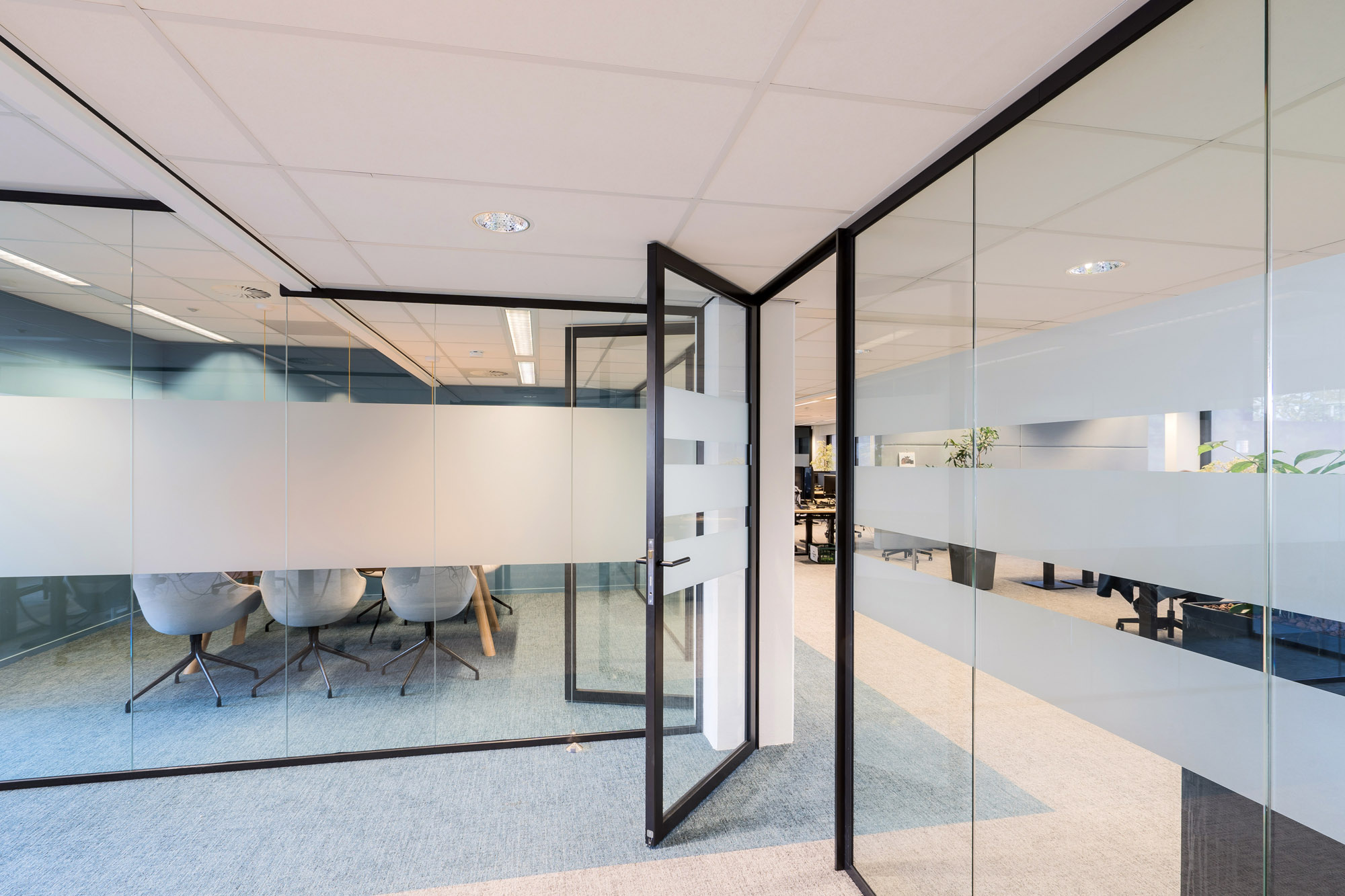 Om de lijn van transparantie in het kantoor voort te zetten, zijn alle deuren bij Countus Zwolle uitgevoerd als Slanke Kaderdeur. Met een ranke profilering van maar 60mm breed zorgen de minimalistische belijningen voor optimaal glasoppervlak. Deze robuuste kaderdeur is volledig losmaakbaar. Zo kan deze slanke kaderdeur eenvoudig refurbished worden en de gebruikte materialen een tweede leven te geven.