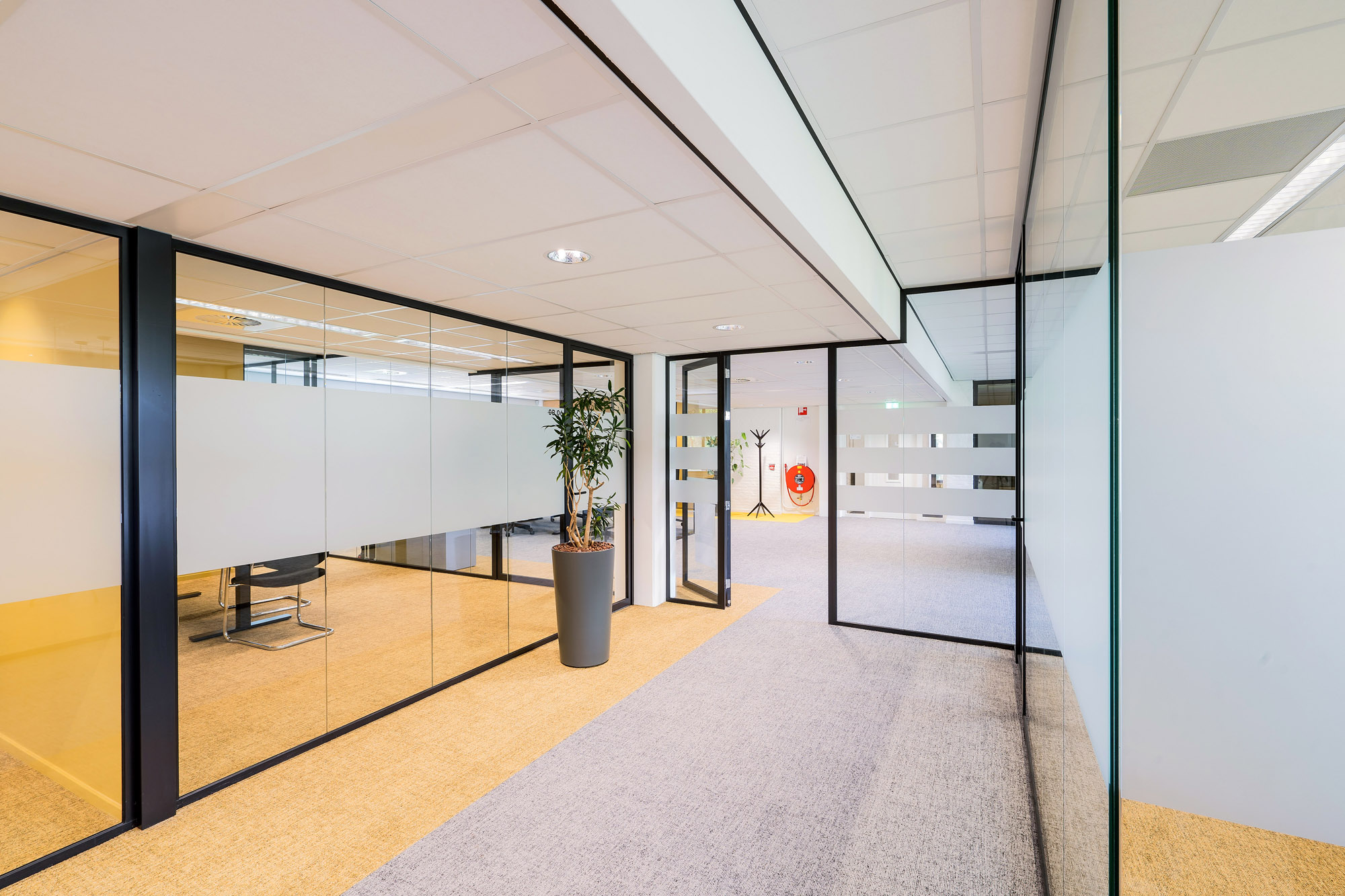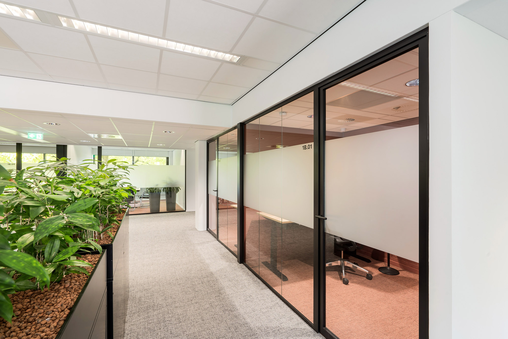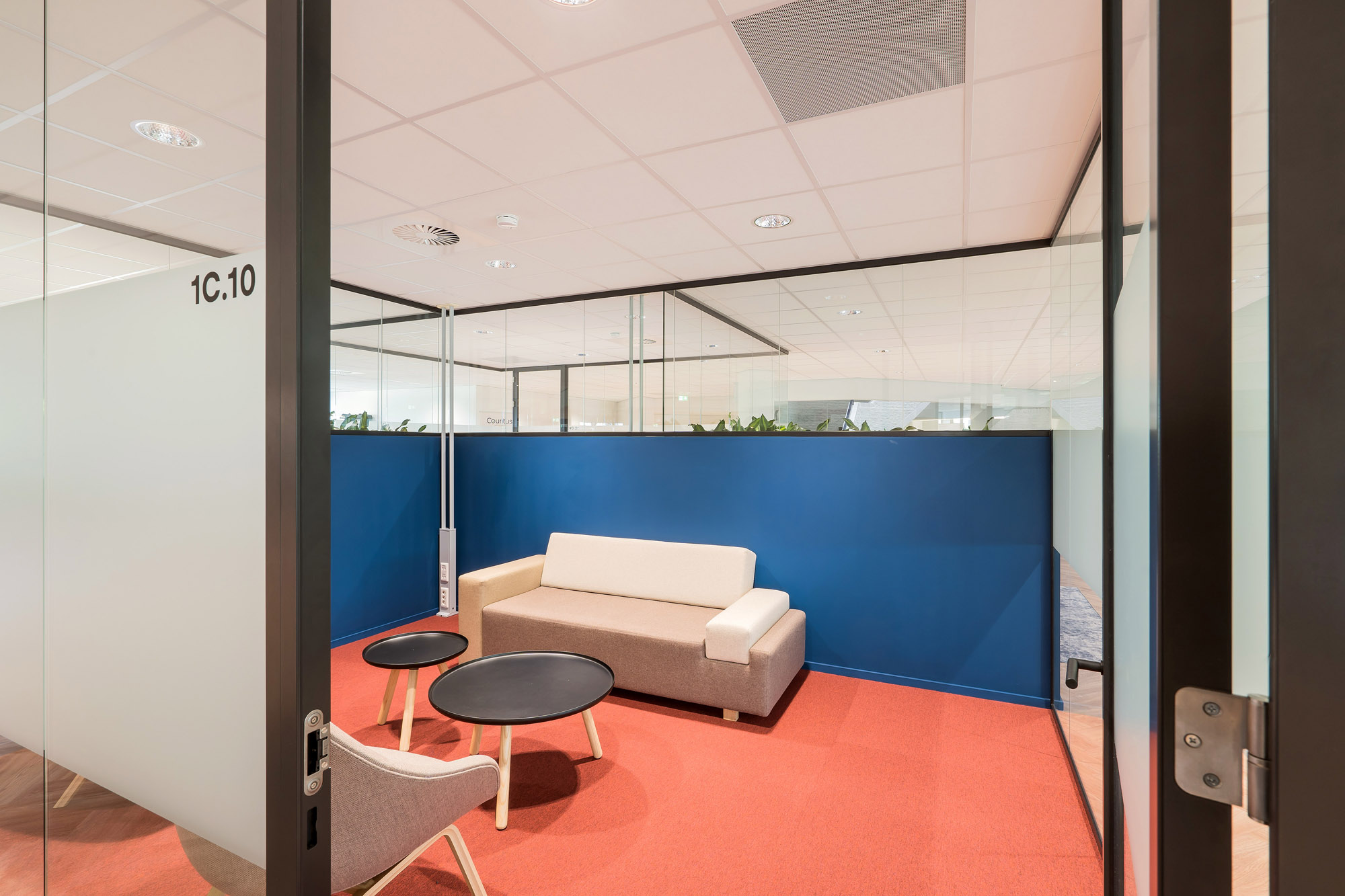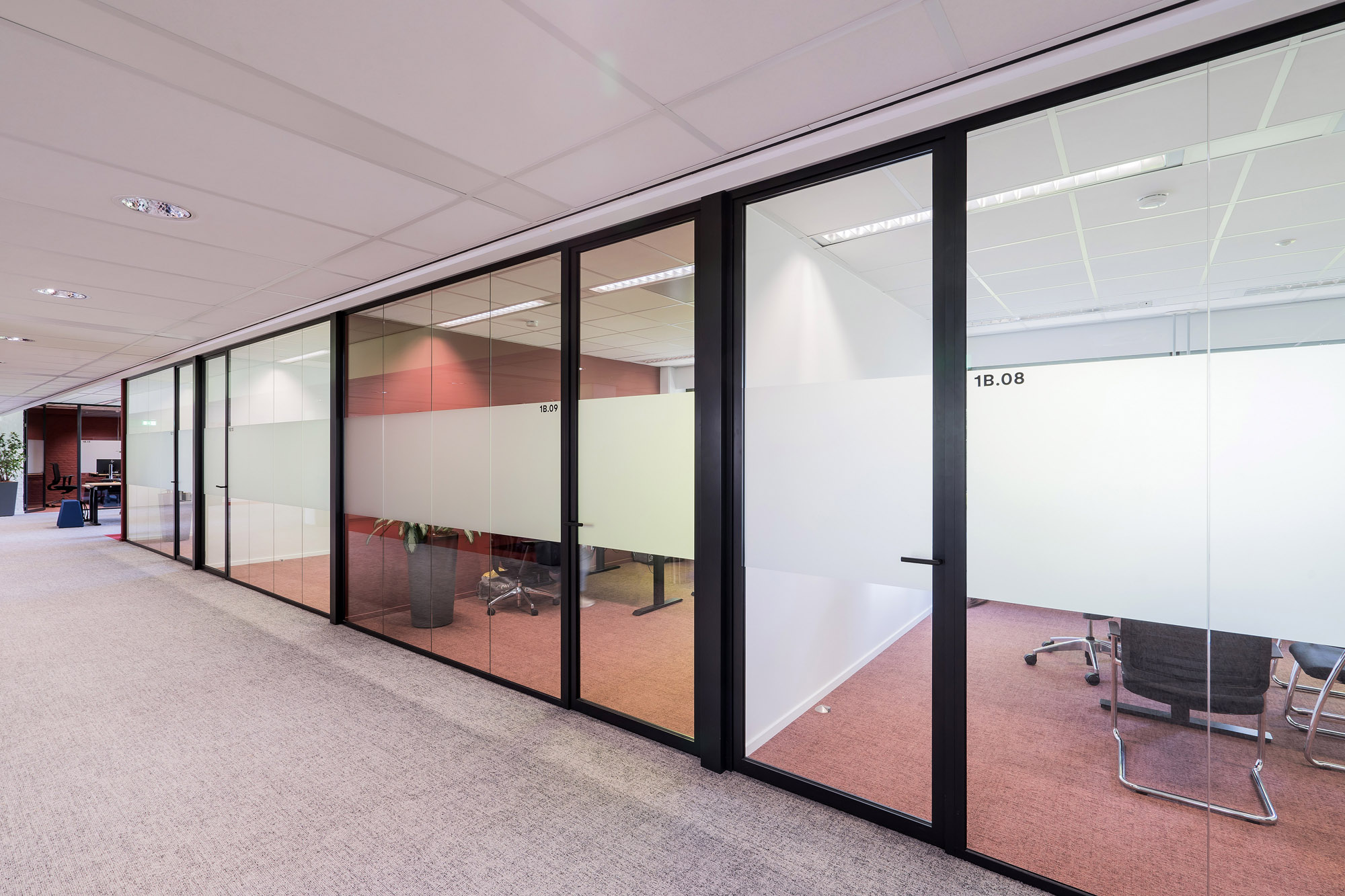 Om de lijn van transparantie in het kantoor voort te zetten, zijn alle deuren bij Countus Zwolle uitgevoerd als Slanke Kaderdeur. Met een ranke profilering van maar 60mm breed zorgen de minimalistische belijningen voor optimaal glasoppervlak. Deze robuuste kaderdeur is volledig losmaakbaar. Zo kan deze slanke kaderdeur eenvoudig refurbished worden en de gebruikte materialen een tweede leven te geven.