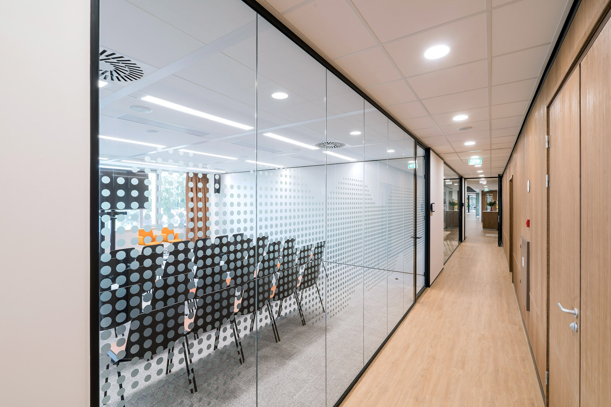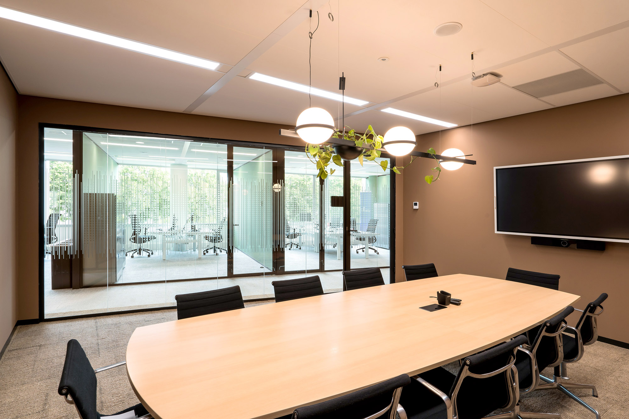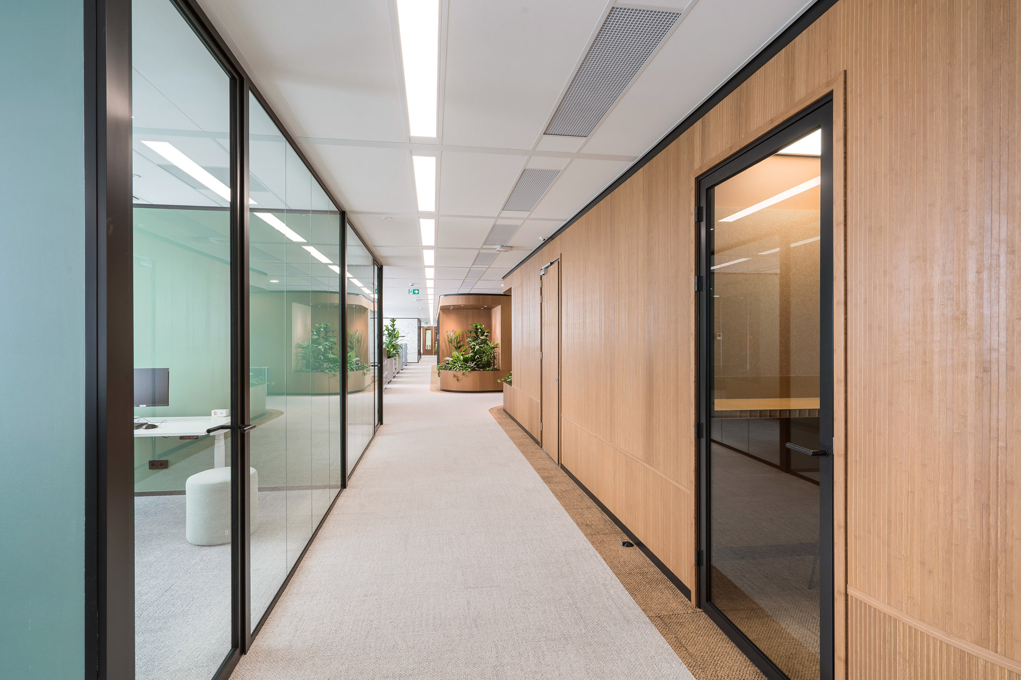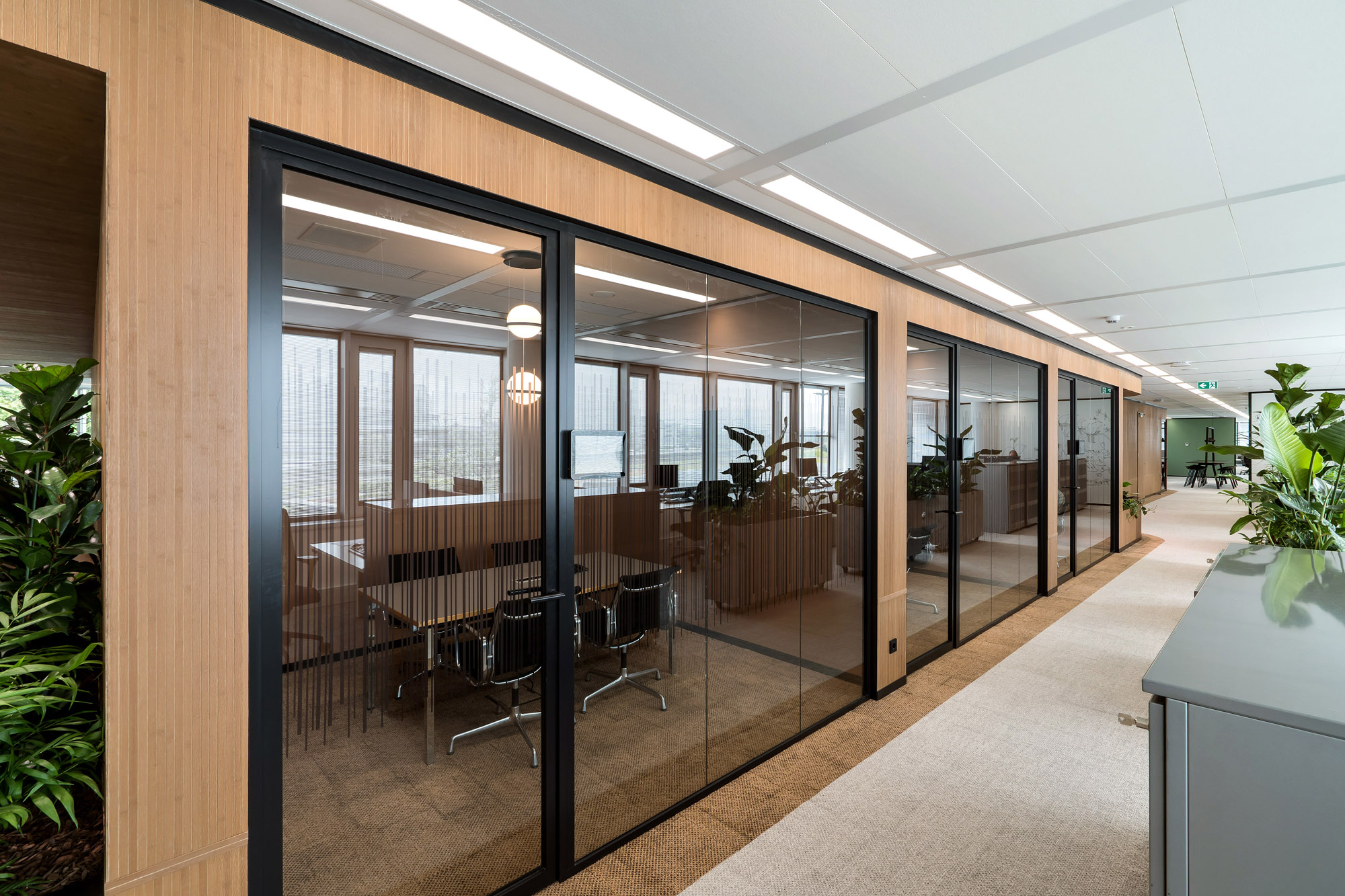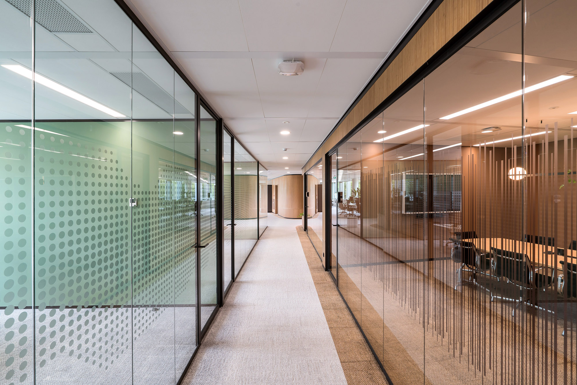 De glaswanden zorgen voor een lichte en transparante kantooromgeving. Slanke kaderdeuren geven de deuren een robuust uiterlijk met behoudt van transparantie. In de grote vergaderzalen zijn mobiele paneelwanden toegepast. Met een mobiele paneelwand kan de wand snel en makkelijk geopend en gesloten worden om de beschikbare meters optimaal te kunnen gebruiken.
