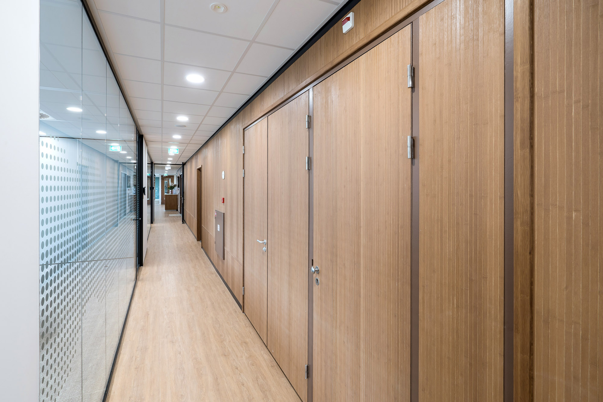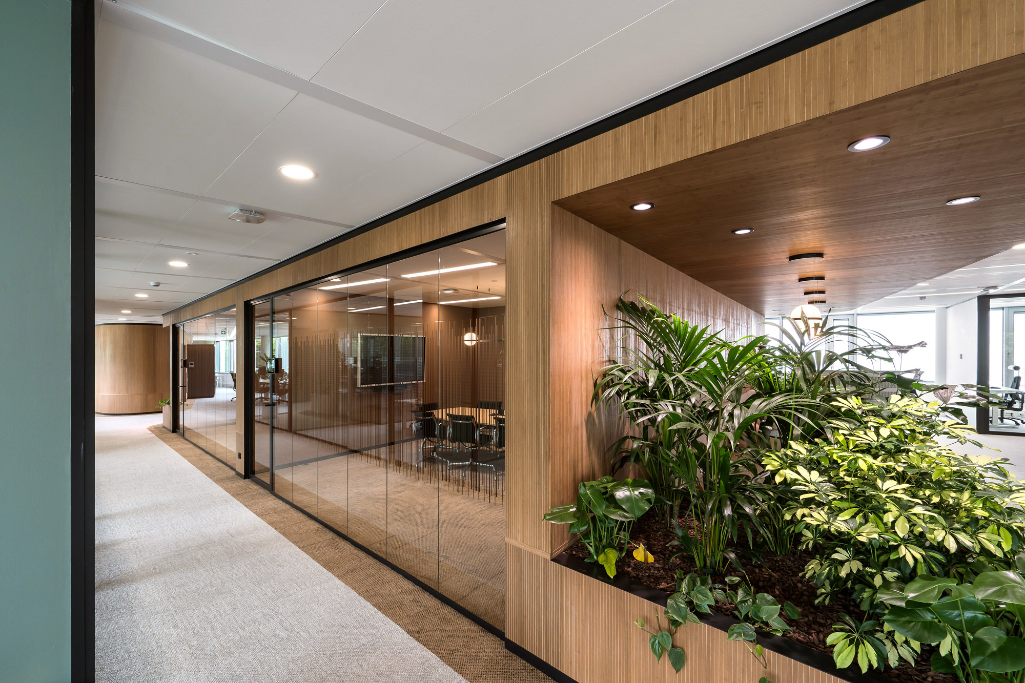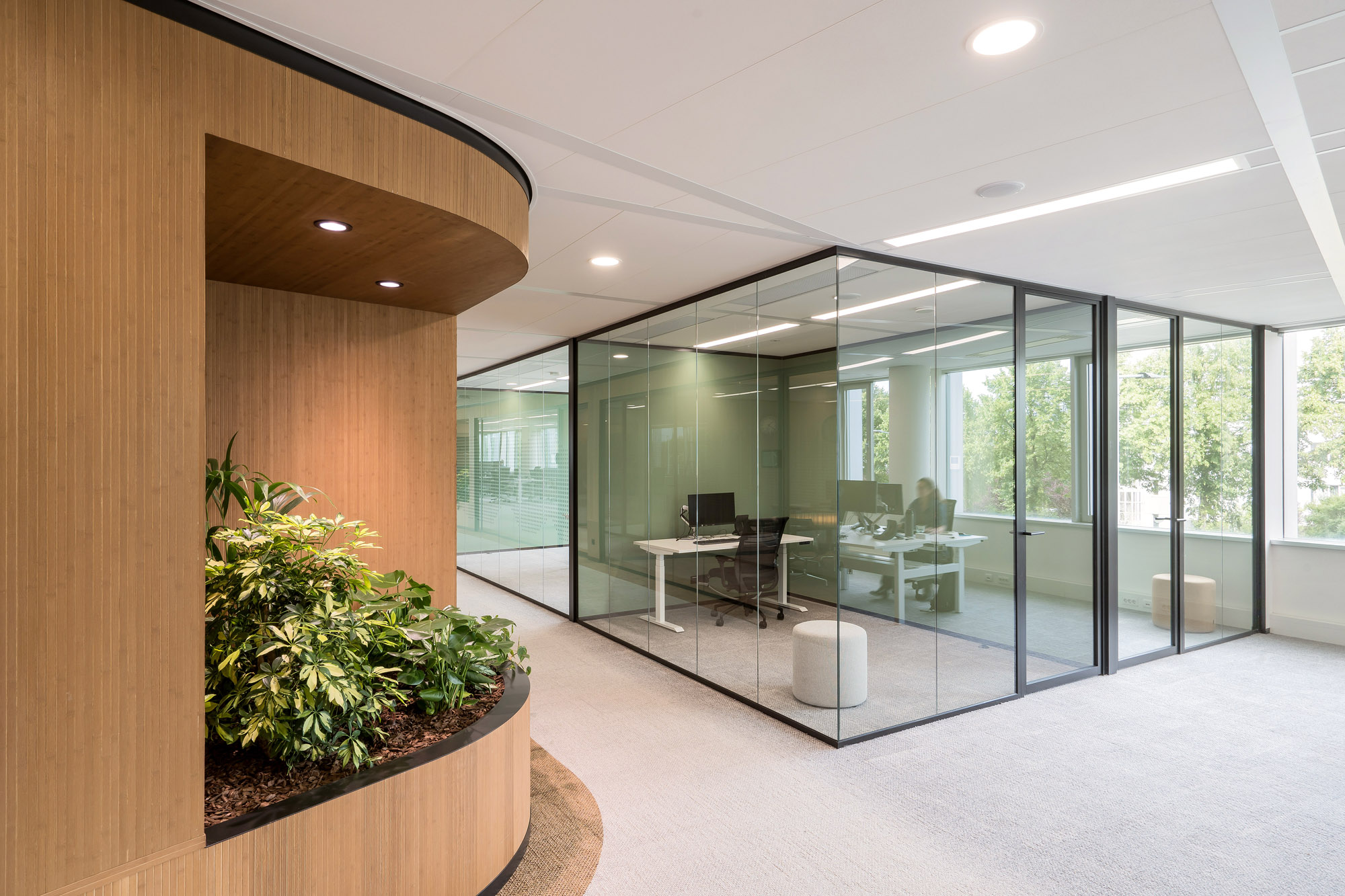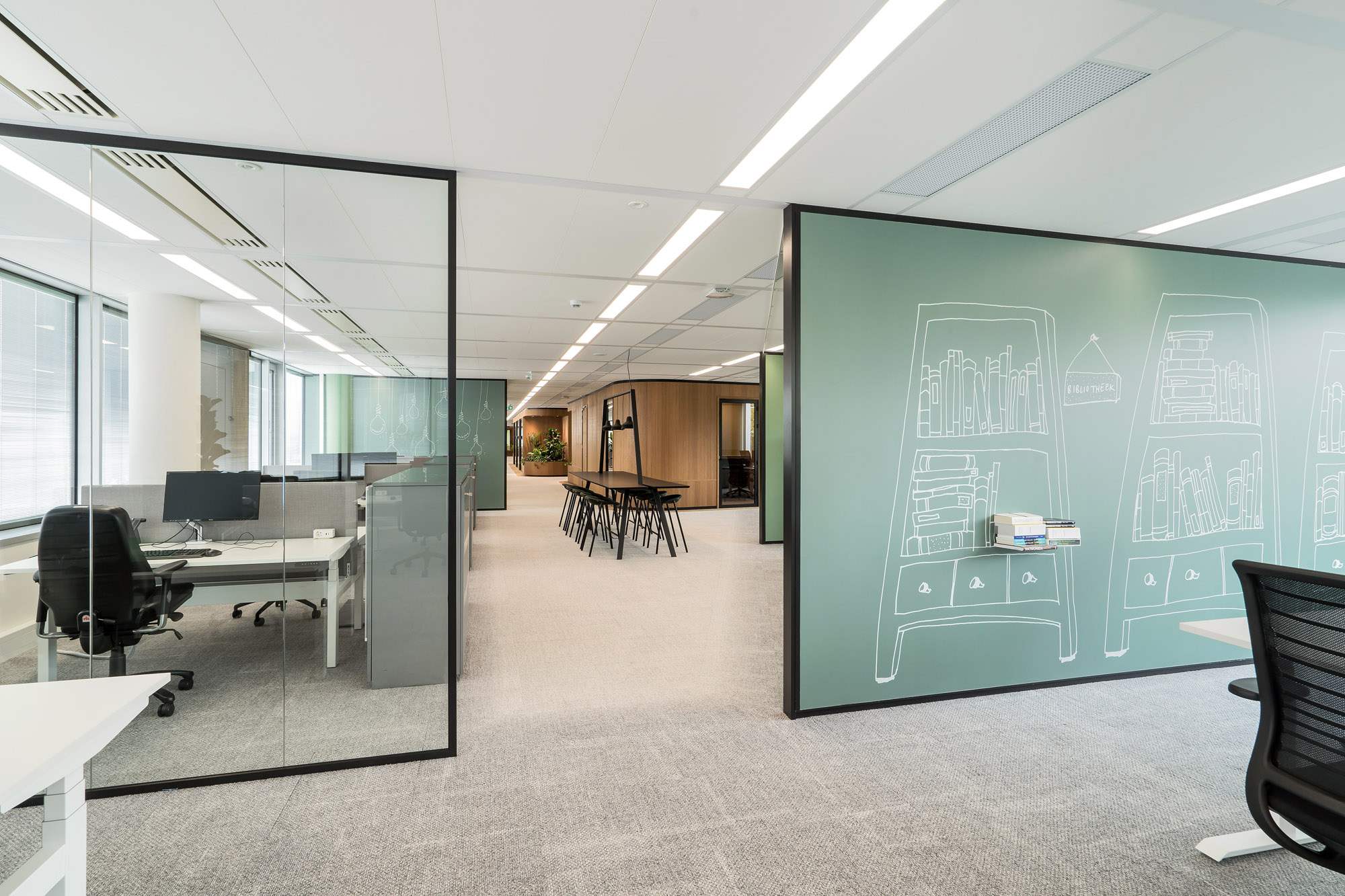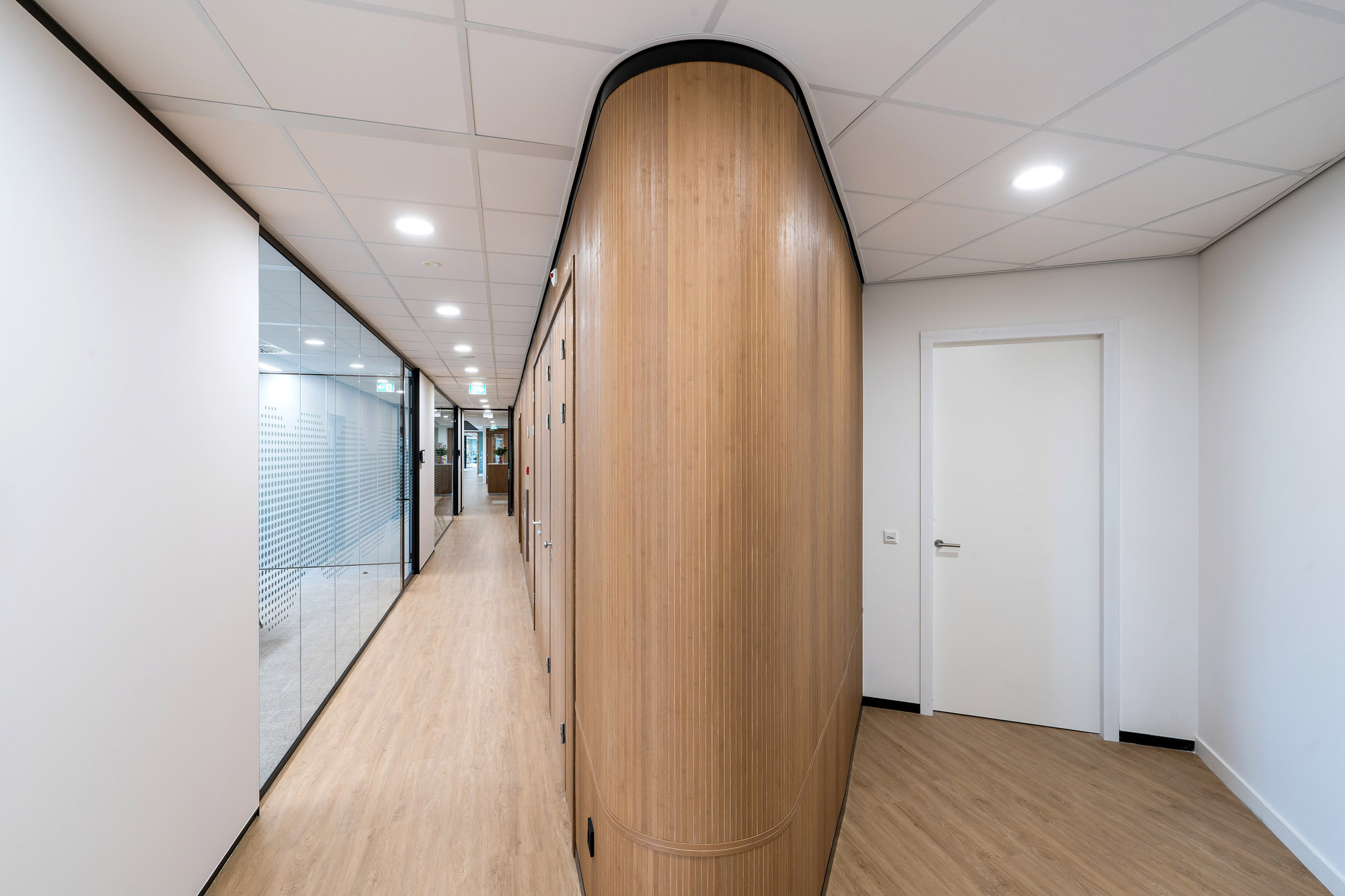 De glaswanden zorgen voor een lichte en transparante kantooromgeving. Slanke kaderdeuren geven de deuren een robuust uiterlijk met behoudt van transparantie. In de grote vergaderzalen zijn mobiele paneelwanden toegepast. Met een mobiele paneelwand kan de wand snel en makkelijk geopend en gesloten worden om de beschikbare meters optimaal te kunnen gebruiken.