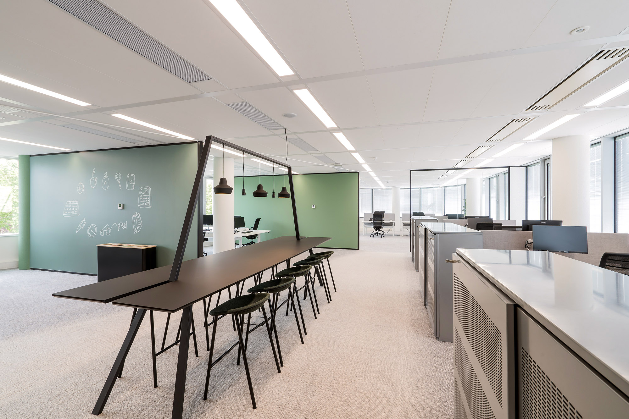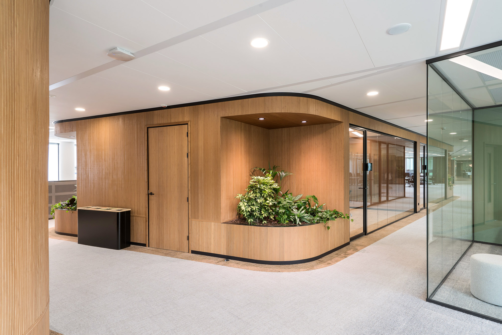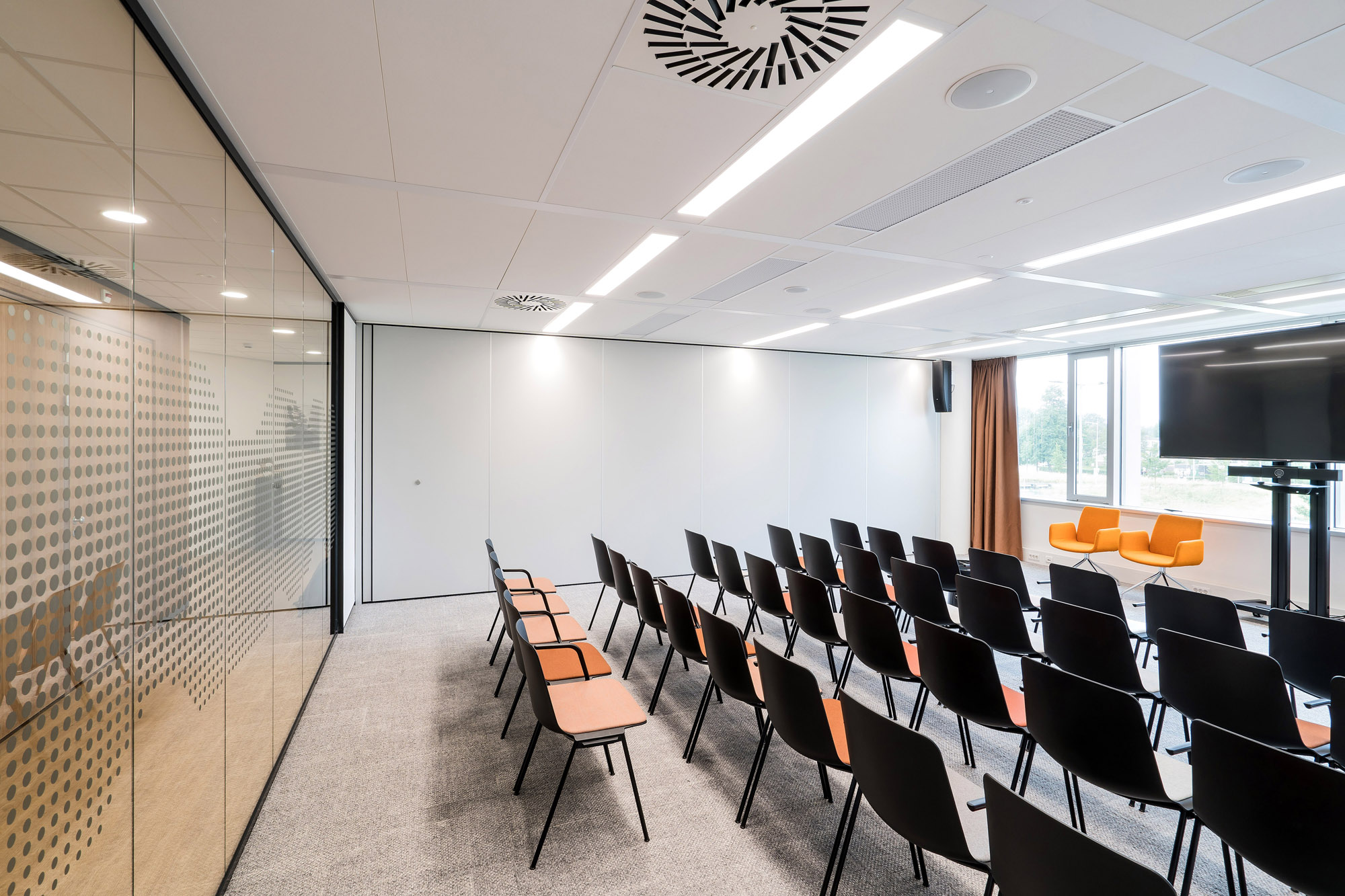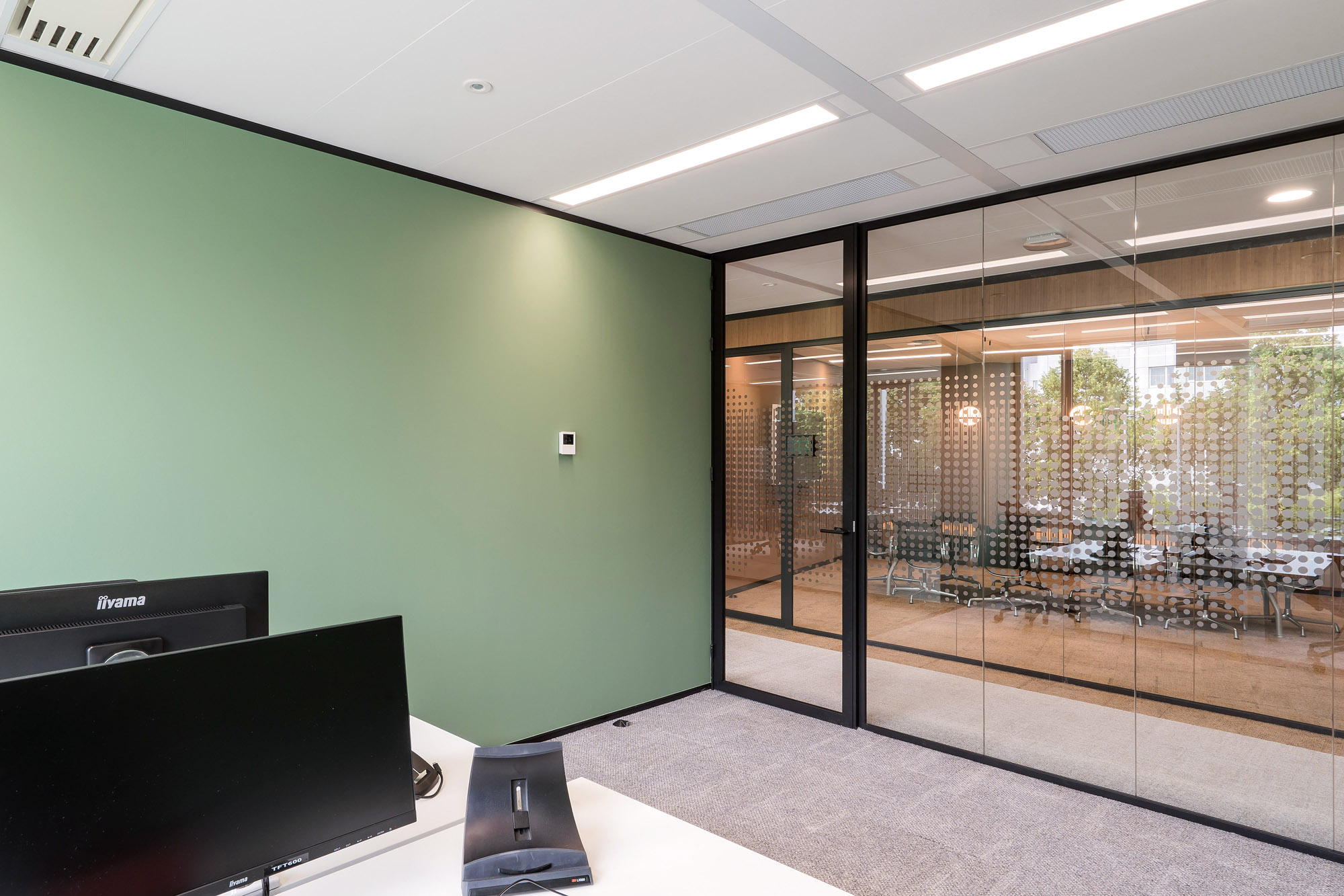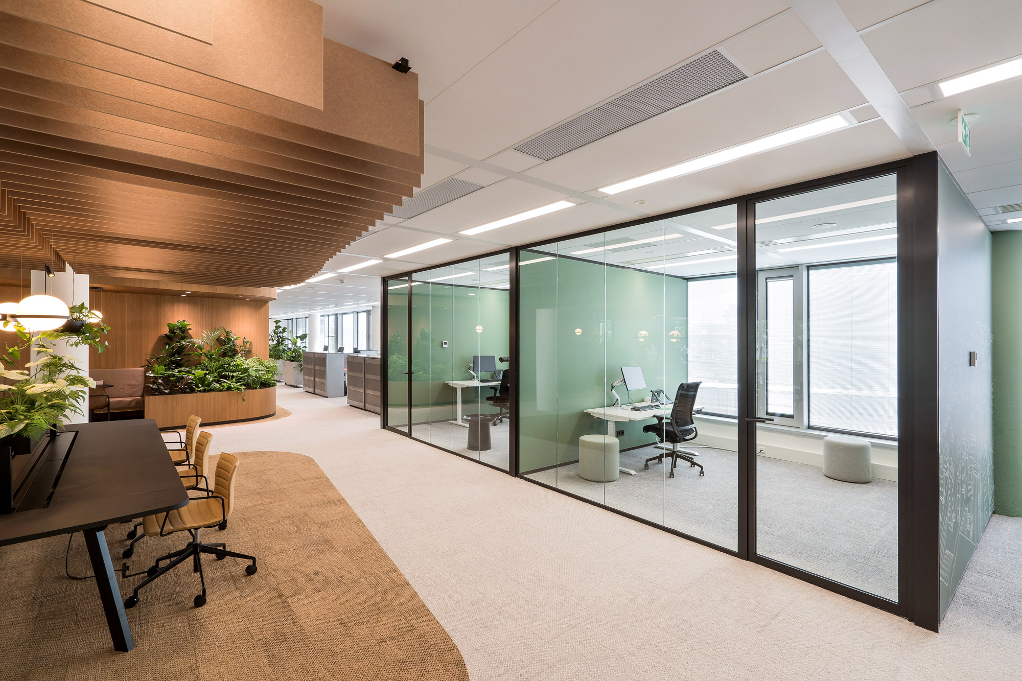 De glaswanden zorgen voor een lichte en transparante kantooromgeving. Slanke kaderdeuren geven de deuren een robuust uiterlijk met behoudt van transparantie. In de grote vergaderzalen zijn mobiele paneelwanden toegepast. Met een mobiele paneelwand kan de wand snel en makkelijk geopend en gesloten worden om de beschikbare meters optimaal te kunnen gebruiken.