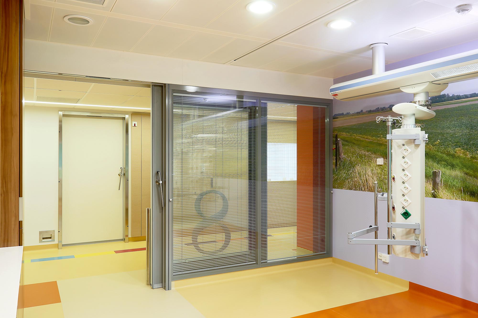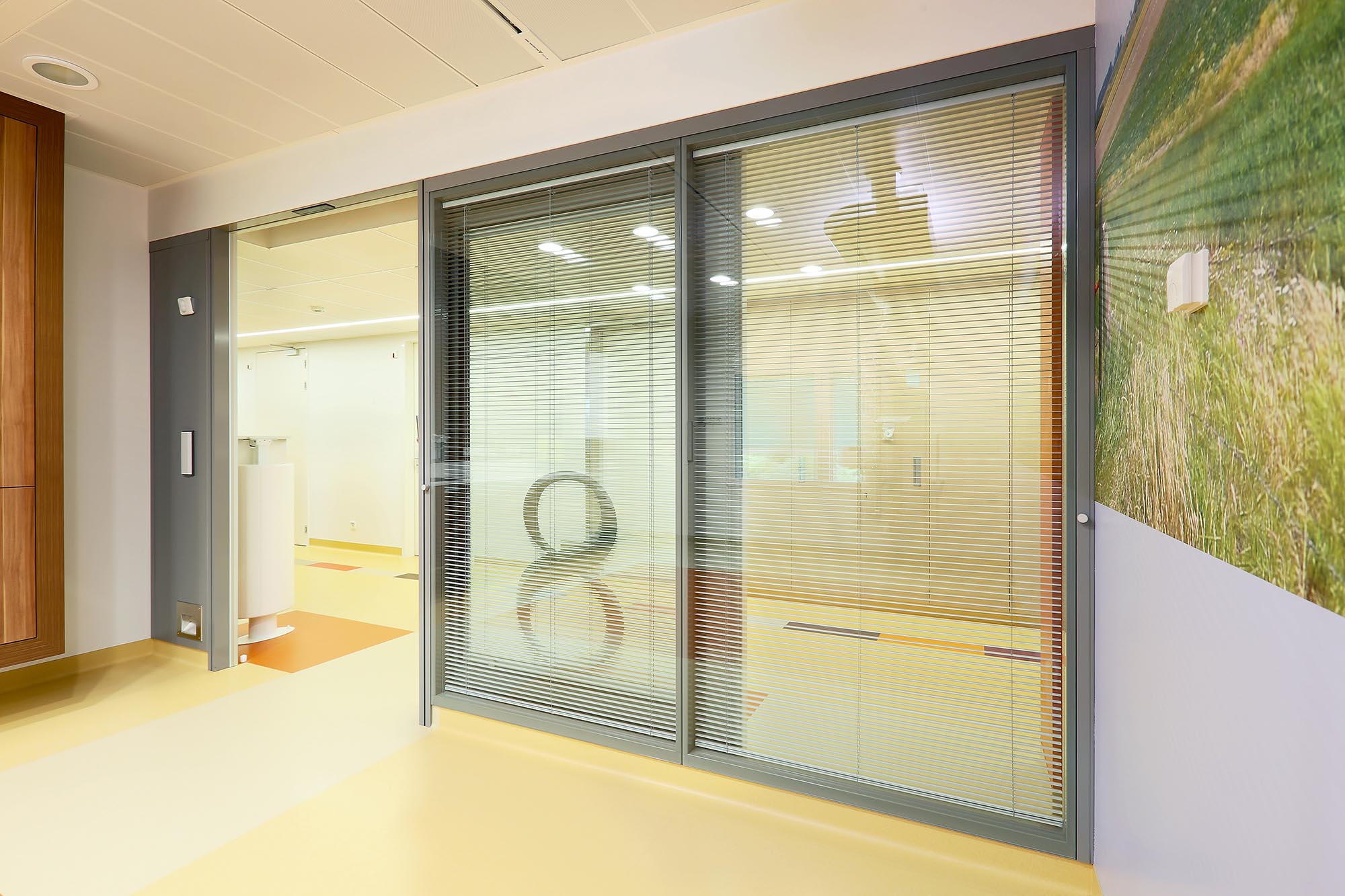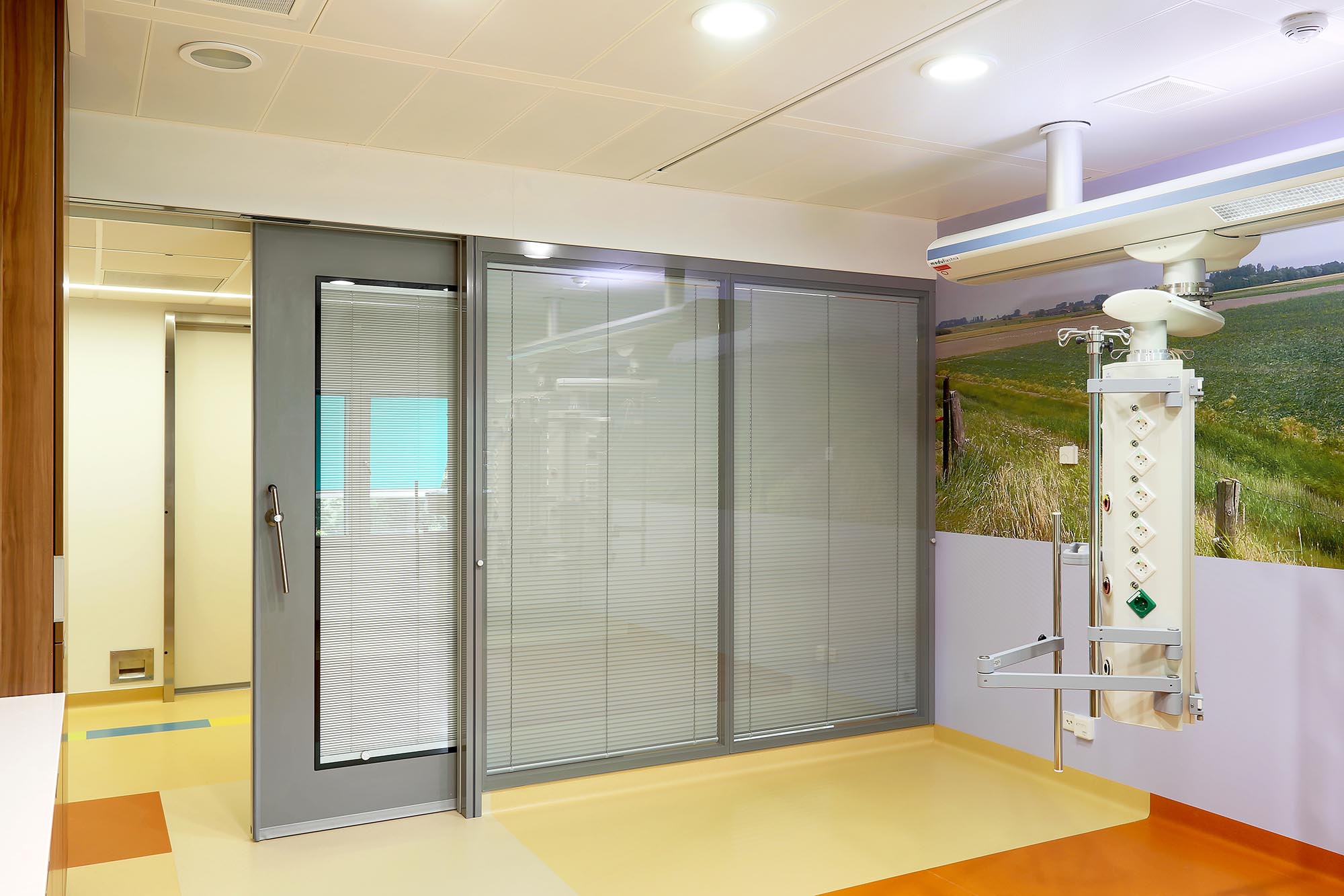 Belangrijke eigenschappen voor deze afdeling Intensive Care zijn rust, licht, ruimte en veiligheid. Door de ingebouwde lamellen is de wand zowel tranparant als gesloten te gebruiken. De Metaflex deuren blijven zoveel mogelijk dicht en zijn via een voetsensor te openen. Het zorgpersoneel kan via een controle-unit buiten de IC-kamer alles inzien, inclusief een live camerabewakingssysteem.