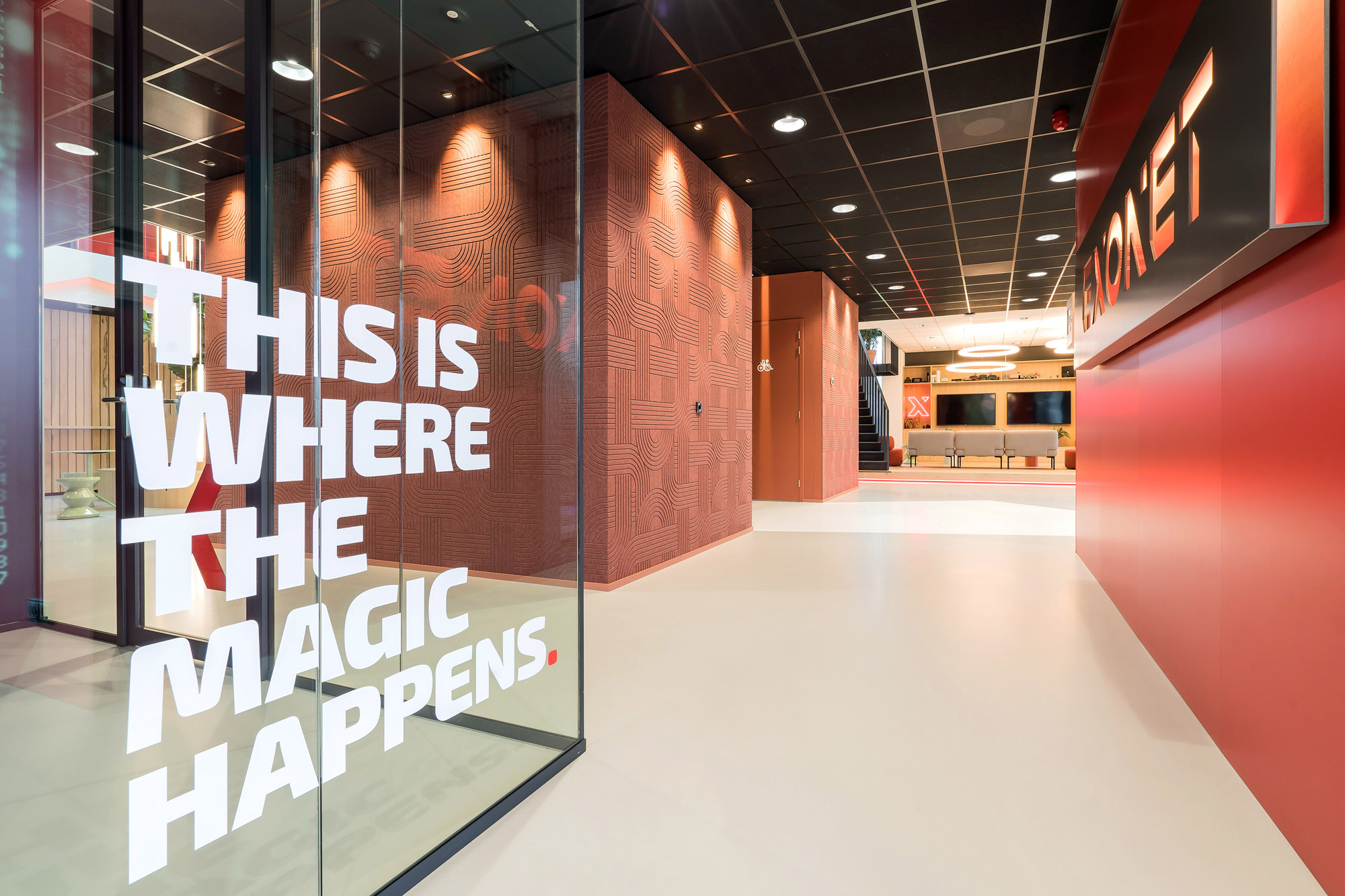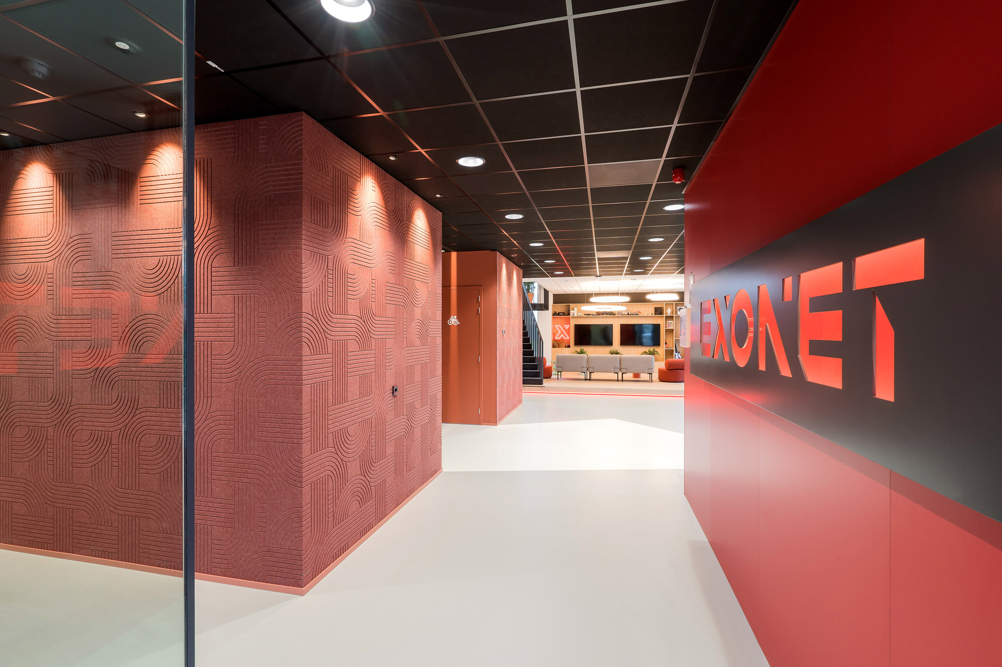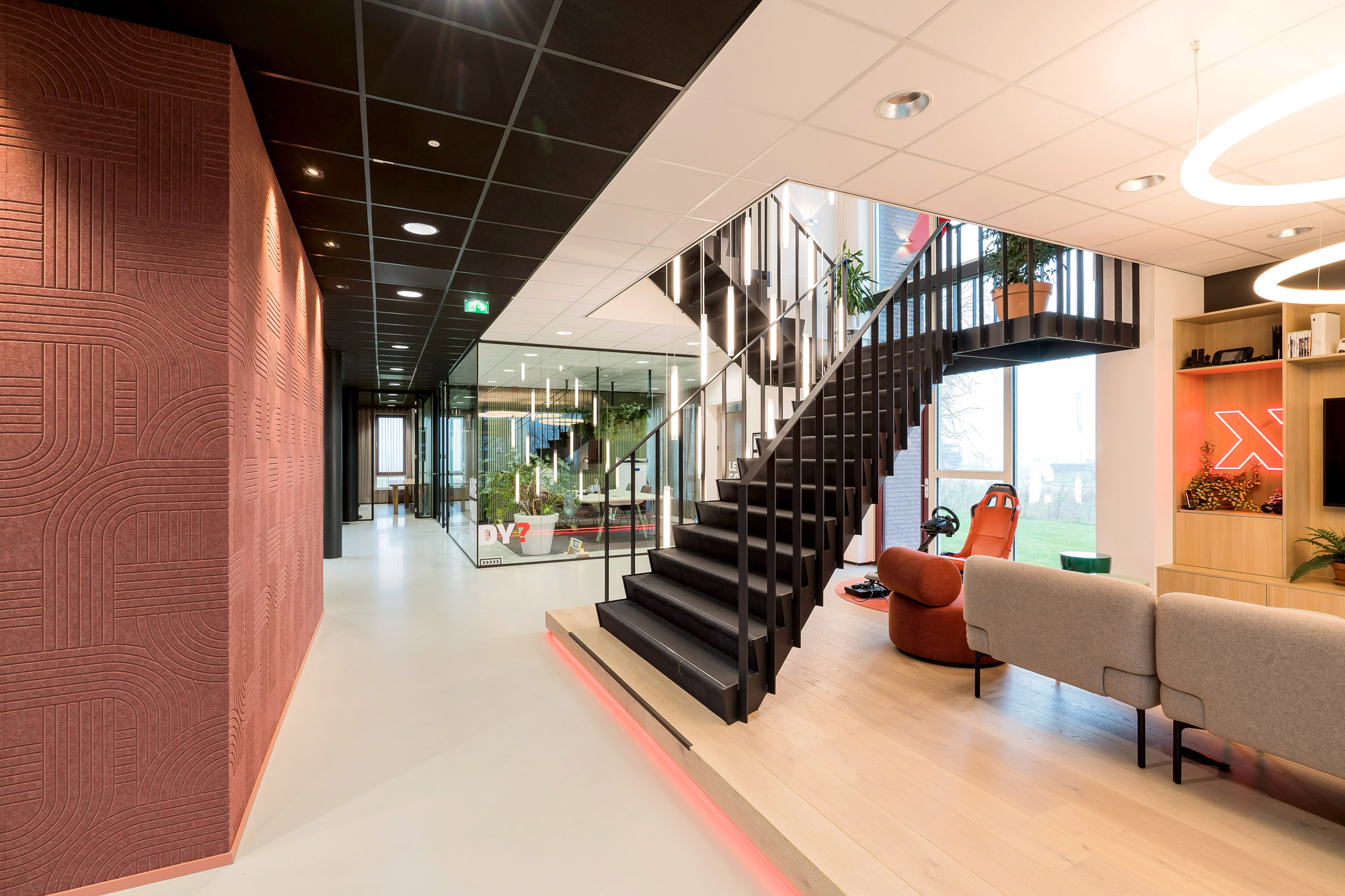 Na de voltooiing van het Exonet HQ werd de vraag neergelegd bij Studio Groen+Schild om dit moderne kantoorpand te transformeren naar een plek die de identiteit weerspiegelt en waar zij, als team, nog beter kunnen ontmoeten, samenwerken en gamen.
