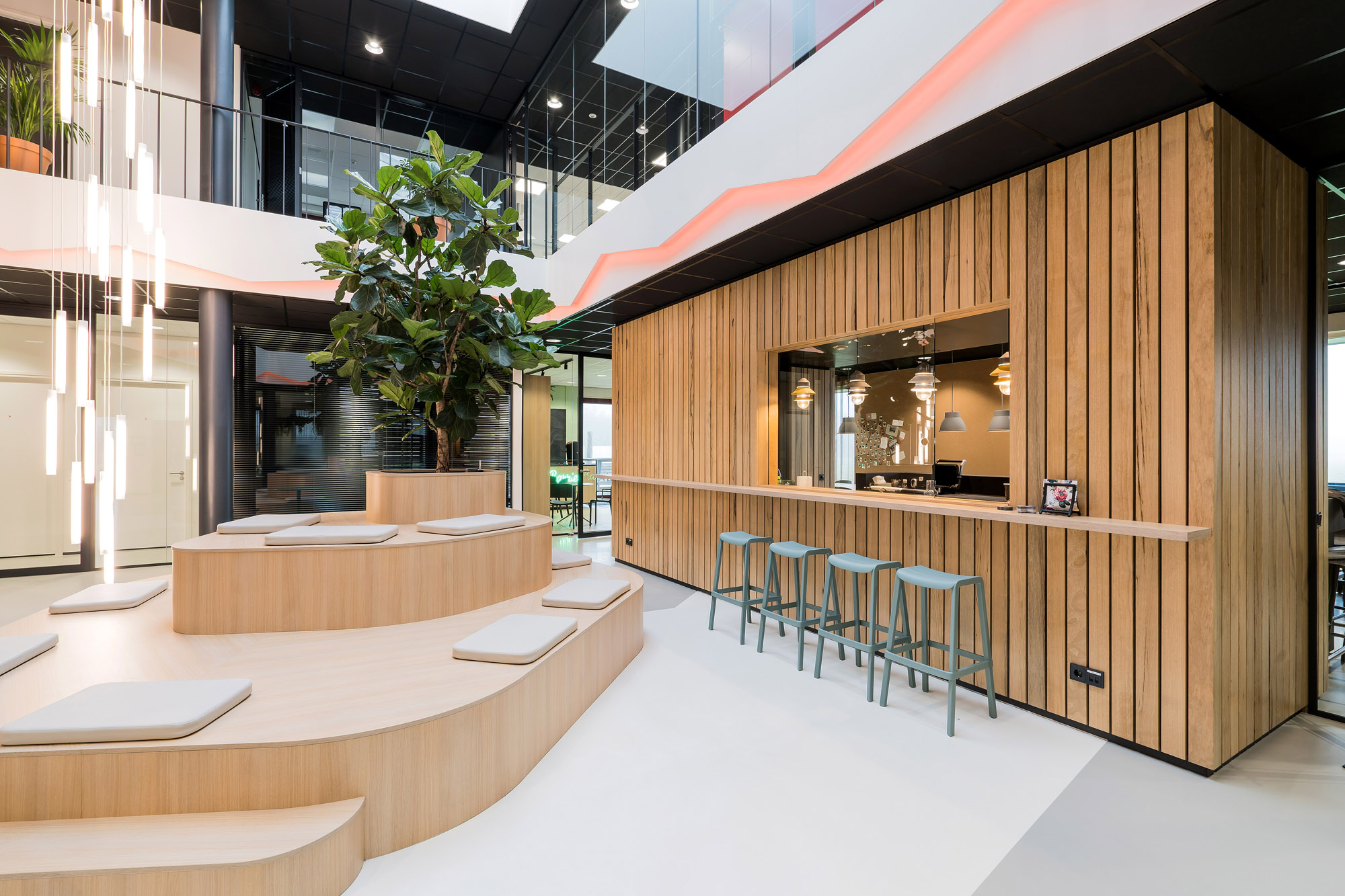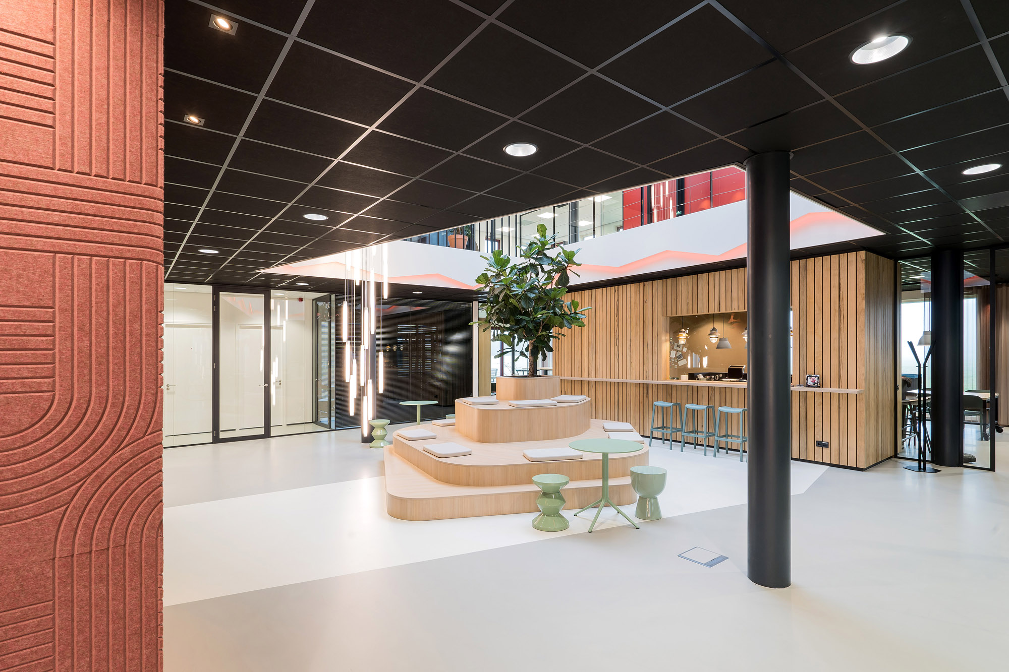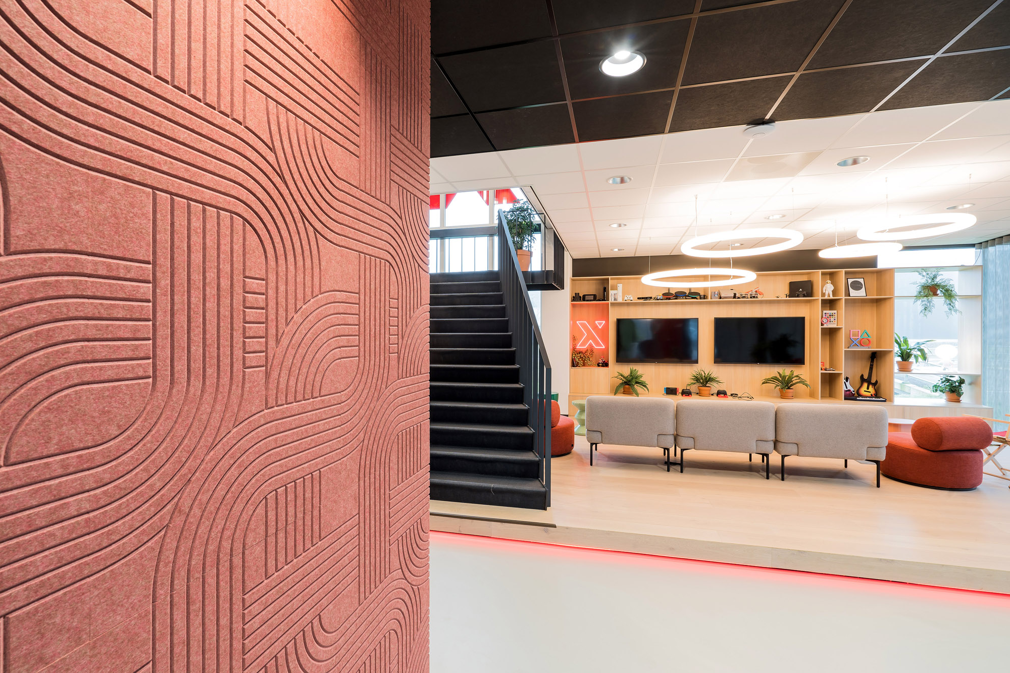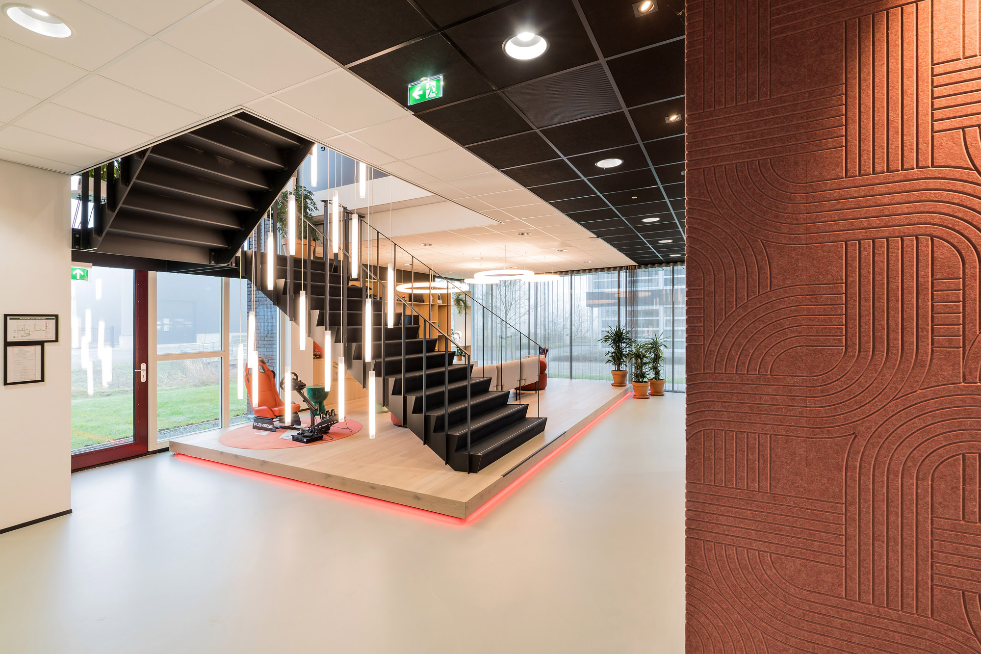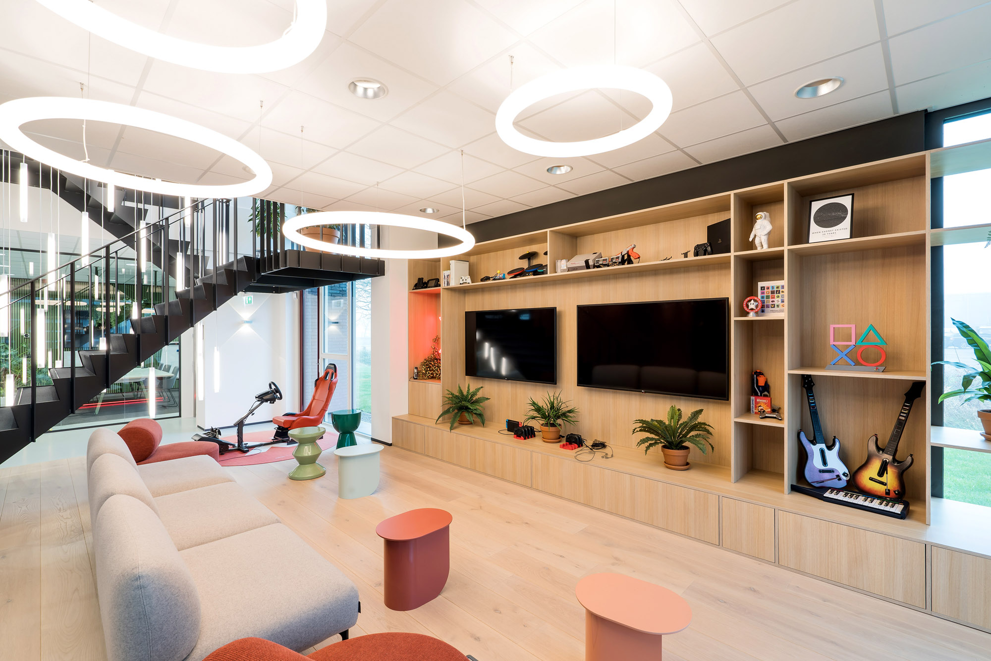 Het centrale punt is het parkmeubel waar de medewerkers relaxed kunnen zitten om bij te praten of te gamen. De high score wordt nog verder op scherp gezet bij de maatwerk kastenwand op het gamepodium. De akoestische wandbekleding draagt bij aan het akoestisch comfort tijdens de werkzaamheden en tijdens het ontspannen op deze sfeervolle werkplek in Zevenaar.