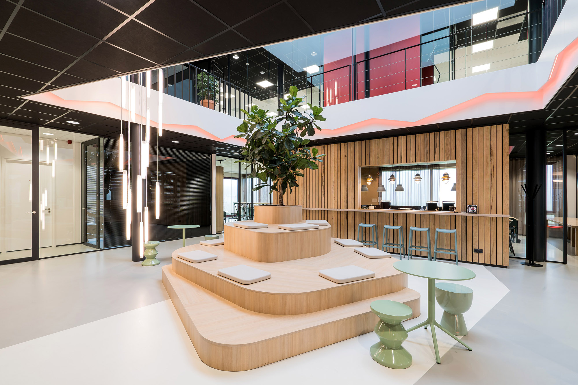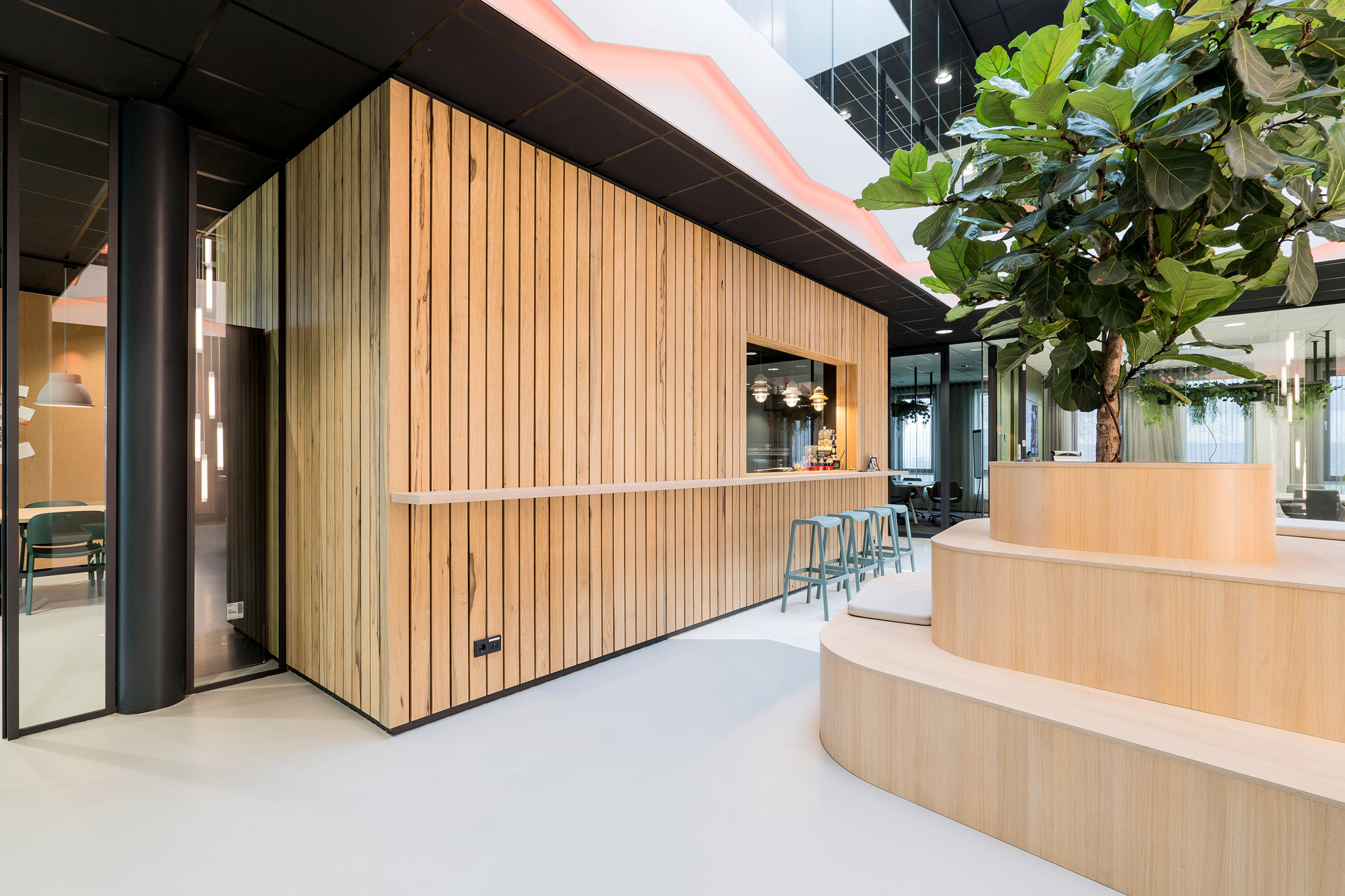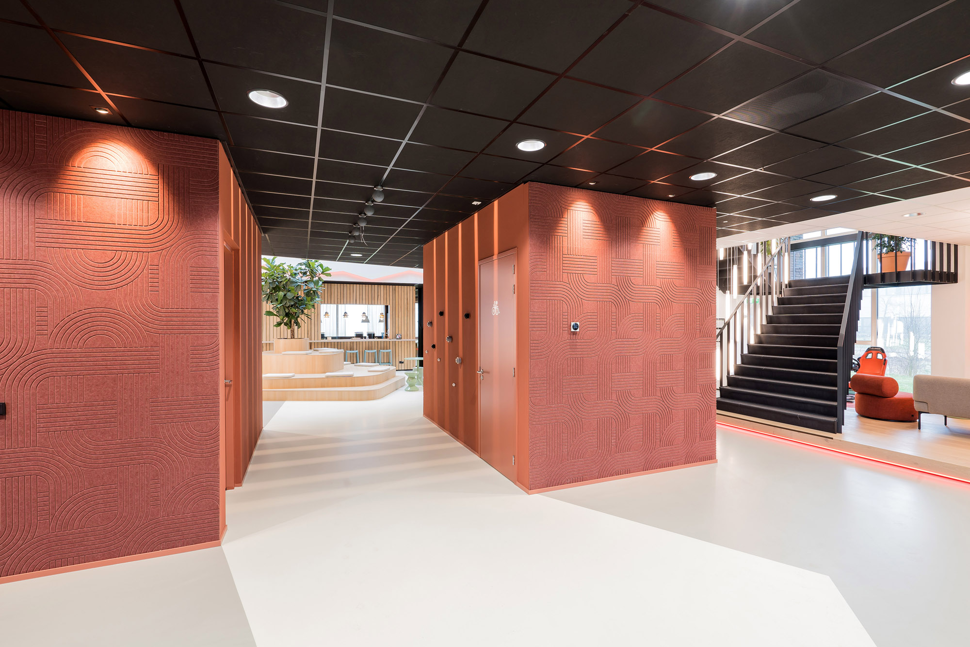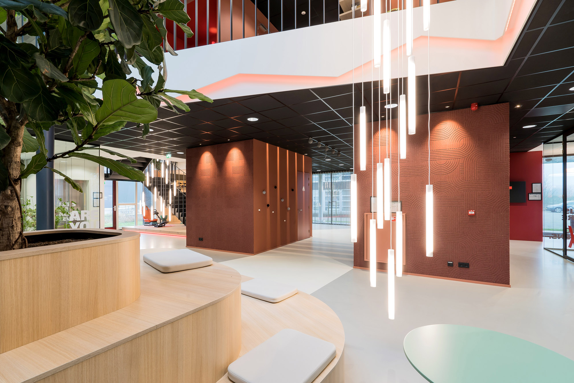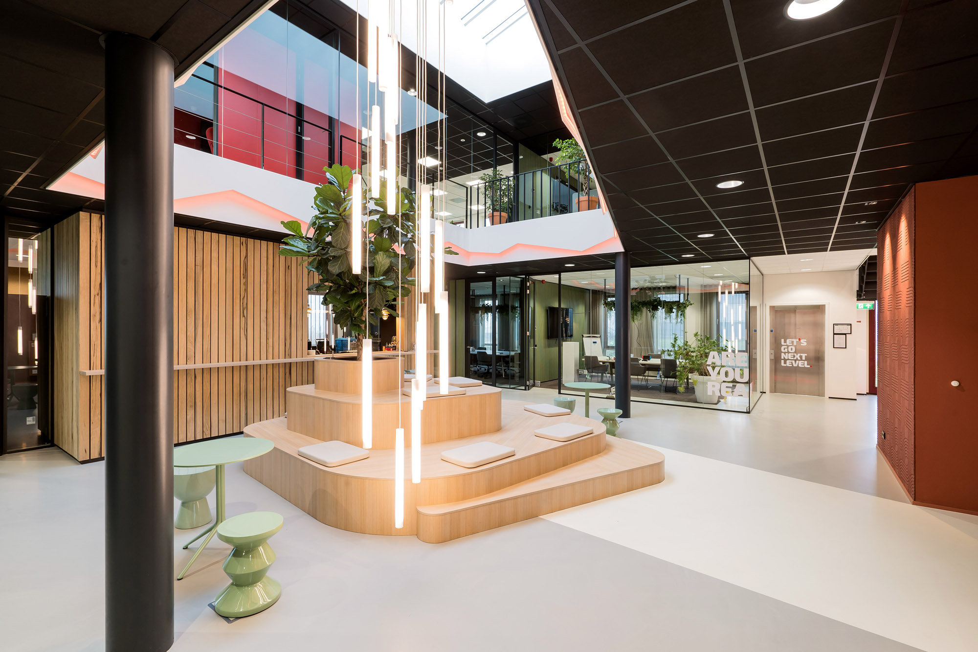 Het centrale punt is het parkmeubel waar de medewerkers relaxed kunnen zitten om bij te praten of te gamen. De high score wordt nog verder op scherp gezet bij de maatwerk kastenwand op het gamepodium. De akoestische wandbekleding draagt bij aan het akoestisch comfort tijdens de werkzaamheden en tijdens het ontspannen op deze sfeervolle werkplek in Zevenaar.