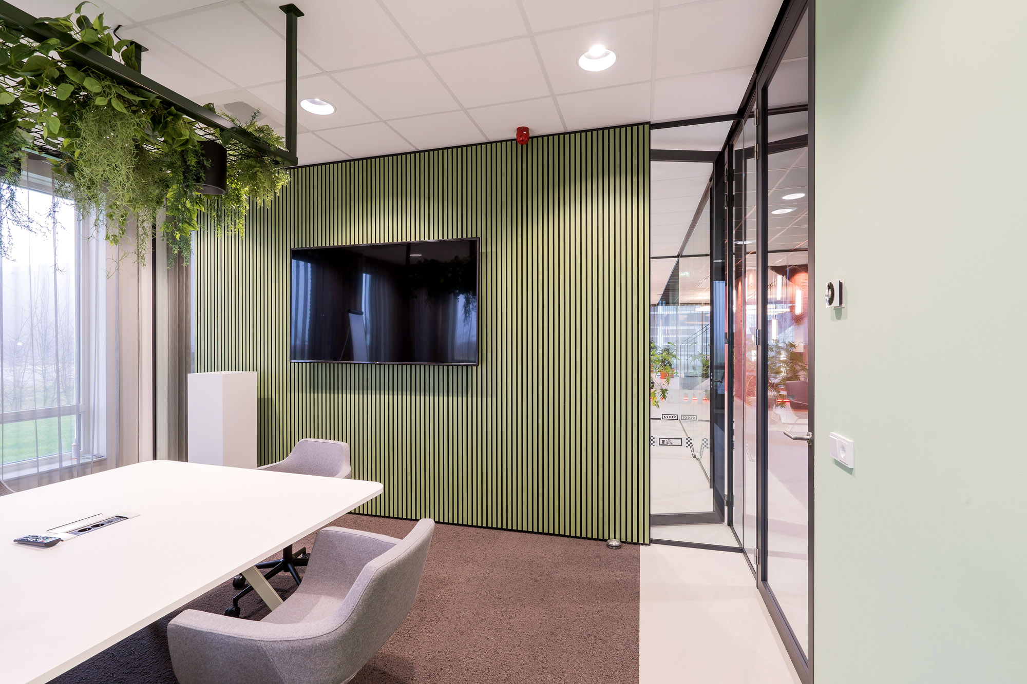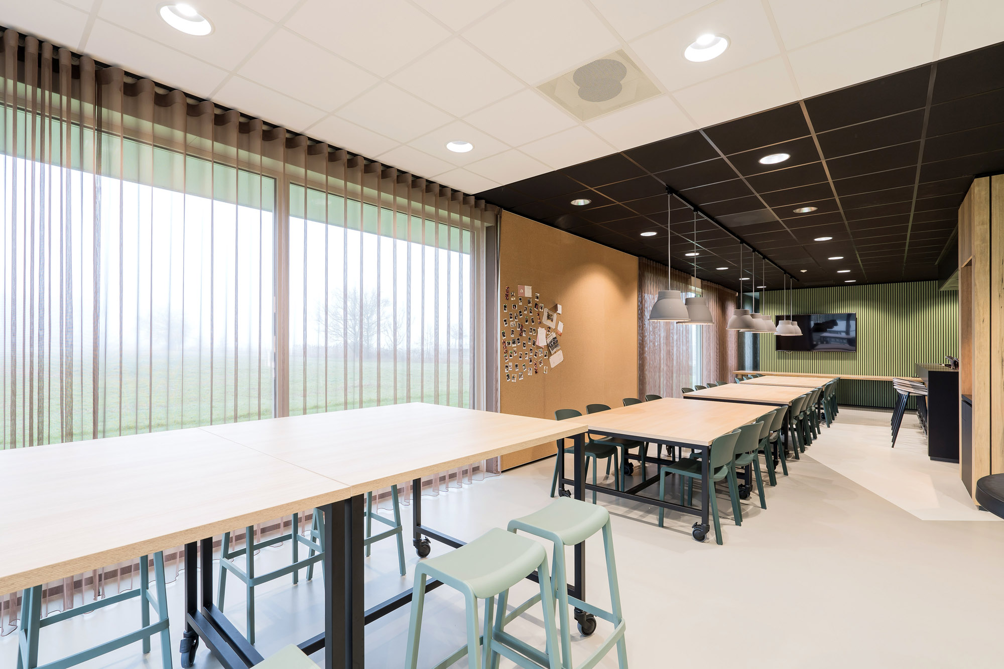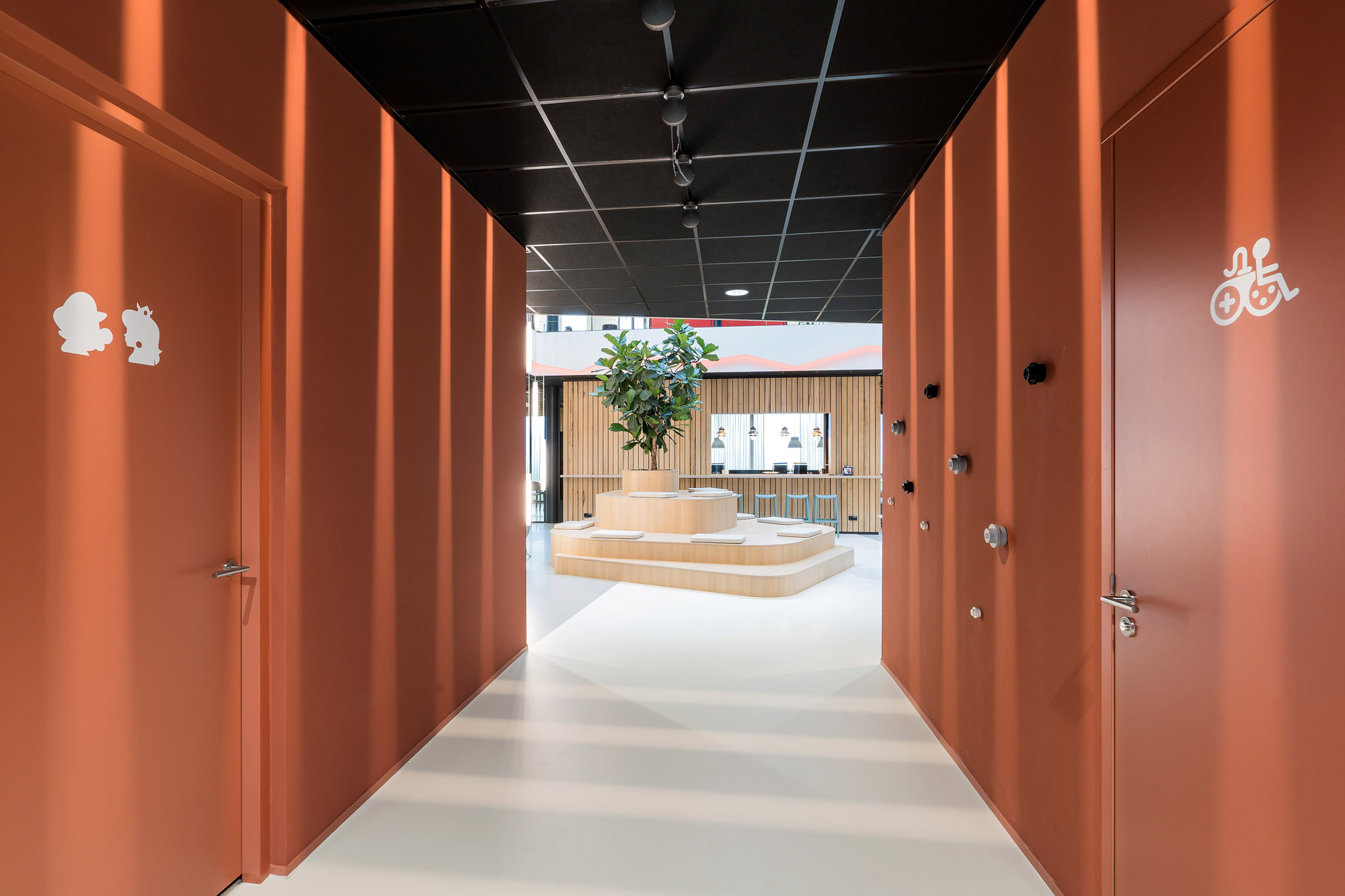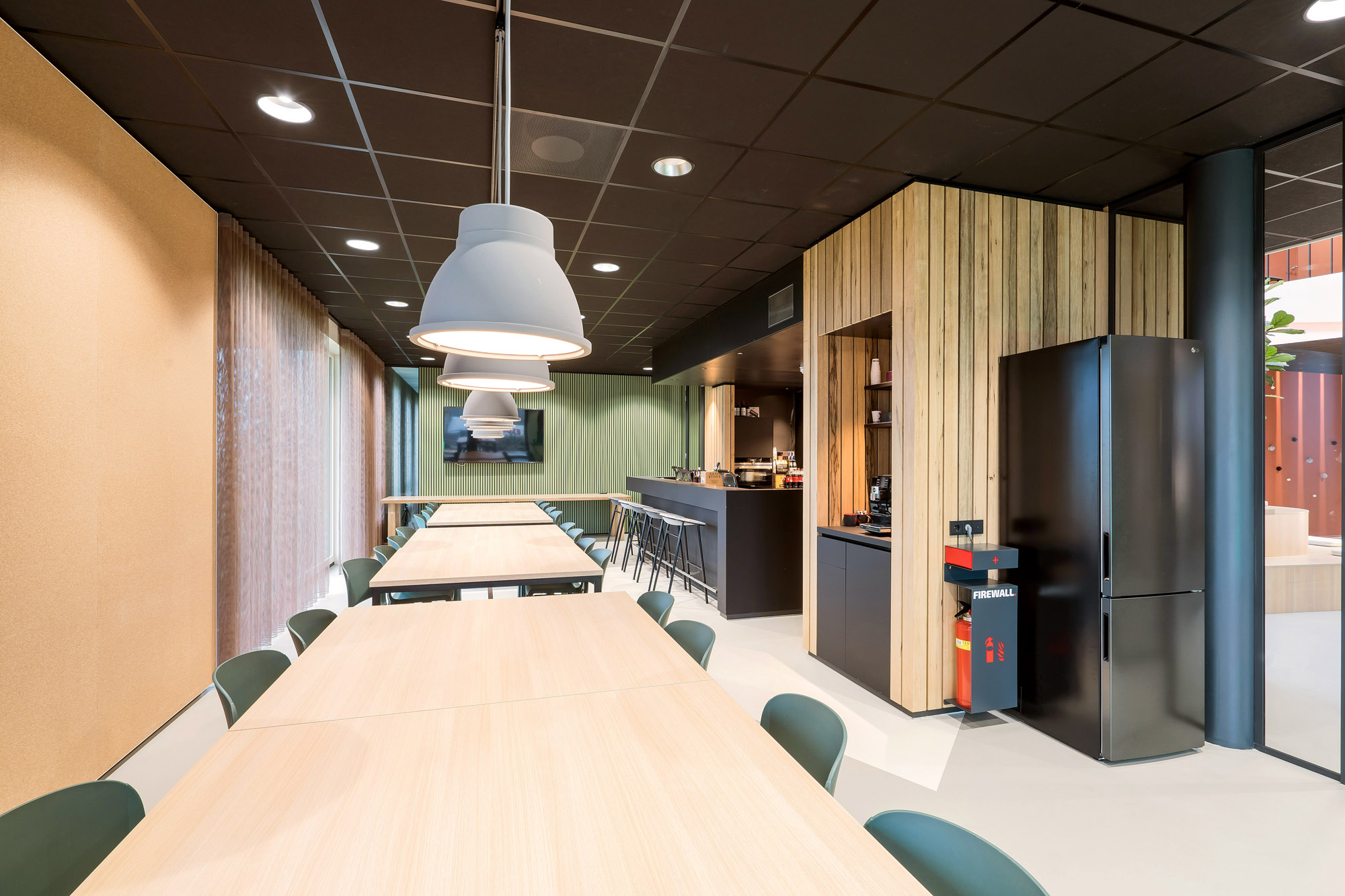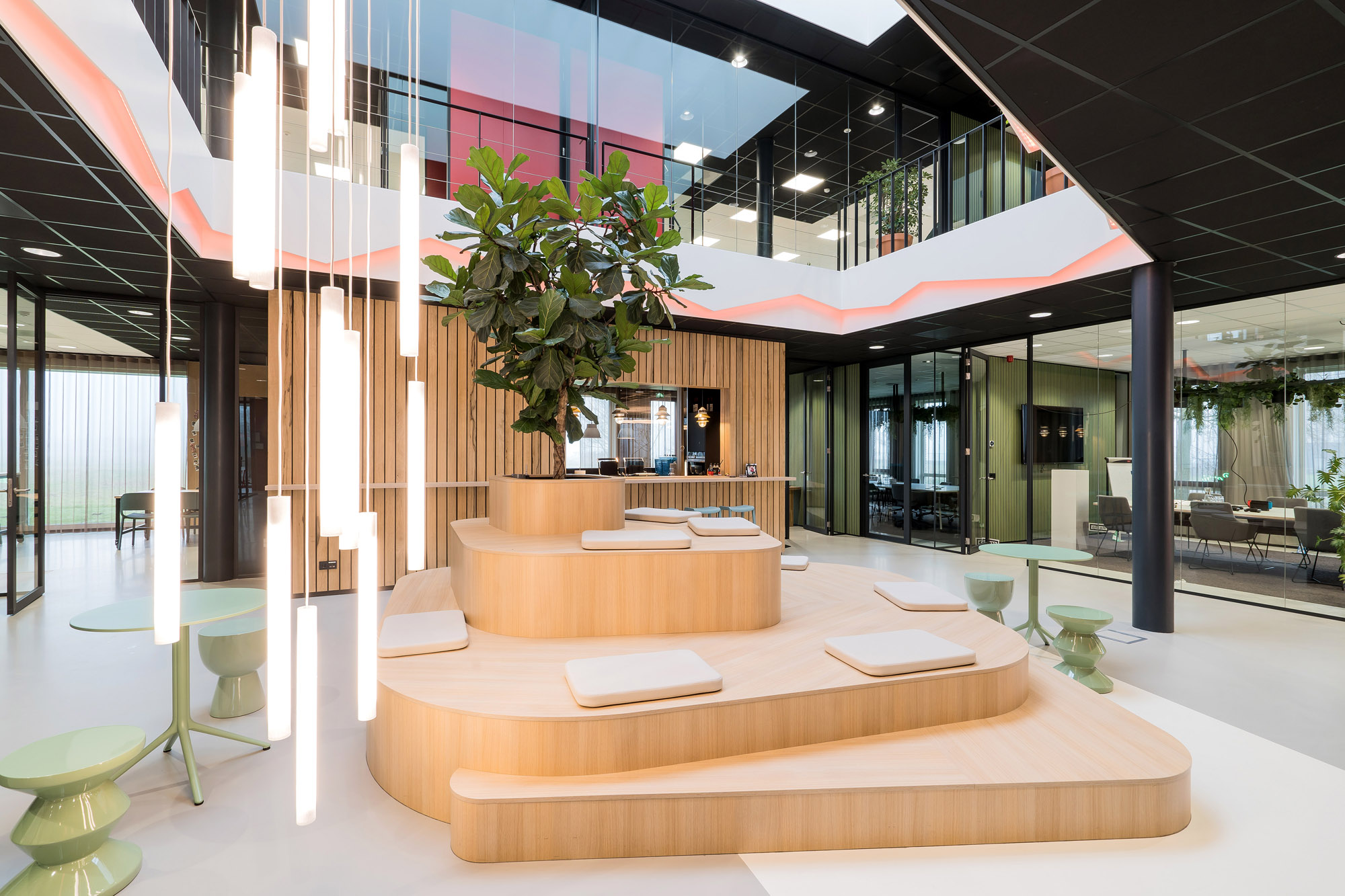 Het centrale punt is het parkmeubel waar de medewerkers relaxed kunnen zitten om bij te praten of te gamen. De high score wordt nog verder op scherp gezet bij de maatwerk kastenwand op het gamepodium. De akoestische wandbekleding draagt bij aan het akoestisch comfort tijdens de werkzaamheden en tijdens het ontspannen op deze sfeervolle werkplek in Zevenaar.