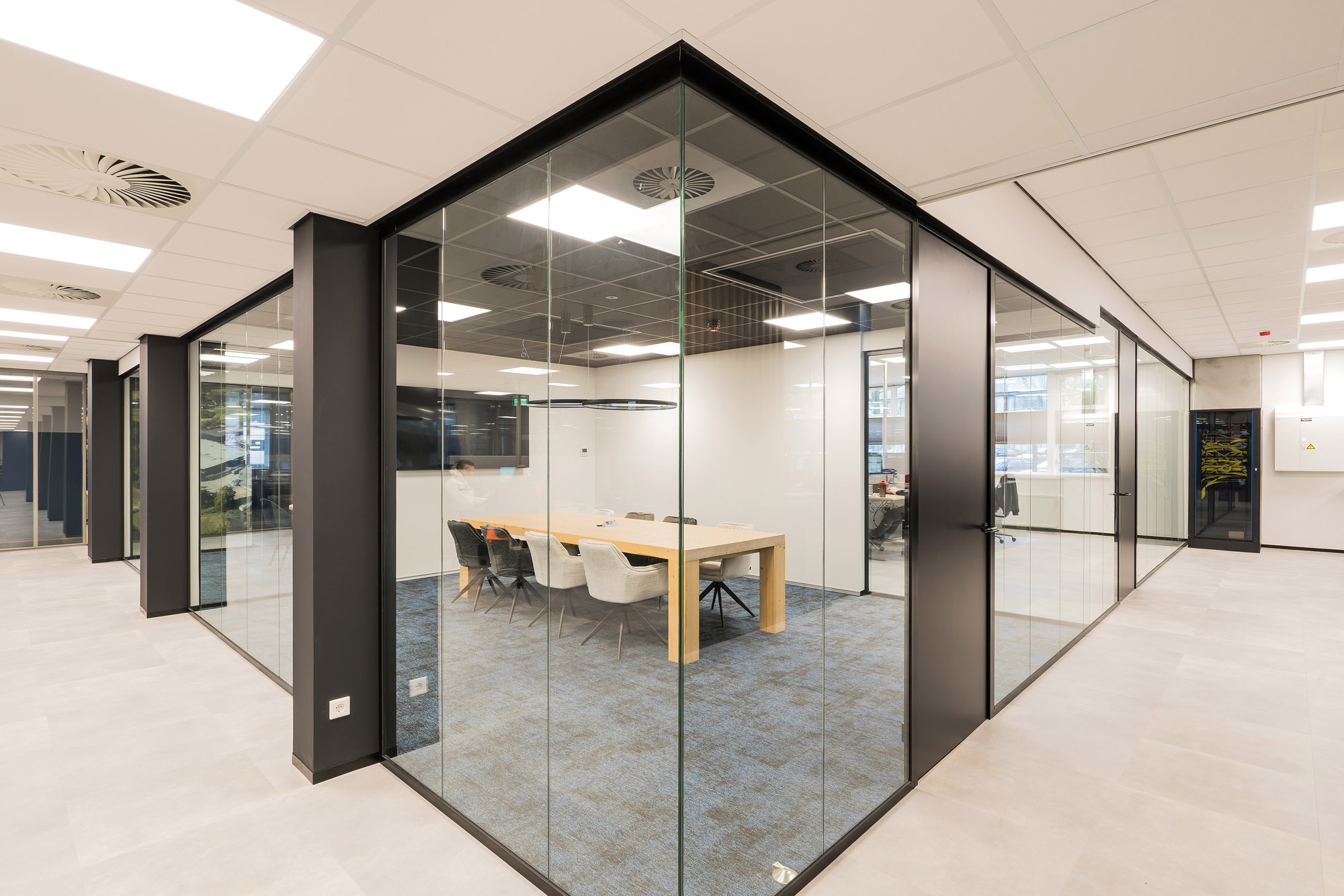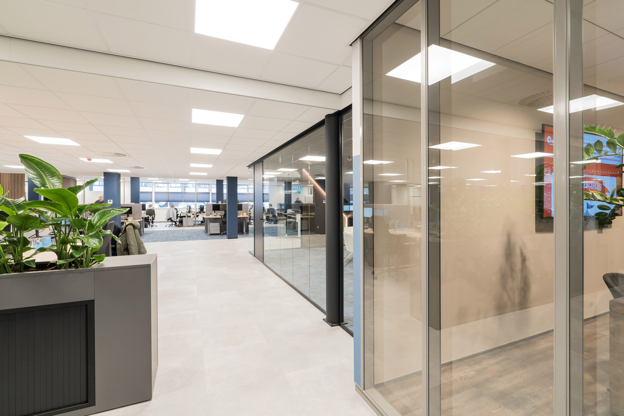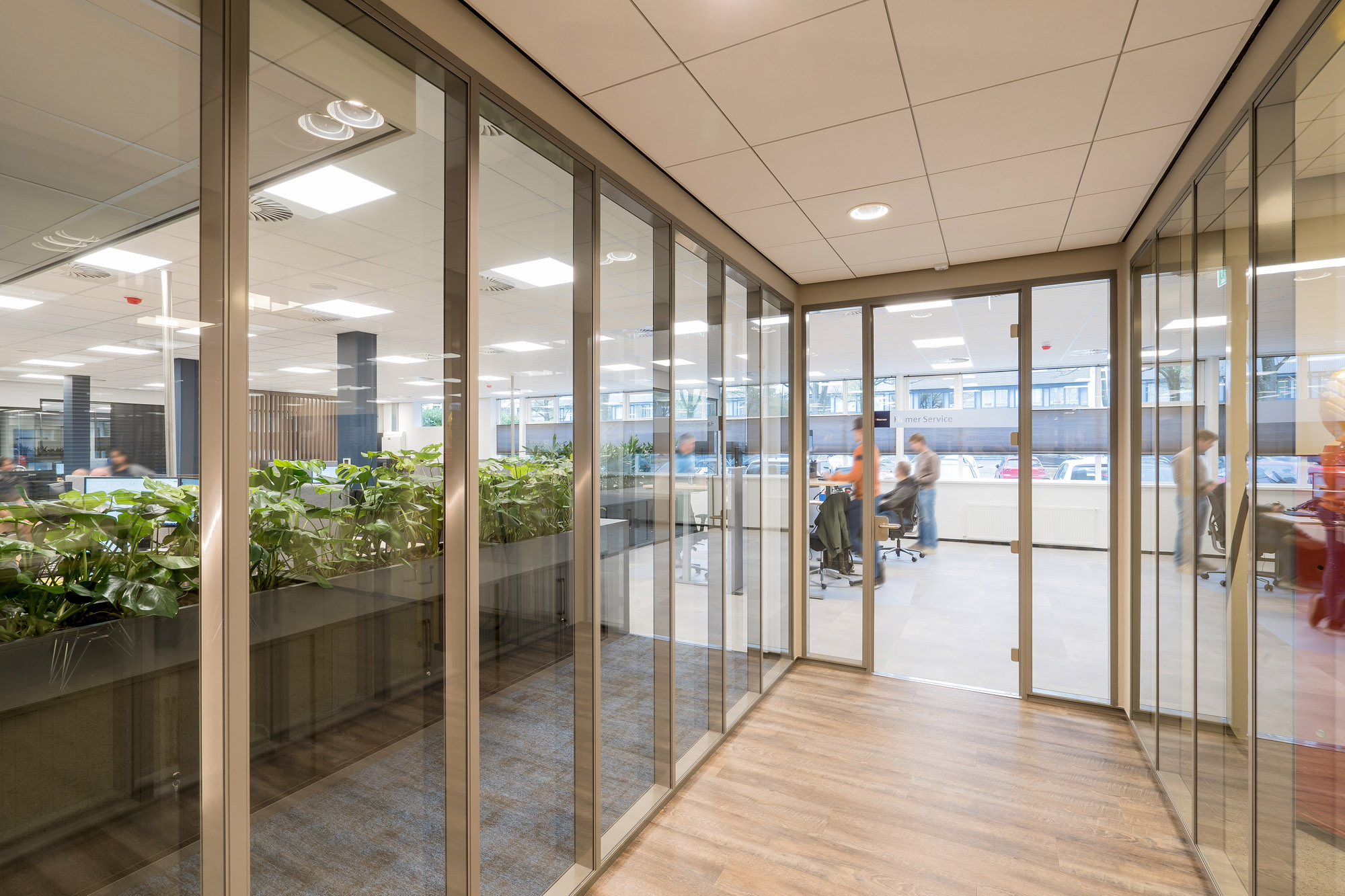 De bestaande glazen systeemwanden bij Hamer die wij bij eerdere verbouwingen hebben toegepast, zijn hergebruikt in het nieuwe ontwerp. Deze Second Life wanden komen uit onze TC-lijn; glascassettes met dubbel glas. De glaswanden zijn gedemonteerd en herplaatst om zo weer jaren mee te kunnen in het nieuwe ontwerp. Deze duurzame oplossing laat wederom zien dat duurzaamheid en duurzame techniek belangrijke onderdelen zijn binnen de bedrijfsvoering van Hamer.