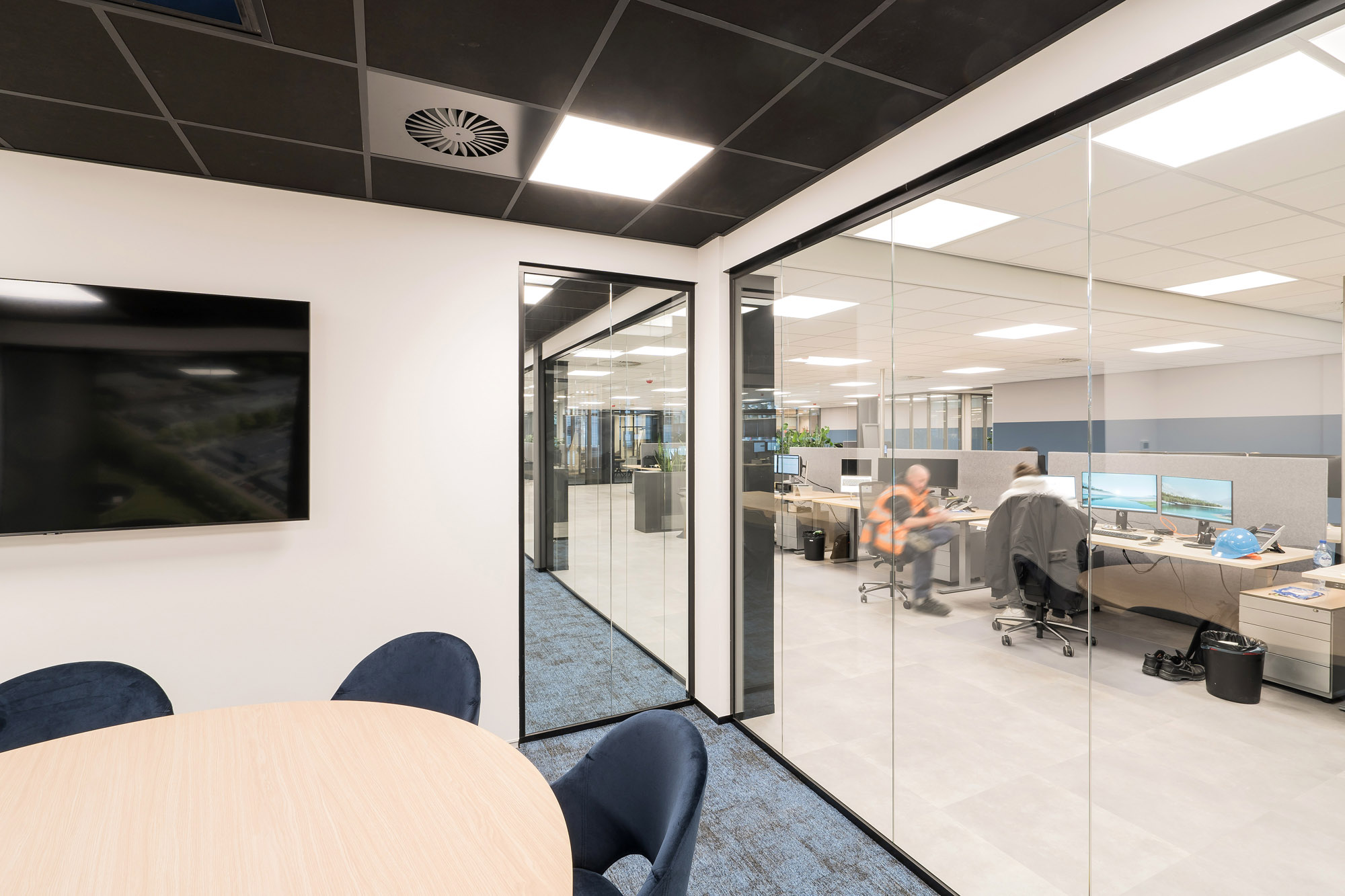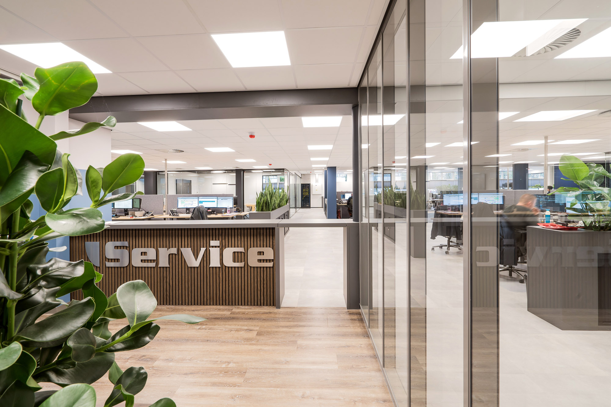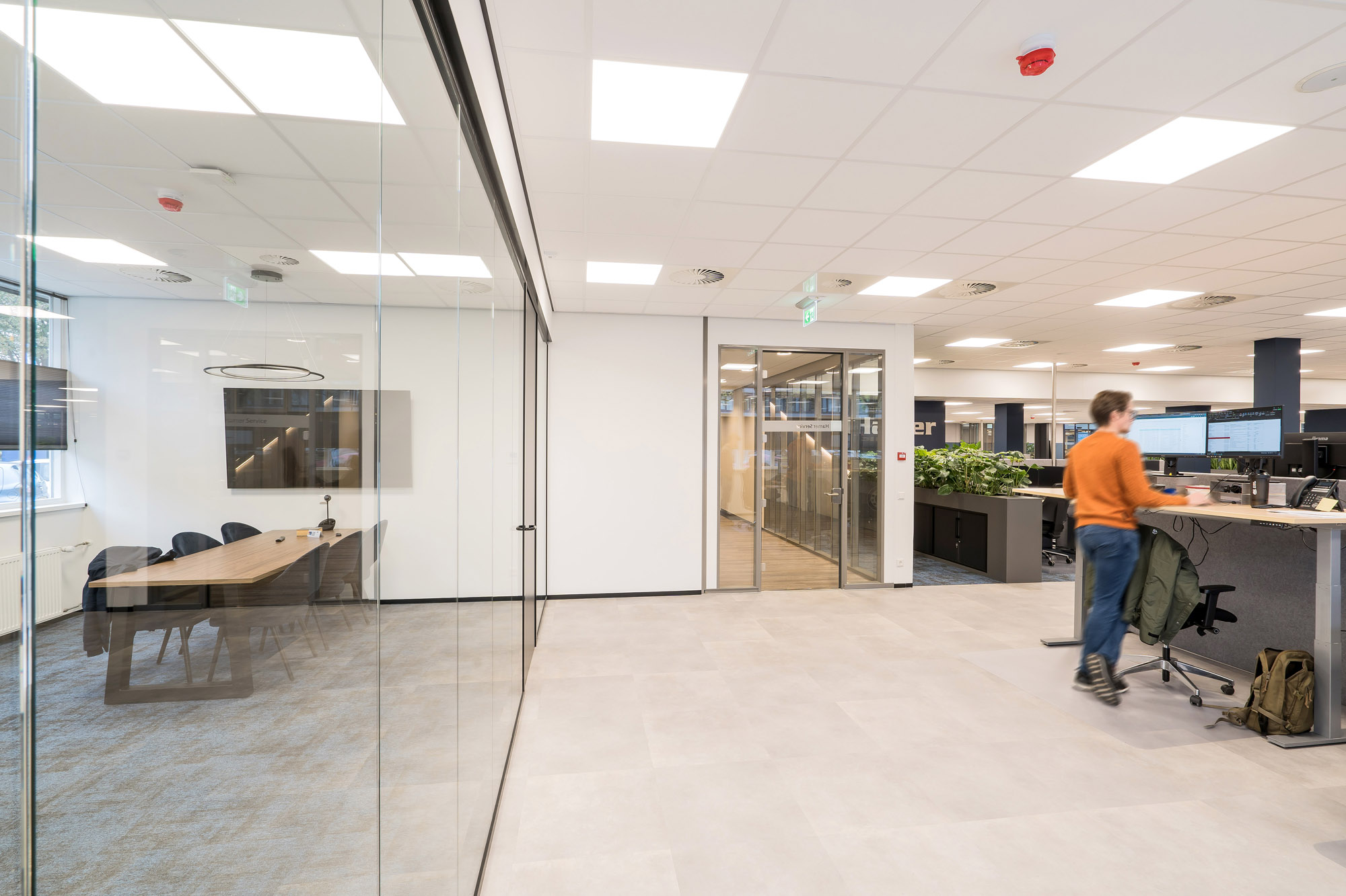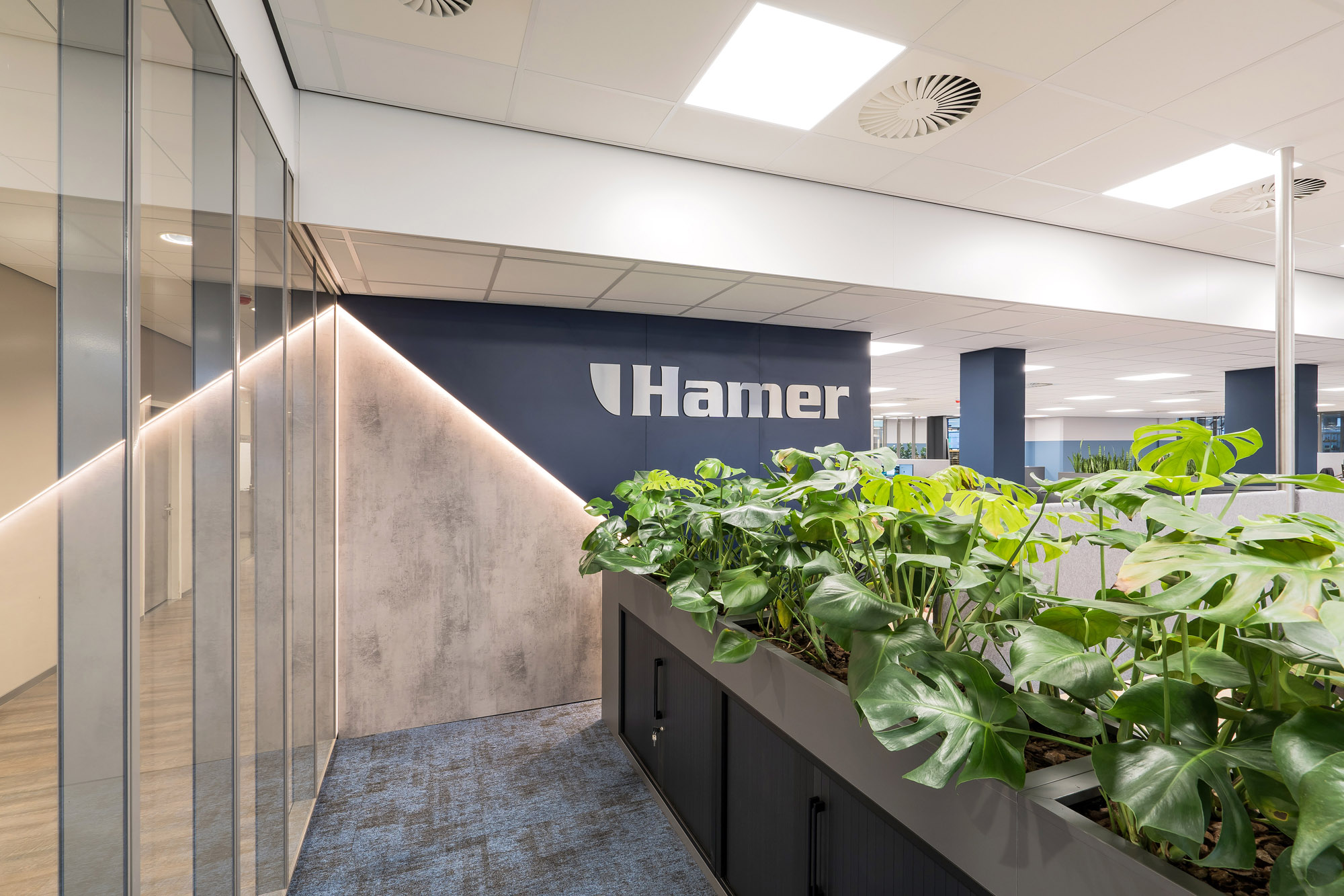 De grootscheepse renovatie van de werkplekken in het hoofdkantoor te Apeldoorn wordt in 3 fases uitgevoerd. Het Service gedeelte is fase 1. Fase 2 staat in de startblokken om uitgevoerd te worden en fase 3 wordt op dit moment ontworpen door ons ontwerpteam. Het Service gedeelte van Hamer heeft als hart de Procesroom. Om rust op de afdeling te garanderen zijn de vergaderunits strategisch geplaatst in de ruimte. Hierdoor vormen ze een barrière tussen het drukste gedeelte van de afdeling en de rest van de werkvloer.