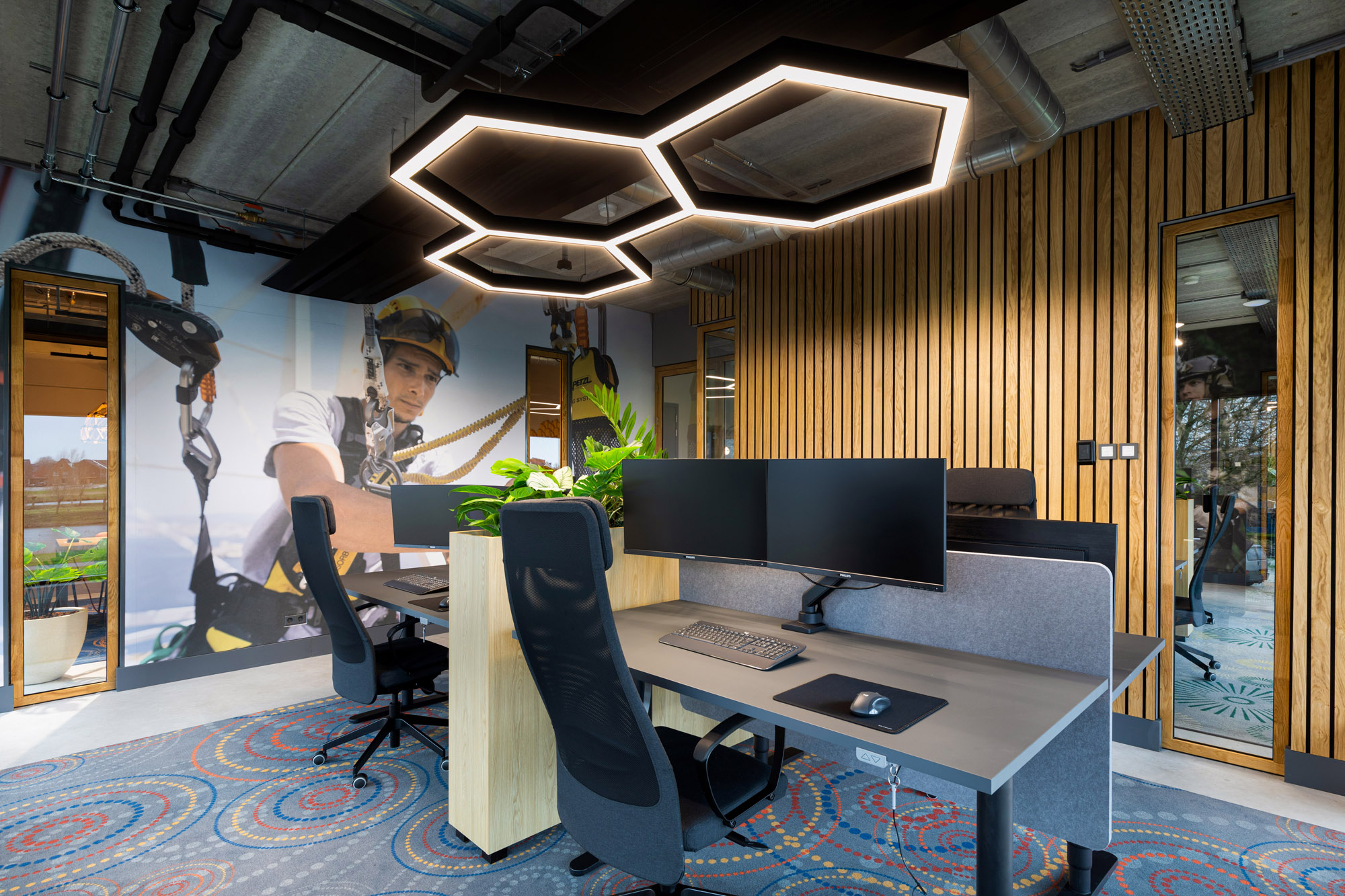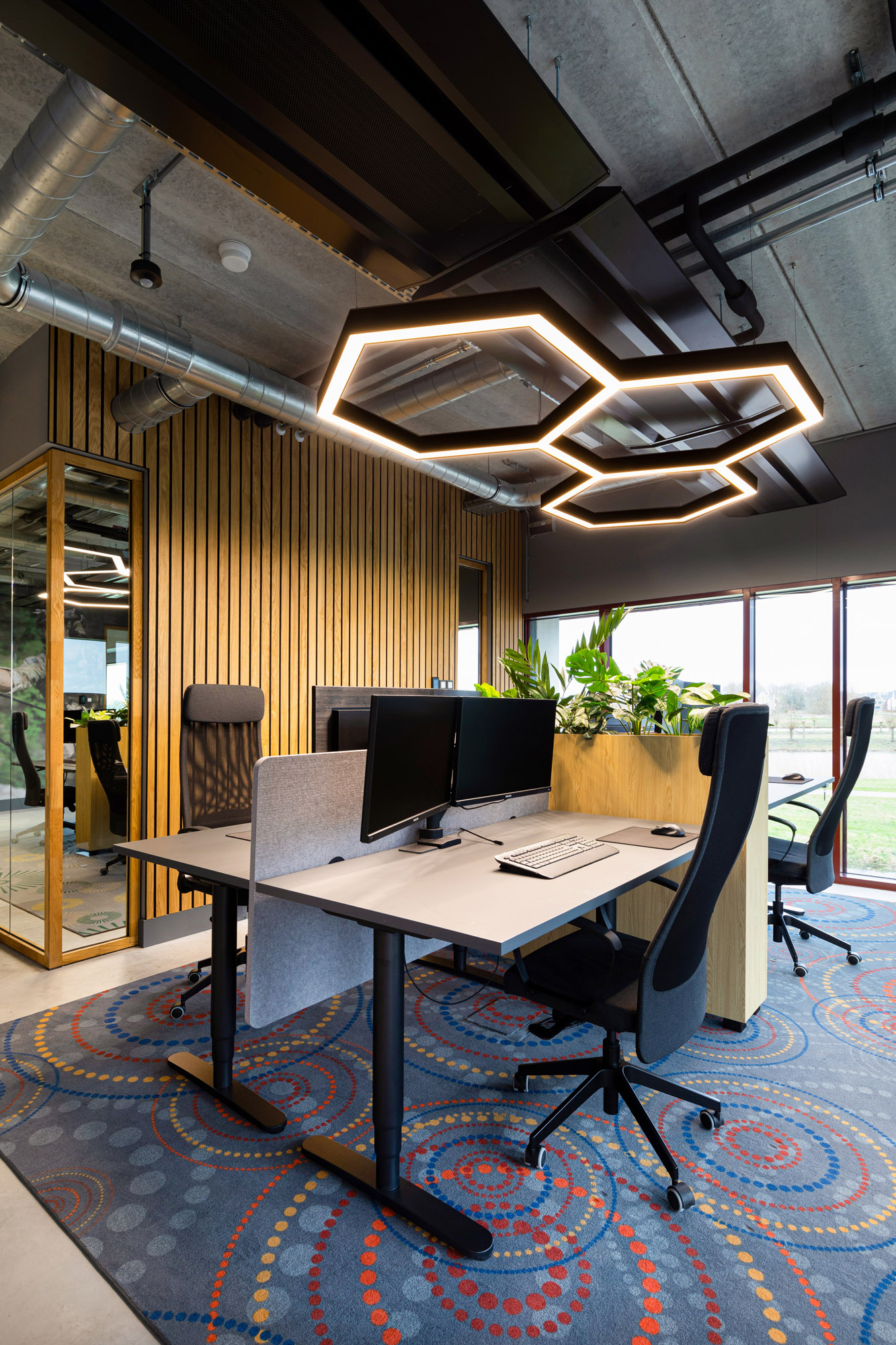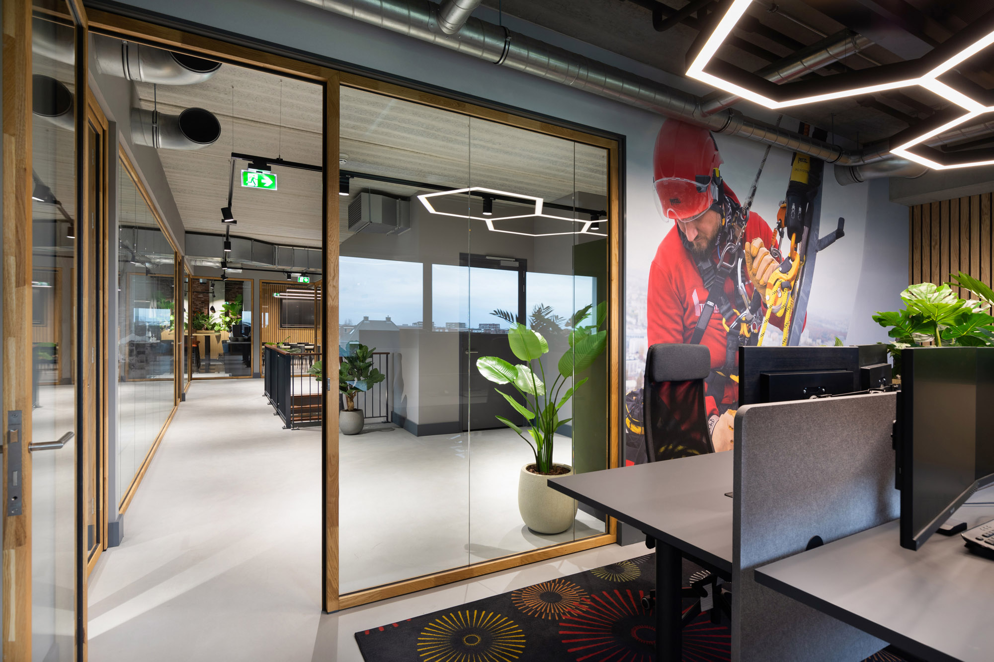 De systeemwanden zijn gemonteerd onder een hangwand en gaan in 90 graden hoeken kris kras het hele pand door. De lange glazen gangwanden zorgen voor veel lichtinval en een speelse ondertoon met de houten profielen.