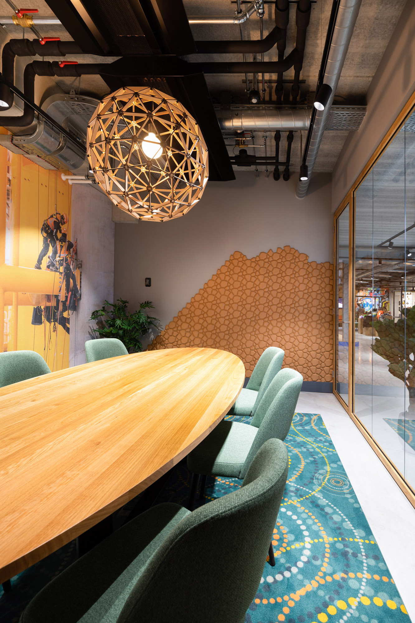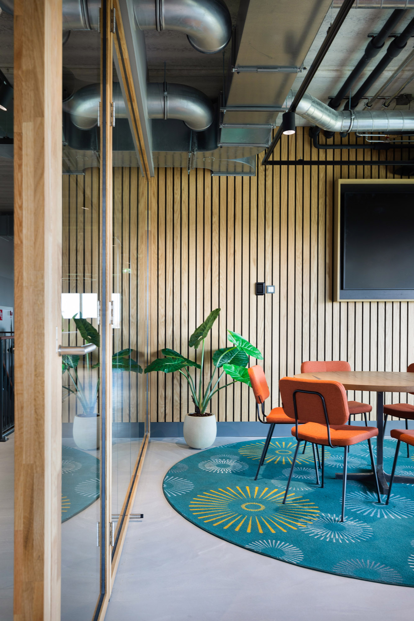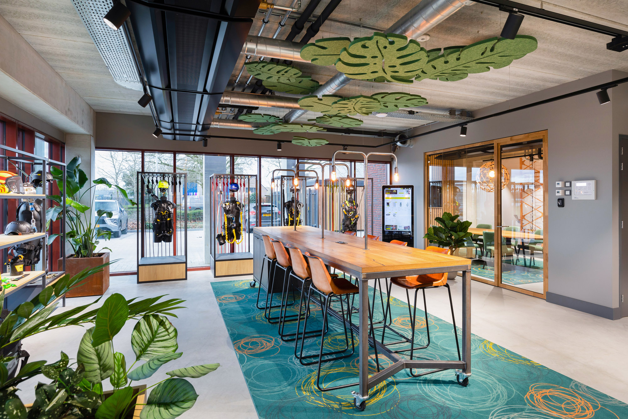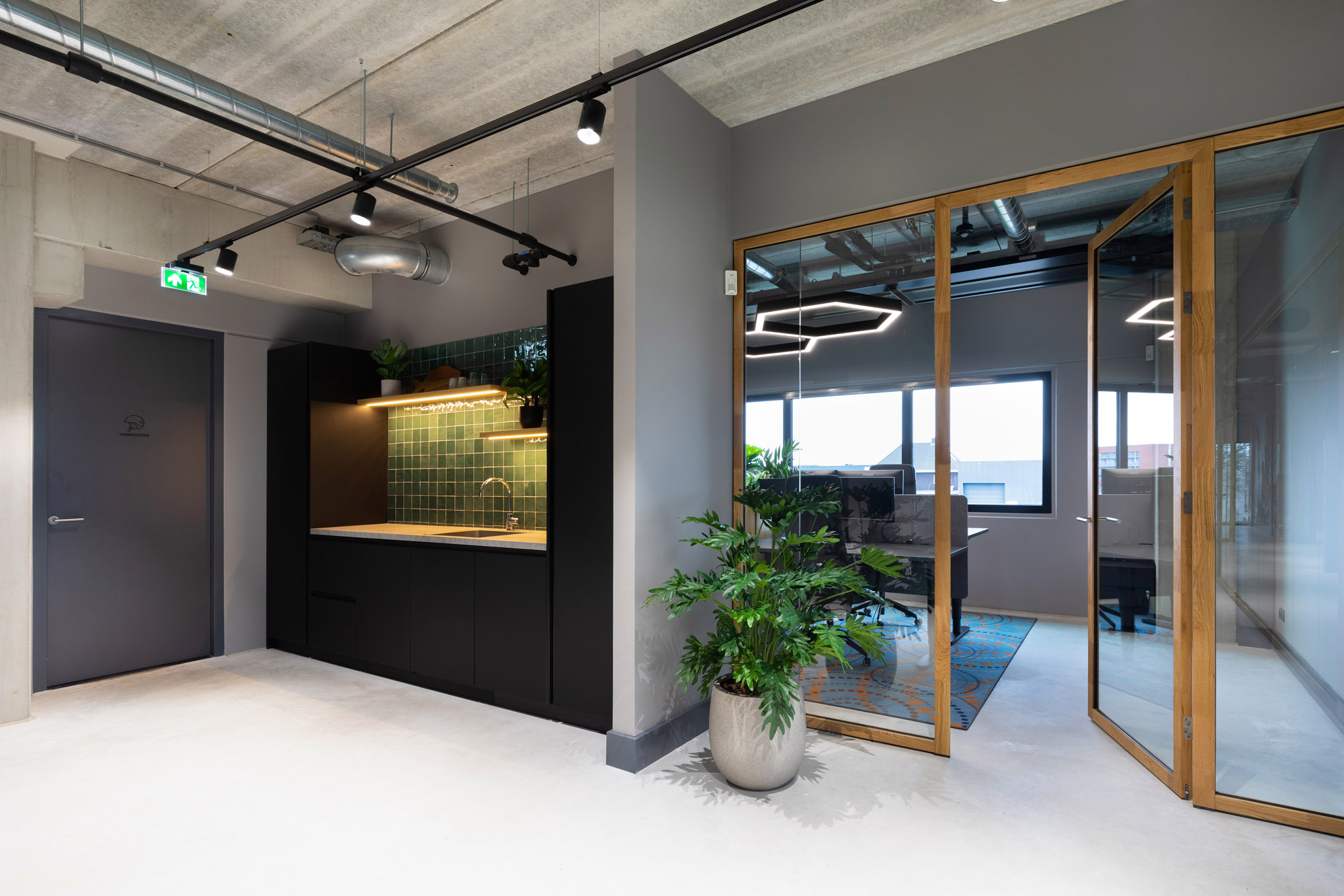 De systeemwanden zijn gemonteerd onder een hangwand en gaan in 90 graden hoeken kris kras het hele pand door. De lange glazen gangwanden zorgen voor veel lichtinval en een speelse ondertoon met de houten profielen.