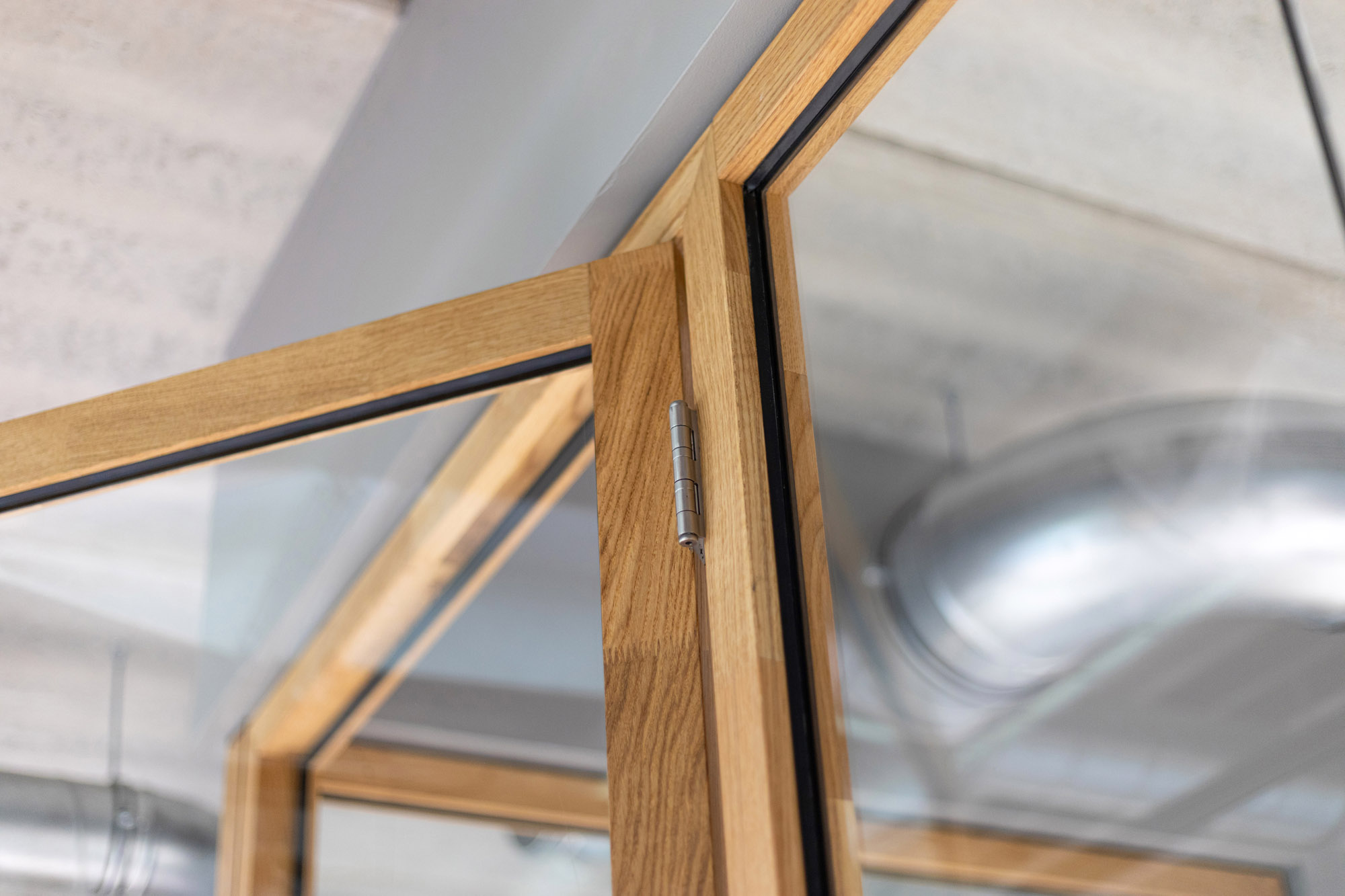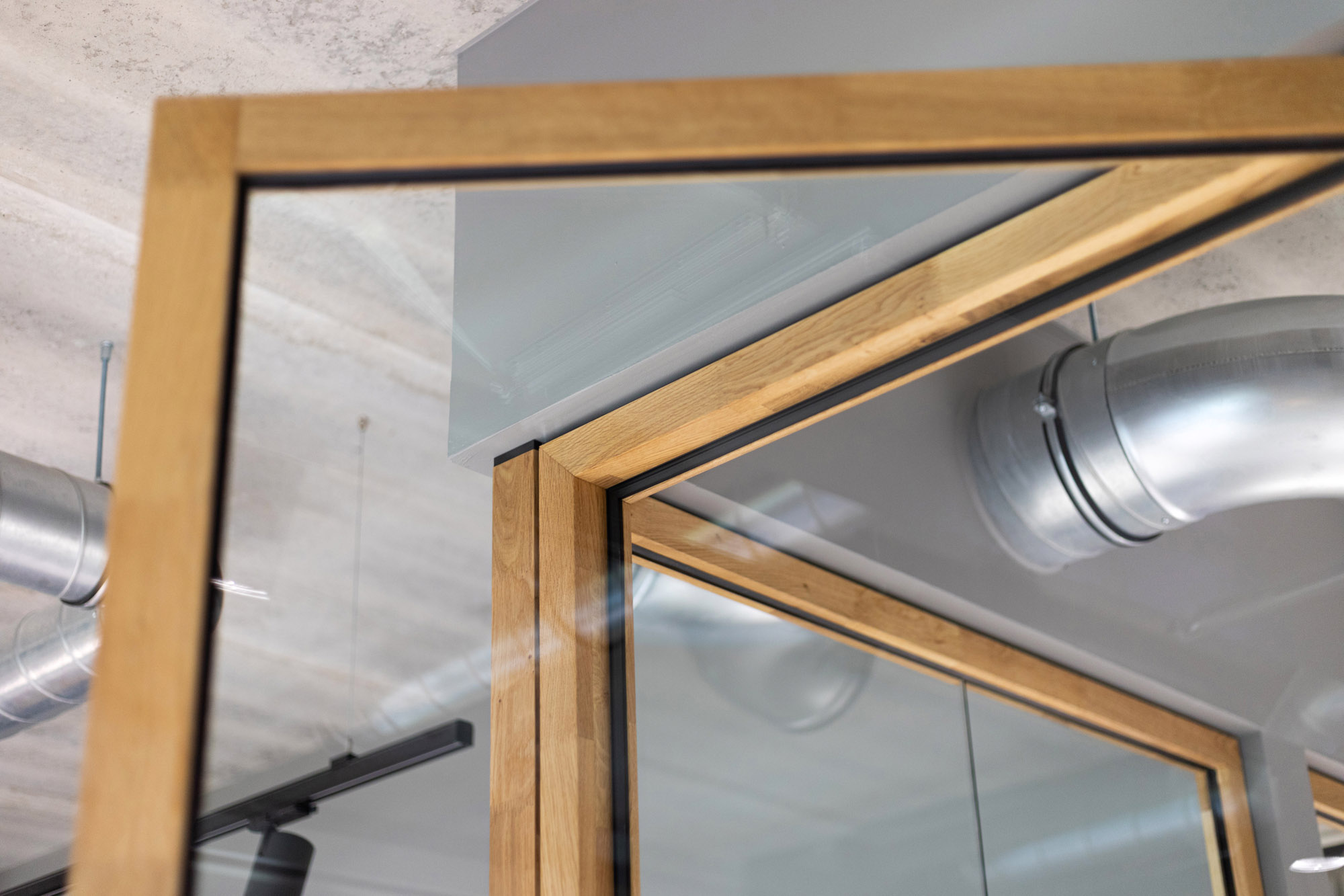 De WoodFrame deuren zijn met hun ranke profilering bijna niet van de wanden te onderscheiden en creëren een bijzonder en rustig lijnen spel. De wanden en deuren bieden naast transparantie de gewenste geluidsisolatie om rustig te kunnen werken.