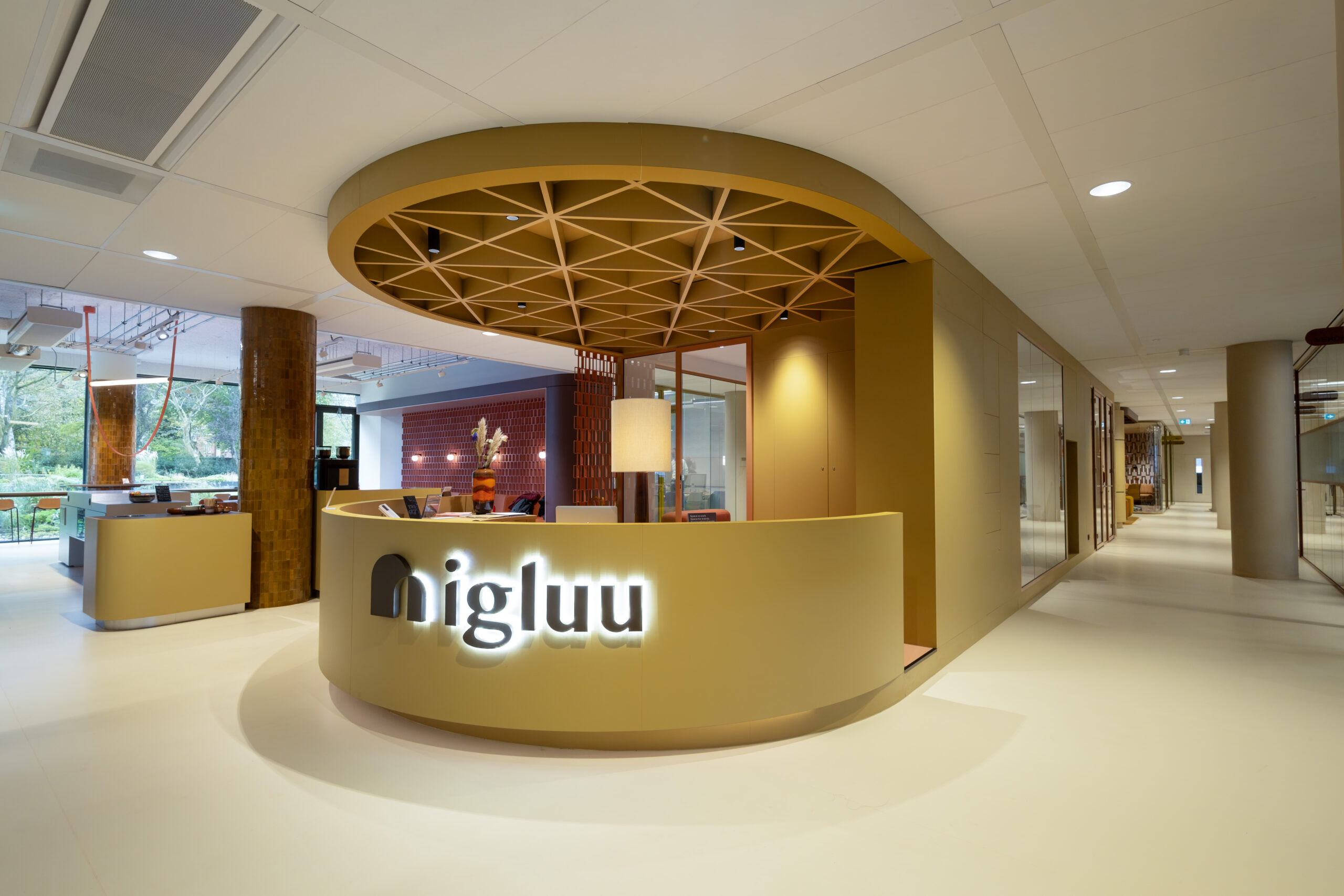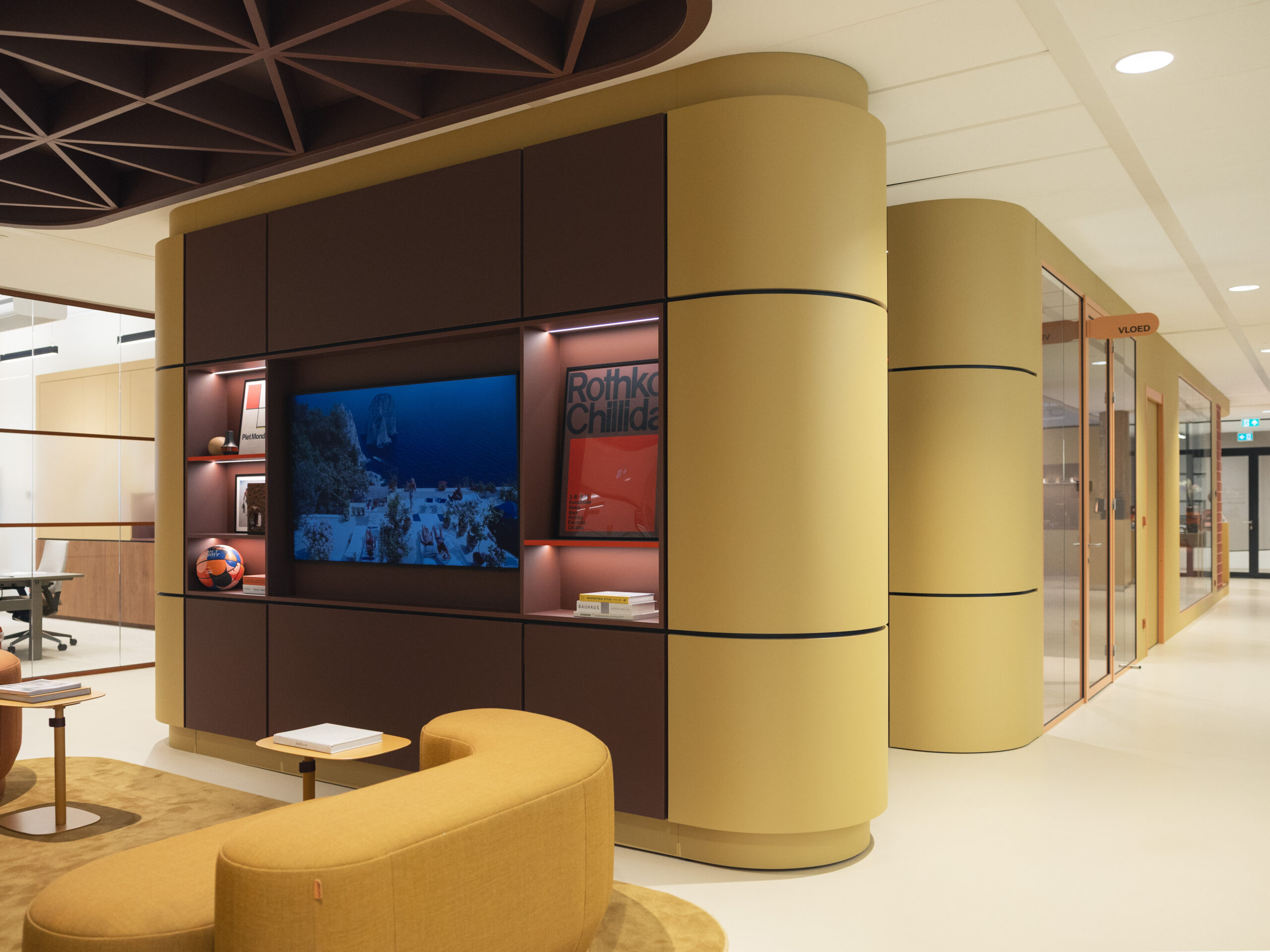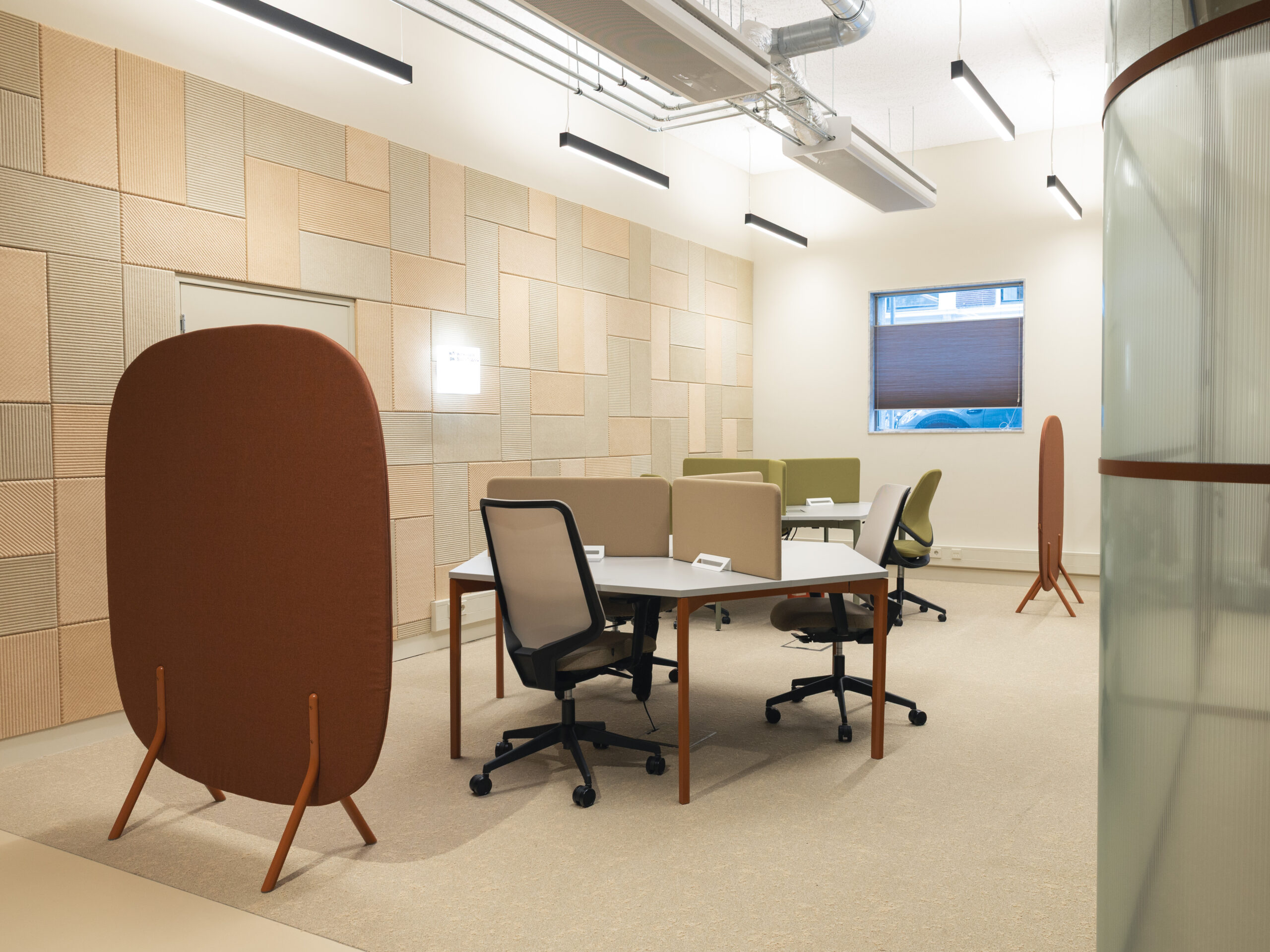 Over de hele etage is maatwerk interieurbouw verweven in het ontwerp. Centraal in de ruimte komen bezoekers en huurders langs de ronde receptiebalie met bijpassende luifel. Aan de andere zijde vormt een vergelijkbare luifel het hart van een loungehoek. Verspreid over de werkruimten zorgen lichtgekleurde, ronde kasten voor rust en speelsheid. In meerdere verhuurplekken zijn AECTUAL Gradiënt-panelen toegepast als wanden en hangschermen en zijn muren voorzien van Arte behang. Voor de geluidsbeleving zijn Piet Ceiling Panels aangebracht aan het plafond en Archisonic Terra Cotton aan de wand.