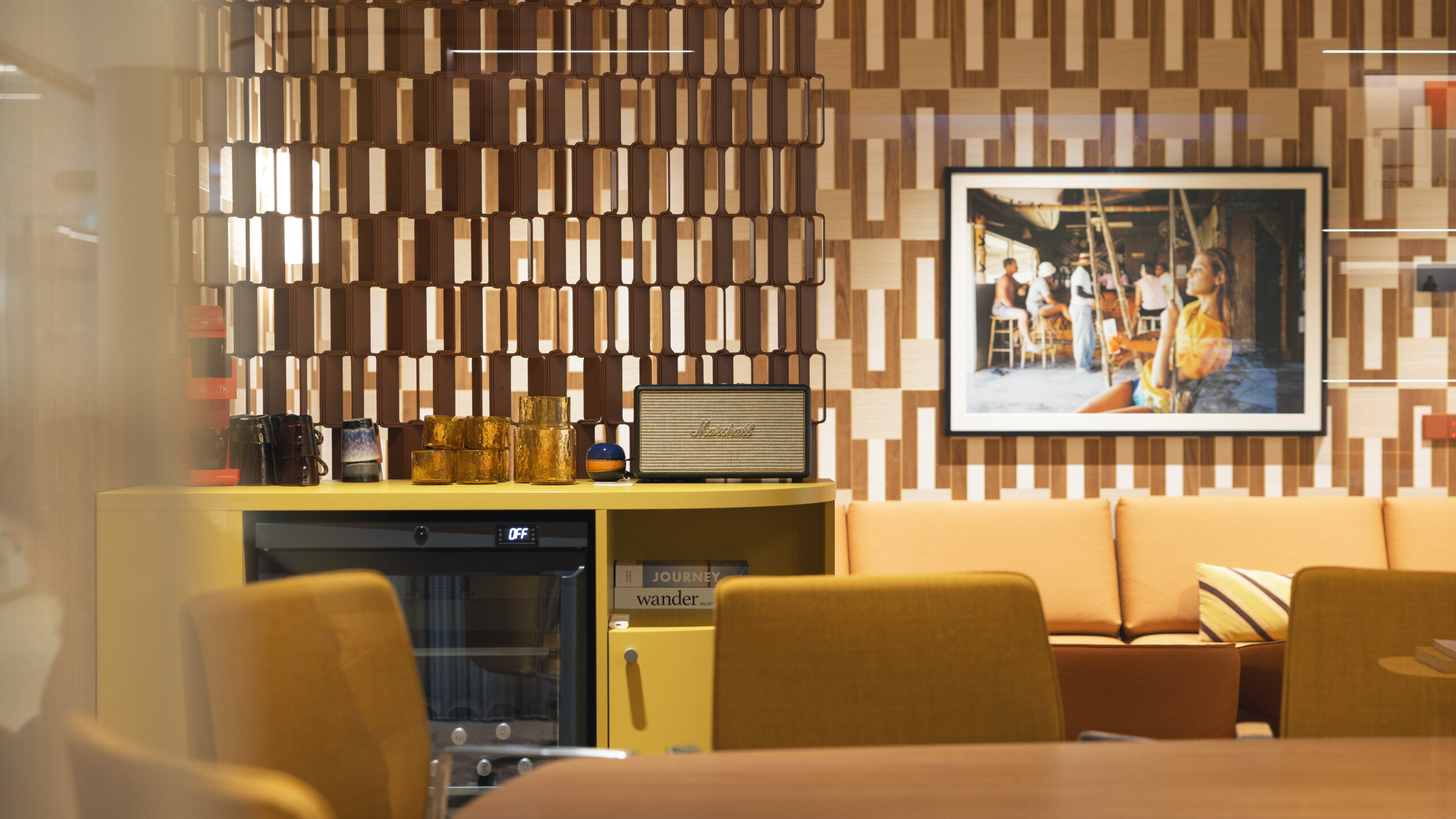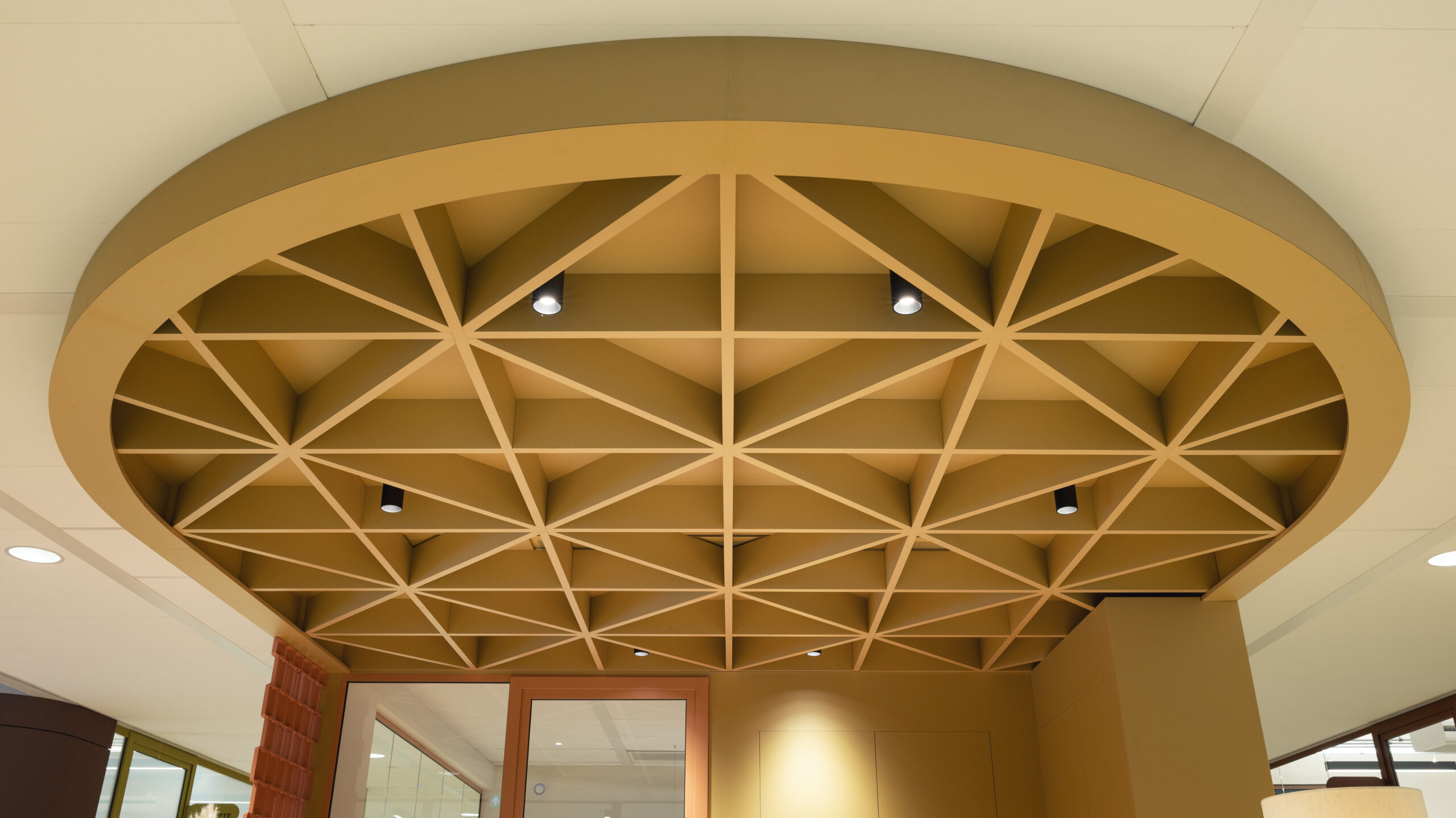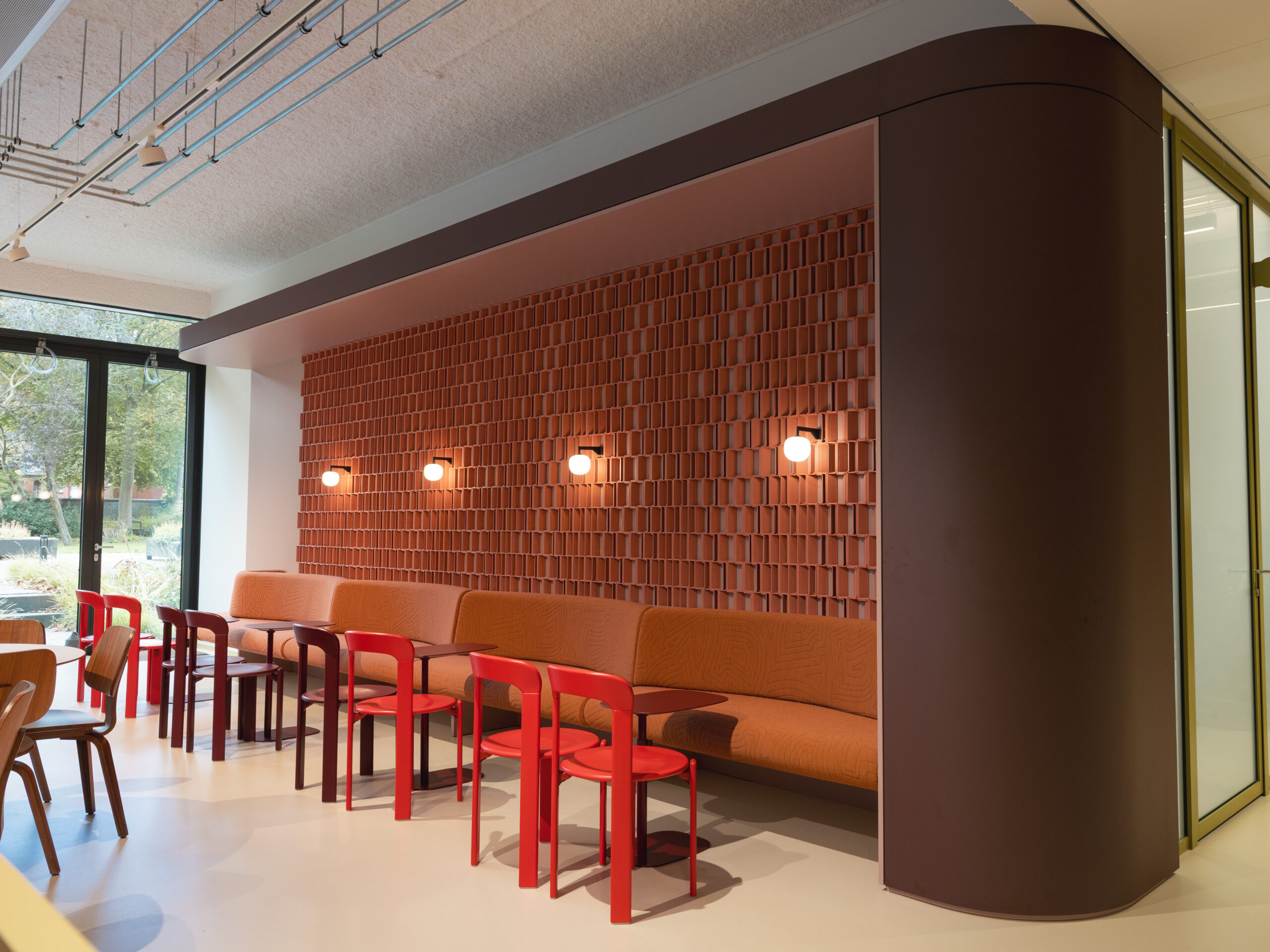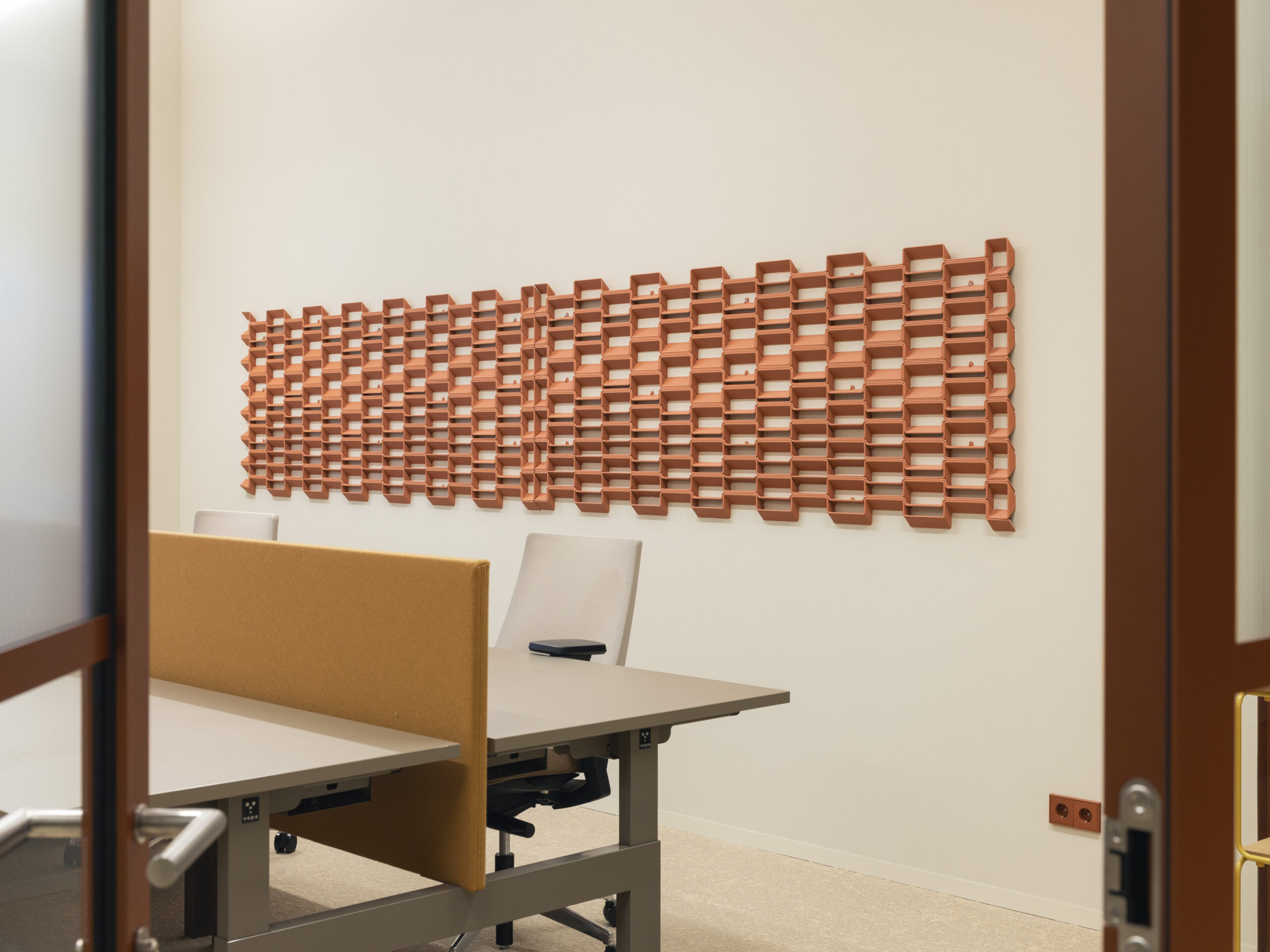 Over de hele etage is maatwerk interieurbouw verweven in het ontwerp. Centraal in de ruimte komen bezoekers en huurders langs de ronde receptiebalie met bijpassende luifel. Aan de andere zijde vormt een vergelijkbare luifel het hart van een loungehoek. Verspreid over de werkruimten zorgen lichtgekleurde, ronde kasten voor rust en speelsheid. In meerdere verhuurplekken zijn AECTUAL Gradiënt-panelen toegepast als wanden en hangschermen en zijn muren voorzien van Arte behang. Voor de geluidsbeleving zijn Piet Ceiling Panels aangebracht aan het plafond en Archisonic Terra Cotton aan de wand.