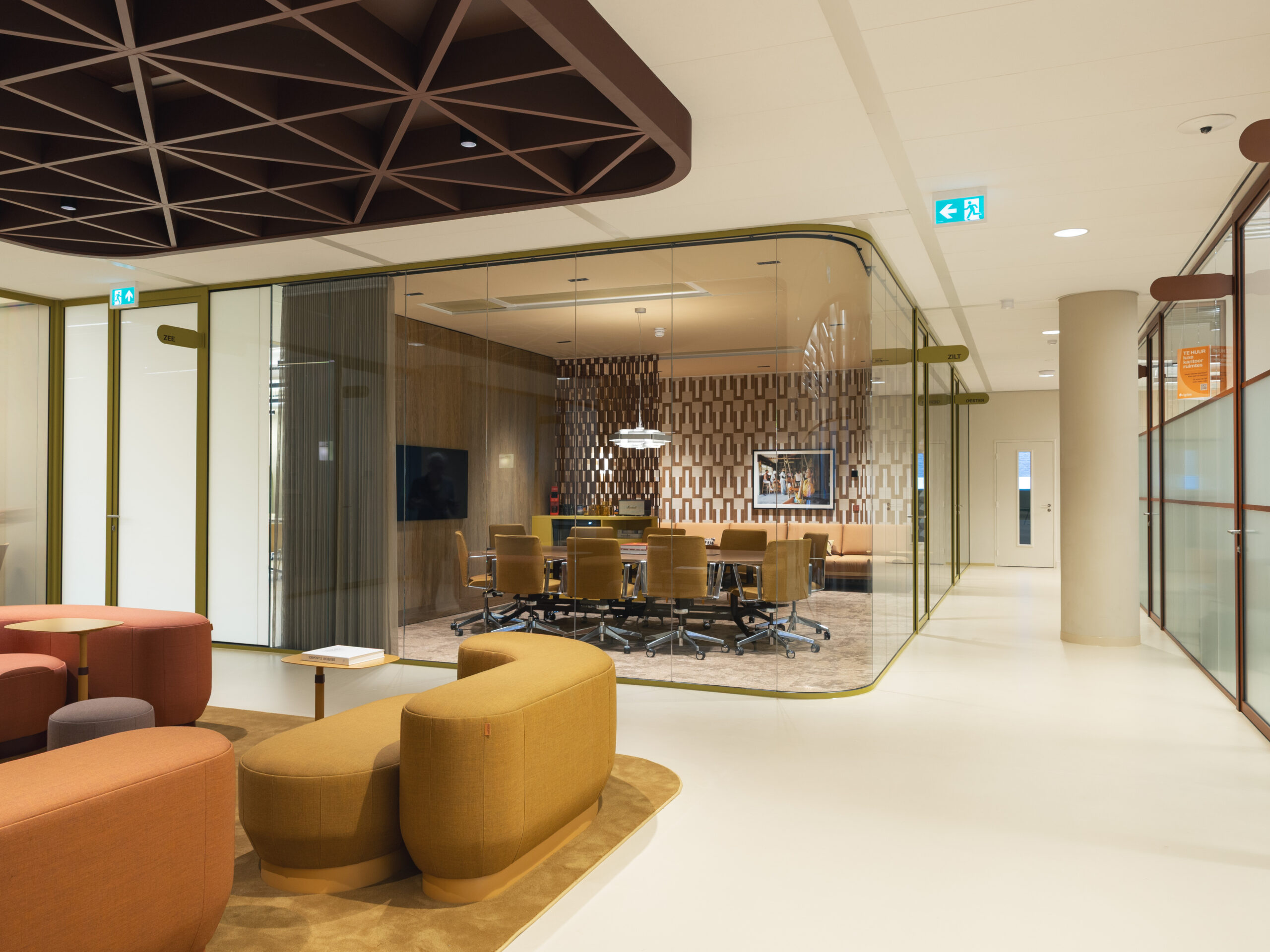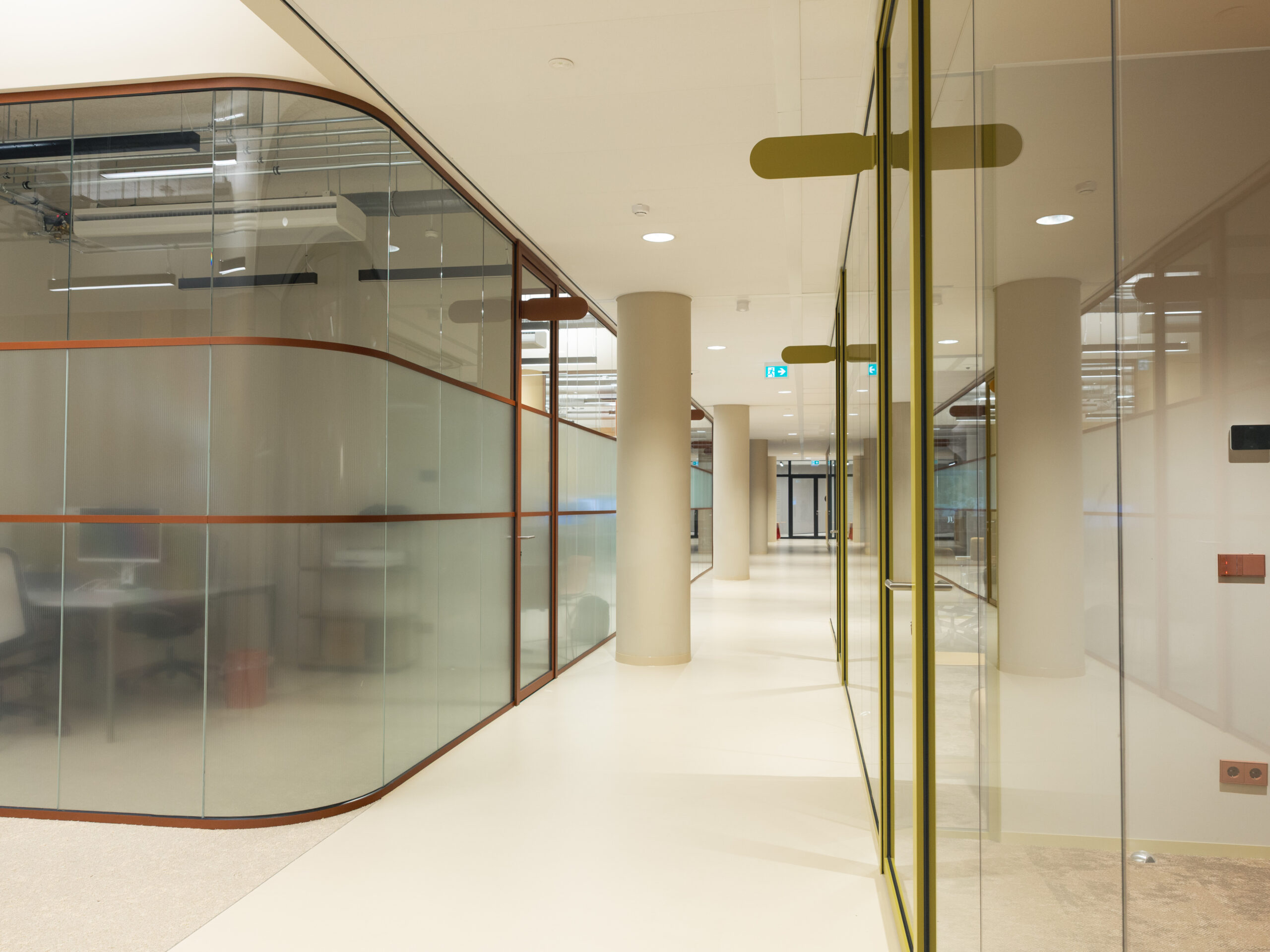 Na de vertaling van het ontwerp tot offerte ging het projectteam aan de slag. Het uitgangspunt was een samenspel van kleuren en vormen die het warme gevoel van Andalusië oproepen. Het palet van oranje- en roodtinten loopt als een zonnige draad door het interieur en is toegepast in Deluxe wanden, ClassicFrame en volglaswanden, plafonds en maatwerkmeubilair. Voor het installatiemateriaal werden roosters en schakelaars in de juiste tint gekleurd voor een strak totaalbeeld. De ronde vormentaal keert terug in glaswanden, luifels en maatwerk meubels en de zachtheid van het ontwerp versterkt. Het gevoel van gastvrijheid komt naar voren in koffiecorners en pantry’s in nissen.