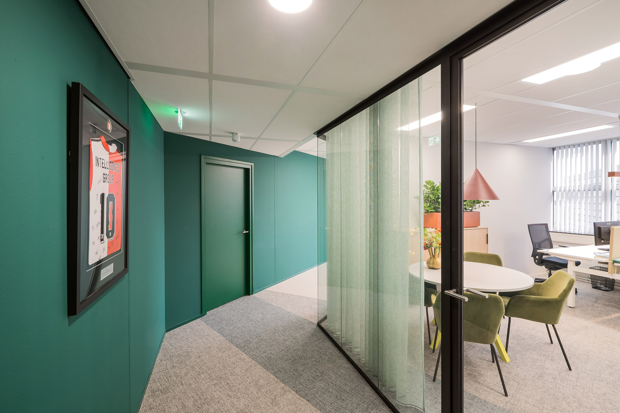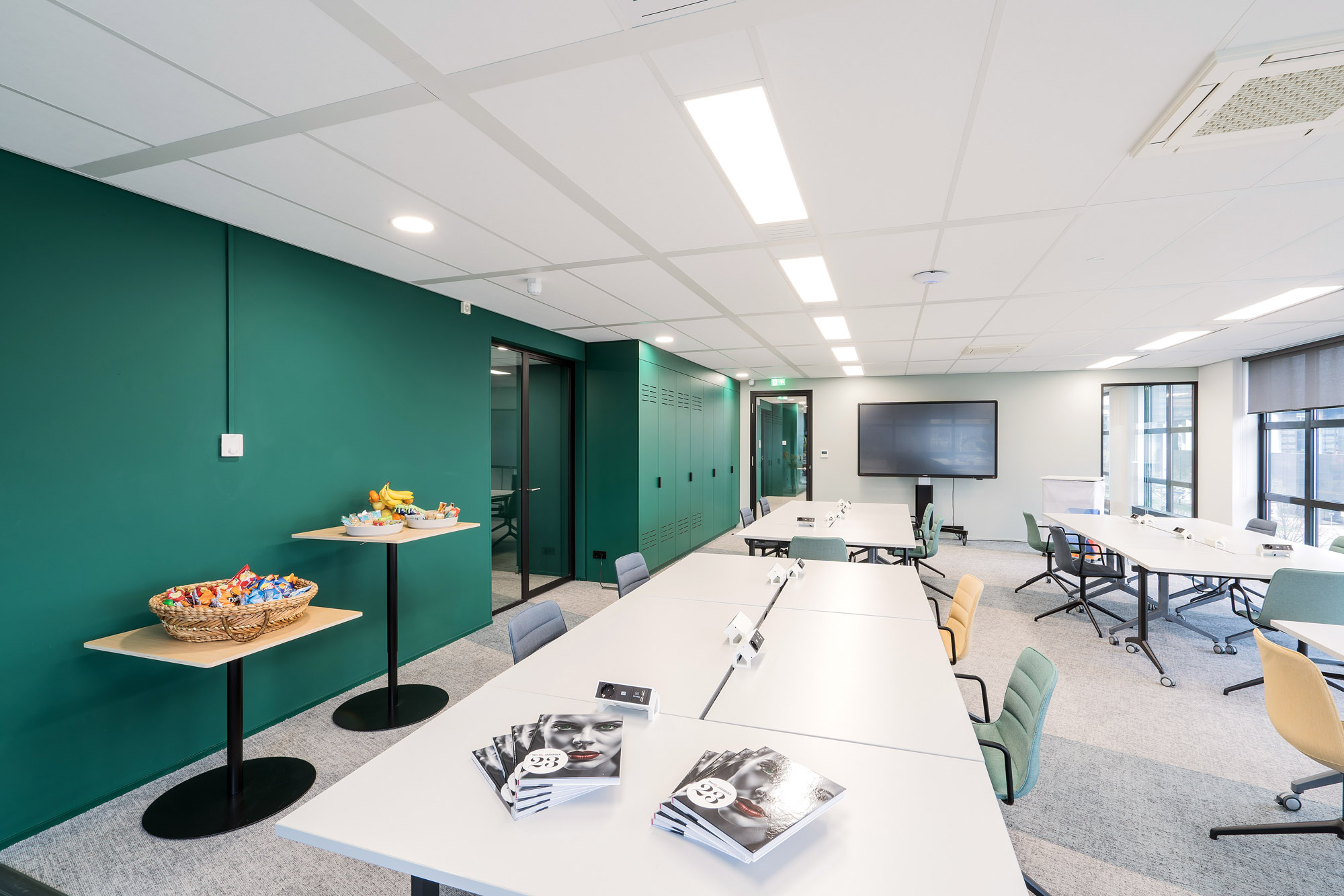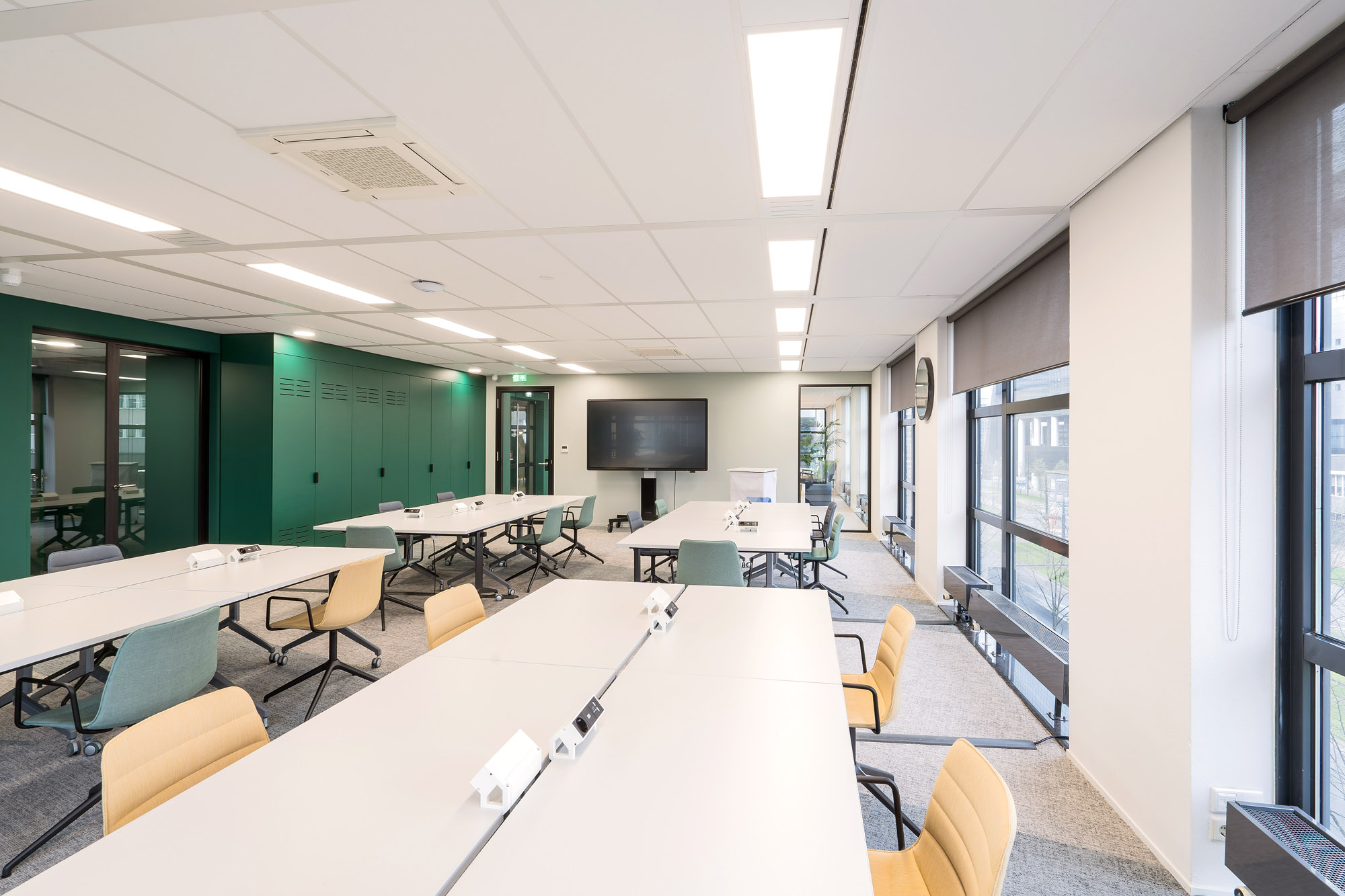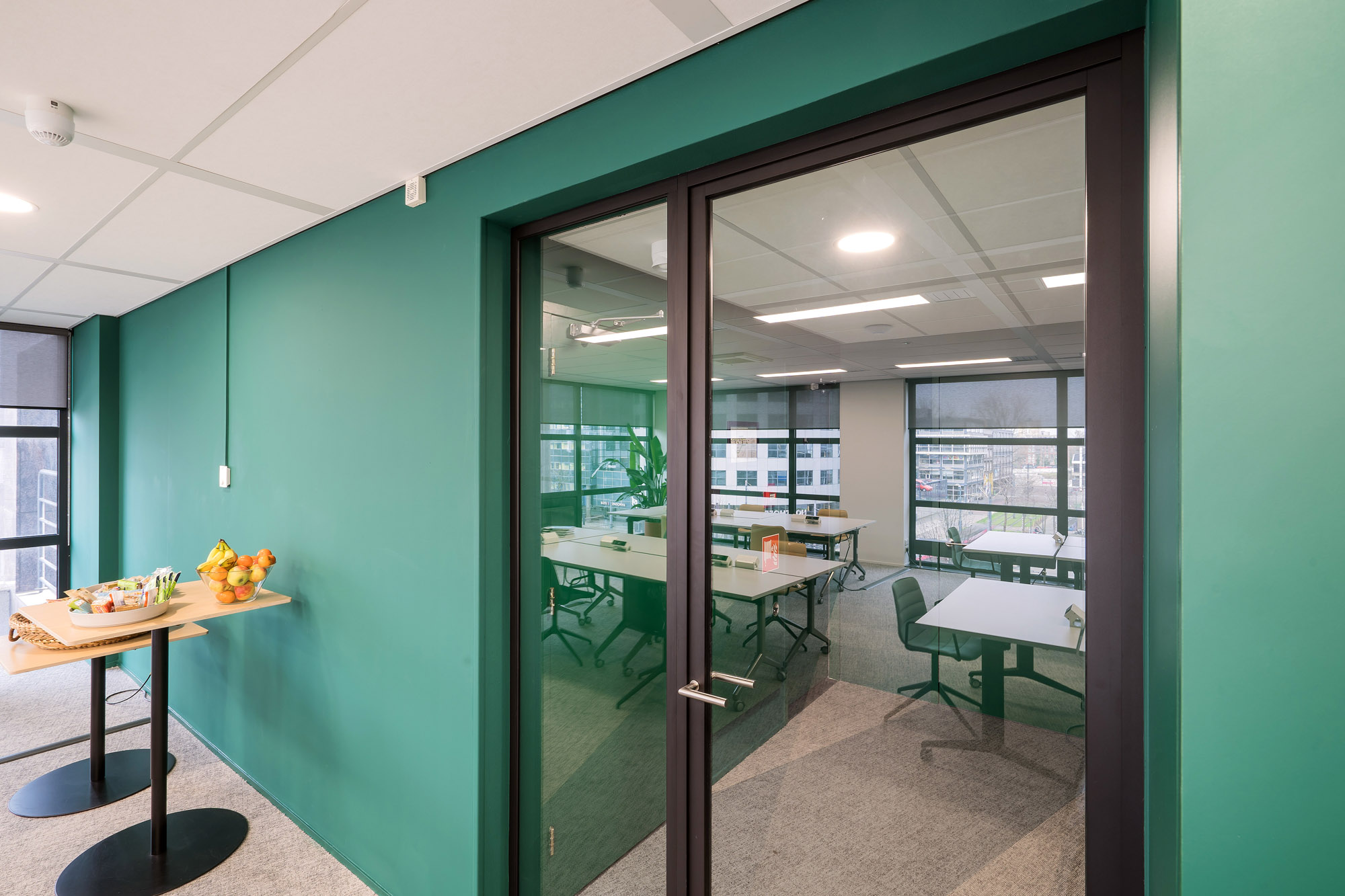 Het bestaande plafond is aangepast aan de nieuwe indeling. Een combinatie van metalstud, glazen systeemwanden en TWIN-wanden zorgen voor een efficiënte werk- en trainingsruimte. Door de 100mm glazen TWIN-deur blijft de connectie met kantoor behouden met een hoge geluidsisolatiewaarde om geen overlast te hebben tijdens de trainingen.