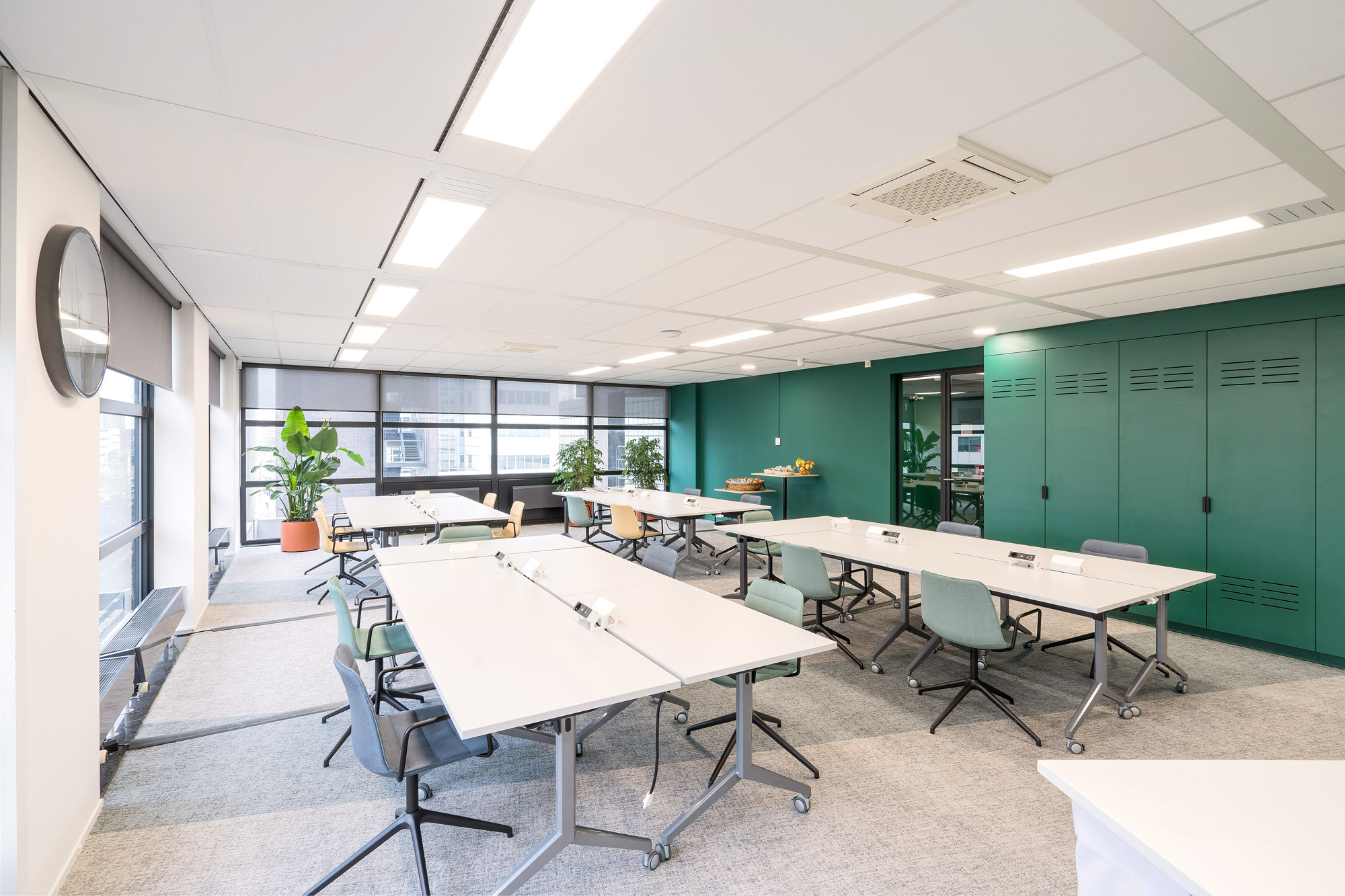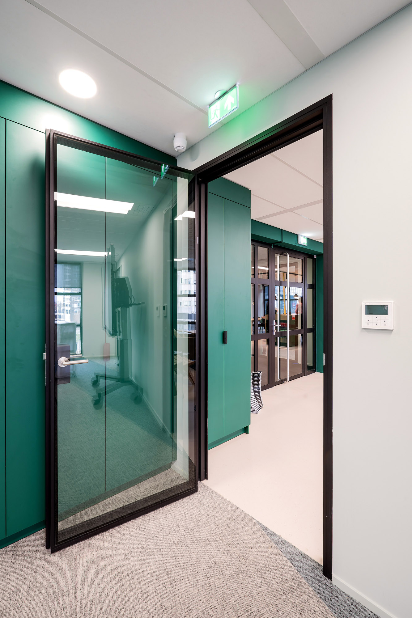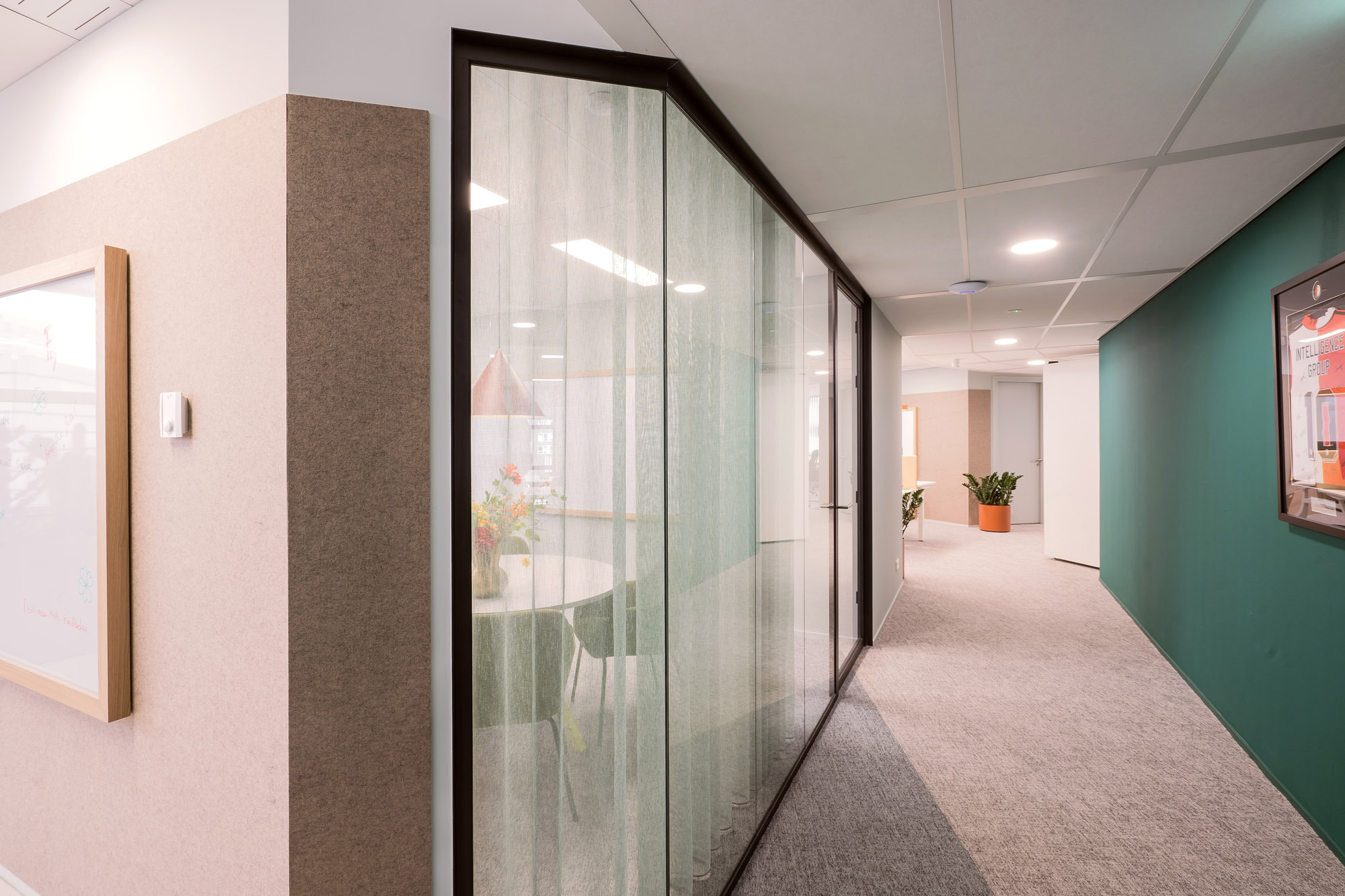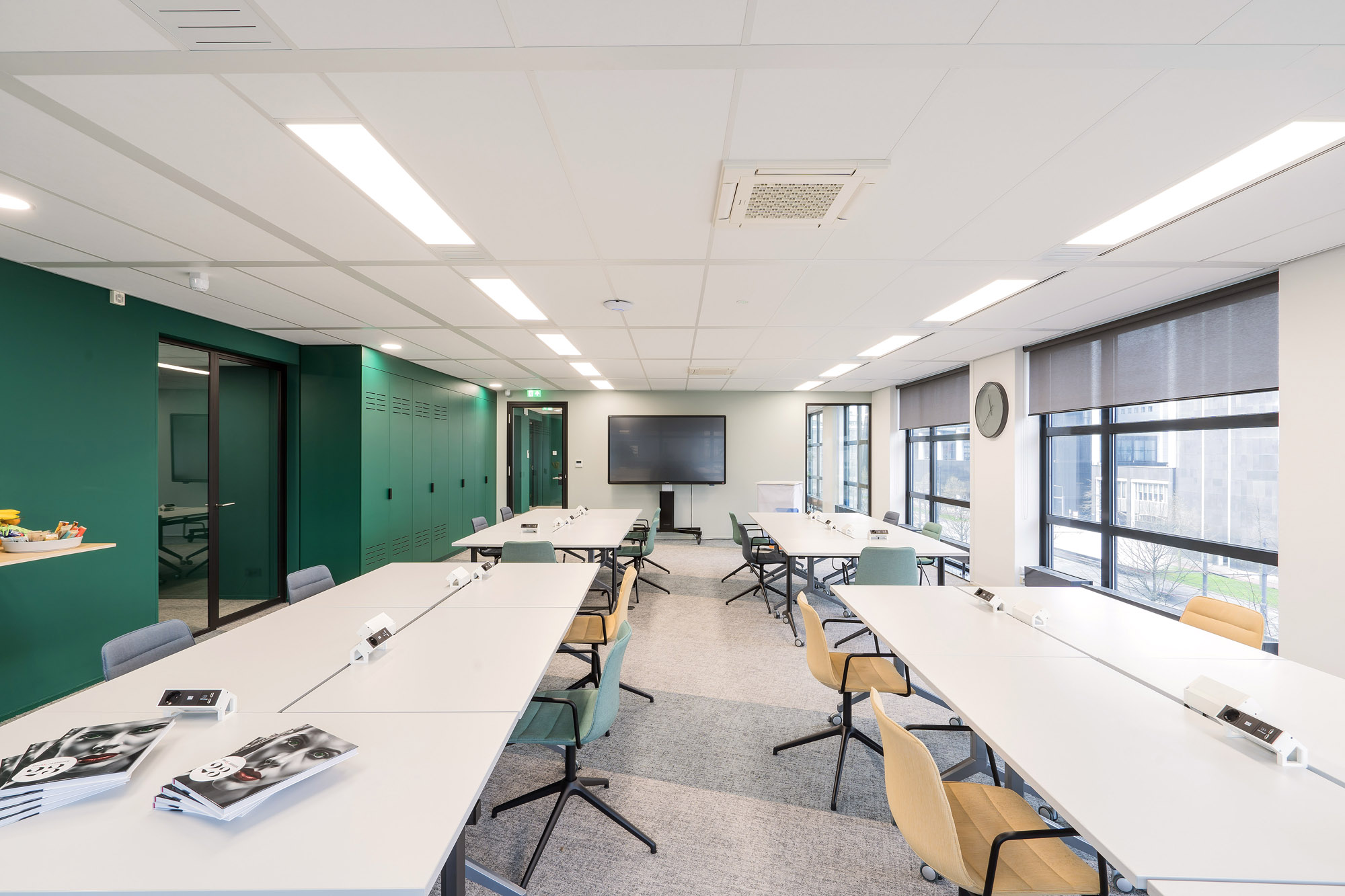 Het bestaande plafond is aangepast aan de nieuwe indeling. Een combinatie van metalstud, glazen systeemwanden en TWIN-wanden zorgen voor een efficiënte werk- en trainingsruimte. Door de 100mm glazen TWIN-deur blijft de connectie met kantoor behouden met een hoge geluidsisolatiewaarde om geen overlast te hebben tijdens de trainingen.