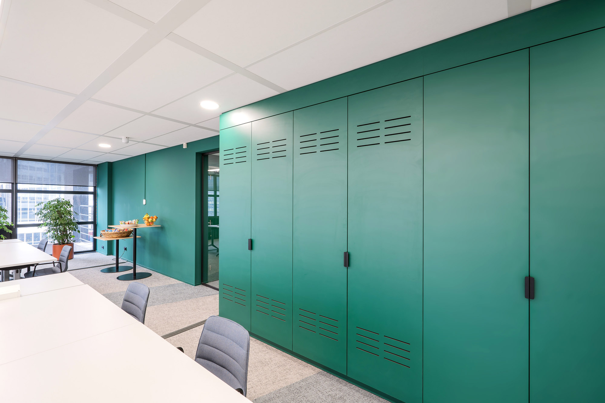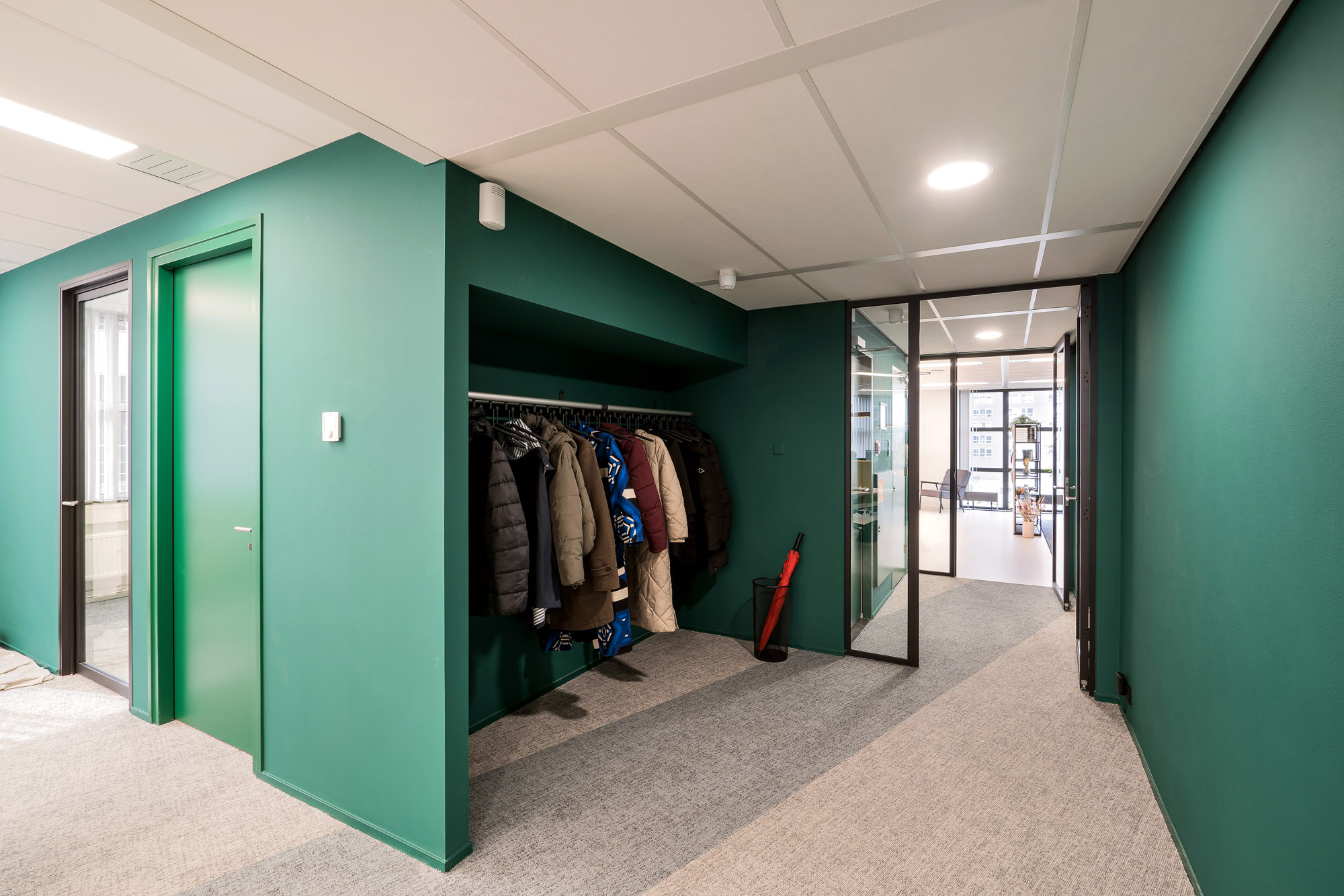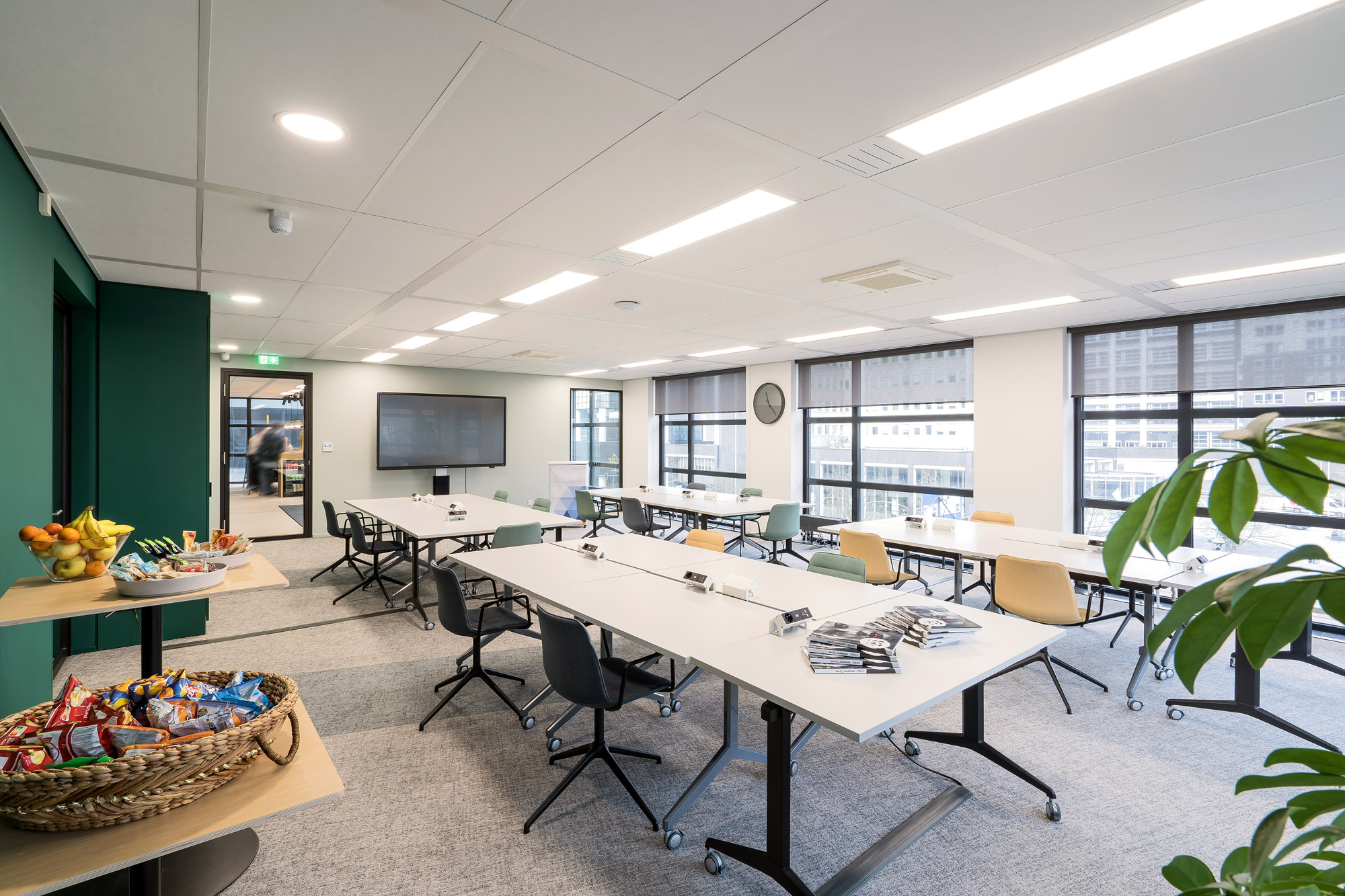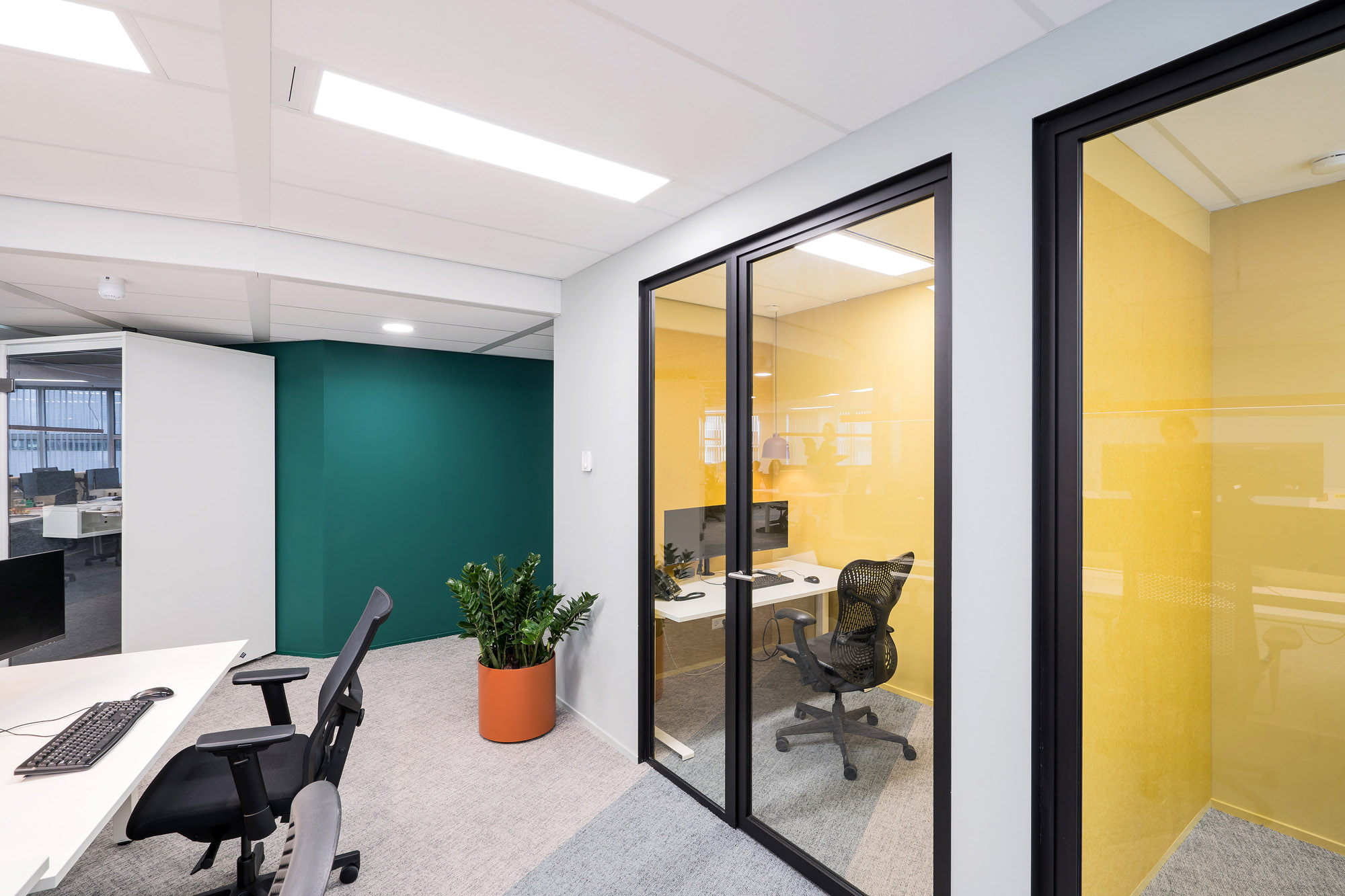 Het bestaande plafond is aangepast aan de nieuwe indeling. Een combinatie van metalstud, glazen systeemwanden en TWIN-wanden zorgen voor een efficiënte werk- en trainingsruimte. Door de 100mm glazen TWIN-deur blijft de connectie met kantoor behouden met een hoge geluidsisolatiewaarde om geen overlast te hebben tijdens de trainingen.
