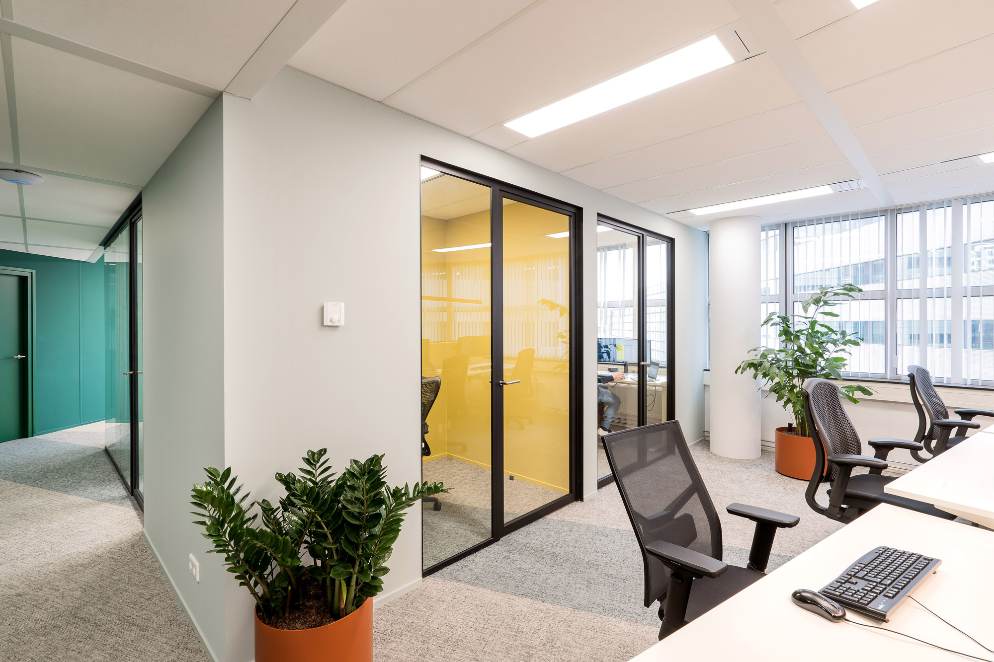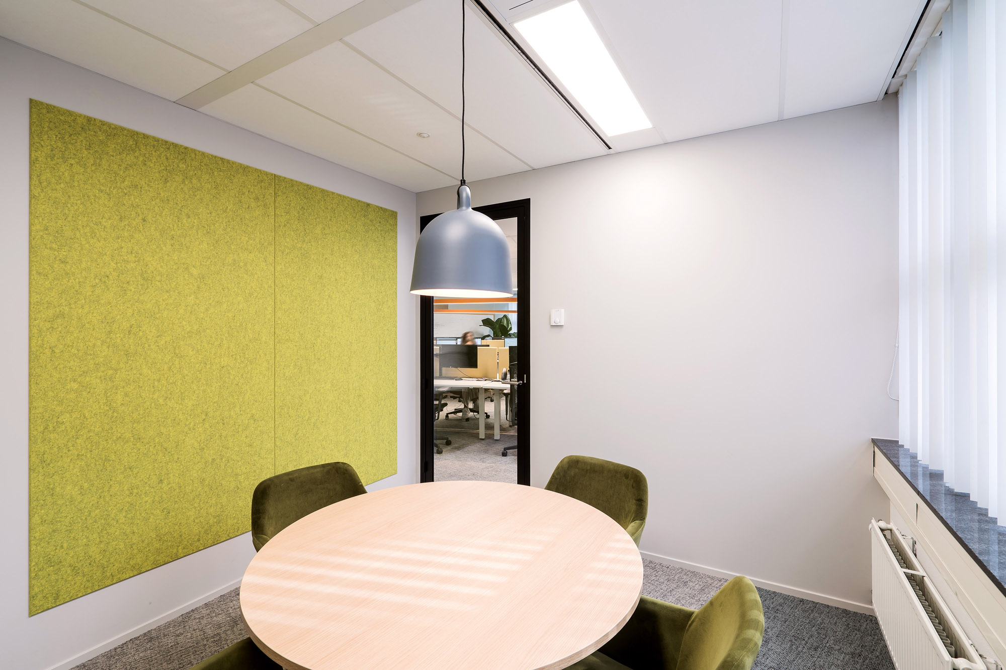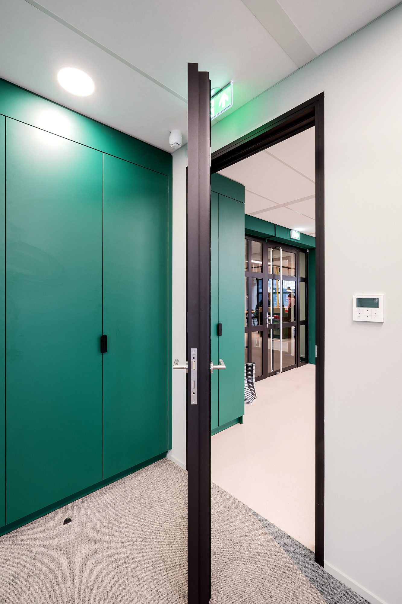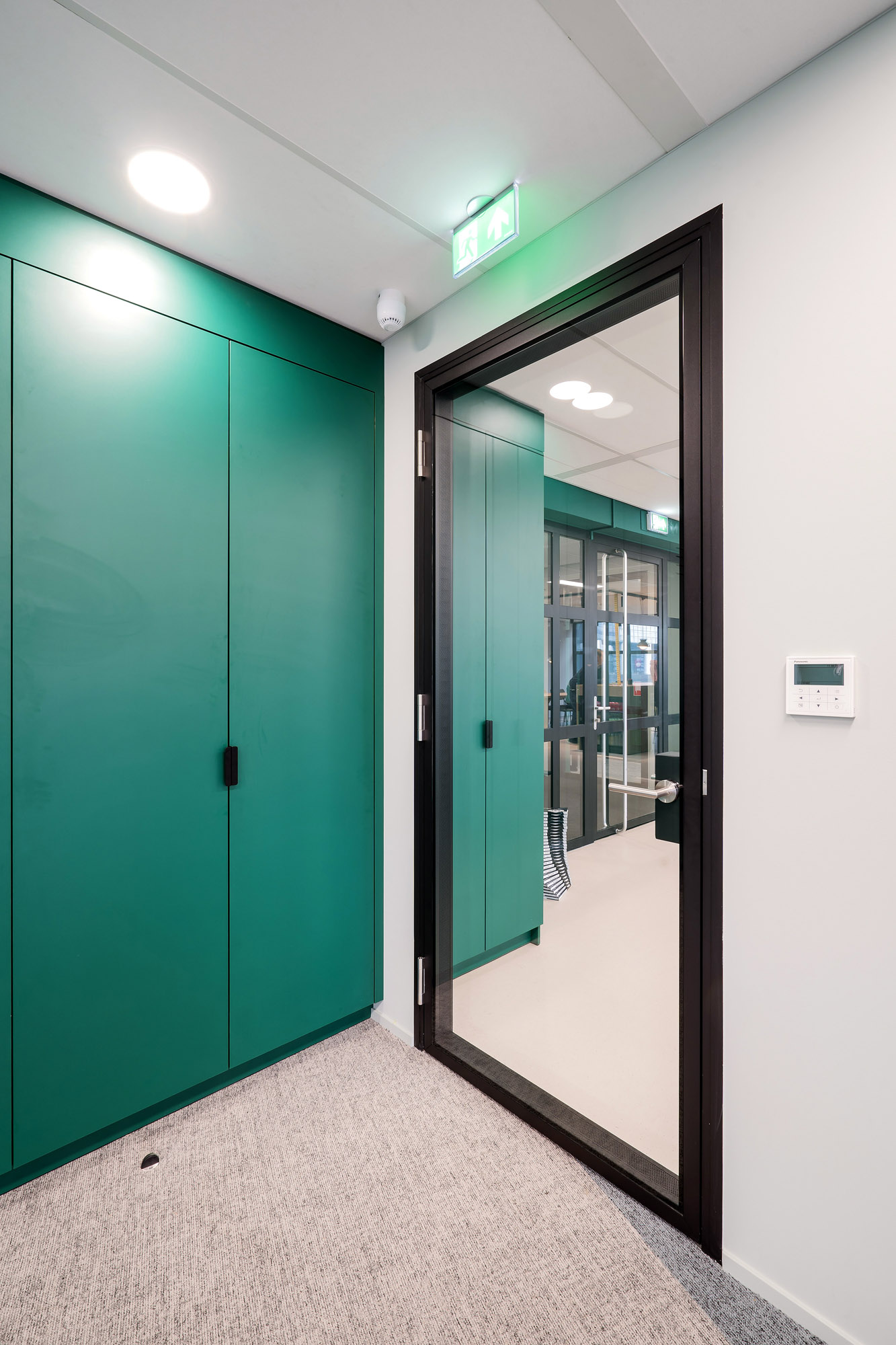 Het bestaande plafond is aangepast aan de nieuwe indeling. Een combinatie van metalstud, glazen systeemwanden en TWIN-wanden zorgen voor een efficiënte werk- en trainingsruimte. Door de 100mm glazen TWIN-deur blijft de connectie met kantoor behouden met een hoge geluidsisolatiewaarde om geen overlast te hebben tijdens de trainingen.