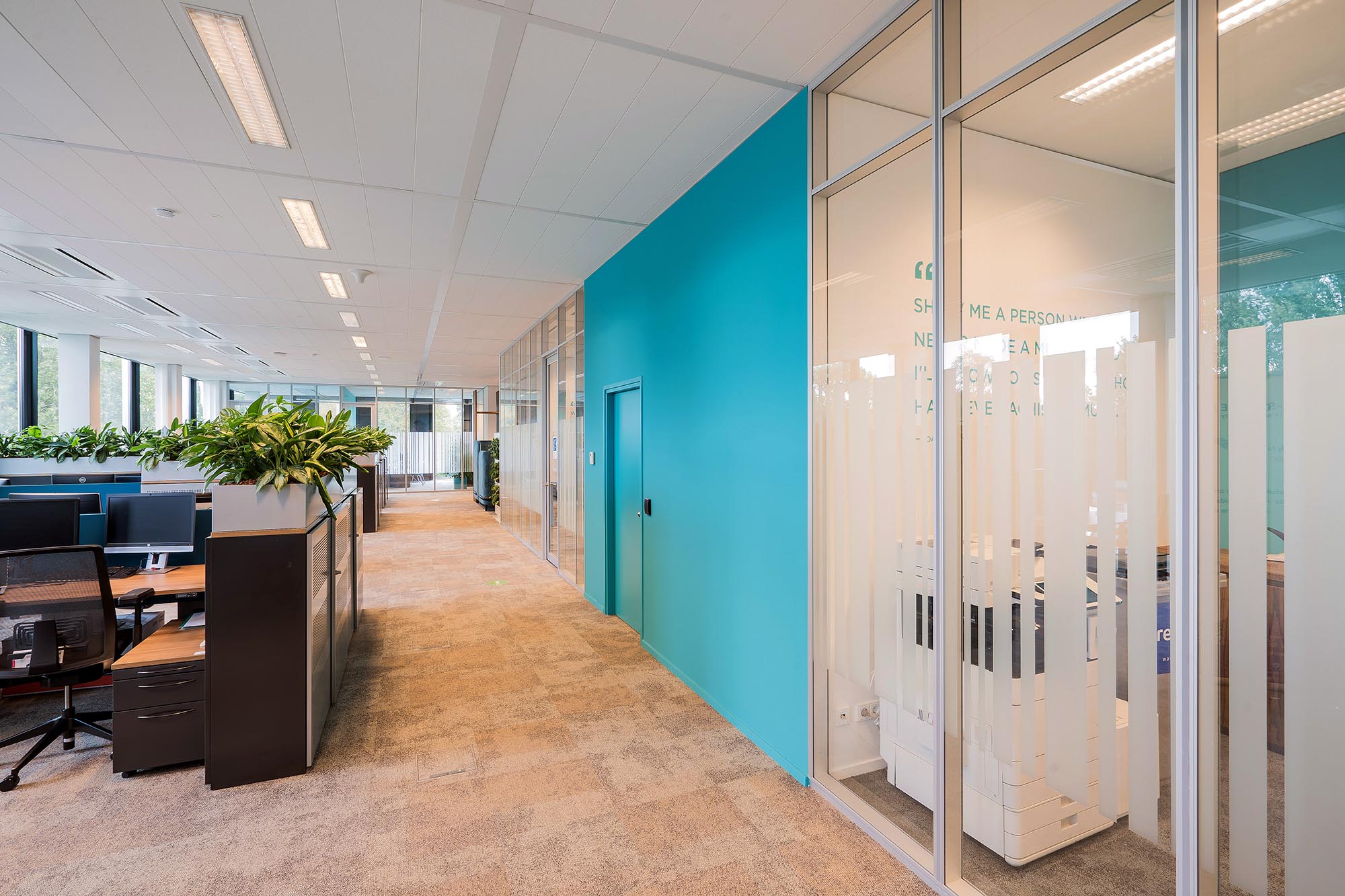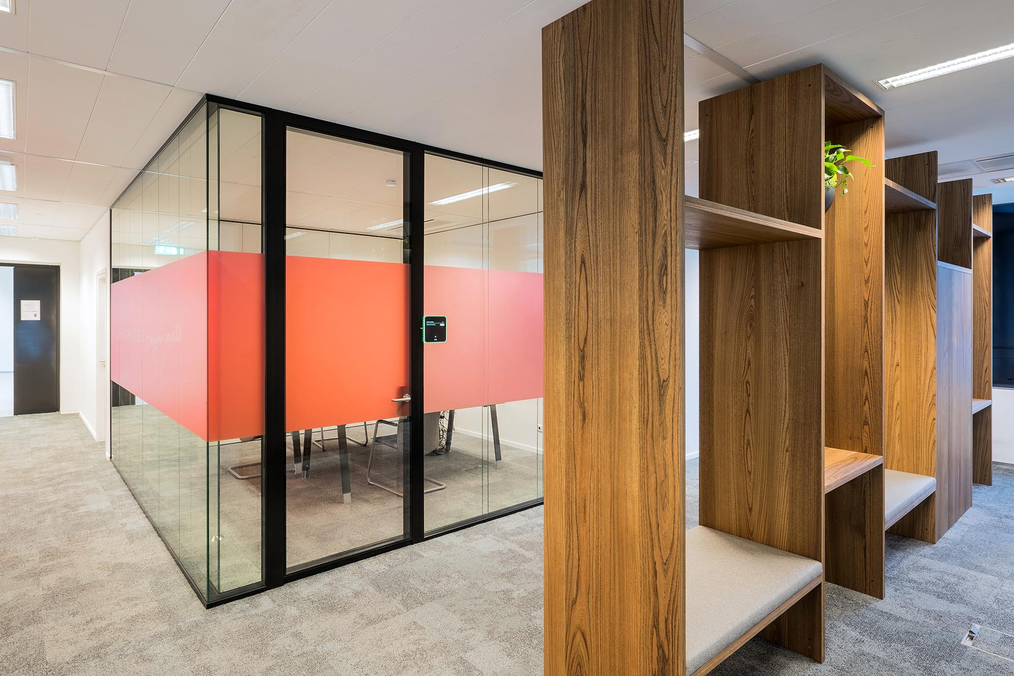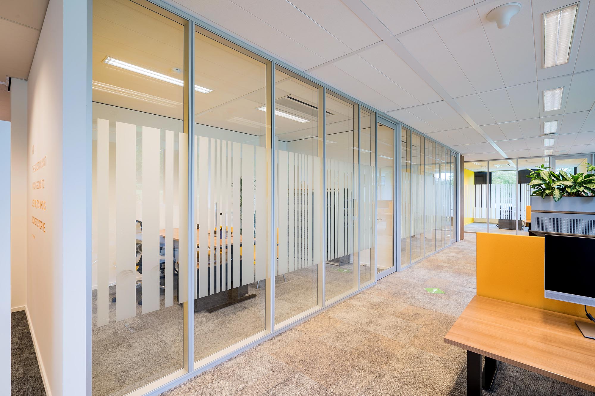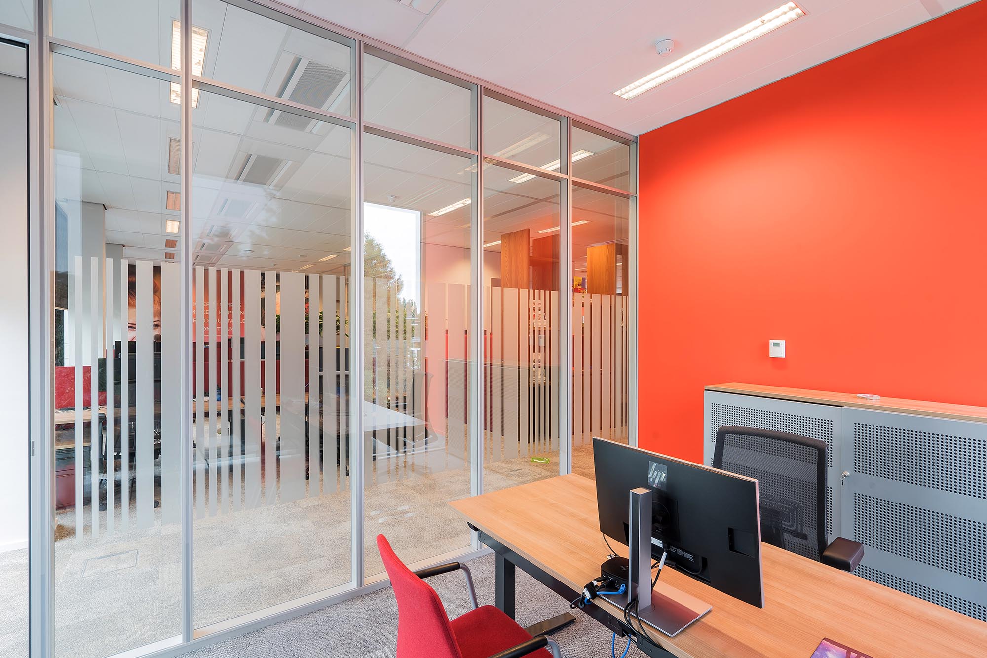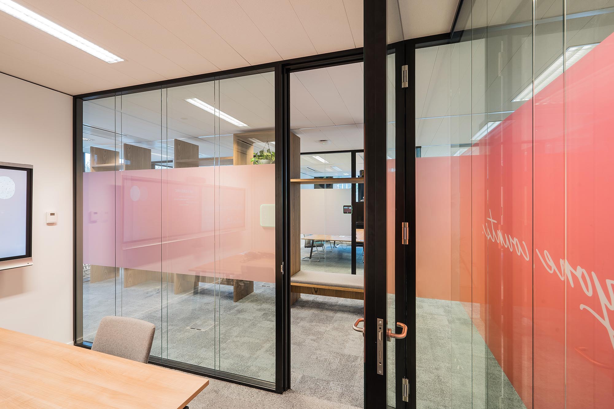 De bestaande glascassettes zijn hergebruikt waar mogelijk, en hebben aldus een 2e leven gekregen. De bestaande hardglazen deuren hebben wij vervangen door onze kaderdeuren met geïntegreerde valdorpels ten behoeve van een betere afdichting. Daarnaast hebben wij onze Twin-wanden met Flush kaderdeur toegepast voor de vergaderruimtes waarvoor een hogere geluidseis geldt. De gesloten binnenwanden zijn uitgevoerd als MS de Luxe, waarna deze naar wens naadloos zijn afgewerkt of voorzien van visuals.