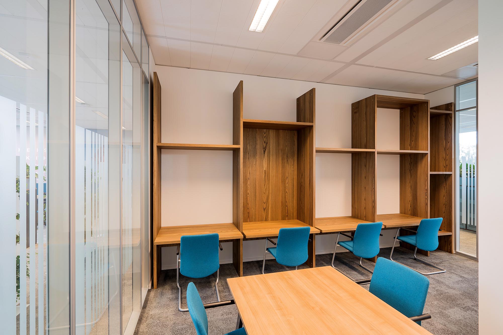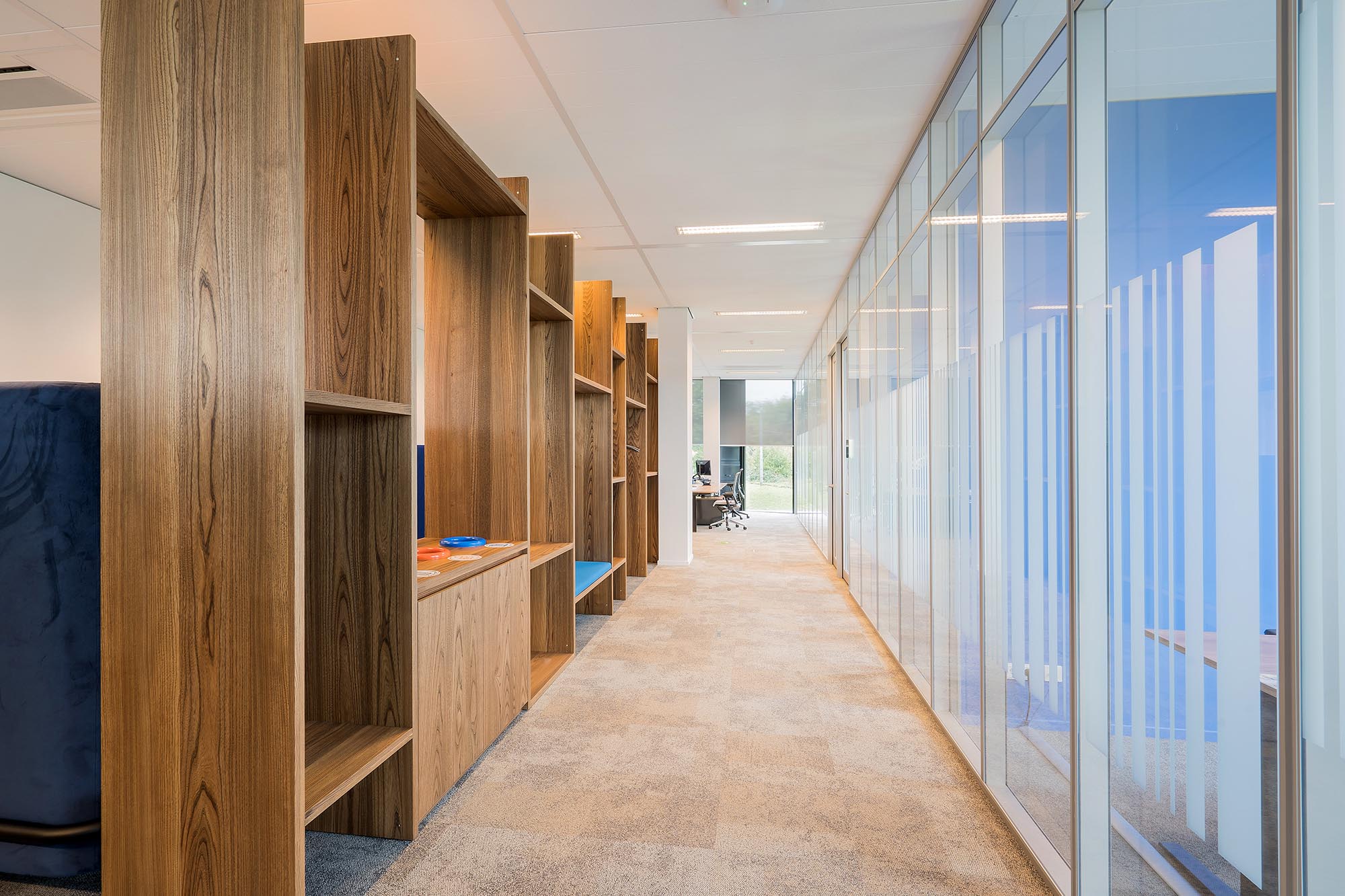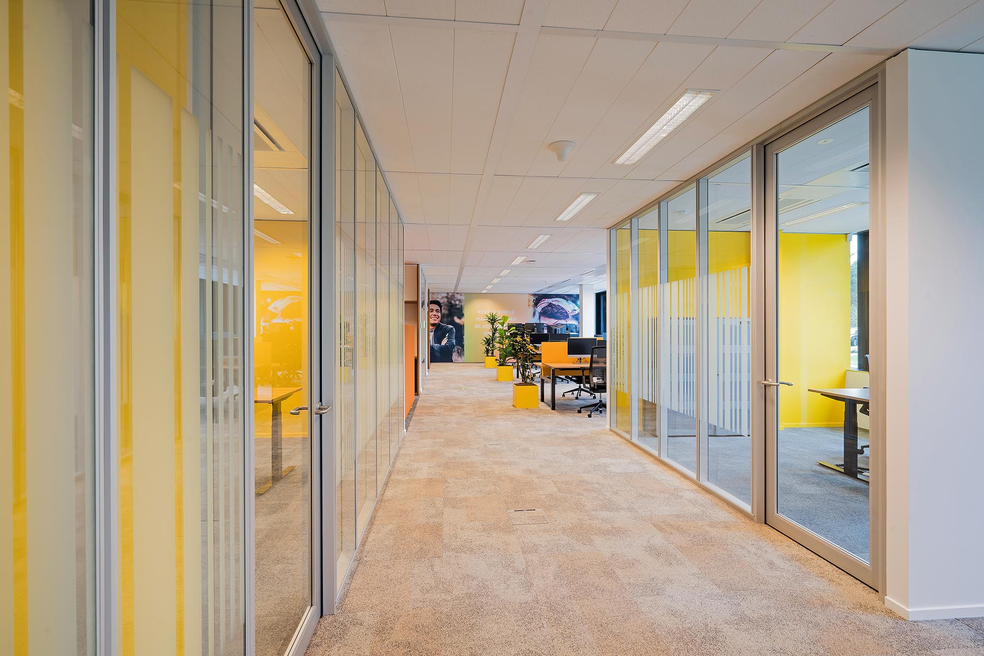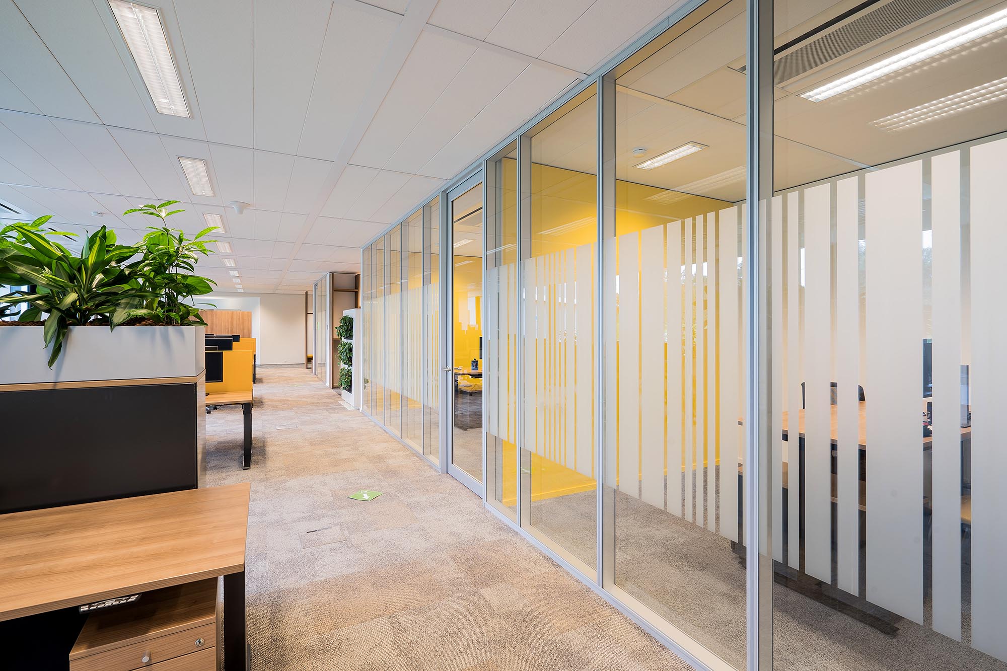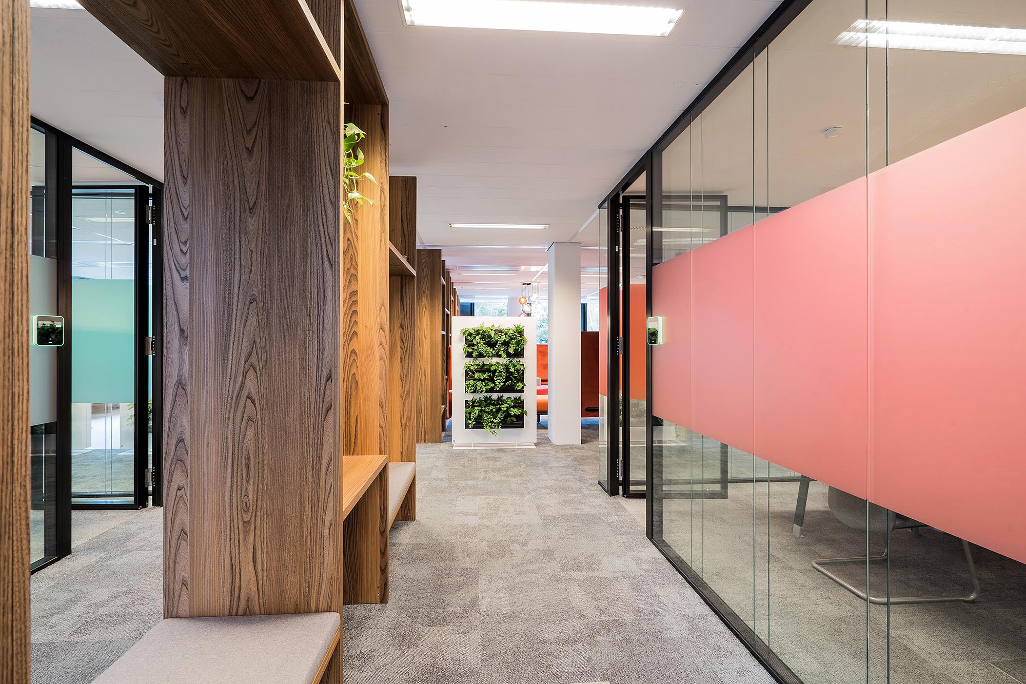 De bestaande glascassettes zijn hergebruikt waar mogelijk, en hebben aldus een 2e leven gekregen. De bestaande hardglazen deuren hebben wij vervangen door onze kaderdeuren met geïntegreerde valdorpels ten behoeve van een betere afdichting. Daarnaast hebben wij onze Twin-wanden met Flush kaderdeur toegepast voor de vergaderruimtes waarvoor een hogere geluidseis geldt. De gesloten binnenwanden zijn uitgevoerd als MS de Luxe, waarna deze naar wens naadloos zijn afgewerkt of voorzien van visuals.