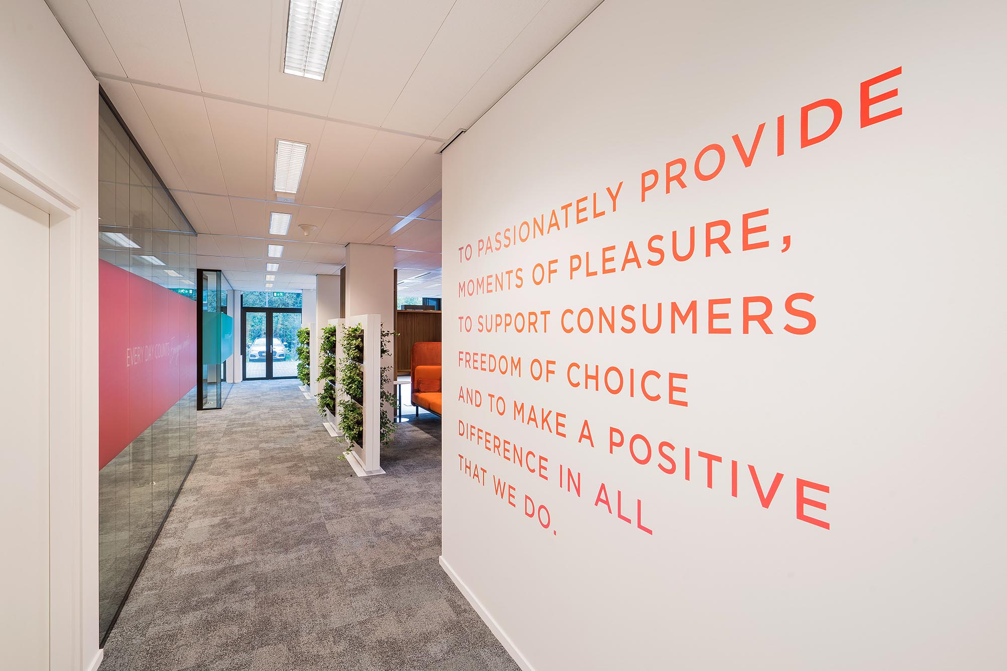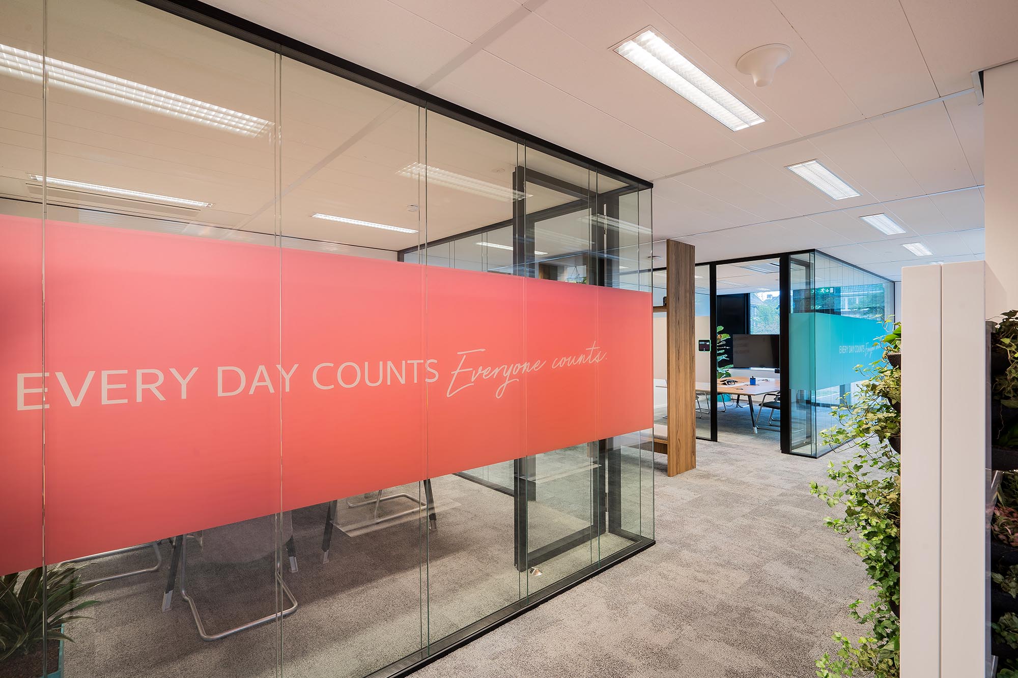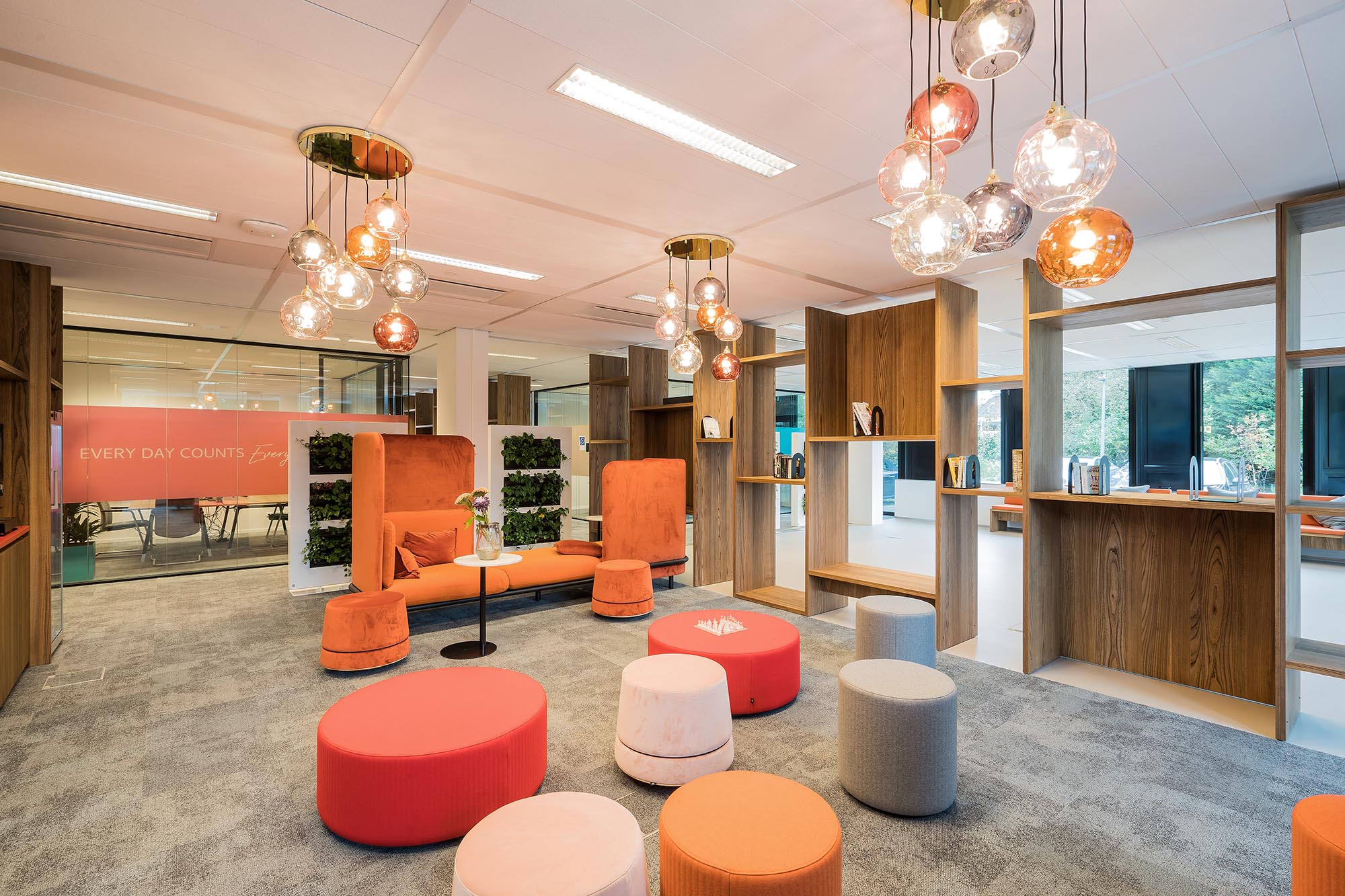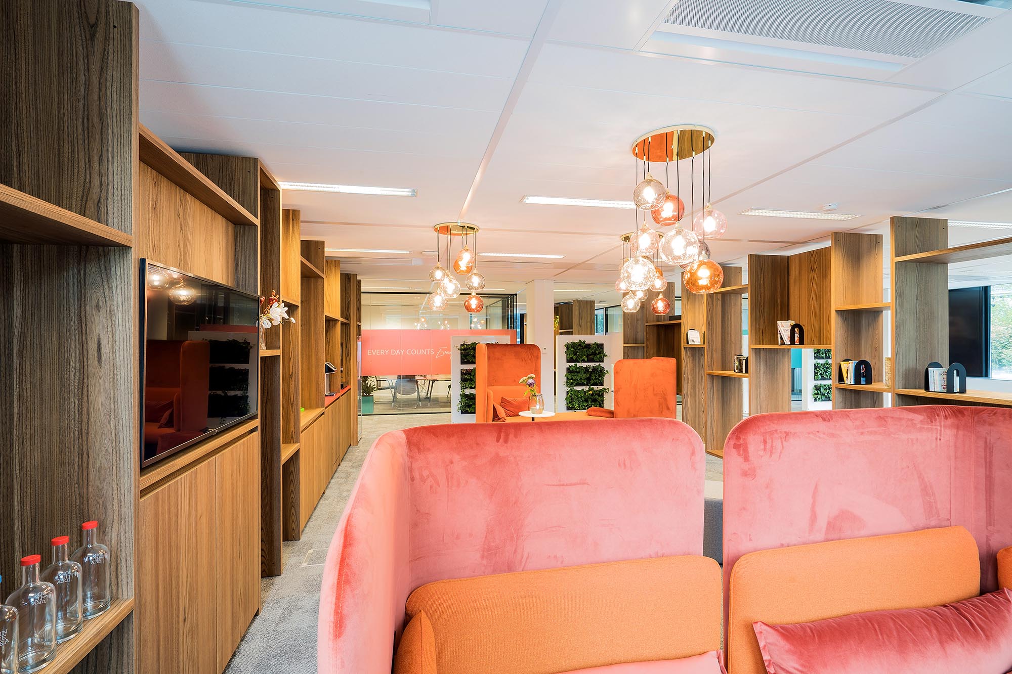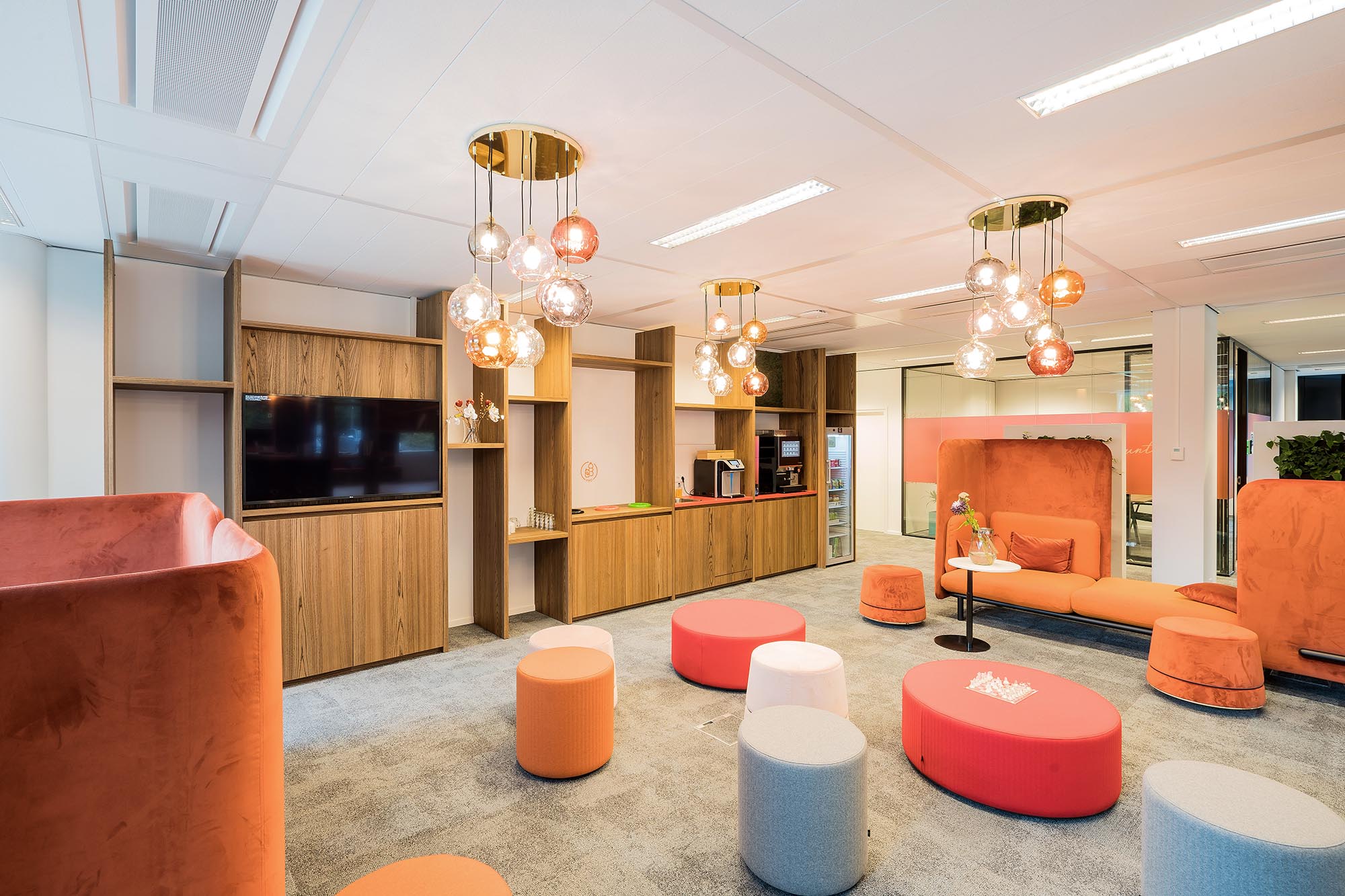 De bestaande glascassettes zijn hergebruikt waar mogelijk, en hebben aldus een 2e leven gekregen. De bestaande hardglazen deuren hebben wij vervangen door onze kaderdeuren met geïntegreerde valdorpels ten behoeve van een betere afdichting. Daarnaast hebben wij onze Twin-wanden met Flush kaderdeur toegepast voor de vergaderruimtes waarvoor een hogere geluidseis geldt. De gesloten binnenwanden zijn uitgevoerd als MS de Luxe, waarna deze naar wens naadloos zijn afgewerkt of voorzien van visuals.