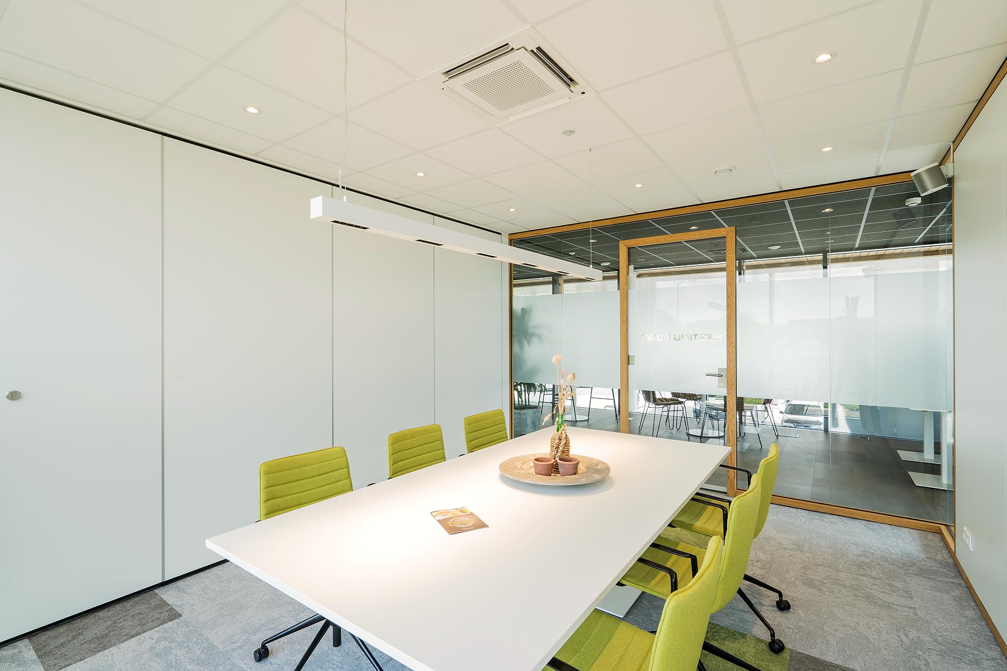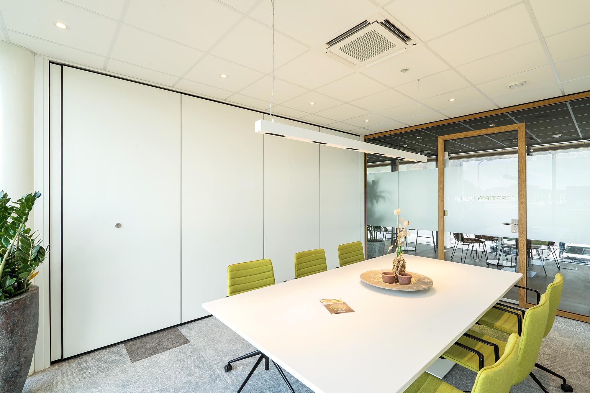 Met de mobiele paneelwand is er de mogelijkheid om van de twee spreekkamers één grote vergaderruimte te maken.