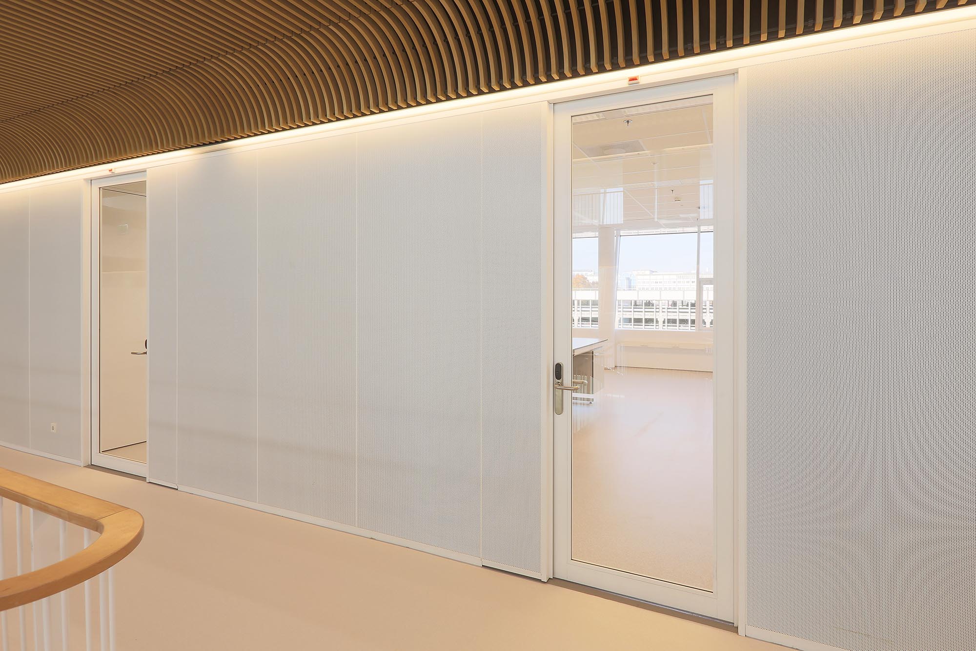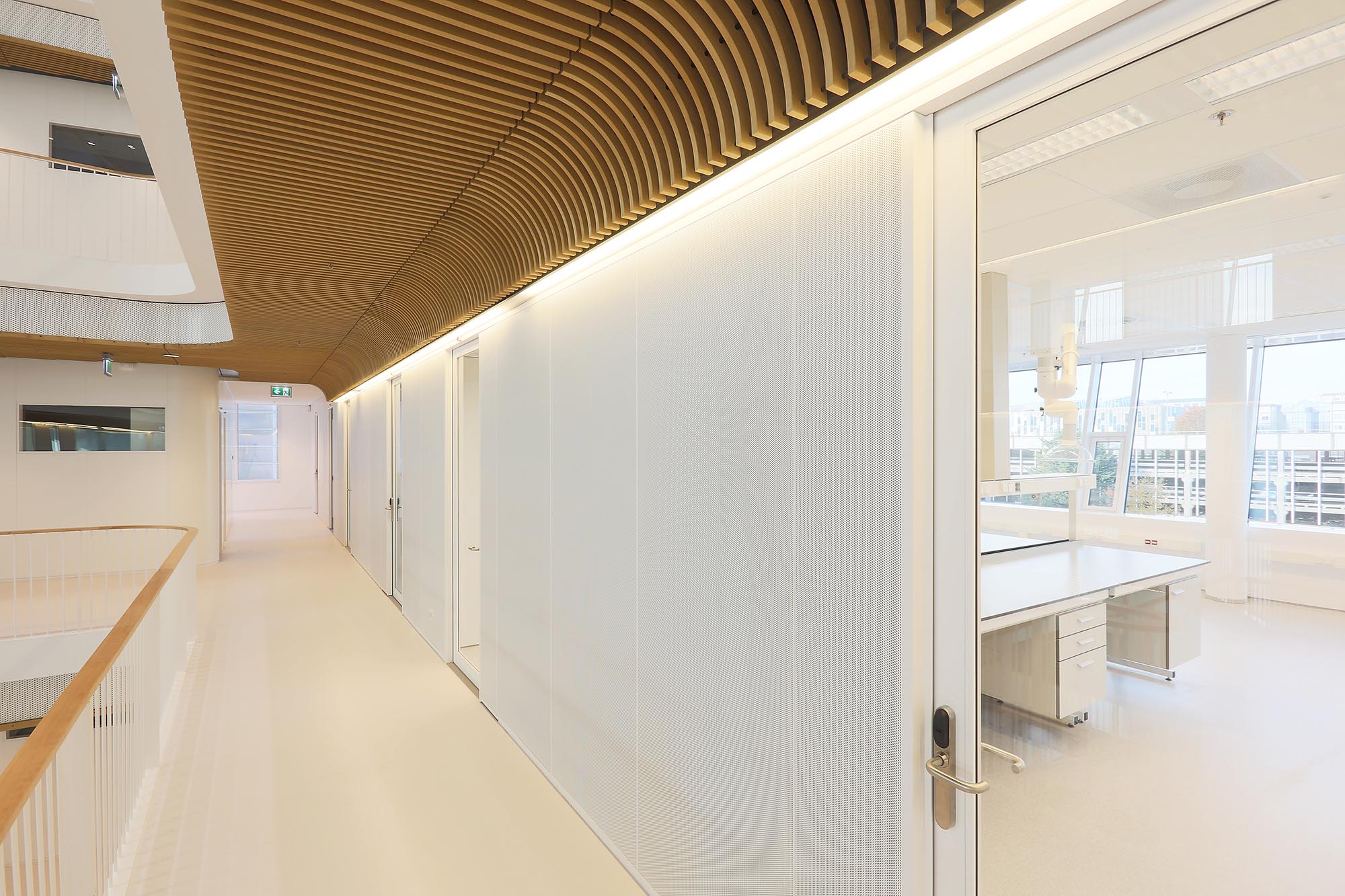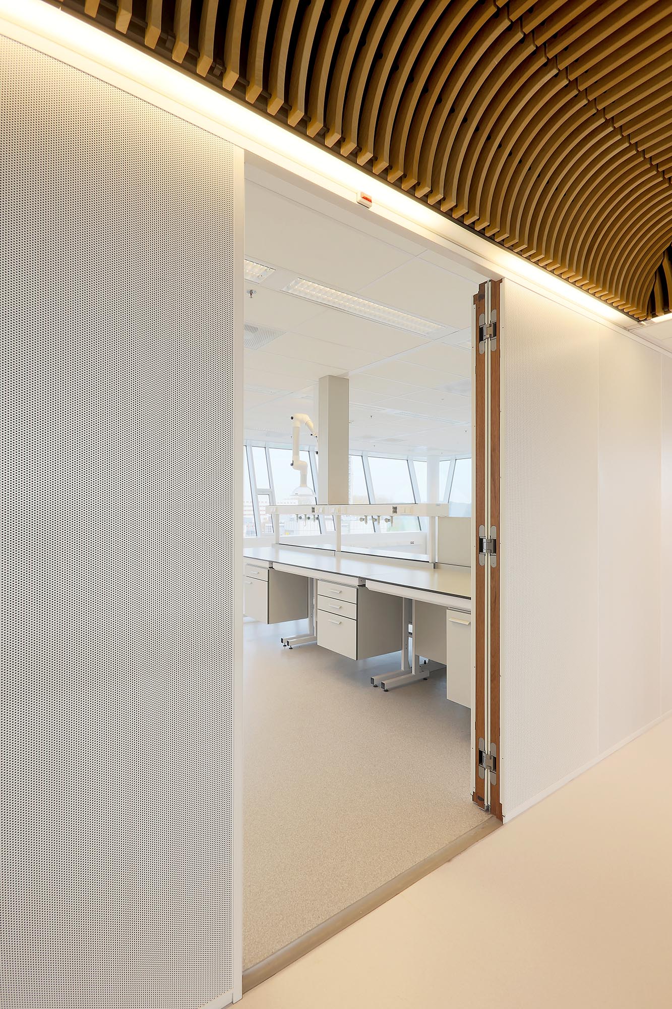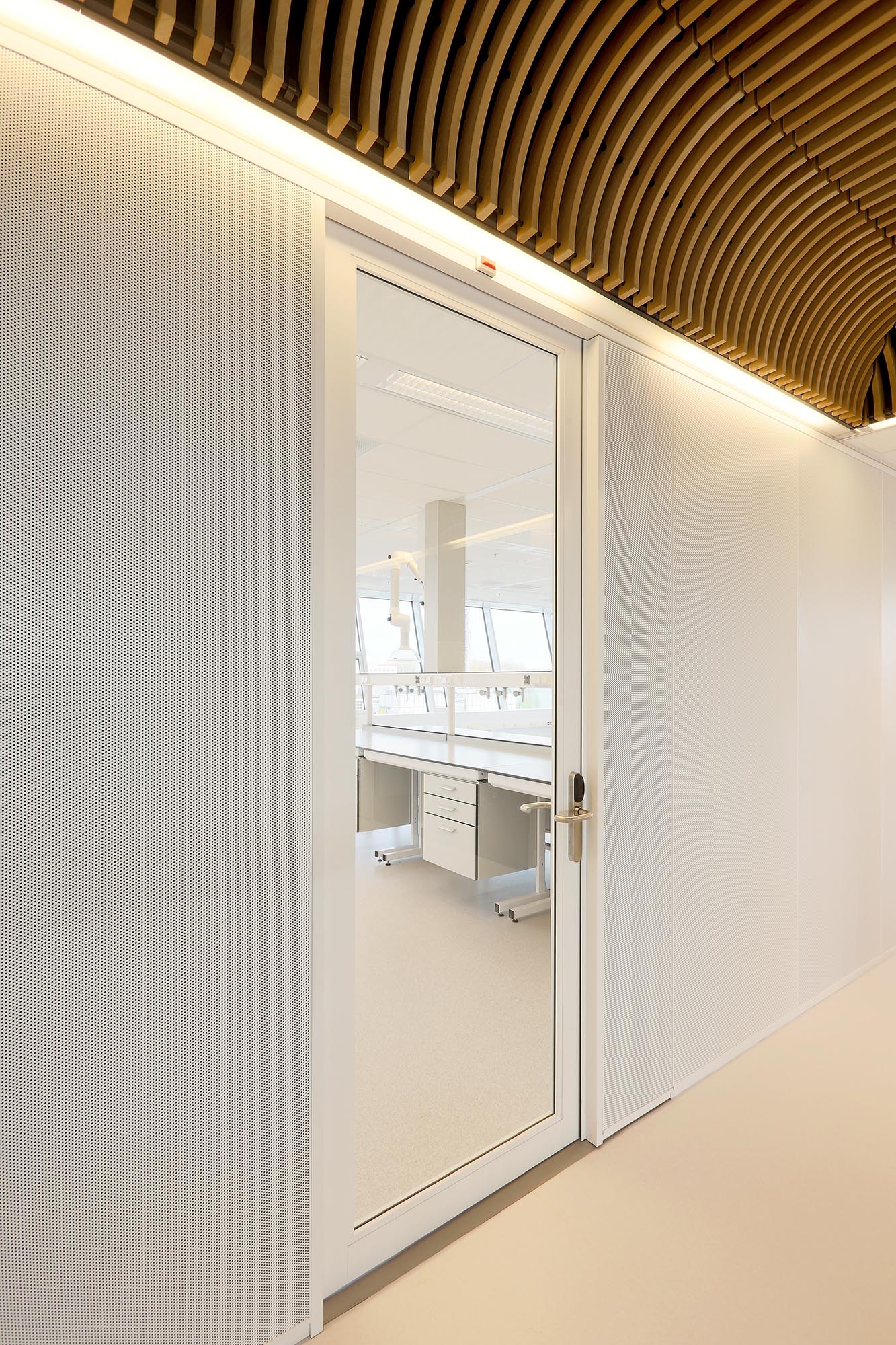 Aan de atriumzijde zijn onze systeemwanden volledig uitgevoerd met metalen geperforeerde akoestische wandpanelen. Op die manier hebben wij de geluidsbeheersing vanuit dit atrium kunnen realiseren. Voor de toegang tot de laboratoria hebben we onopvallende wanddelen scharnierend gemaakt. Zo kan bij interne verhuizingen een deel van de wand naast de aluminium kaderdeuren opengezet worden voor in- of uithuizing van laboratoria benodigdheden.