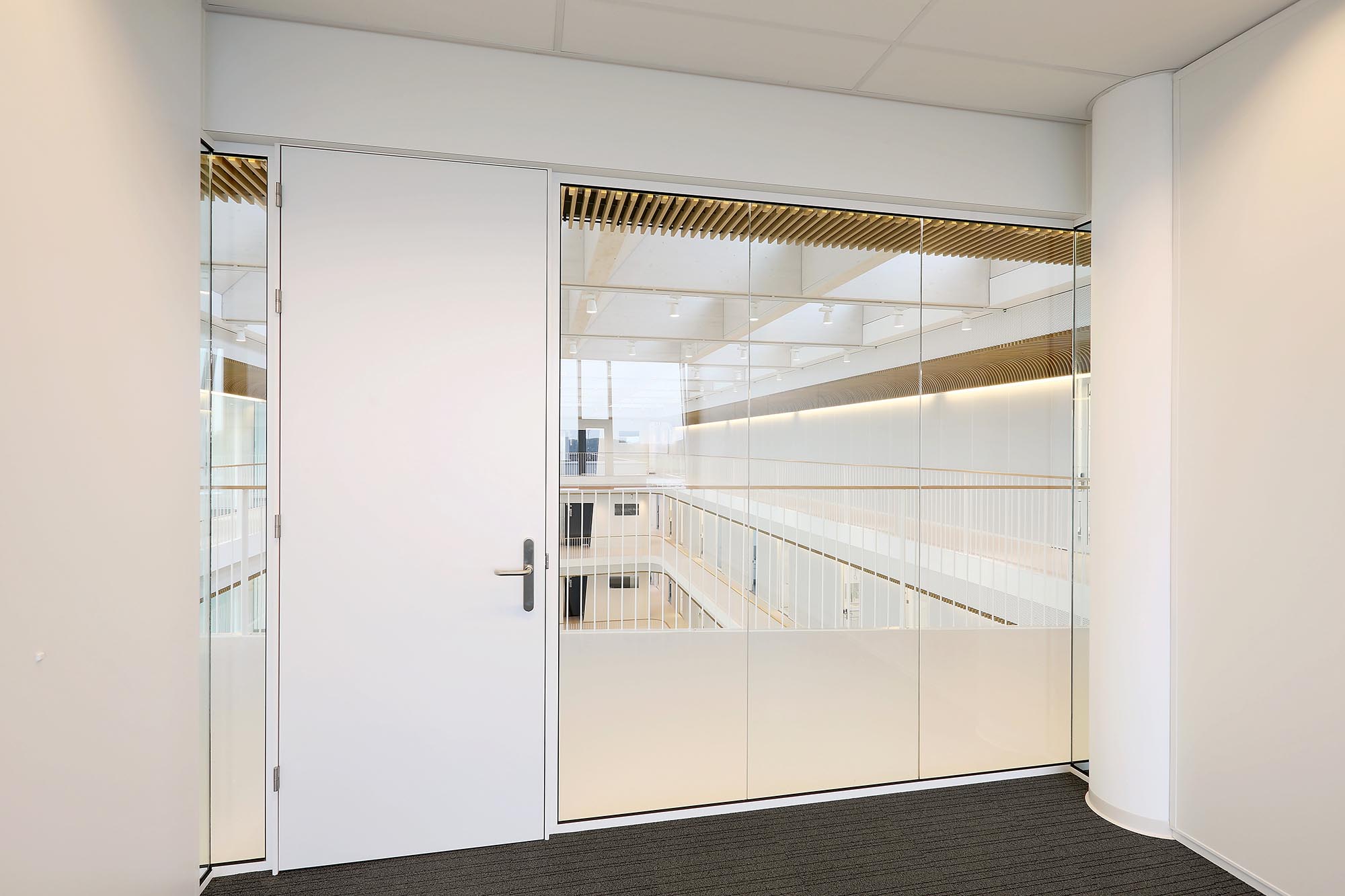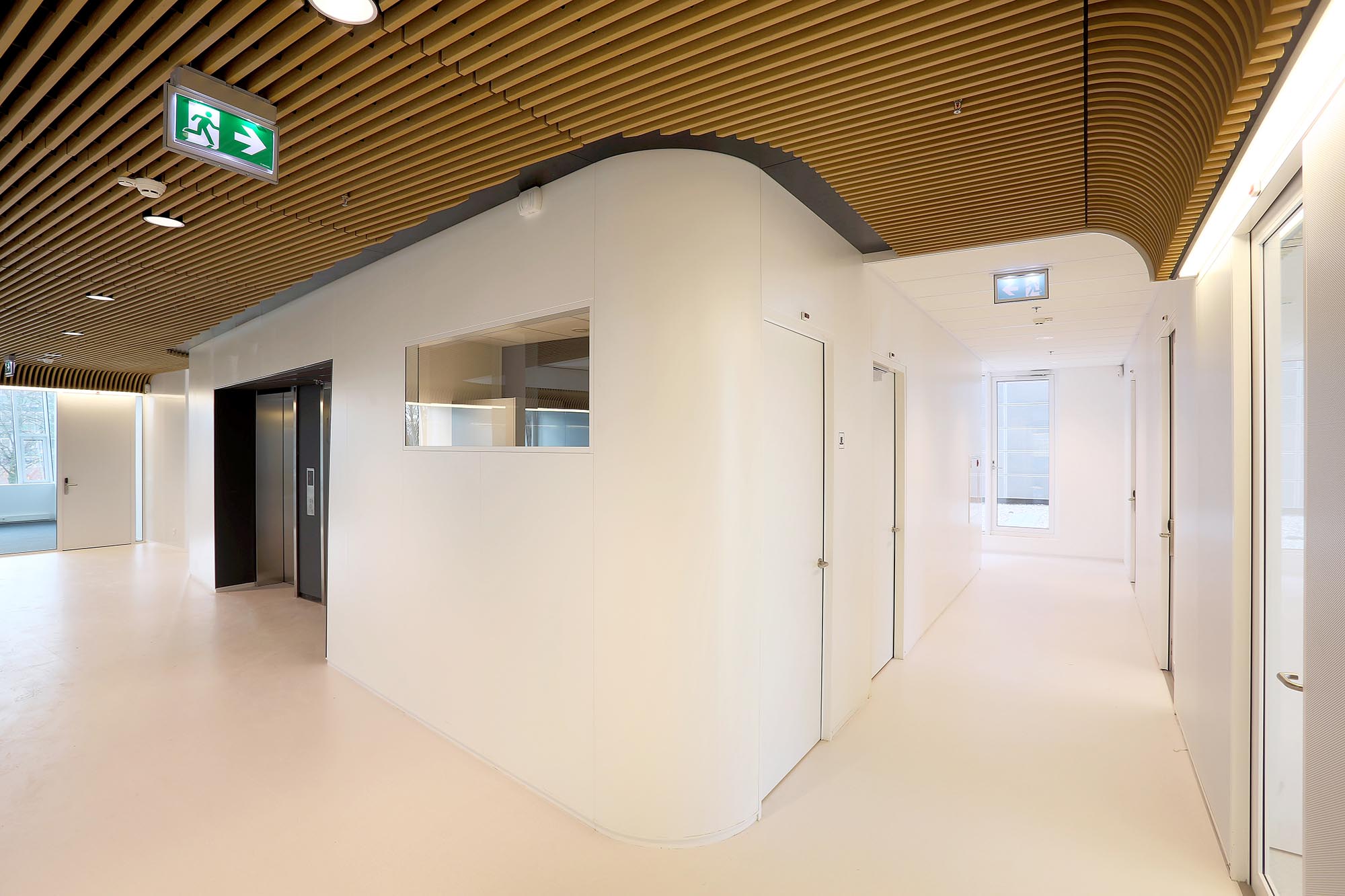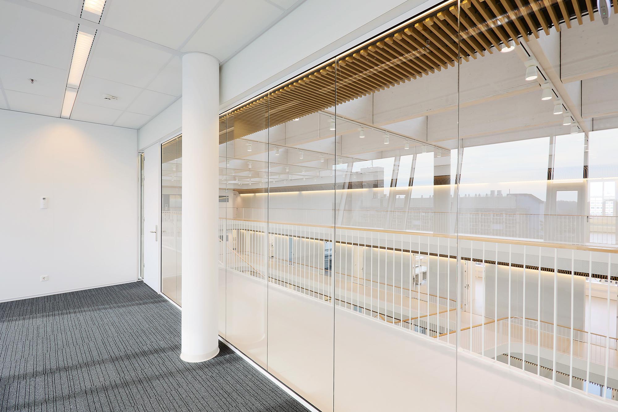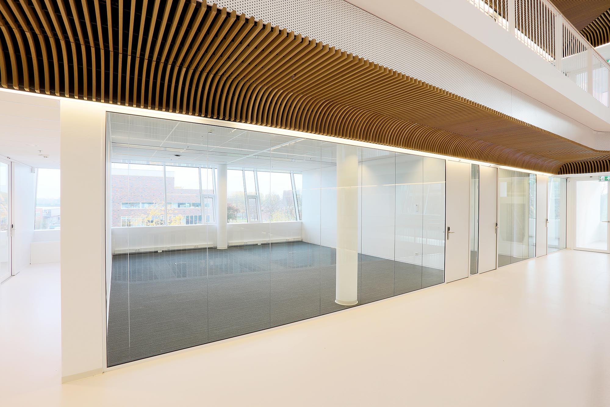 Aan de atriumzijde zijn onze systeemwanden volledig uitgevoerd met metalen geperforeerde akoestische wandpanelen. Op die manier hebben wij de geluidsbeheersing vanuit dit atrium kunnen realiseren. Voor de toegang tot de laboratoria hebben we onopvallende wanddelen scharnierend gemaakt. Zo kan bij interne verhuizingen een deel van de wand naast de aluminium kaderdeuren opengezet worden voor in- of uithuizing van laboratoria benodigdheden.