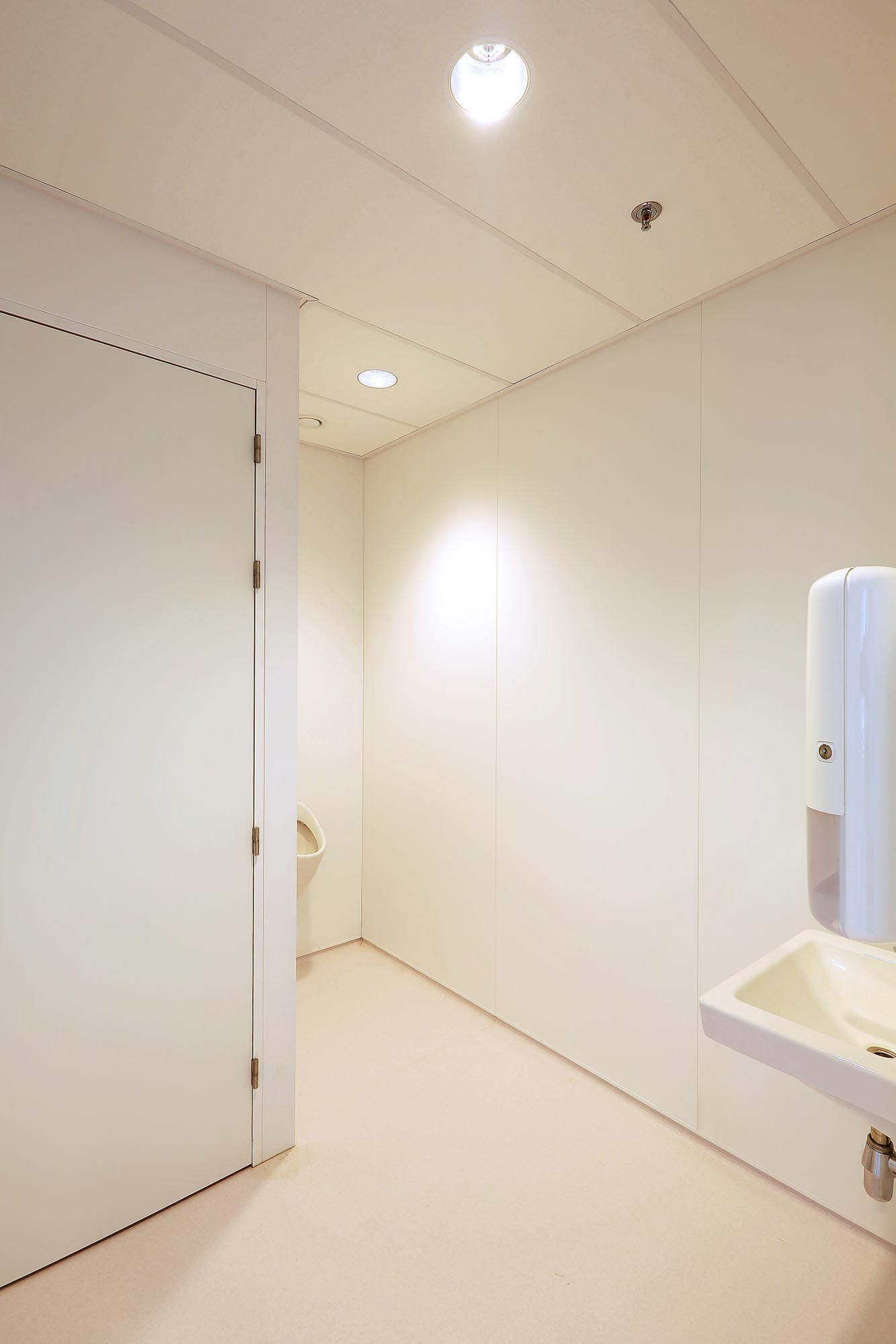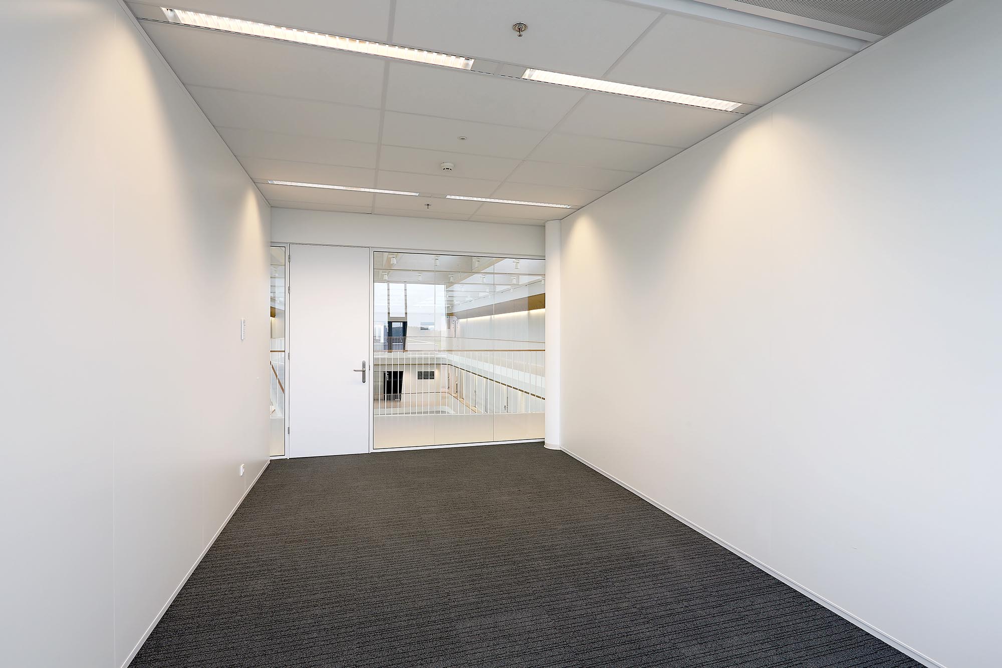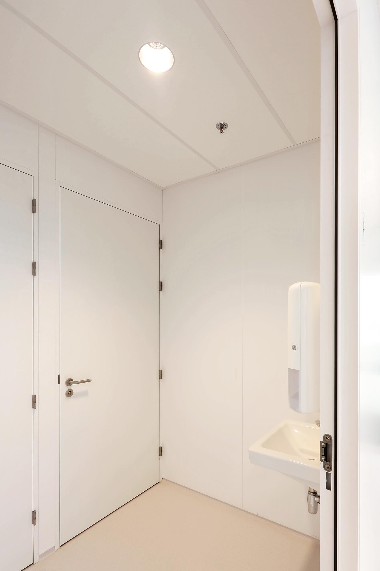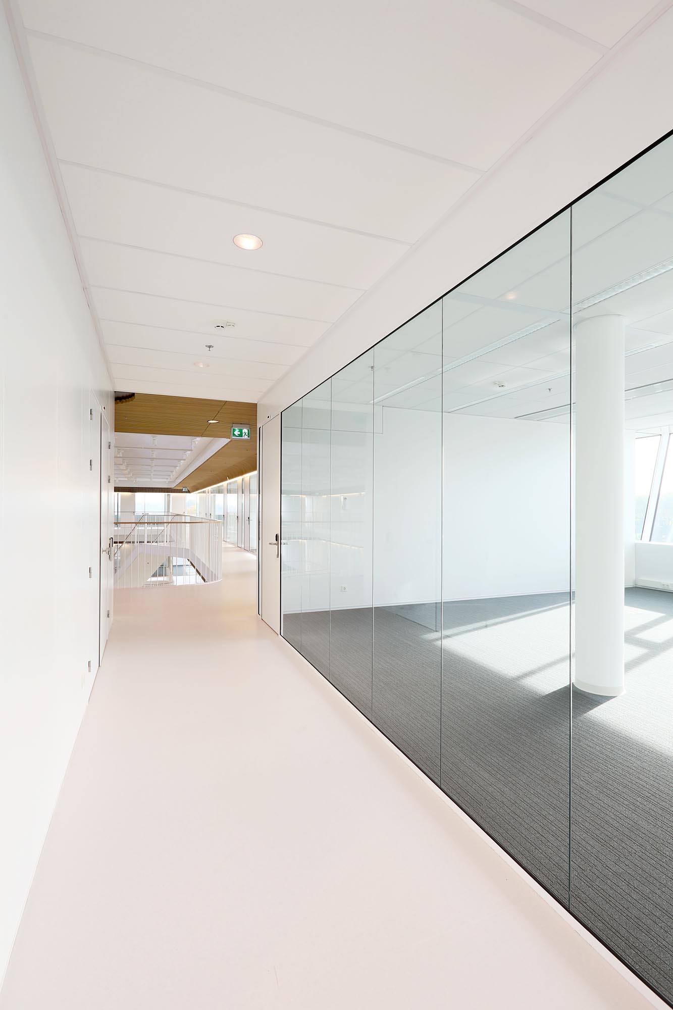 Aan de atriumzijde zijn onze systeemwanden volledig uitgevoerd met metalen geperforeerde akoestische wandpanelen. Op die manier hebben wij de geluidsbeheersing vanuit dit atrium kunnen realiseren. Voor de toegang tot de laboratoria hebben we onopvallende wanddelen scharnierend gemaakt. Zo kan bij interne verhuizingen een deel van de wand naast de aluminium kaderdeuren opengezet worden voor in- of uithuizing van laboratoria benodigdheden.