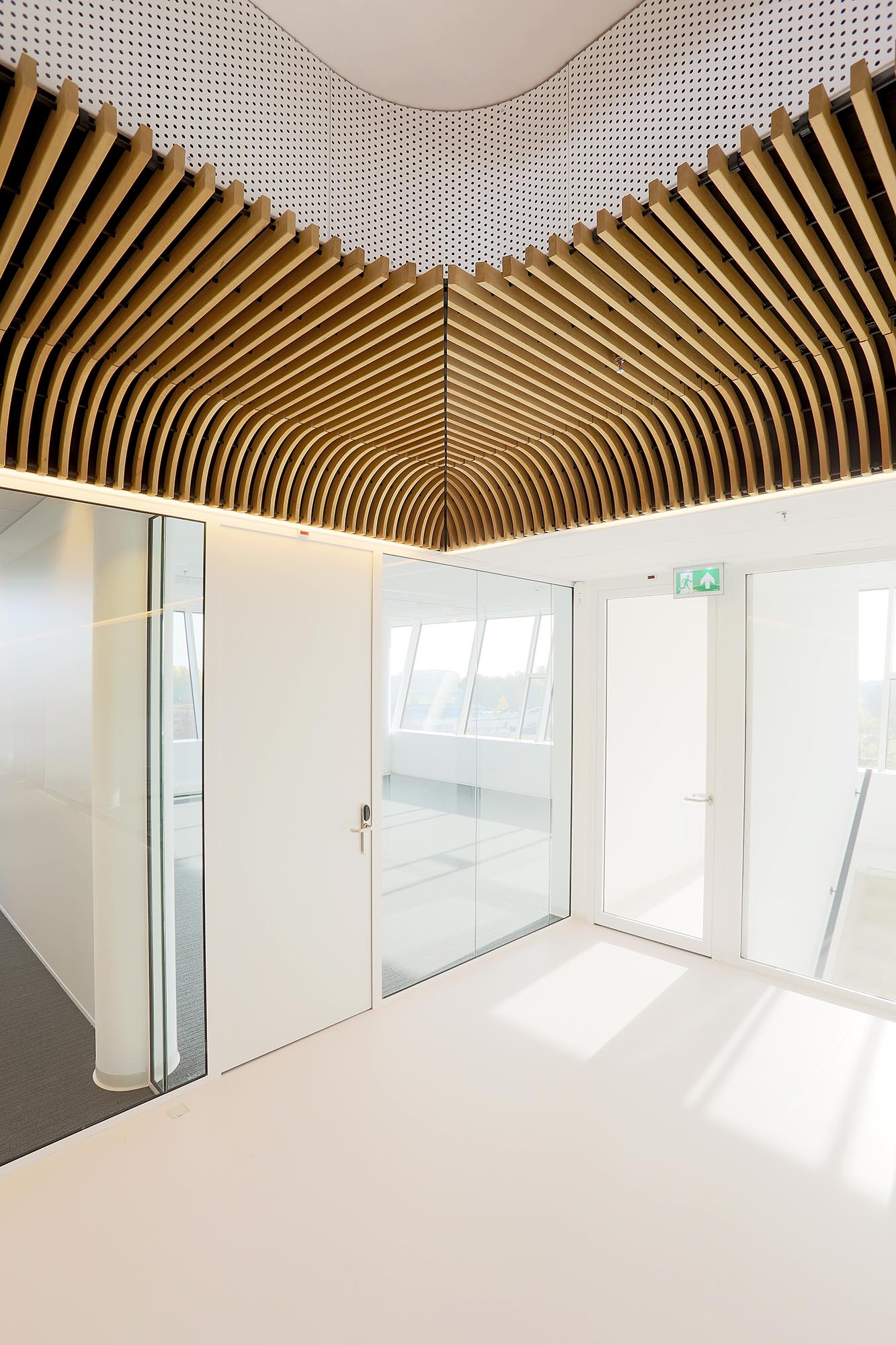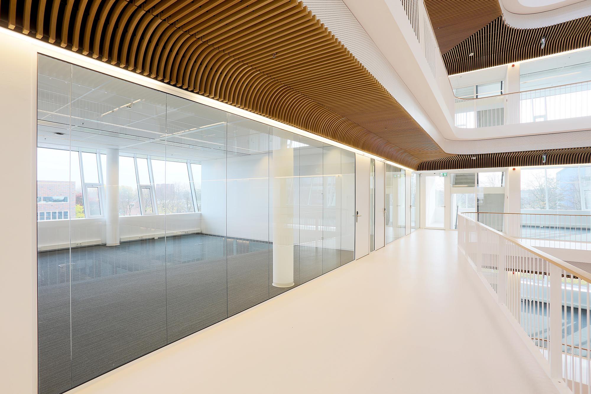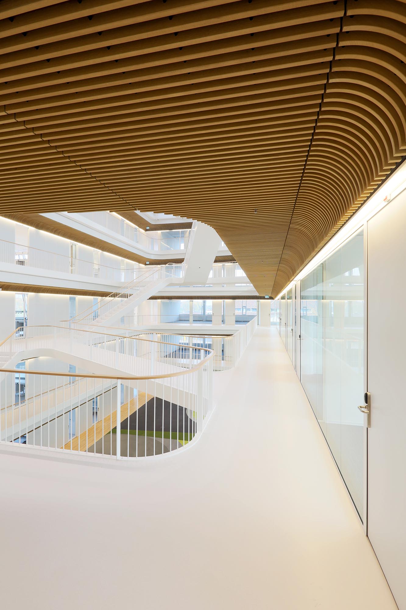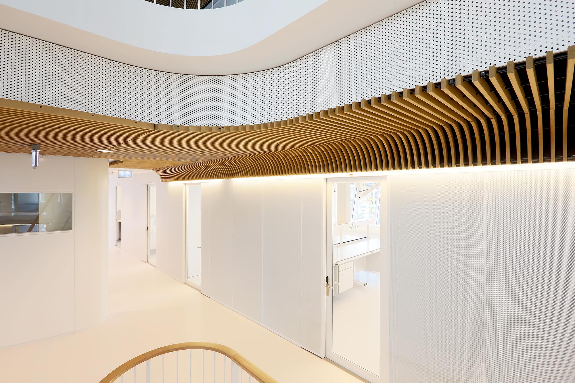 Het gebouw heeft van binnen een unieke uitstraling gekregen door de toepassing van enkele slim gekozen plafondsystemen. In alle gangen aan de atriumzijde is er, samen met Derako, voor Solid Wood Systems gekozen voor het Grill plafondsysteem. Dit systeem, voorzien van akoestische isolatie, heeft de juiste uitstraling voor het ontwerp met de gebogen delen. Het is volledig demontabel voor de bereikbaarheid van de techniek.