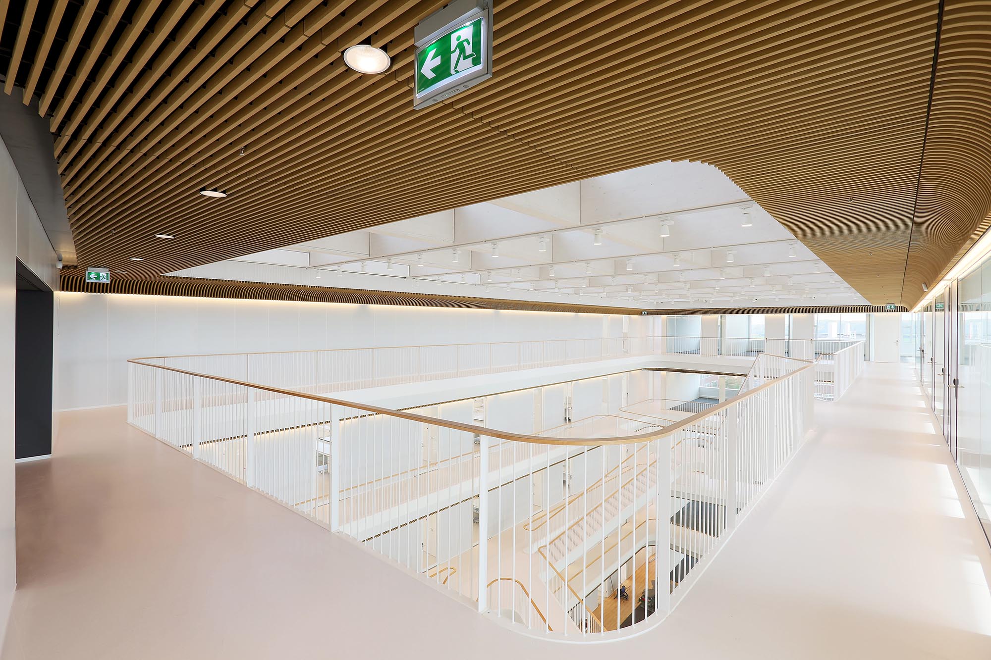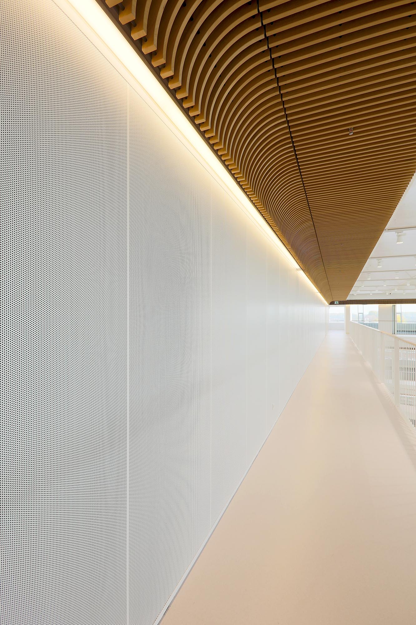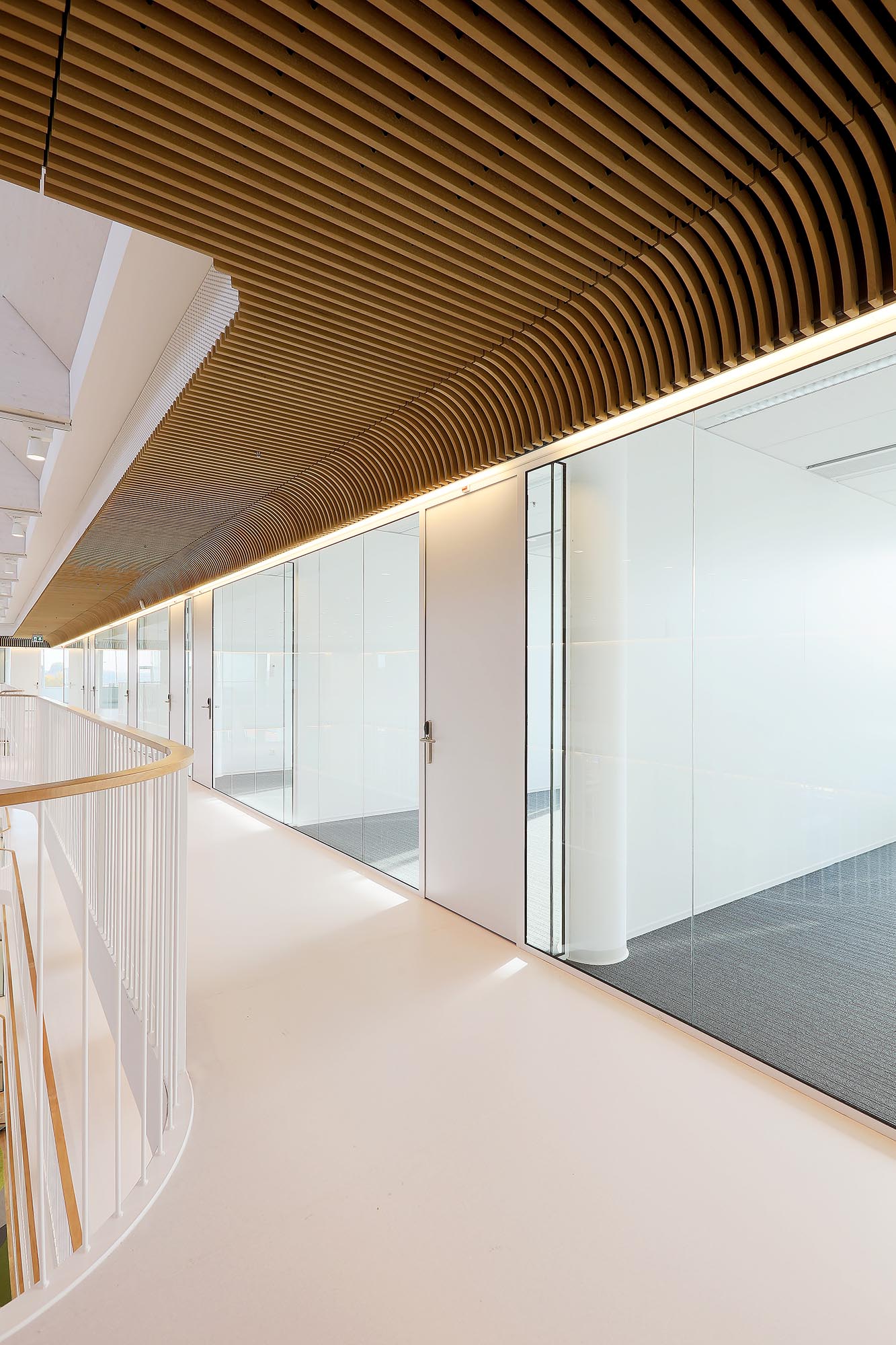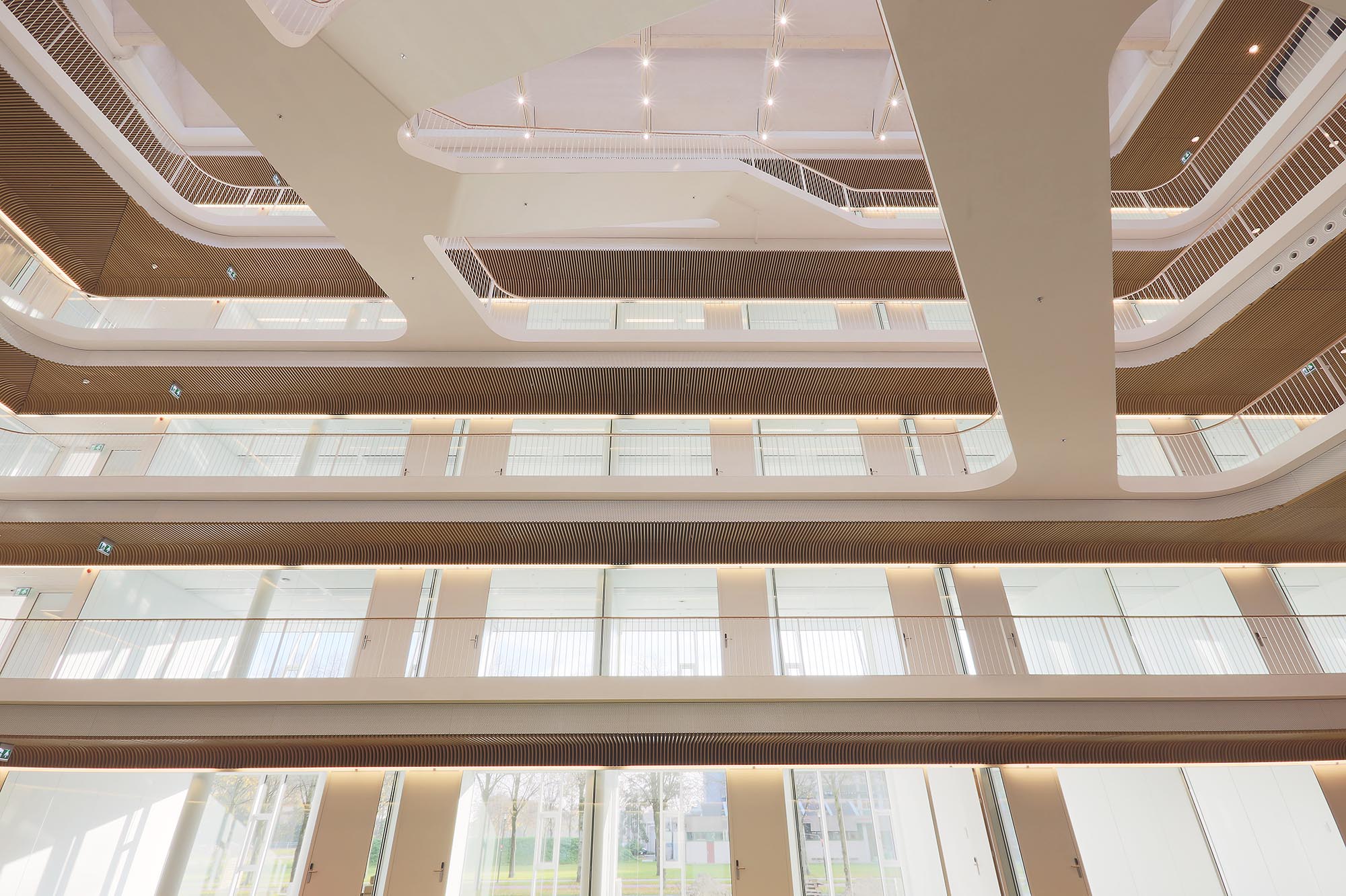 Het gebouw heeft van binnen een unieke uitstraling gekregen door de toepassing van enkele slim gekozen plafondsystemen. In alle gangen aan de atriumzijde is er, samen met Derako, voor Solid Wood Systems gekozen voor het Grill plafondsysteem. Dit systeem, voorzien van akoestische isolatie, heeft de juiste uitstraling voor het ontwerp met de gebogen delen. Het is volledig demontabel voor de bereikbaarheid van de techniek.