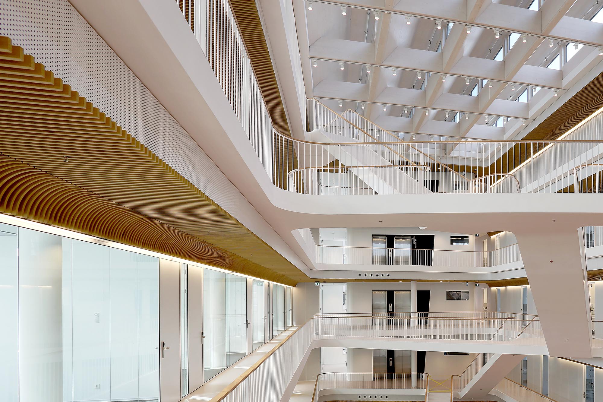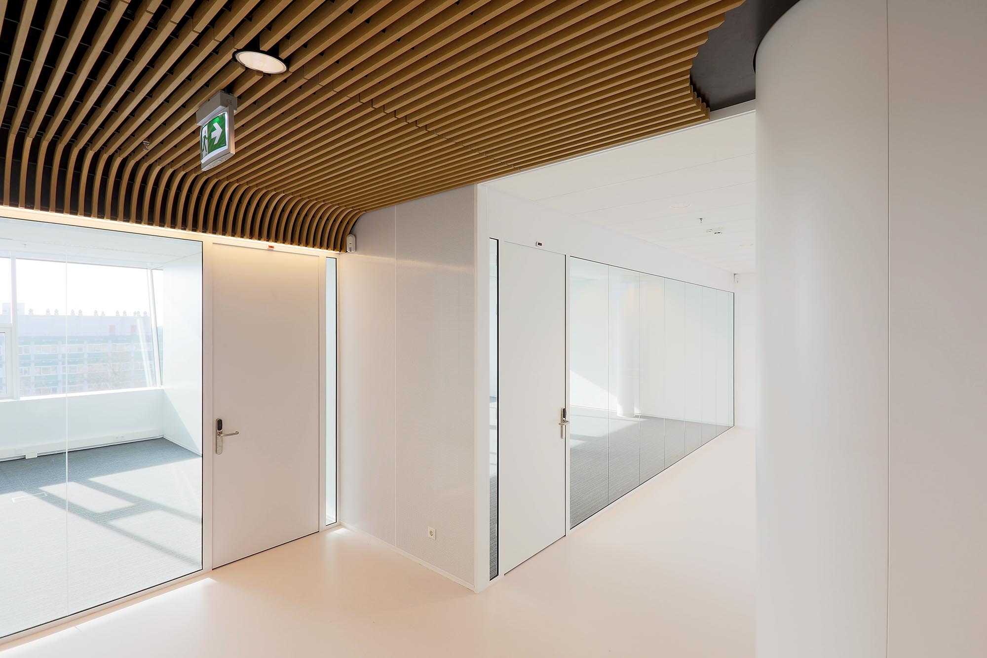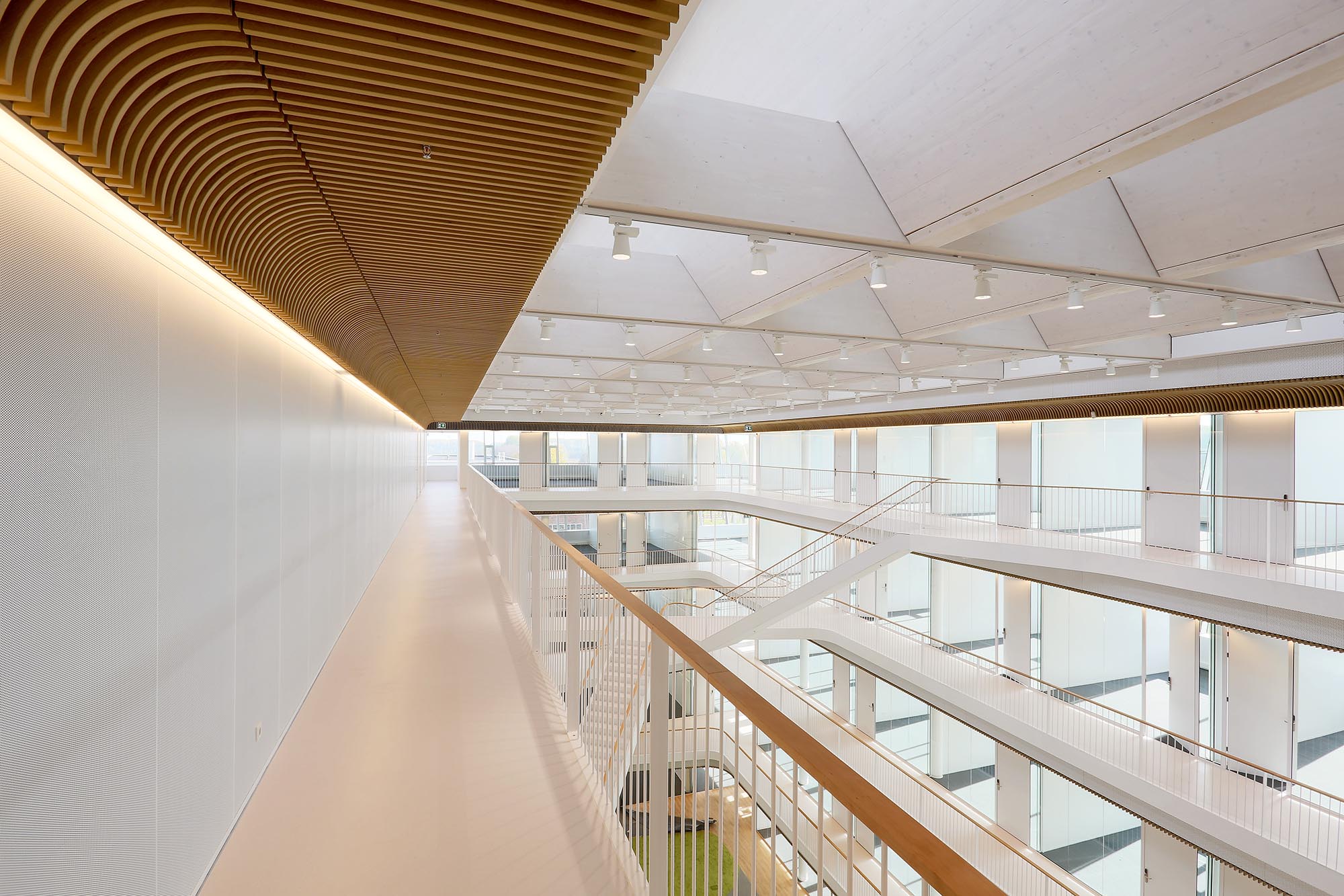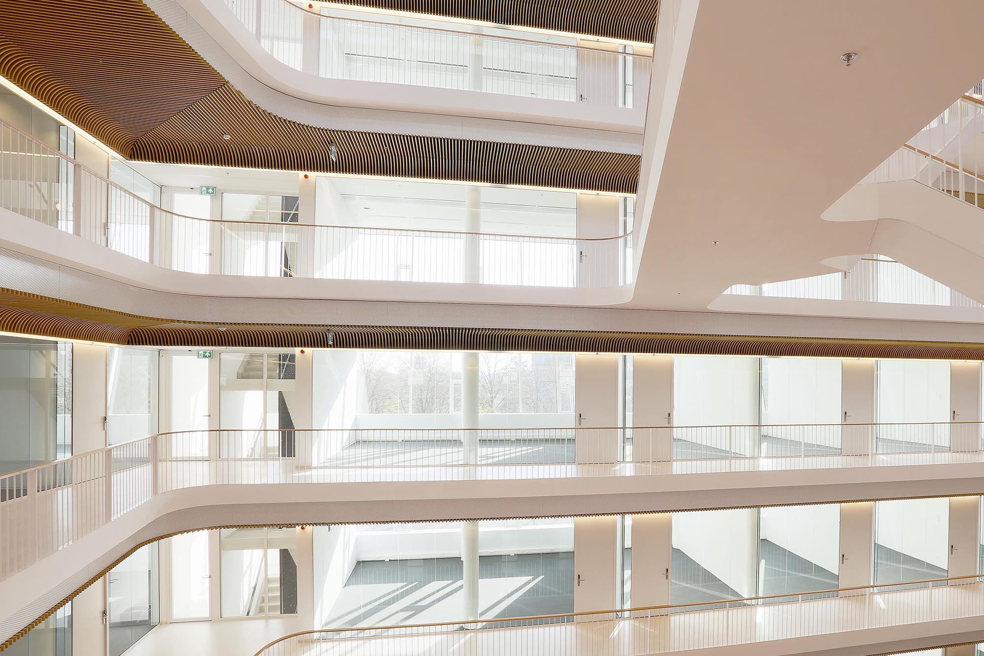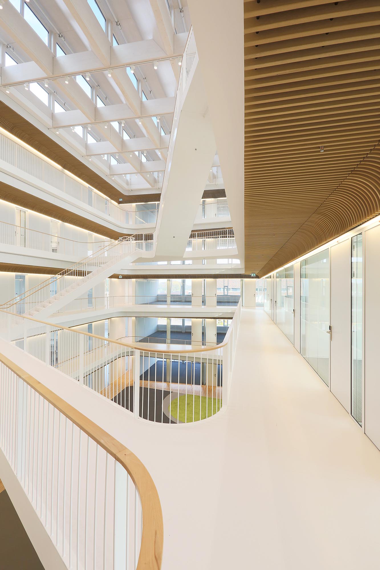 Het gebouw heeft van binnen een unieke uitstraling gekregen door de toepassing van enkele slim gekozen plafondsystemen. In alle gangen aan de atriumzijde is er, samen met Derako, voor Solid Wood Systems gekozen voor het Grill plafondsysteem. Dit systeem, voorzien van akoestische isolatie, heeft de juiste uitstraling voor het ontwerp met de gebogen delen. Het is volledig demontabel voor de bereikbaarheid van de techniek.