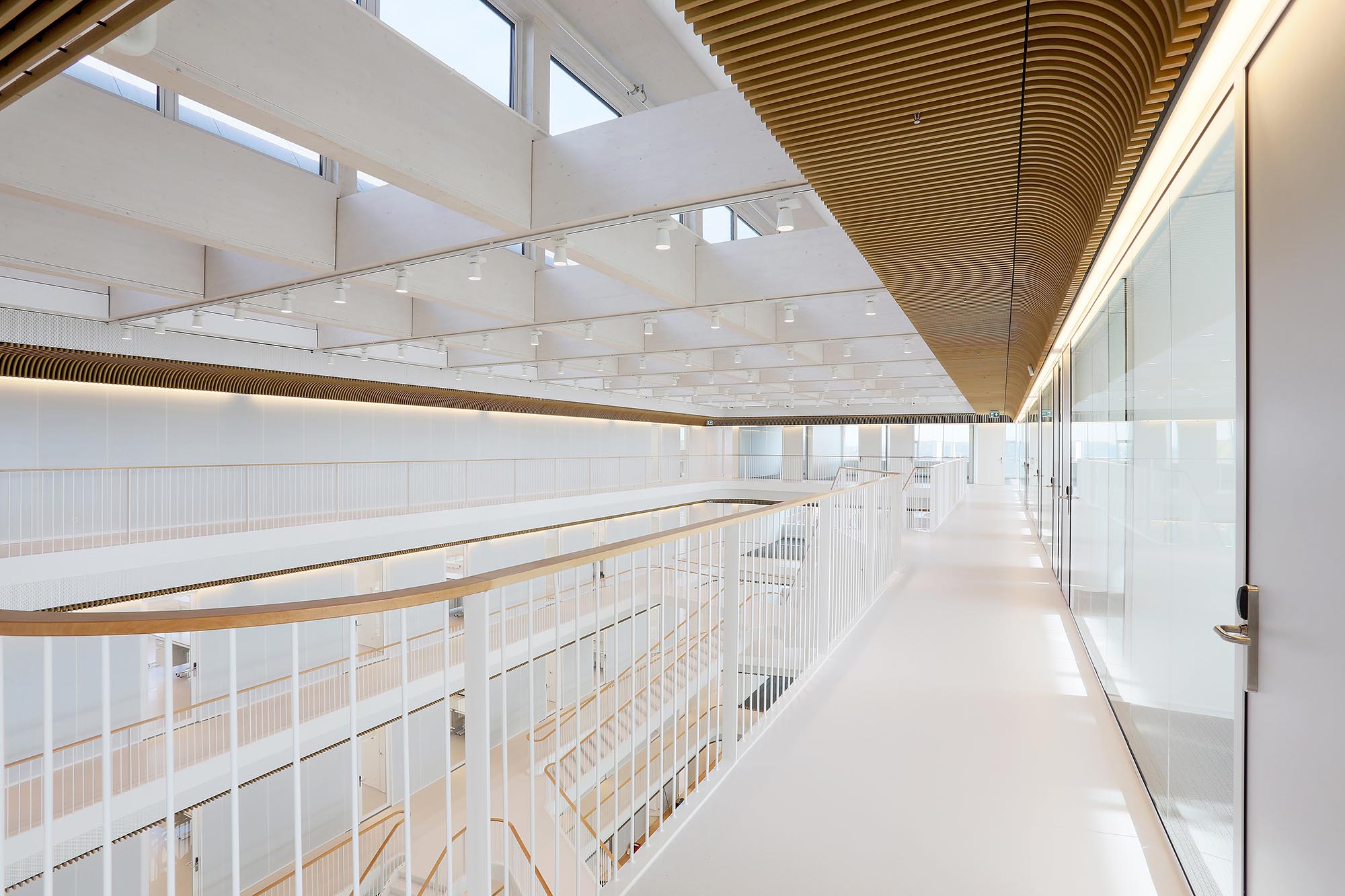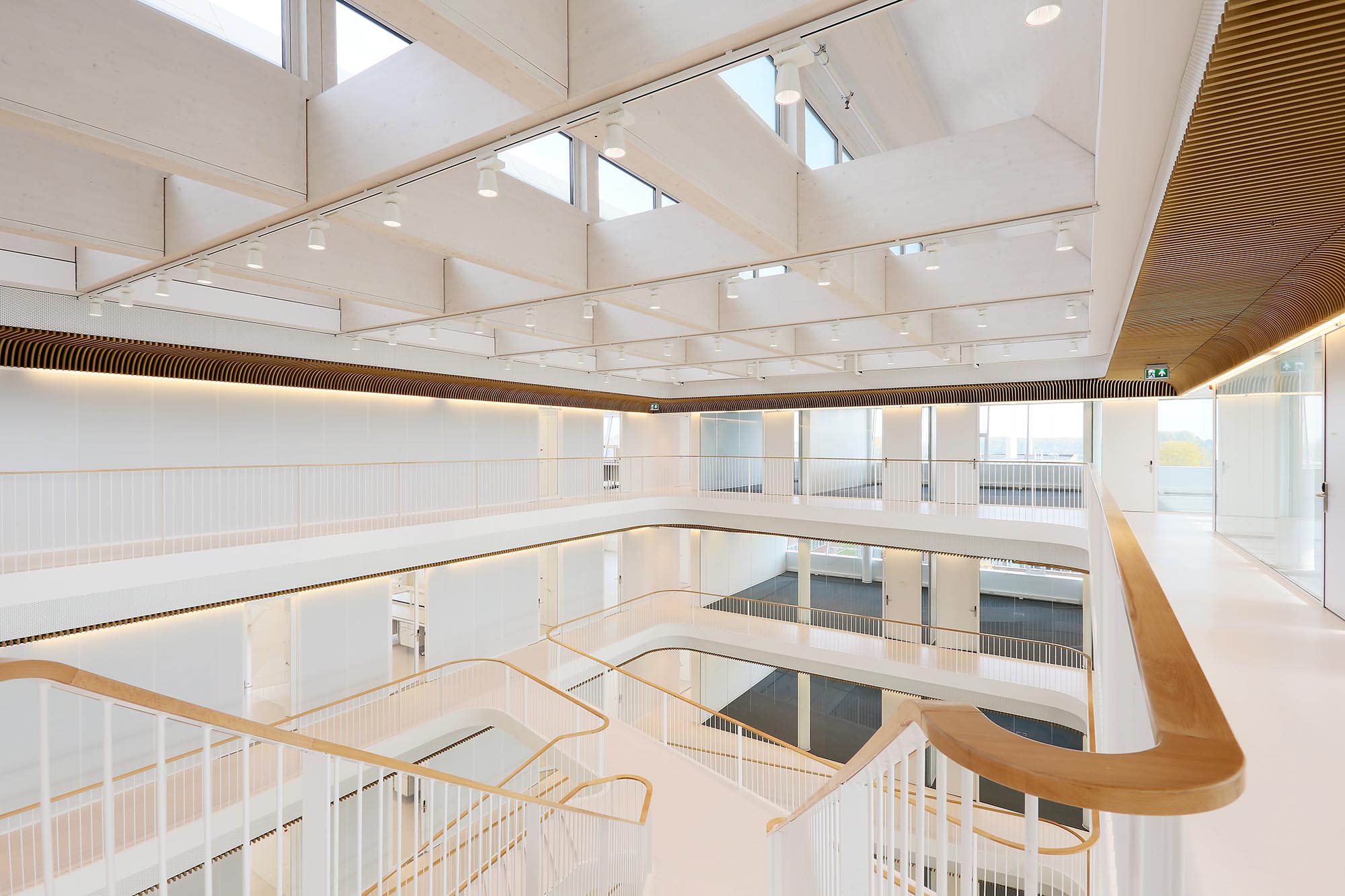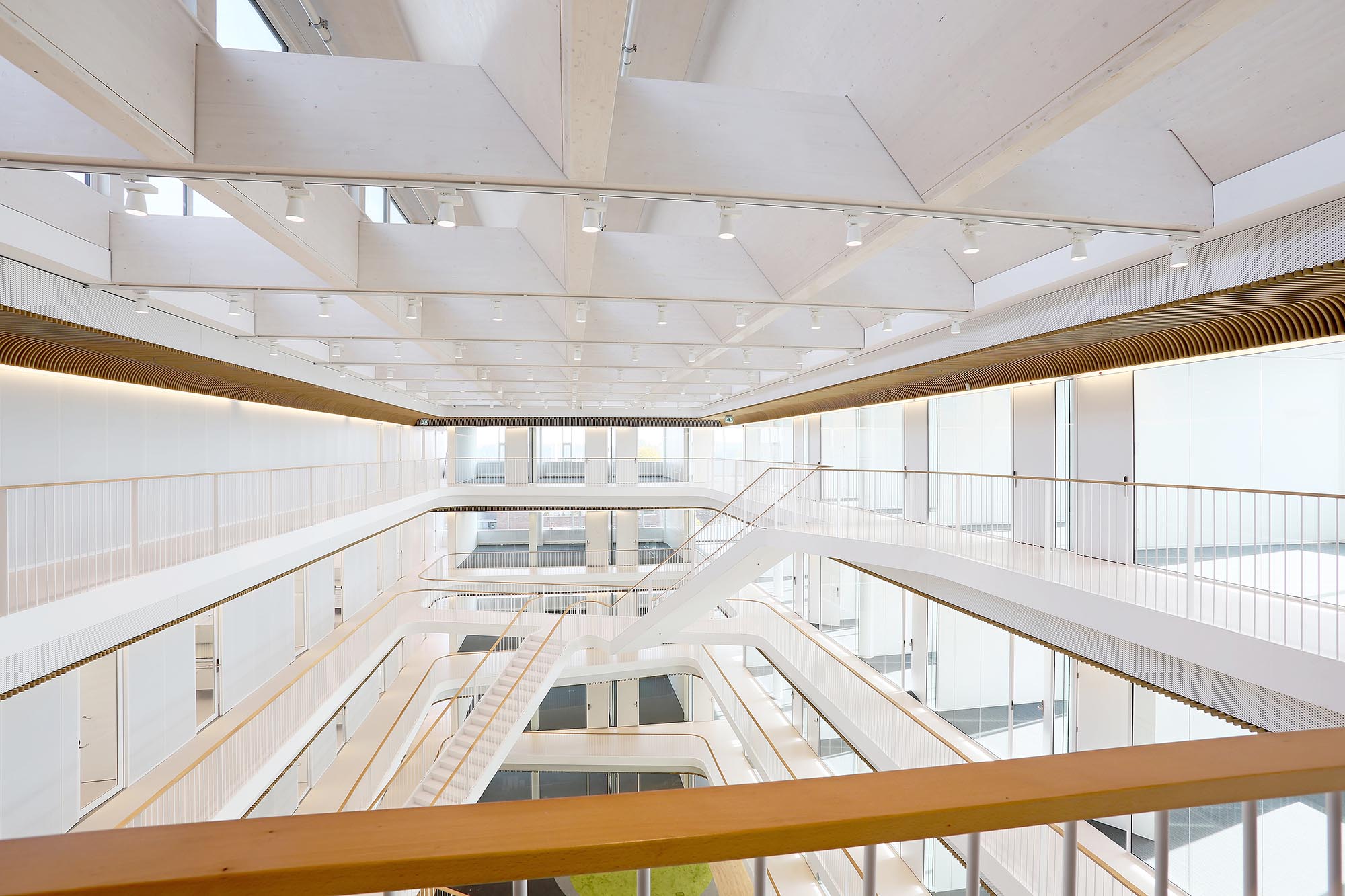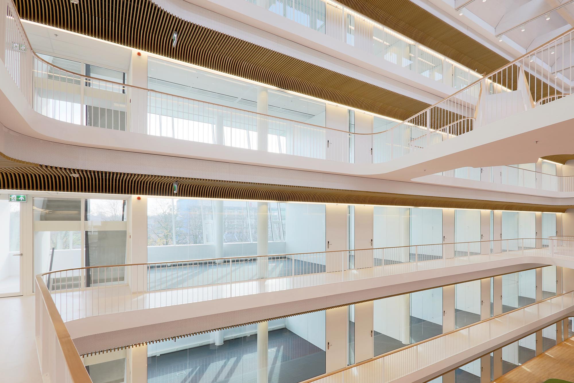 Het gebouw heeft van binnen een unieke uitstraling gekregen door de toepassing van enkele slim gekozen plafondsystemen. In alle gangen aan de atriumzijde is er, samen met Derako, voor Solid Wood Systems gekozen voor het Grill plafondsysteem. Dit systeem, voorzien van akoestische isolatie, heeft de juiste uitstraling voor het ontwerp met de gebogen delen. Het is volledig demontabel voor de bereikbaarheid van de techniek.