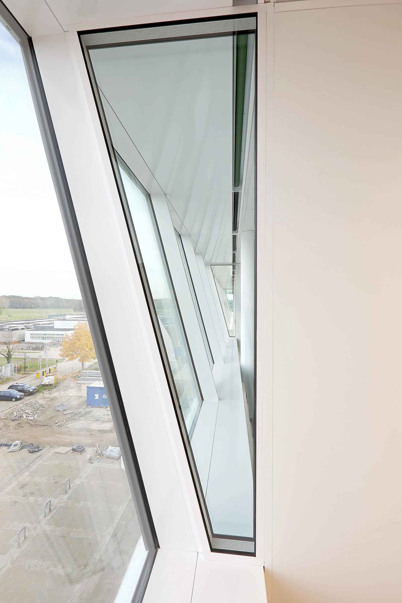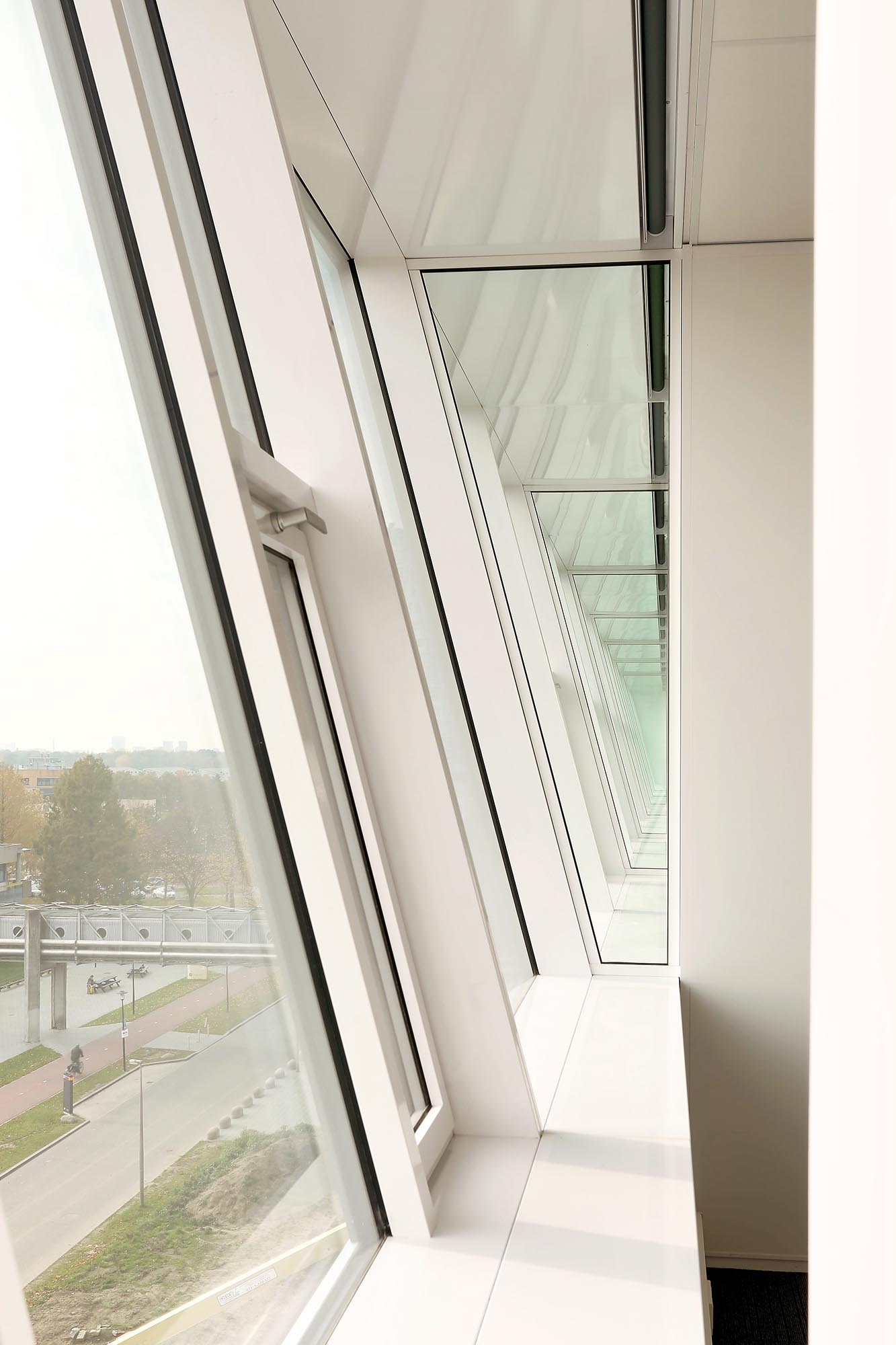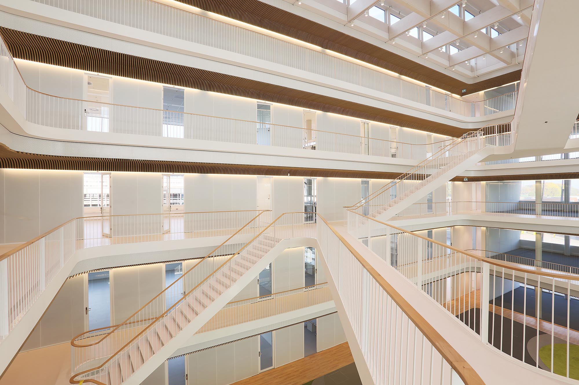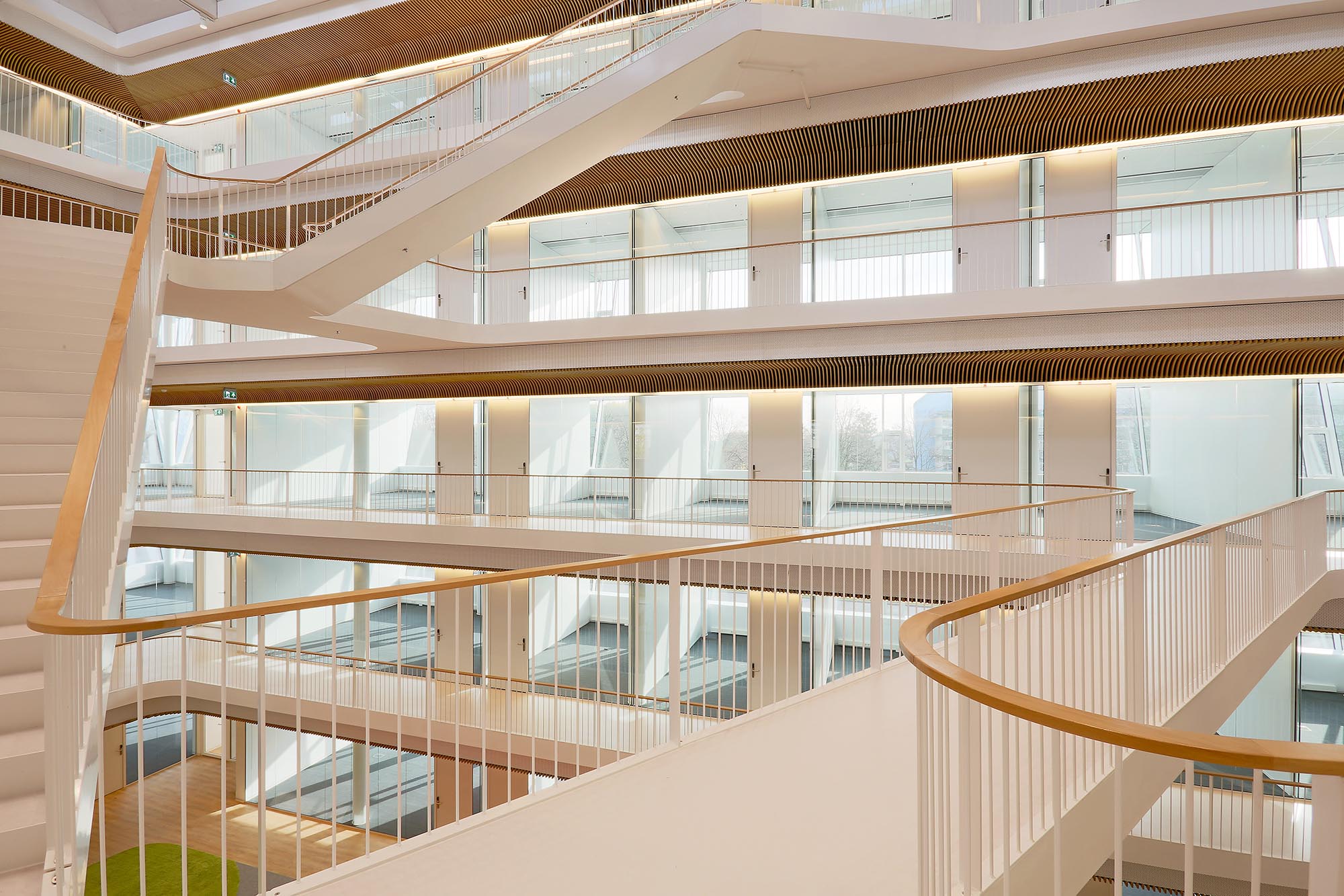 Het gebouw heeft van binnen een unieke uitstraling gekregen door de toepassing van enkele slim gekozen plafondsystemen. In alle gangen aan de atriumzijde is er, samen met Derako, voor Solid Wood Systems gekozen voor het Grill plafondsysteem. Dit systeem, voorzien van akoestische isolatie, heeft de juiste uitstraling voor het ontwerp met de gebogen delen. Het is volledig demontabel voor de bereikbaarheid van de techniek.