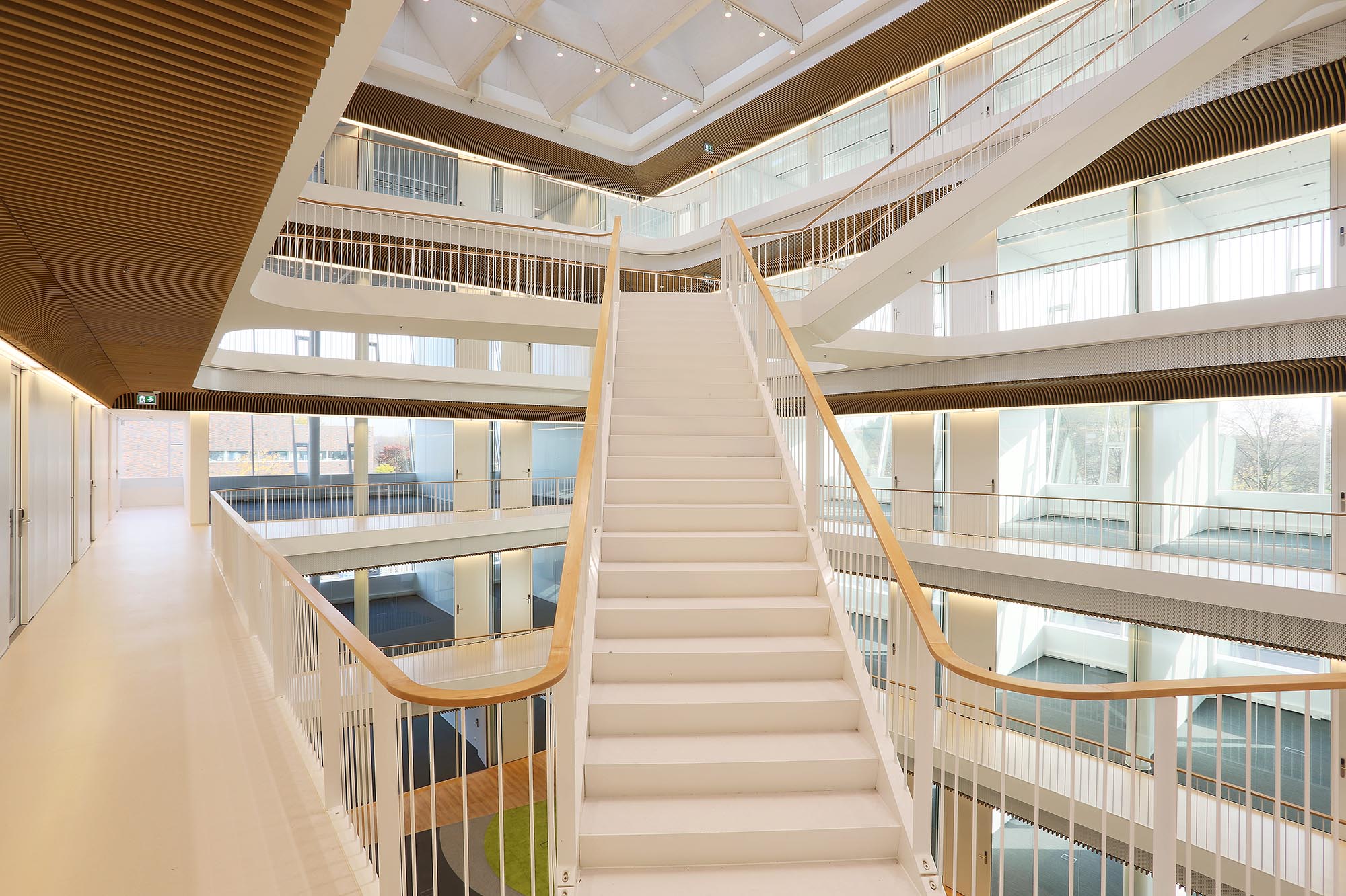 Om ook een goede akoestiek te krijgen in de trappenhuizen is hier gekozen voor het toepassen van plafondpanelen Ecophon Master B. Een uitstekende oplossing voor plafonds waar een minimale afhanghoogte gewenst is